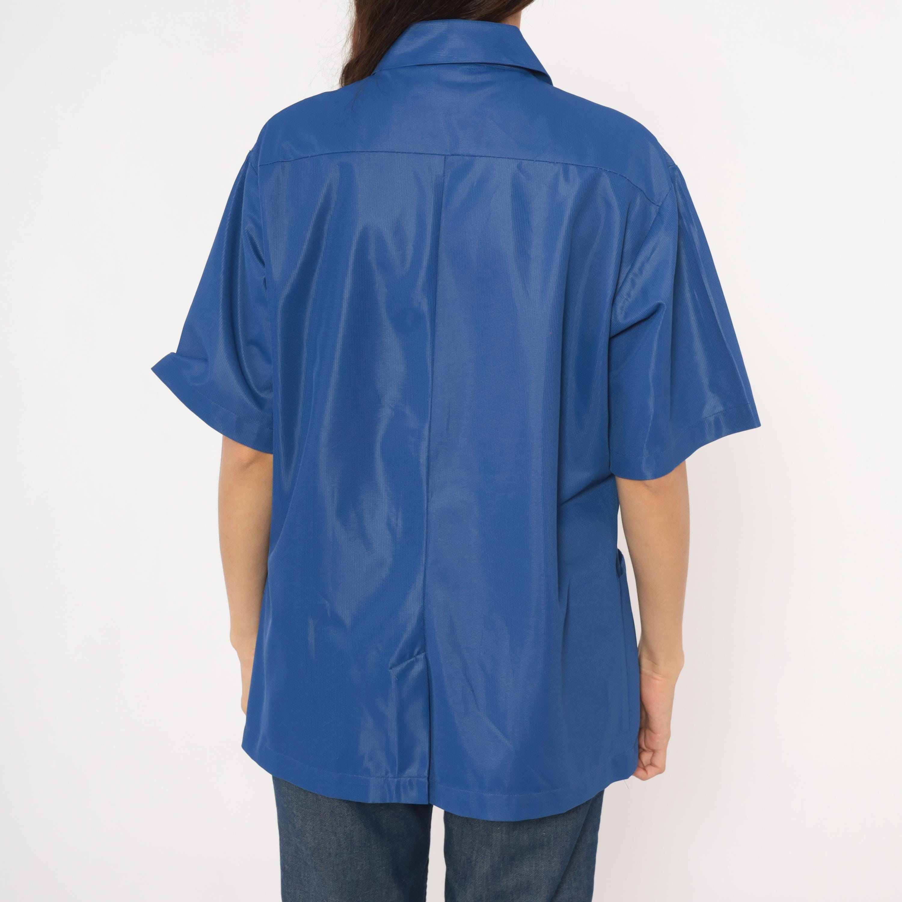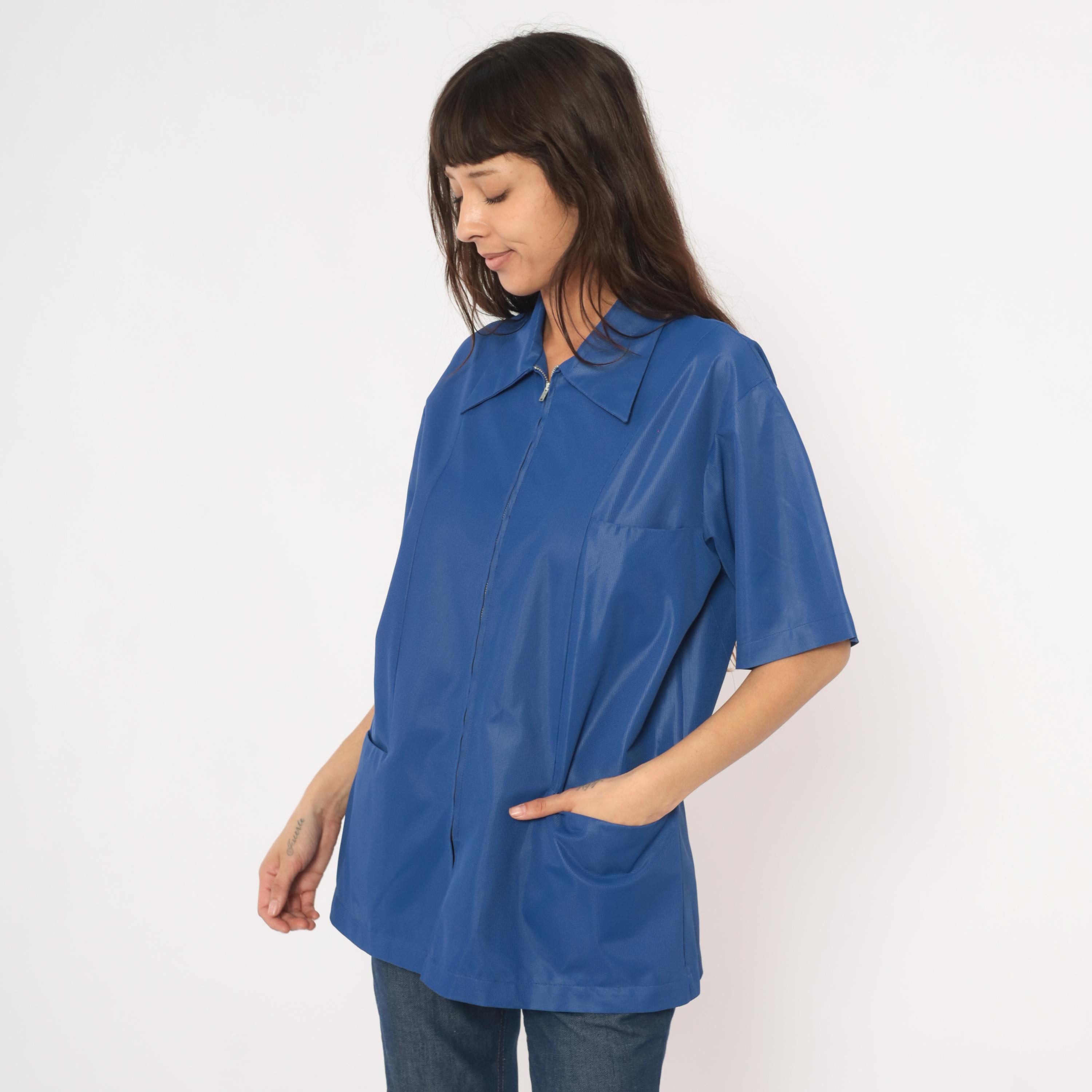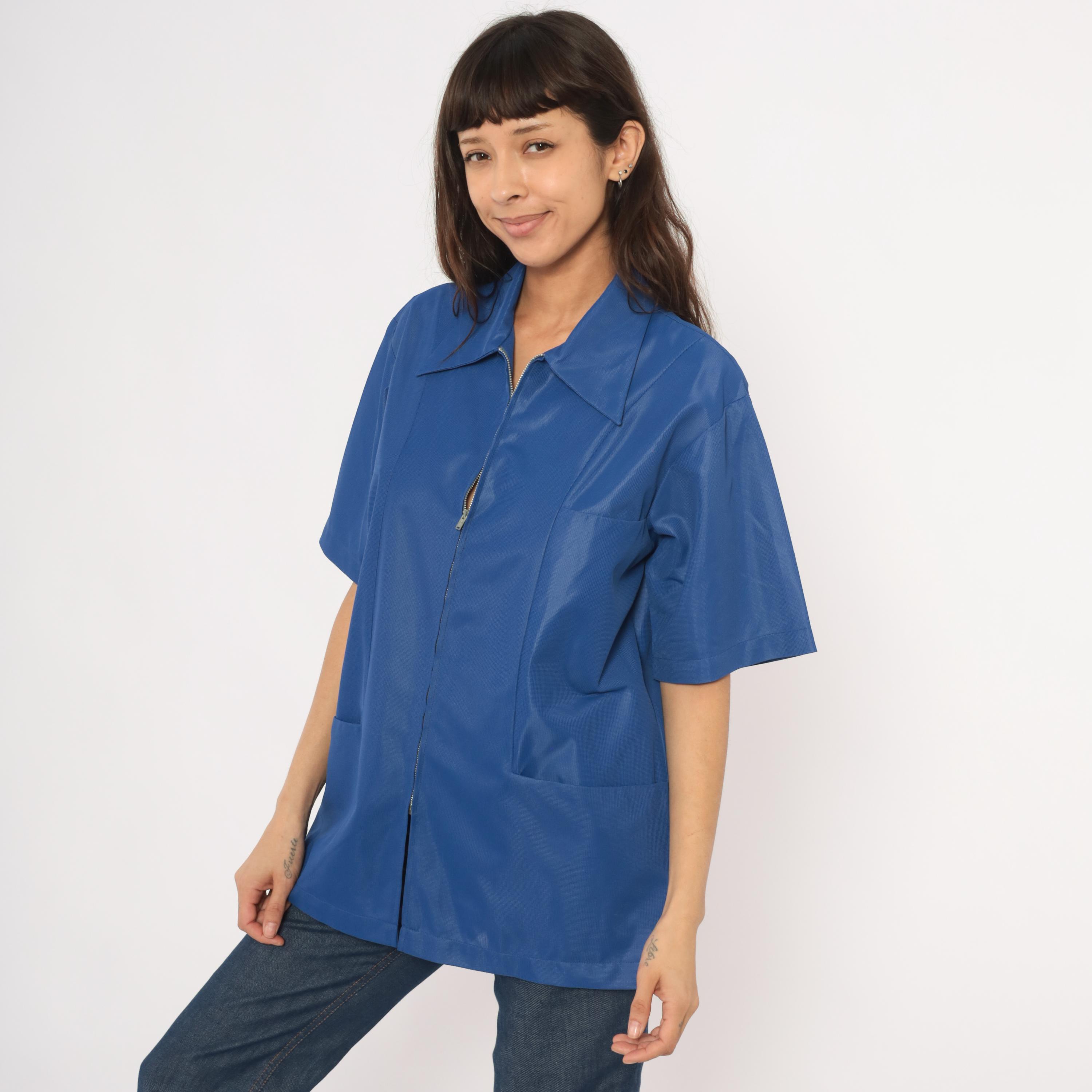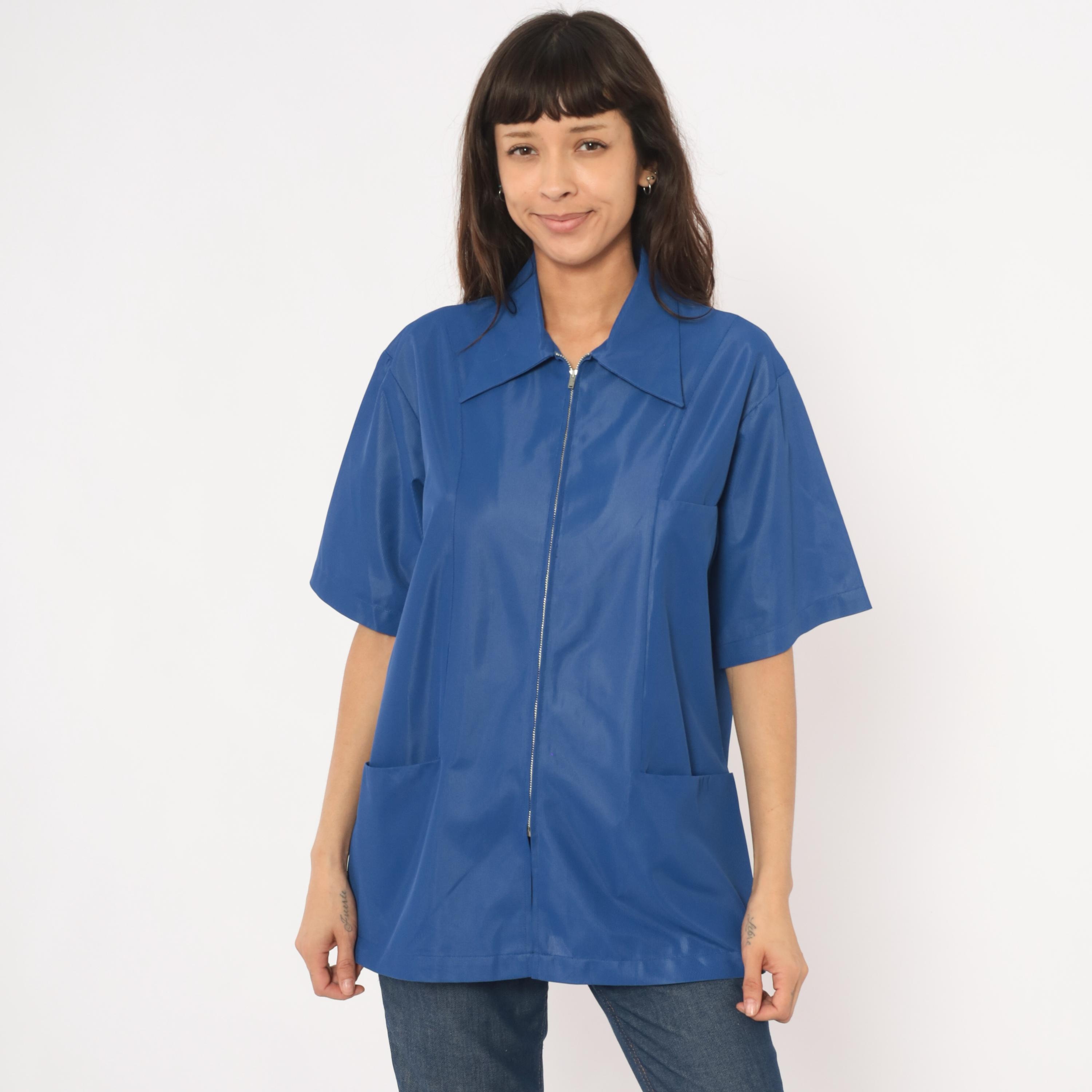 70s cobalt blue zip-front jacket from Sears Professional Apparel with a pointed spread collar and short sleeves. Full-length silver-tone front zipper closure with two lower front patch pockets. Relaxed, boxy silhouette with a tunic-length hem and back yoke seam.