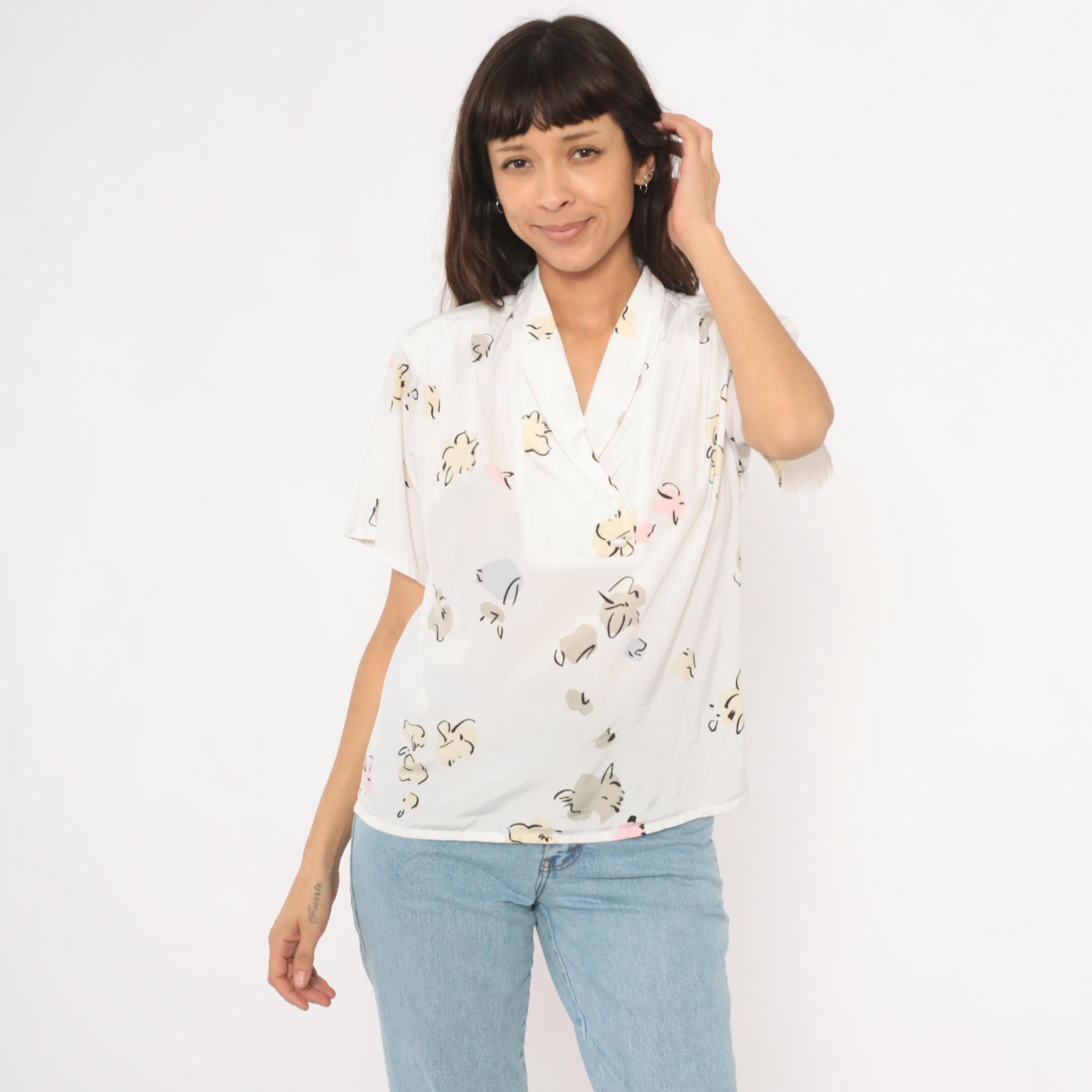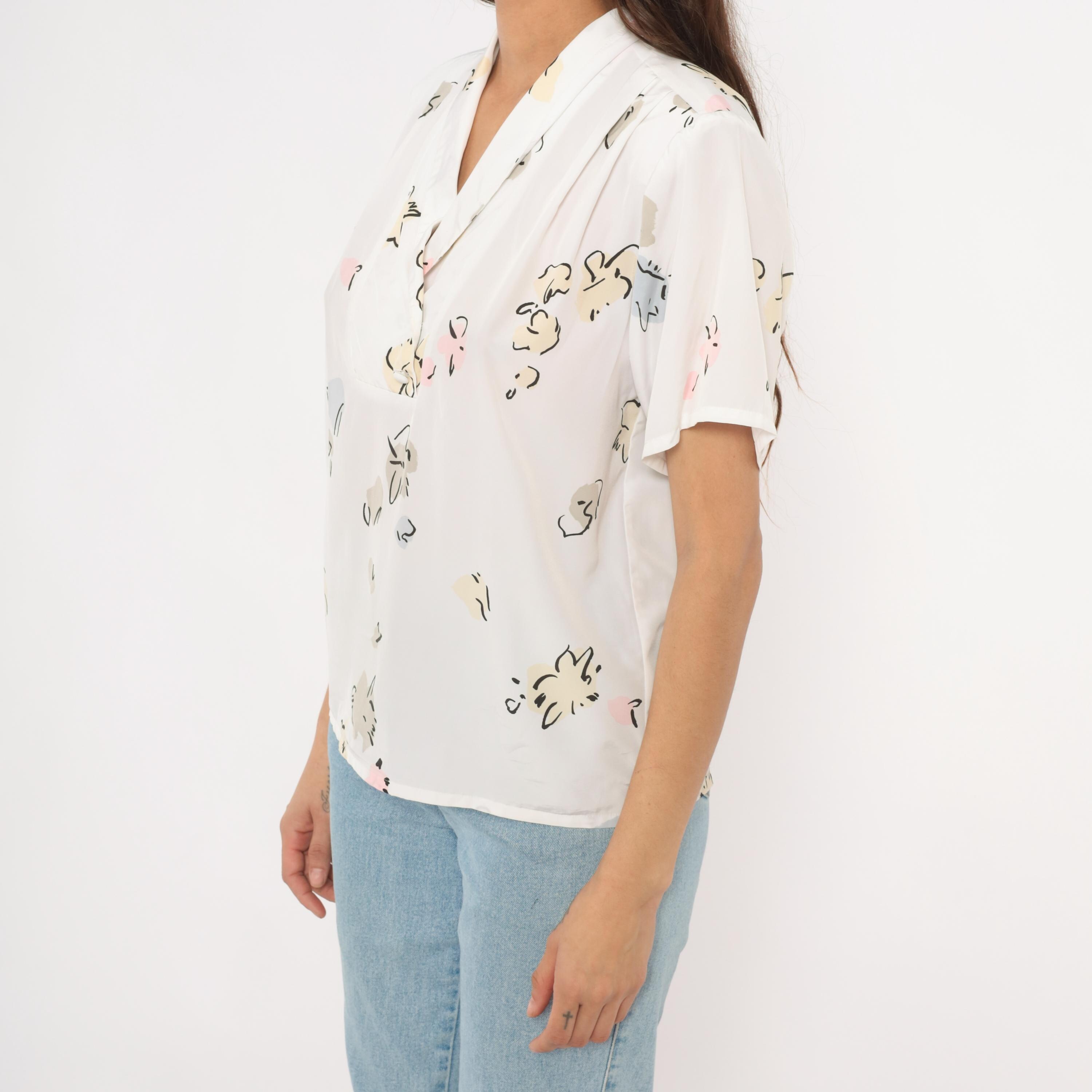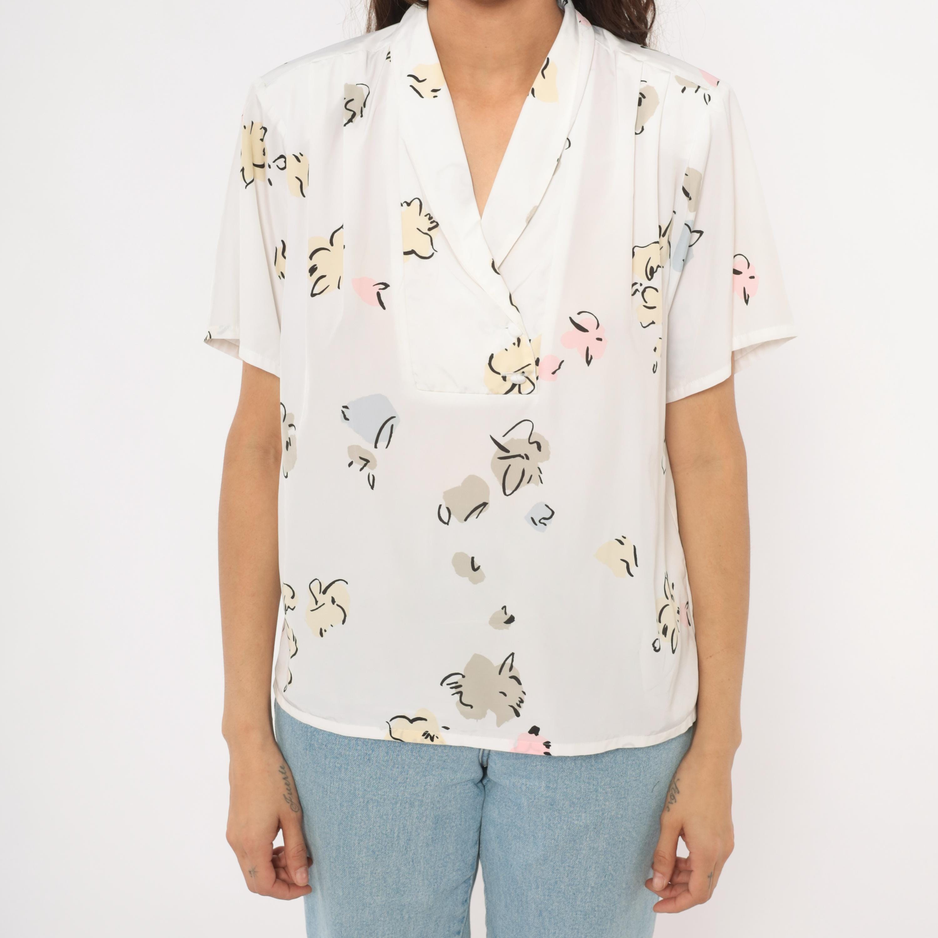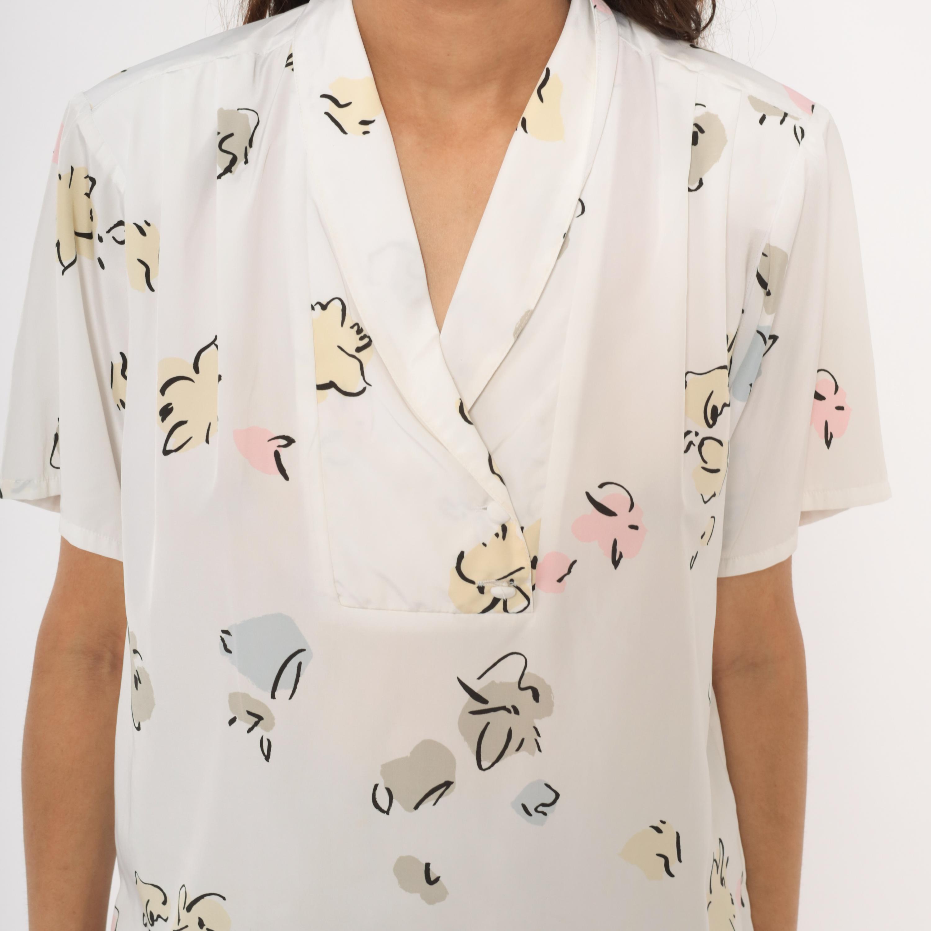 90s white pullover blouse from Liz Baker with an abstract floral print in cream, taupe, pale blue, pink, and black scattered across the fabric. Shawl collar with a V neckline and short flutter sleeves. Single chest pocket on the left side with a button tab closure.