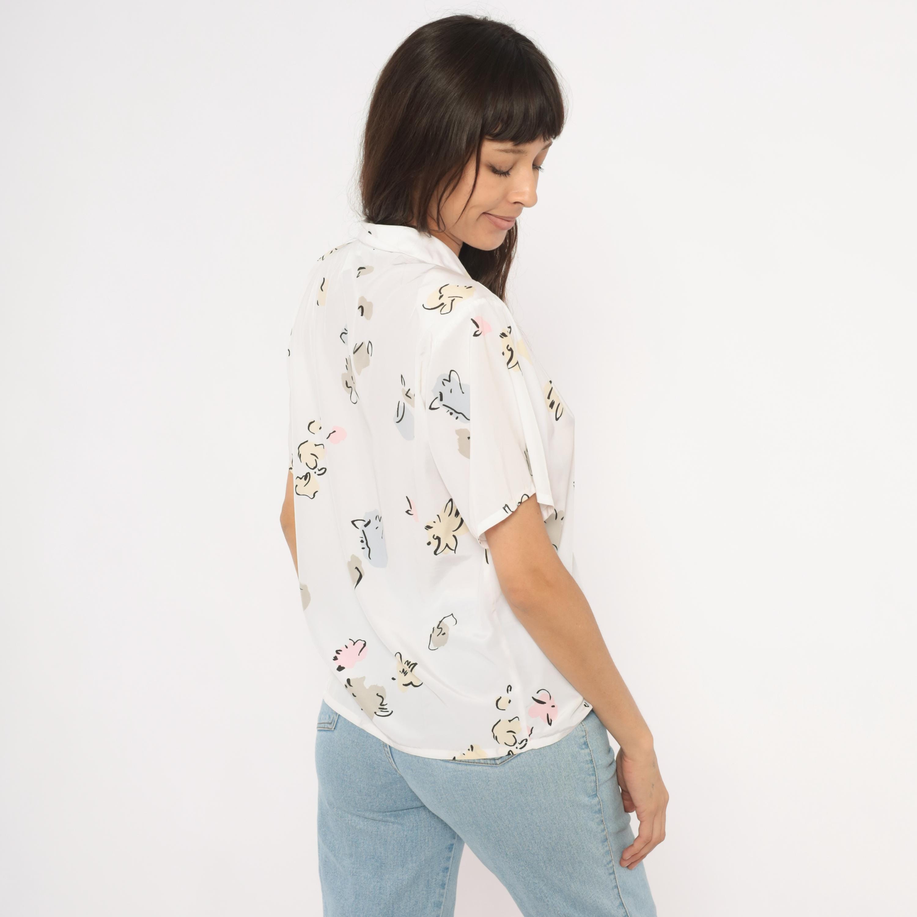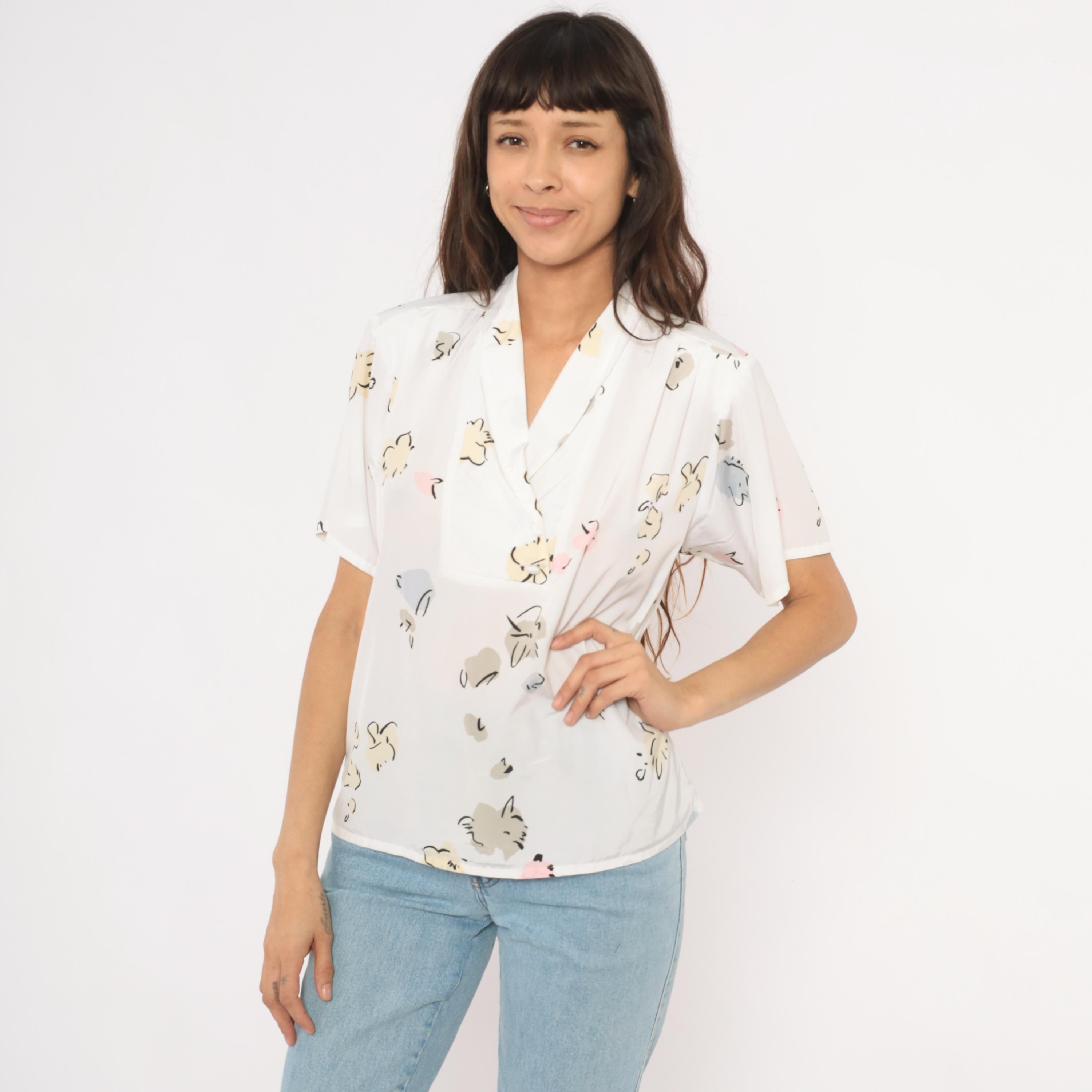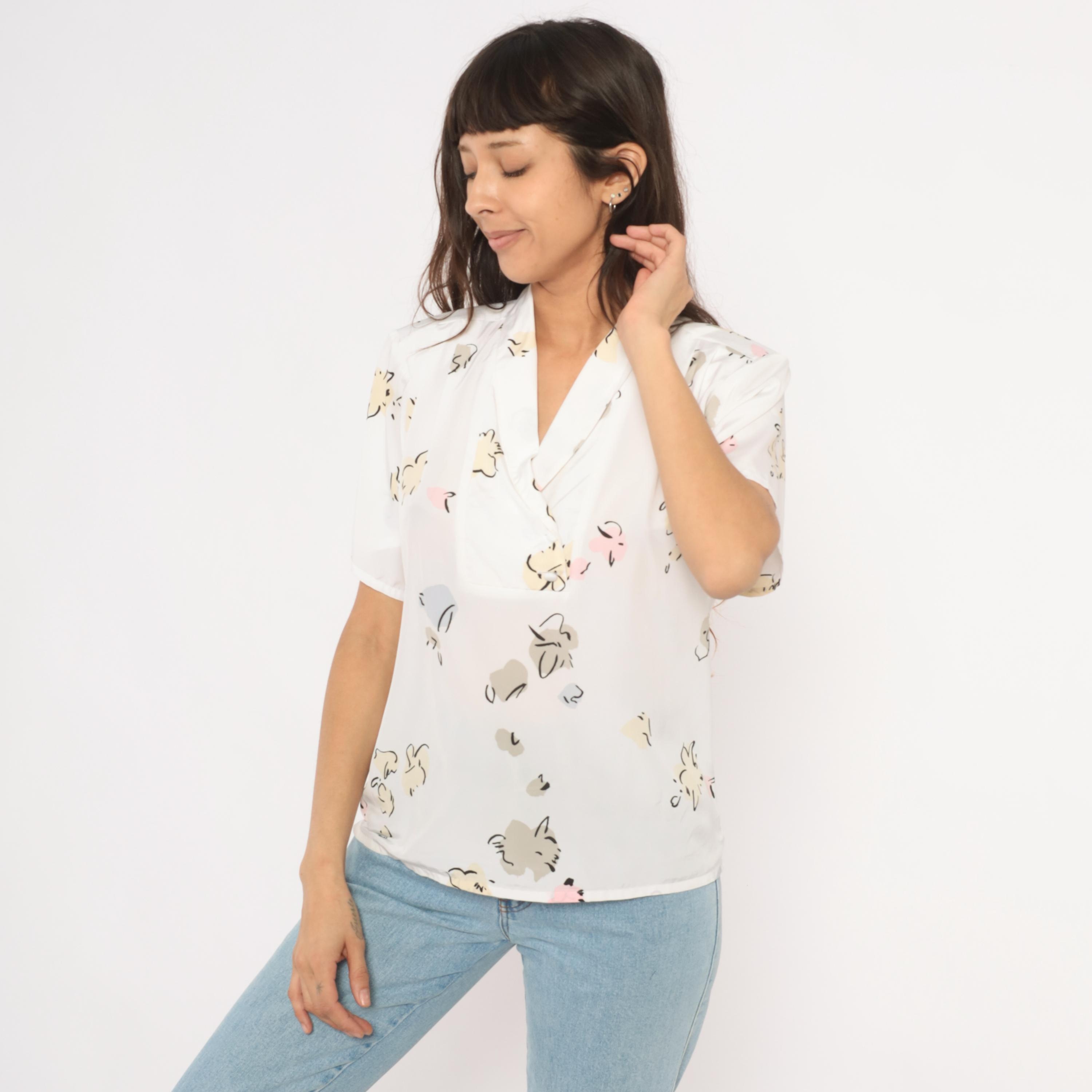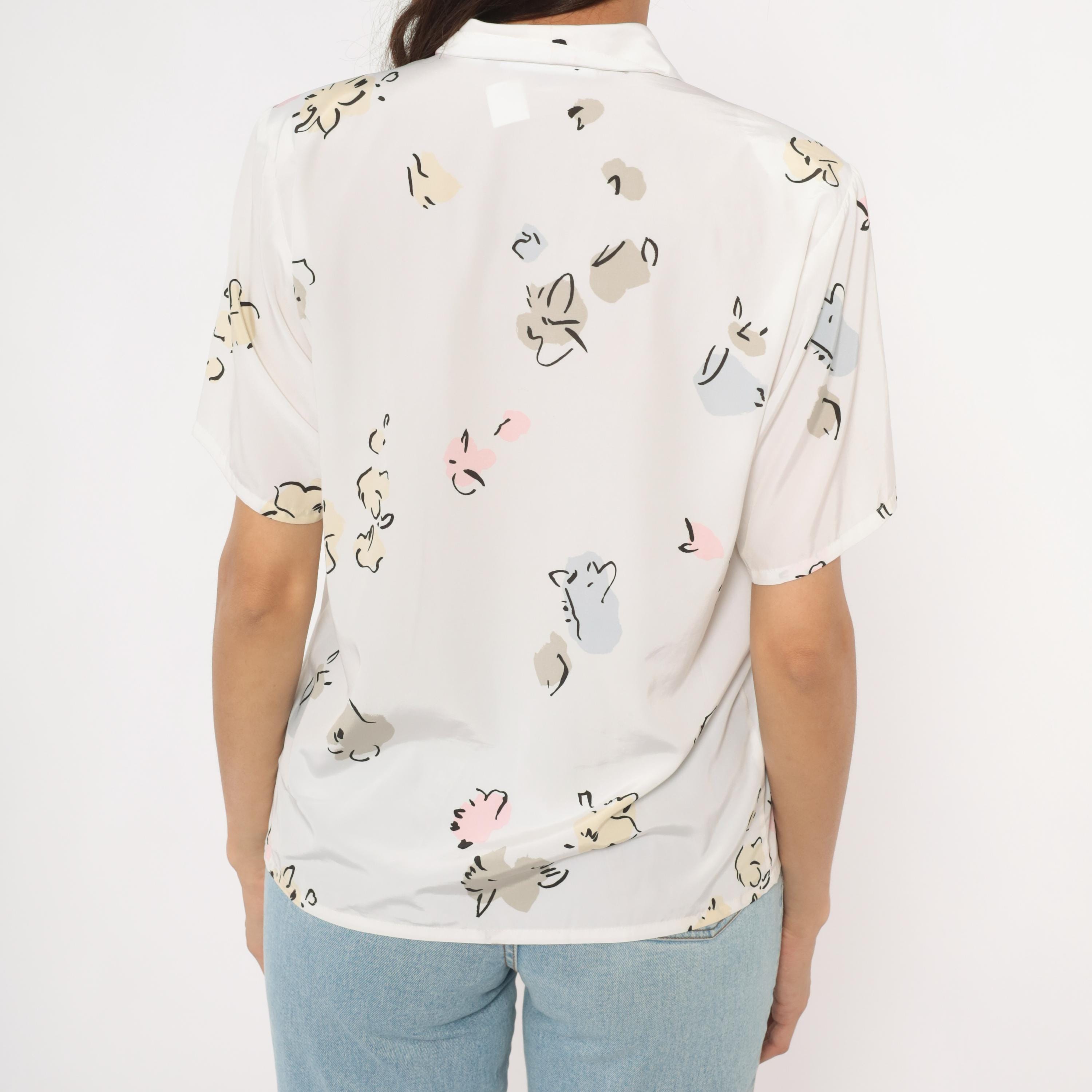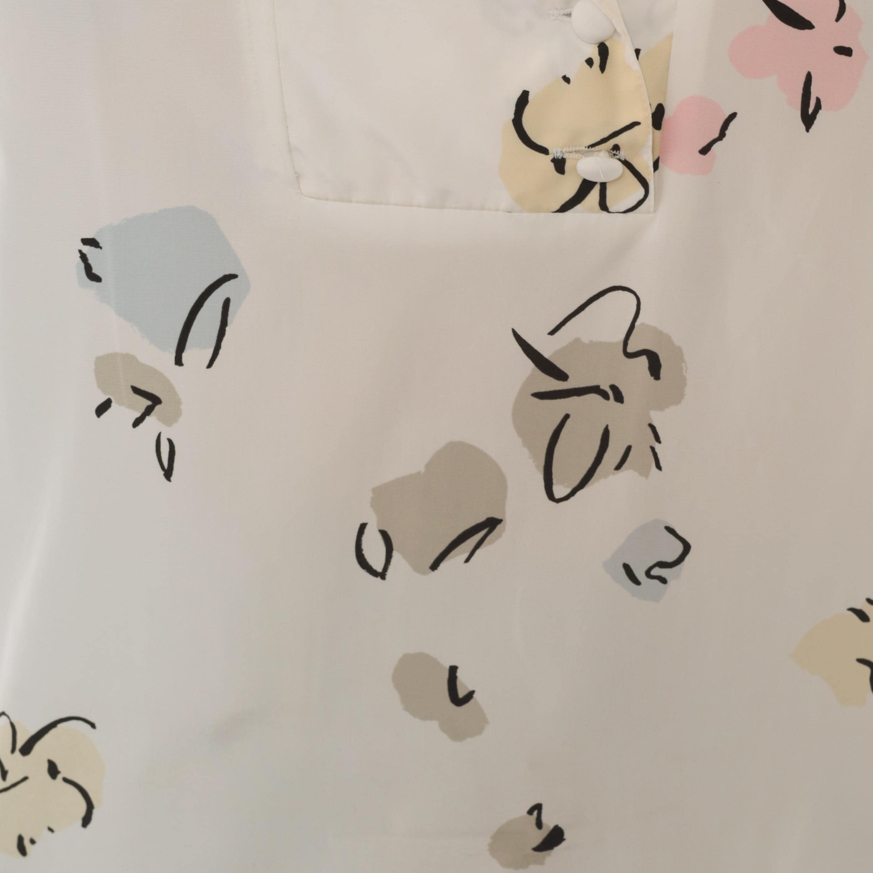 90s white pullover blouse from Liz Baker with an abstract floral print in cream, taupe, pale blue, pink, and black scattered across the fabric. Shawl collar with a V neckline and short flutter sleeves. Single chest pocket on the left side with a button tab closure.