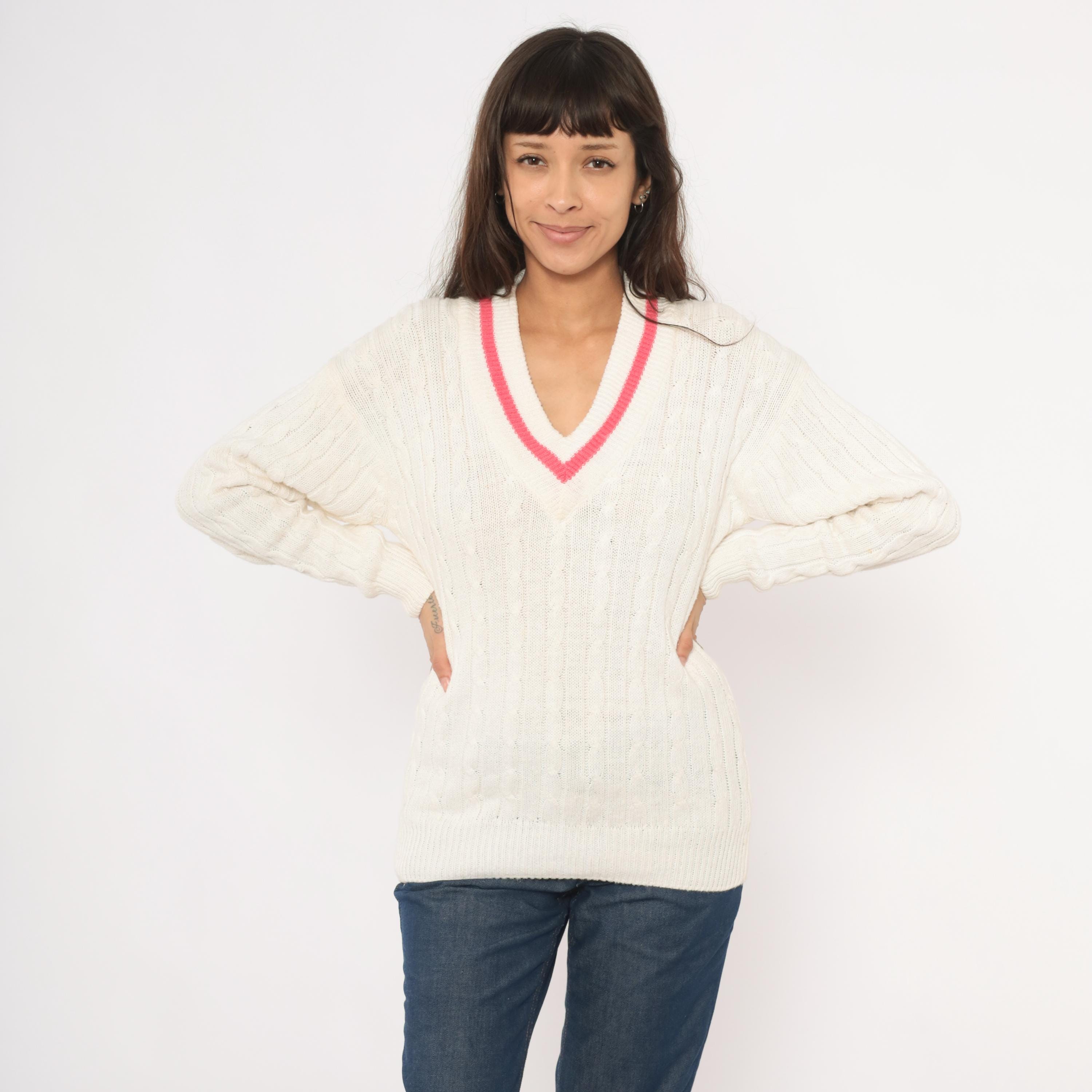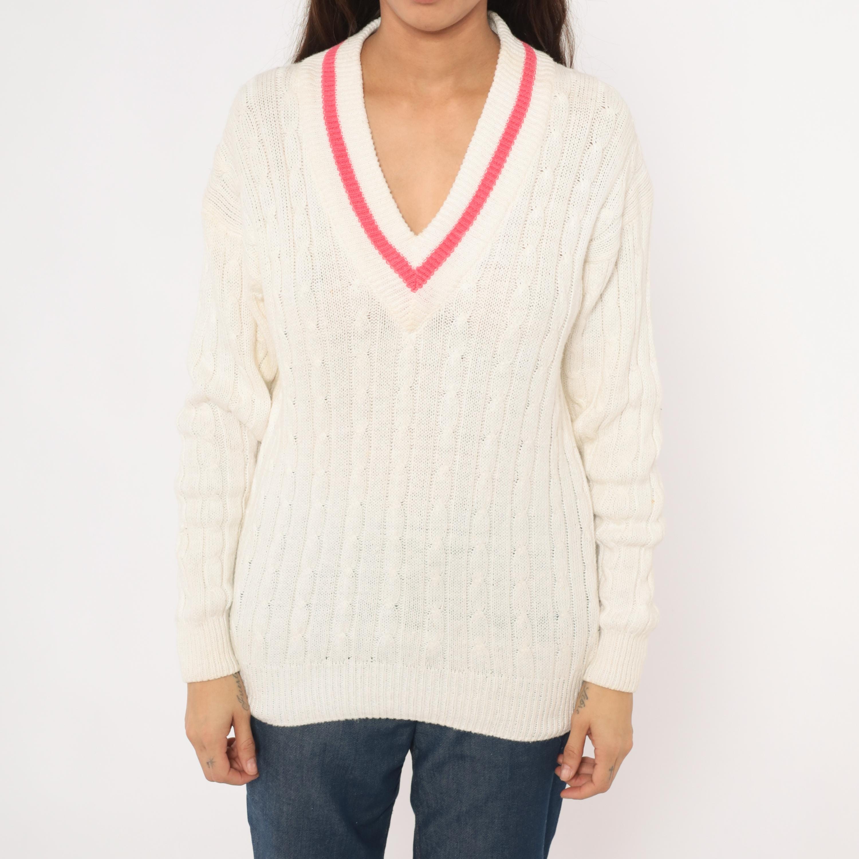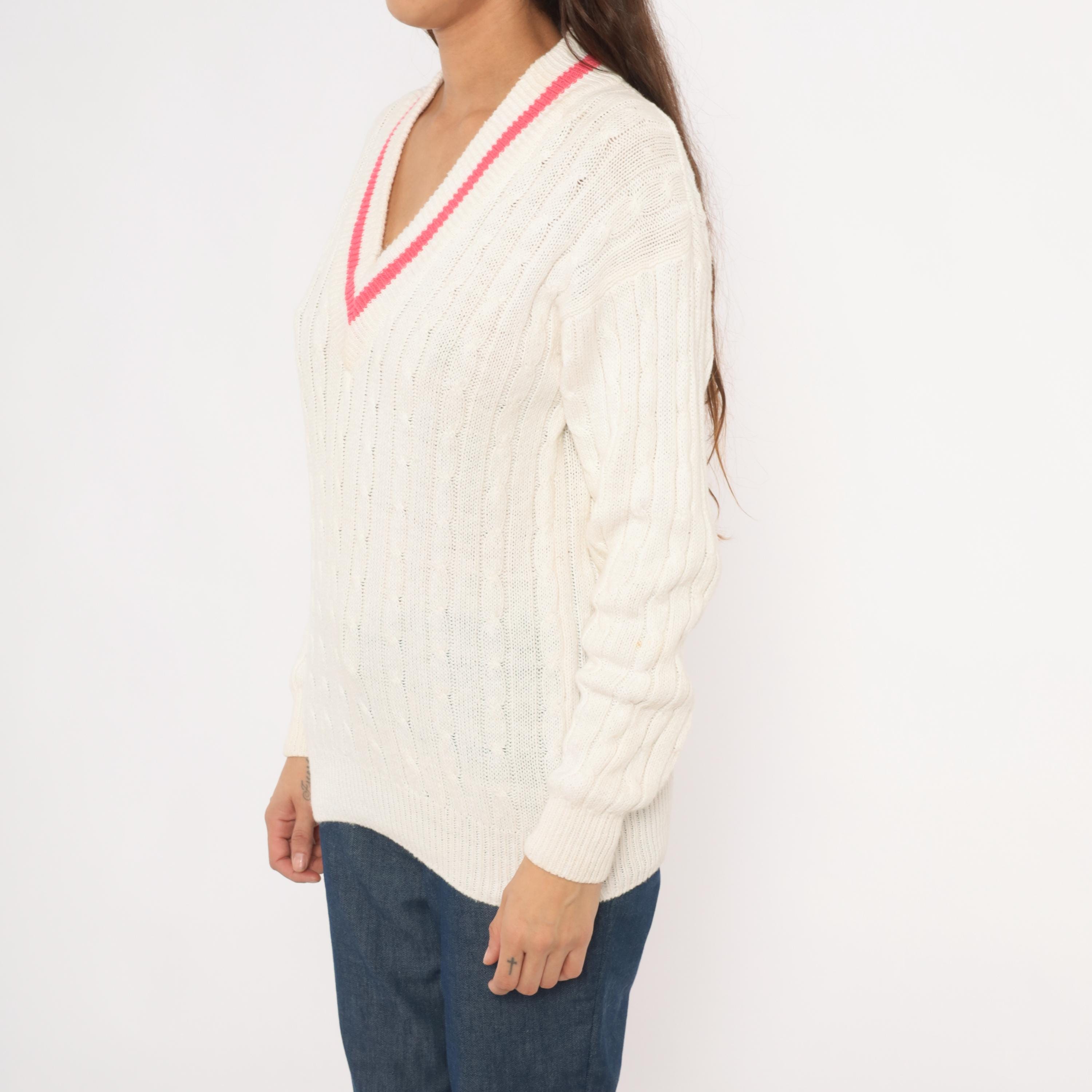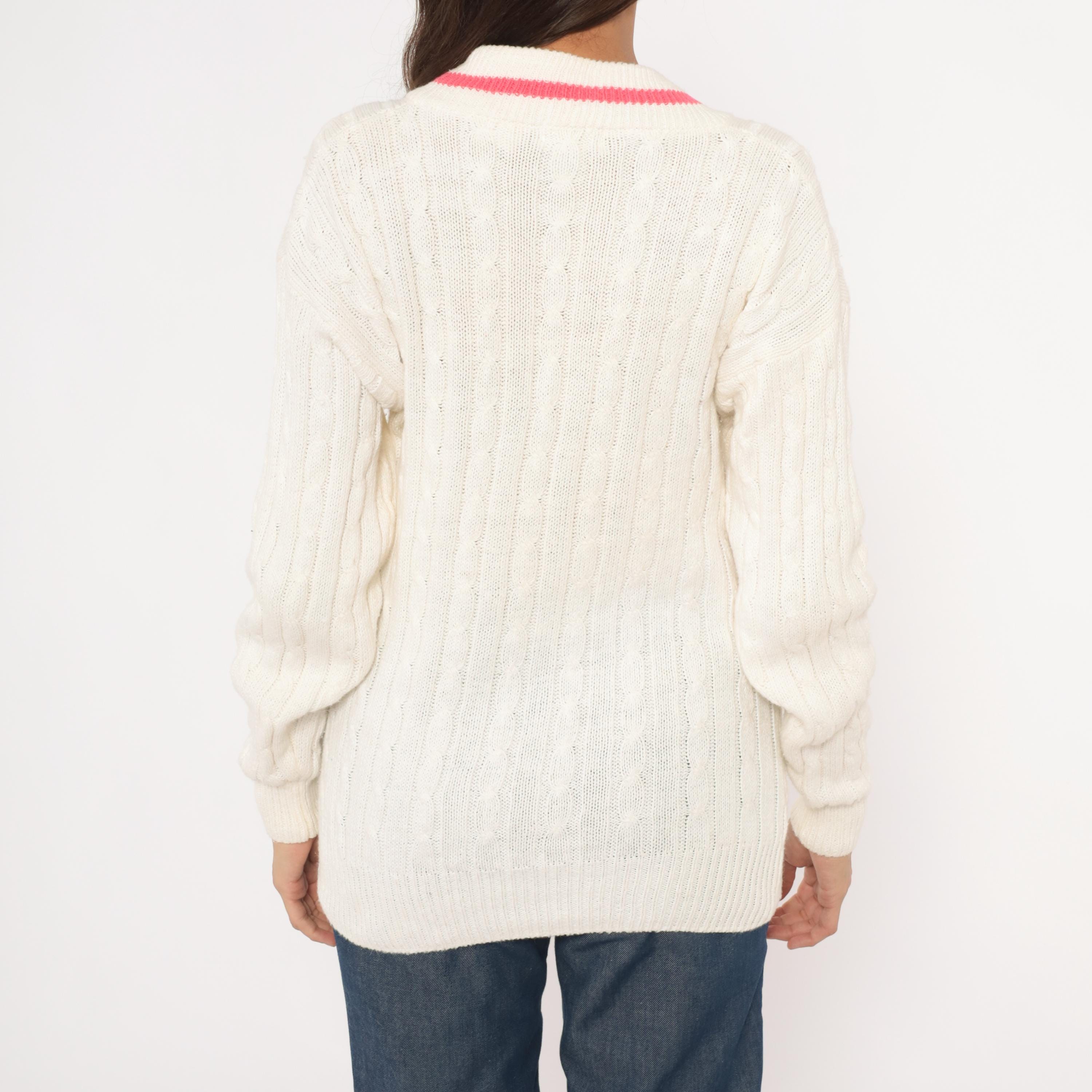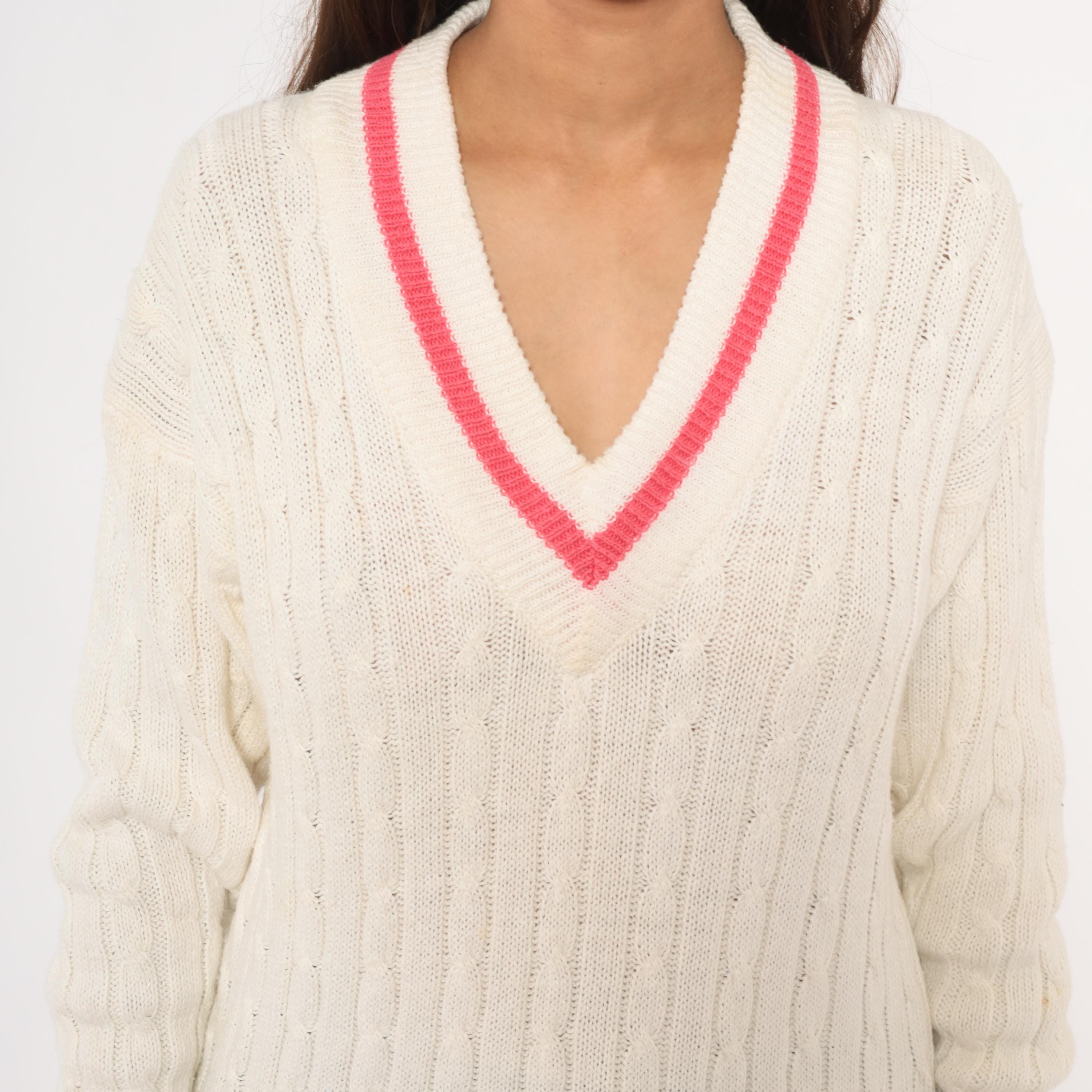 90s cable knit cricket sweater from Boundary Waters in ivory with a pink contrast stripe along the deep V neckline. Allover cable knit pattern across the body and sleeves, with ribbed cuffs, hem, and collar. Pullover construction with a relaxed, hip-length fit.