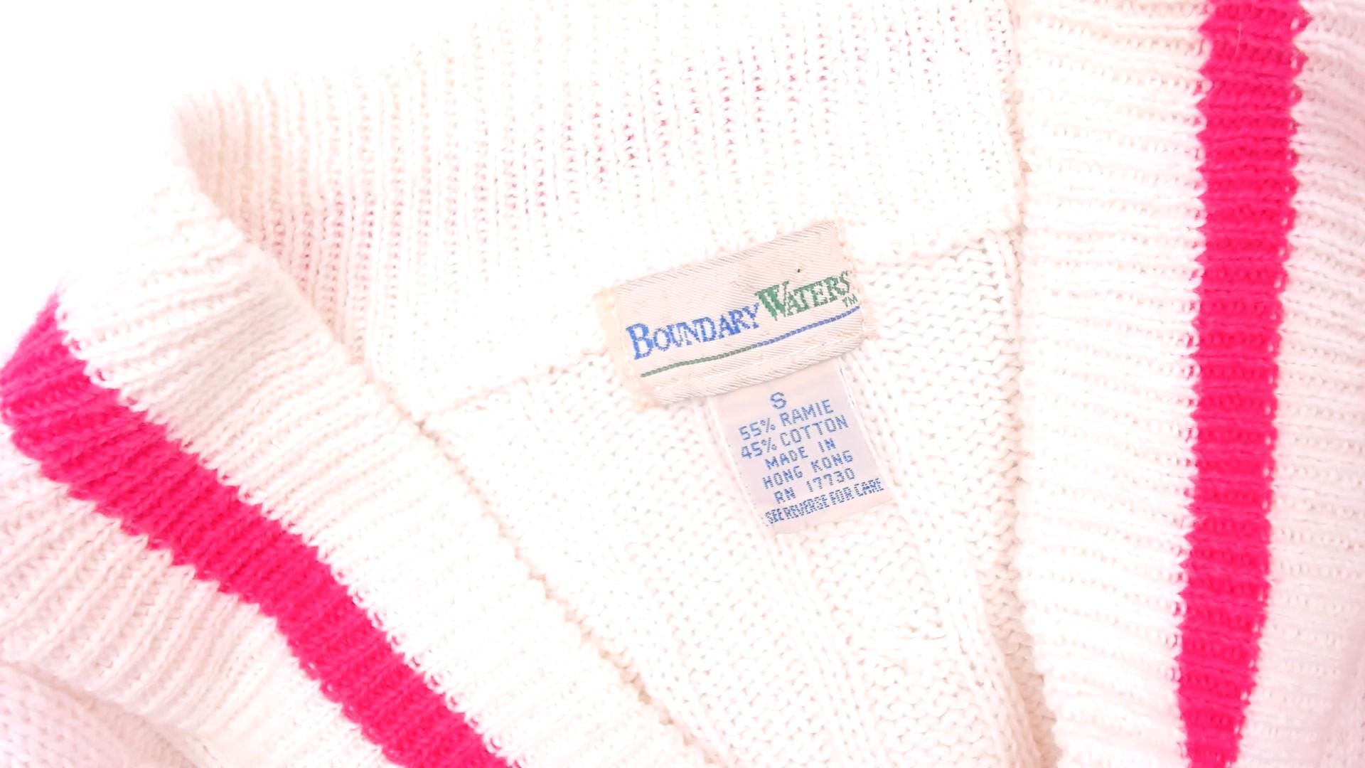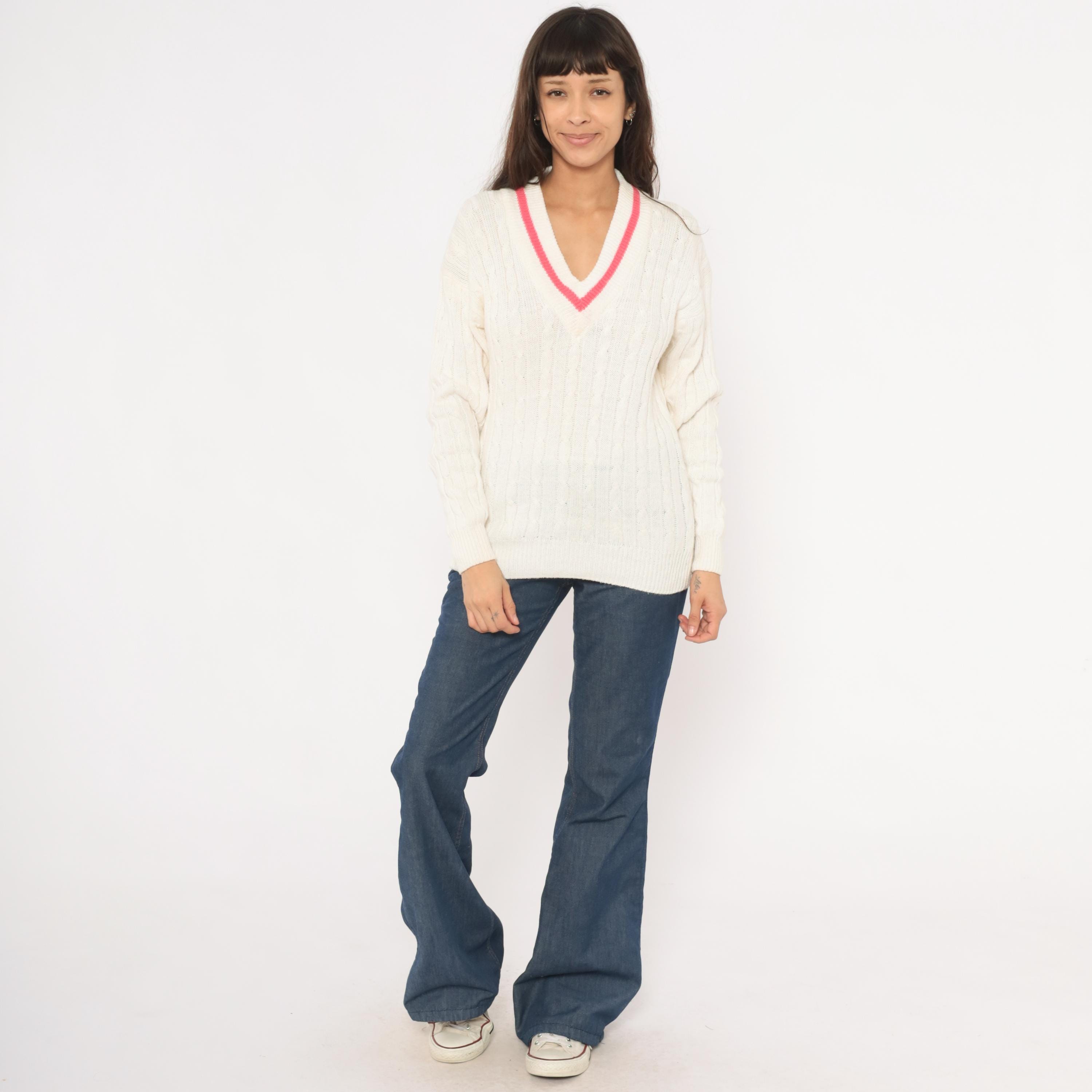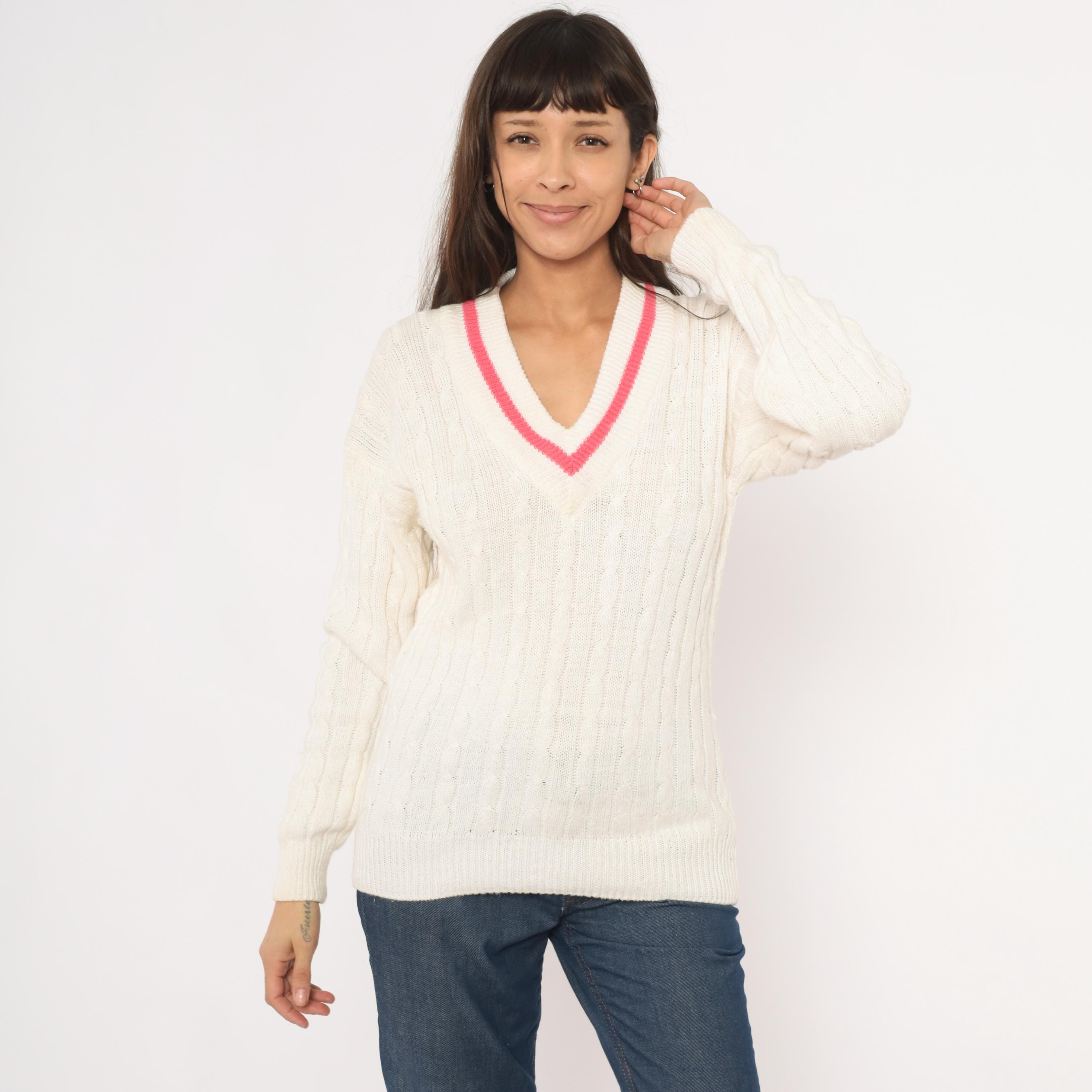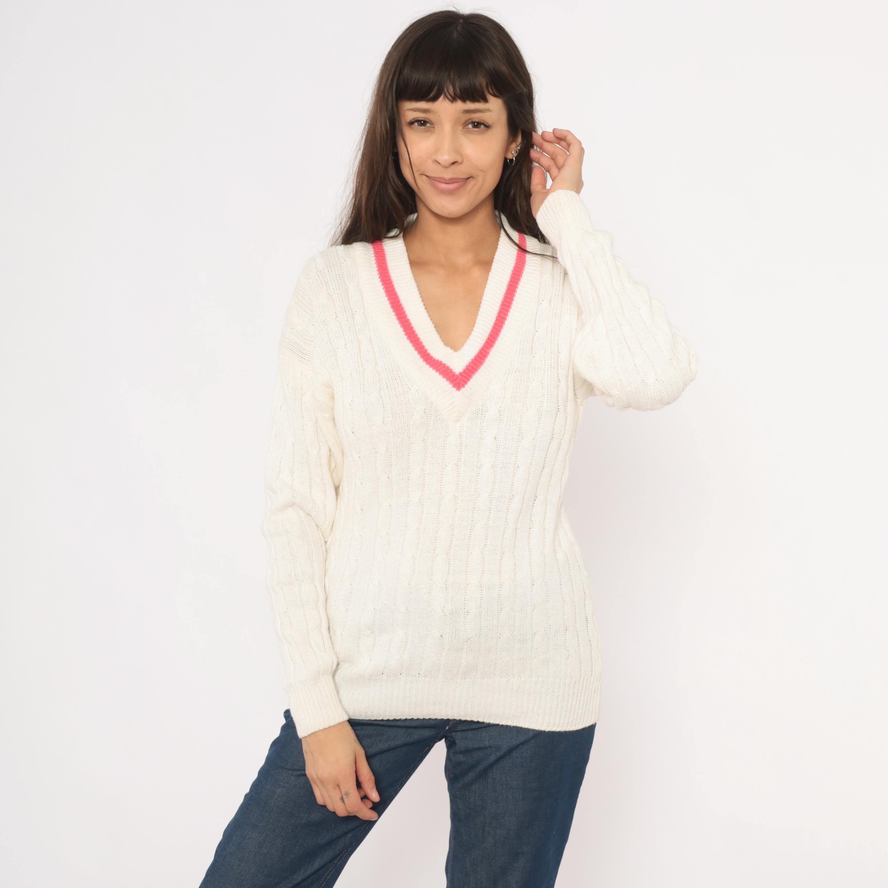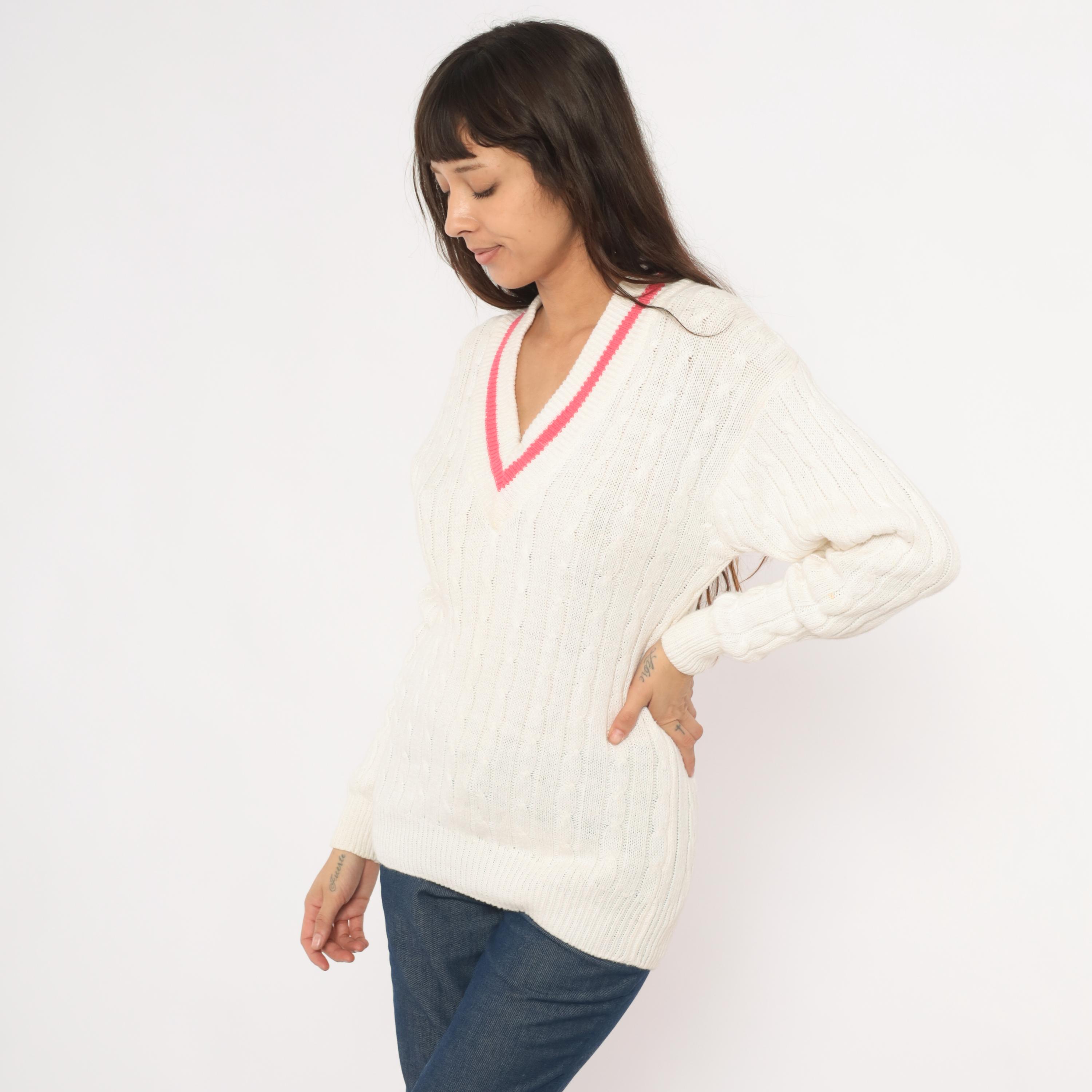 90s cable knit cricket sweater from Boundary Waters in ivory with a pink contrast stripe along the deep V neckline. Allover cable knit pattern across the body and sleeves, with ribbed cuffs, hem, and collar. Pullover construction with a relaxed, hip-length fit.