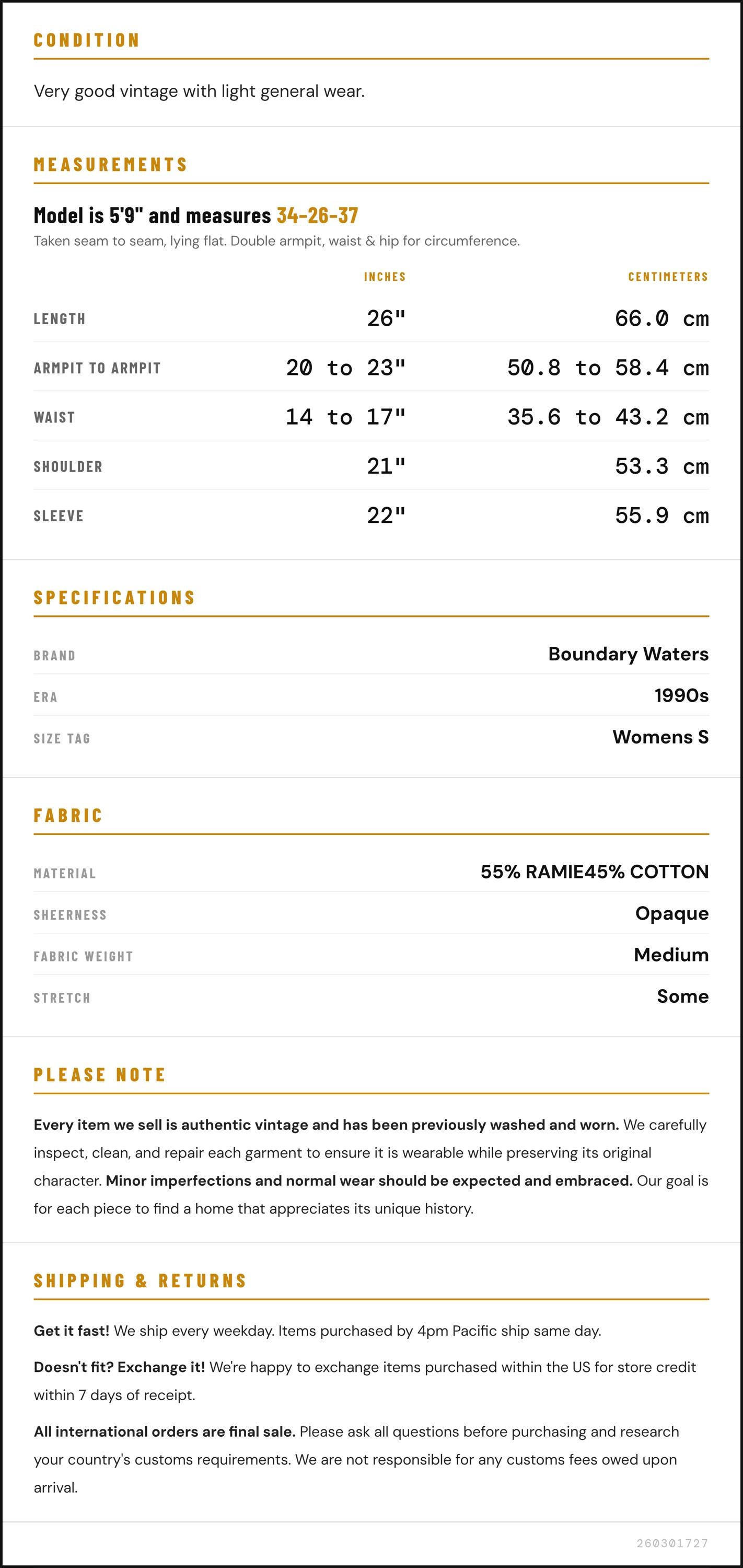 Vintage denim was usually made without any stretch, unlike modern jeans. Check the measurements to ensure proper fit, and remember to give yourself a little wiggle room in the waist and hips, depending on your preferred fit.