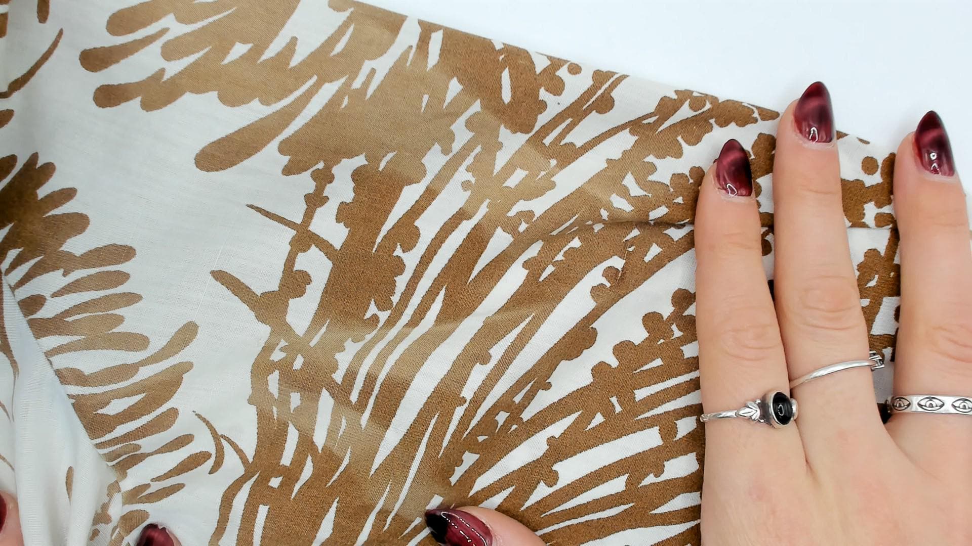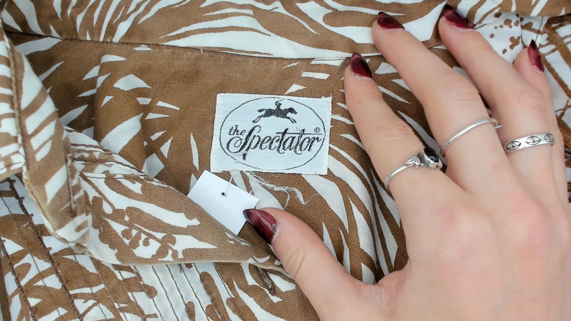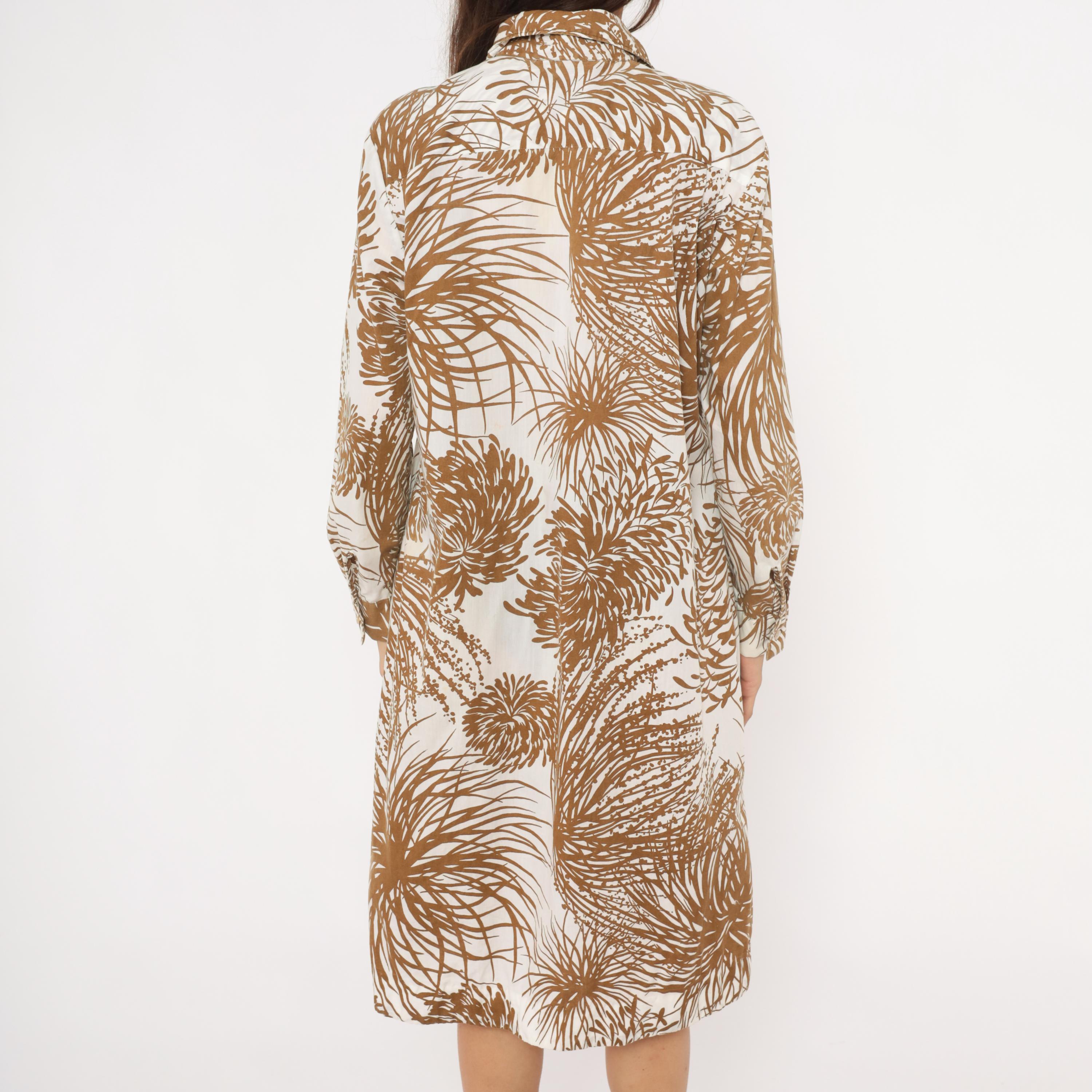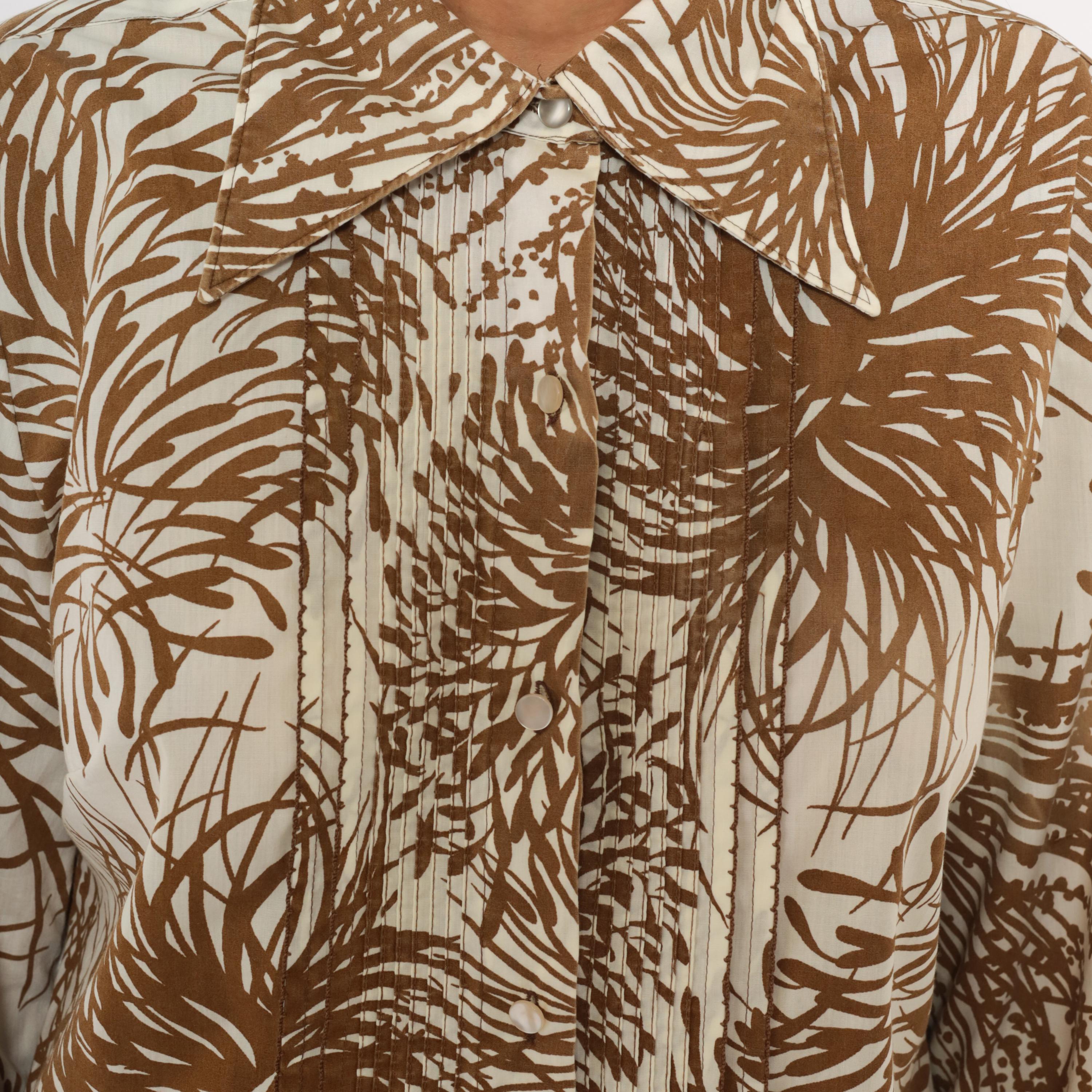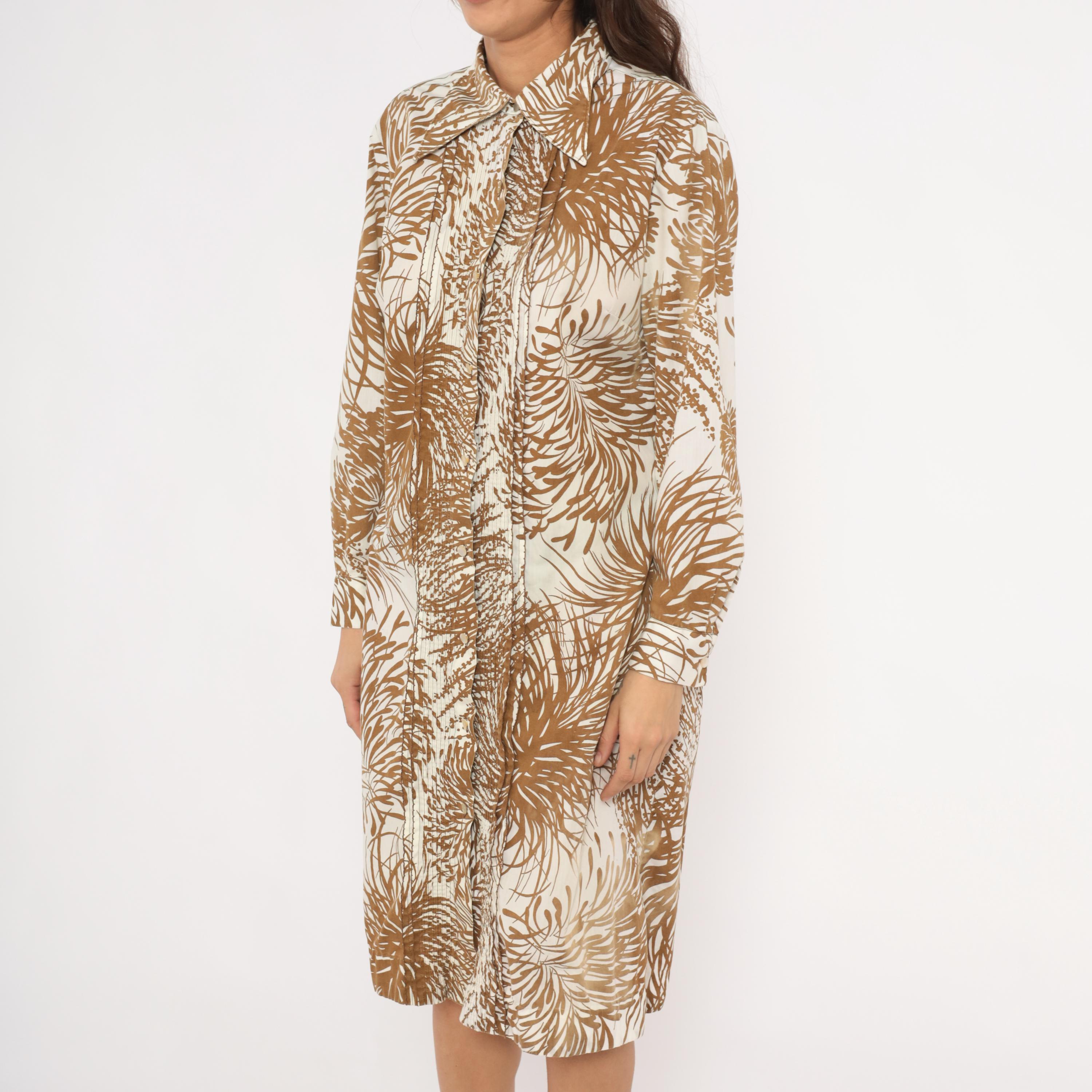 70s button front shirt dress from The Spectator in brown and cream with an allover tropical palm frond and fern print. Pointed spread collar, pintucked bib panel down the center front, and long sleeves with buttoned cuffs. A-line silhouette with a knee-length hem.