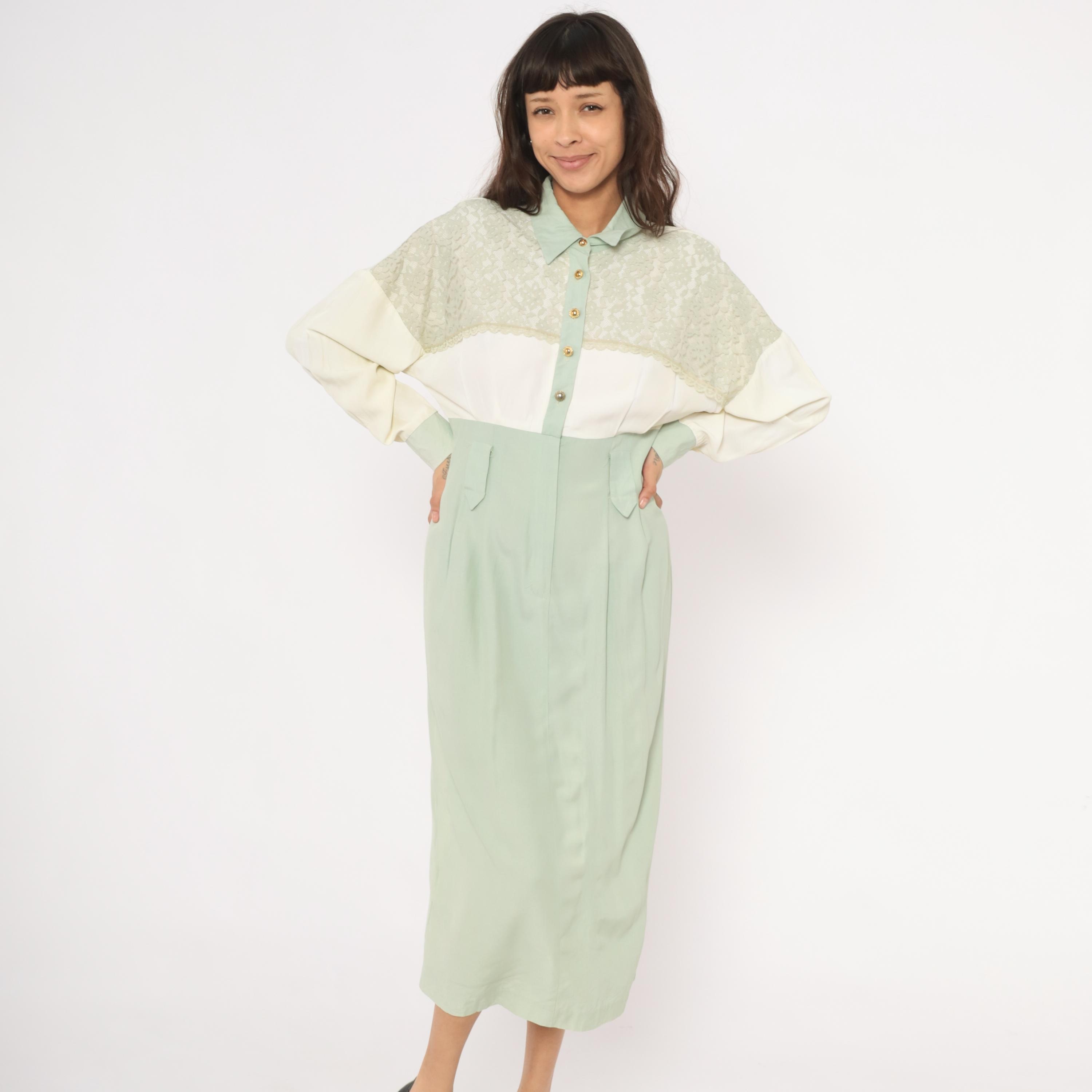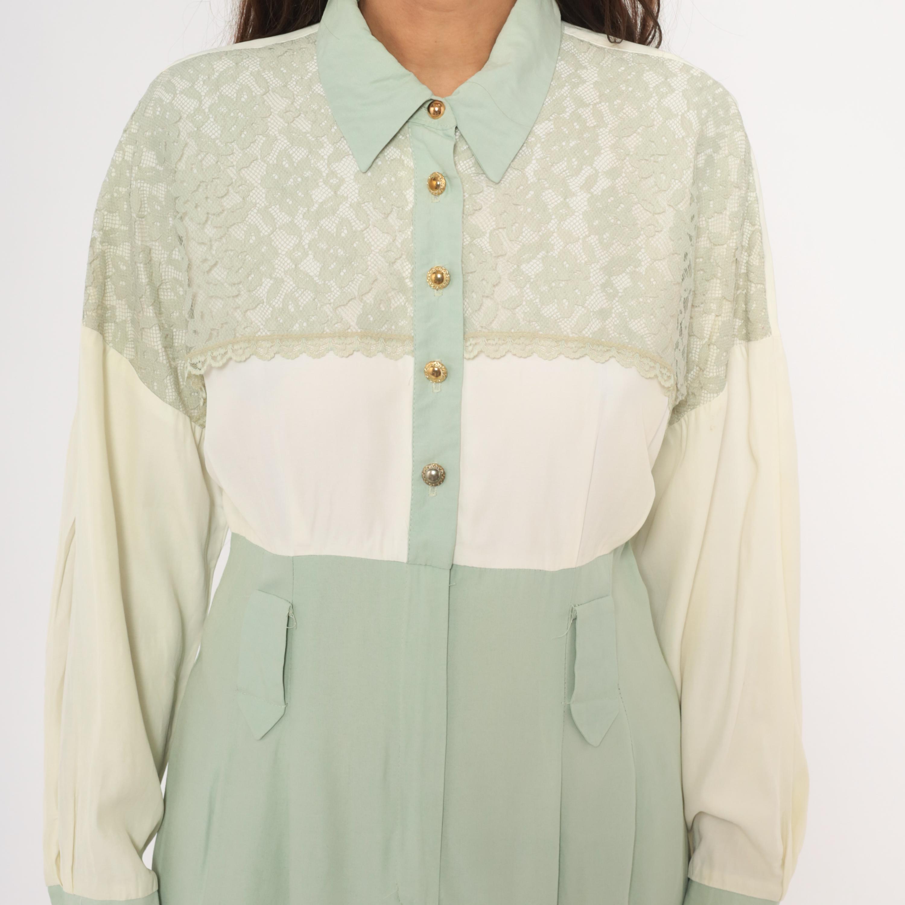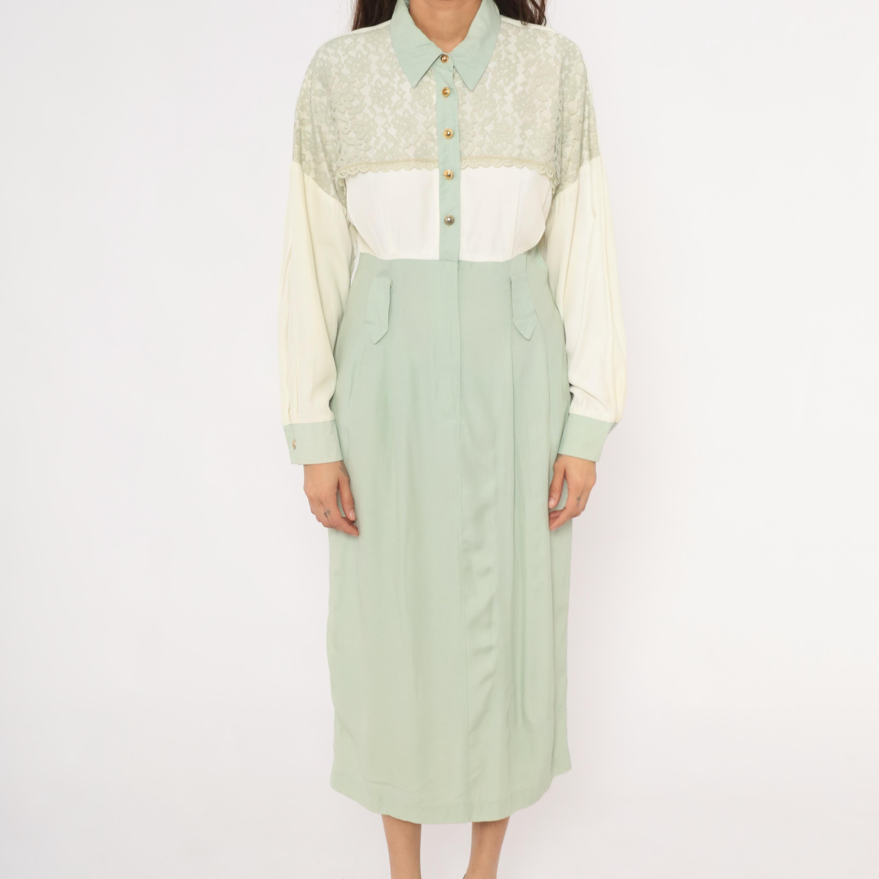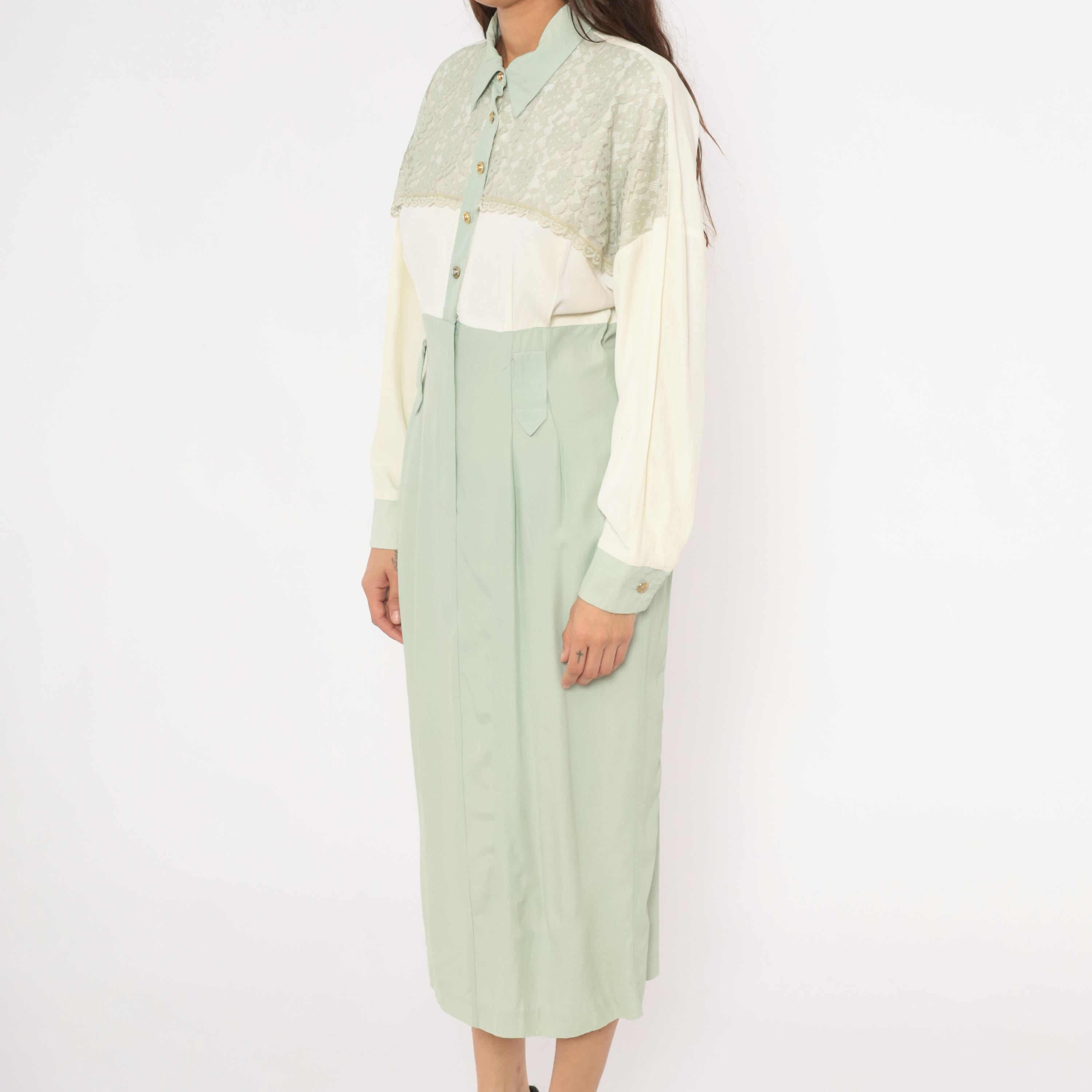 90s sage and cream color-blocked shirt dress from Irresistible with a lace yoke overlay across the upper chest and shoulders, pointed collar, and gold-tone dome button front closure. The bodice is ivory with lace detailing along the scalloped edge, transitioning to a high-waisted mint green skirt portion with front pockets and front zipper with hook-and-eye closure. Long balloon sleeves in cream with sage cuffs, and a straight midi-length skirt with center front seam.