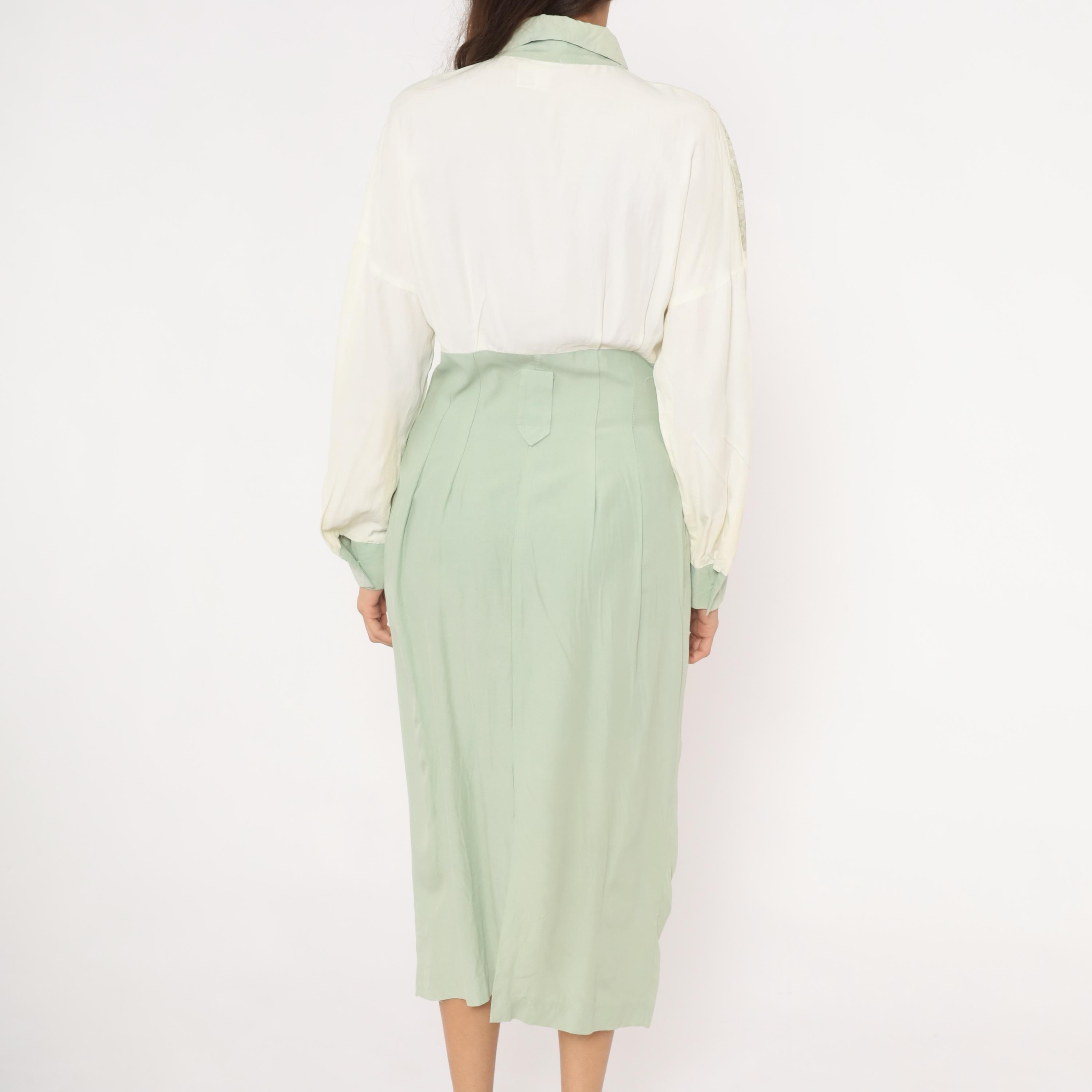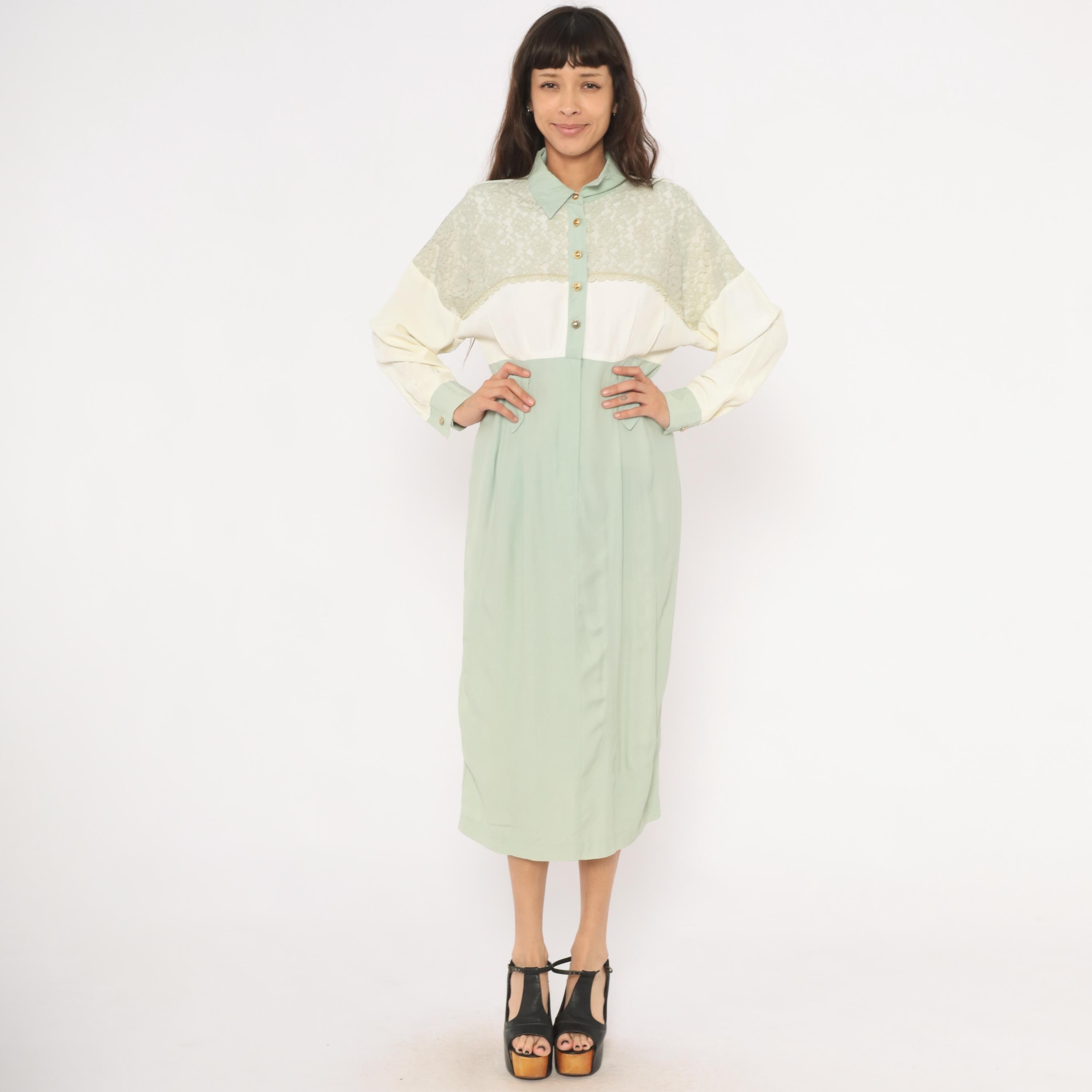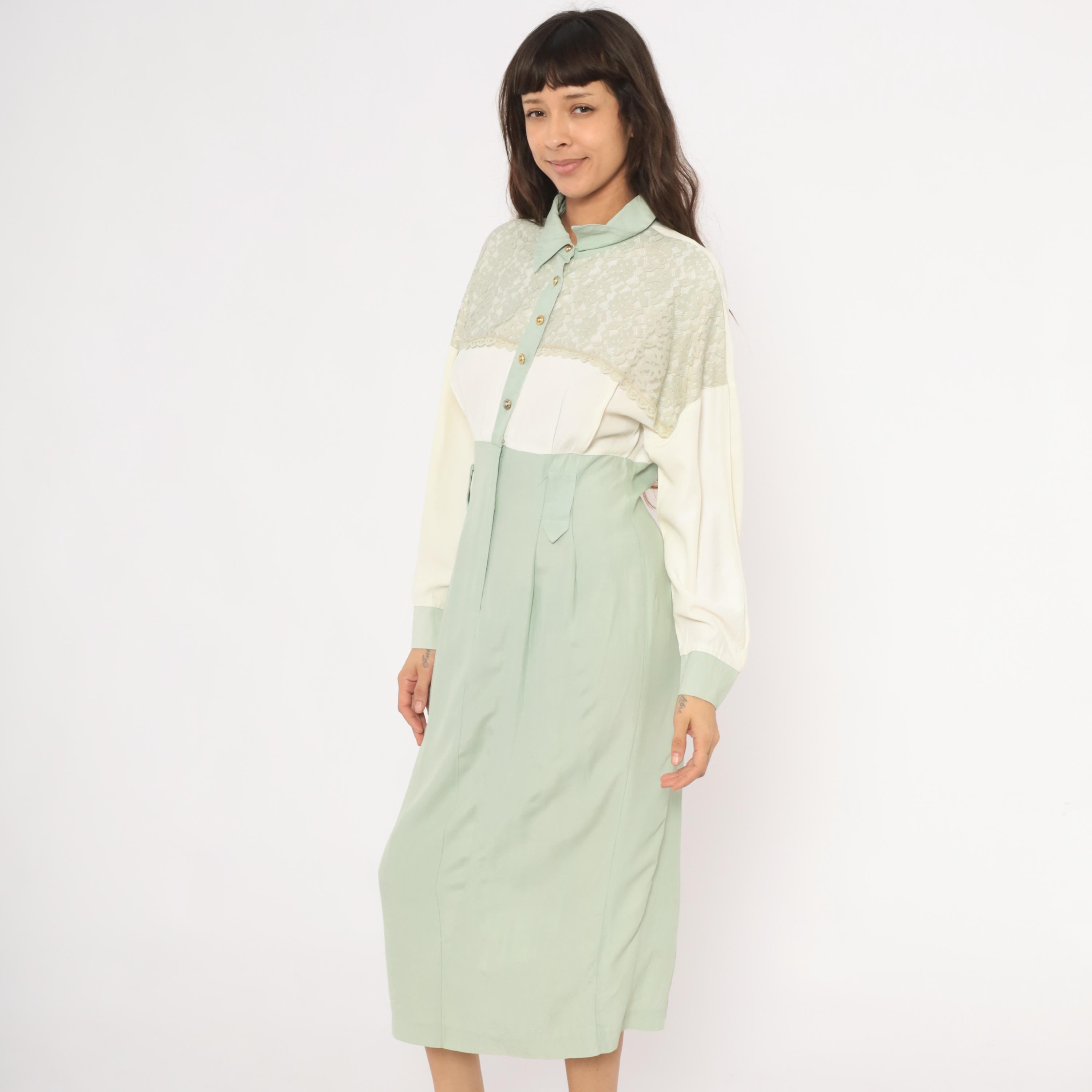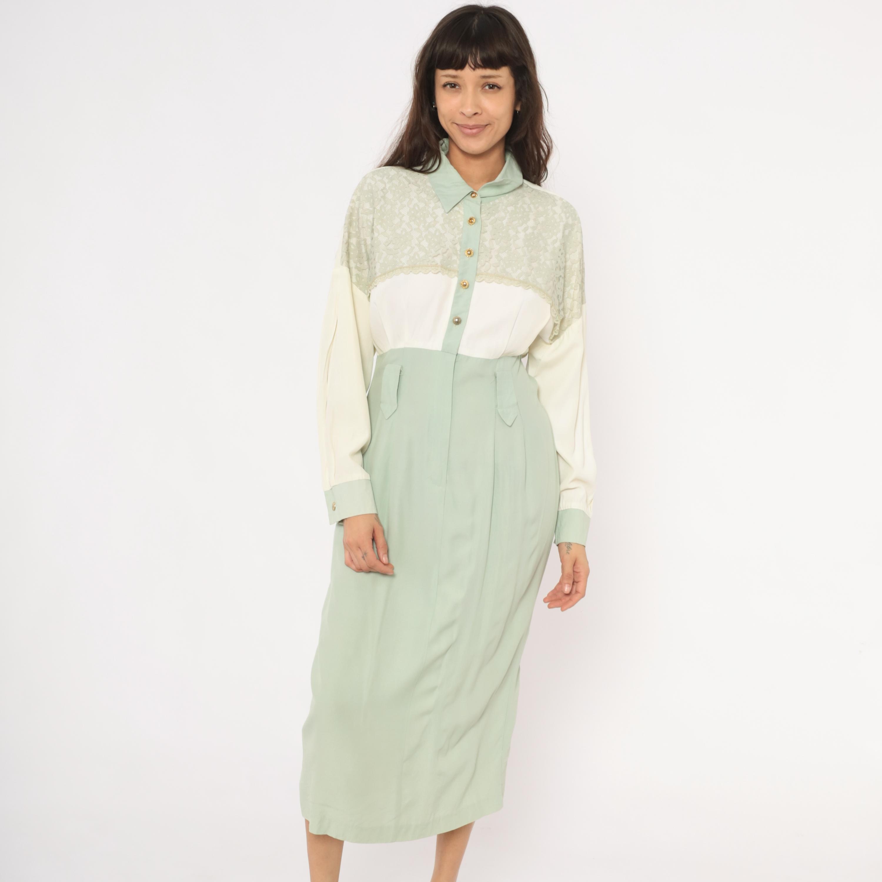 90s sage and cream color-blocked shirt dress from Irresistible with a lace yoke overlay across the upper chest and shoulders, pointed collar, and gold-tone dome button front closure. The bodice is ivory with lace detailing along the scalloped edge, transitioning to a high-waisted mint green skirt portion with front pockets and front zipper with hook-and-eye closure. Long balloon sleeves in cream with sage cuffs, and a straight midi-length skirt with center front seam.