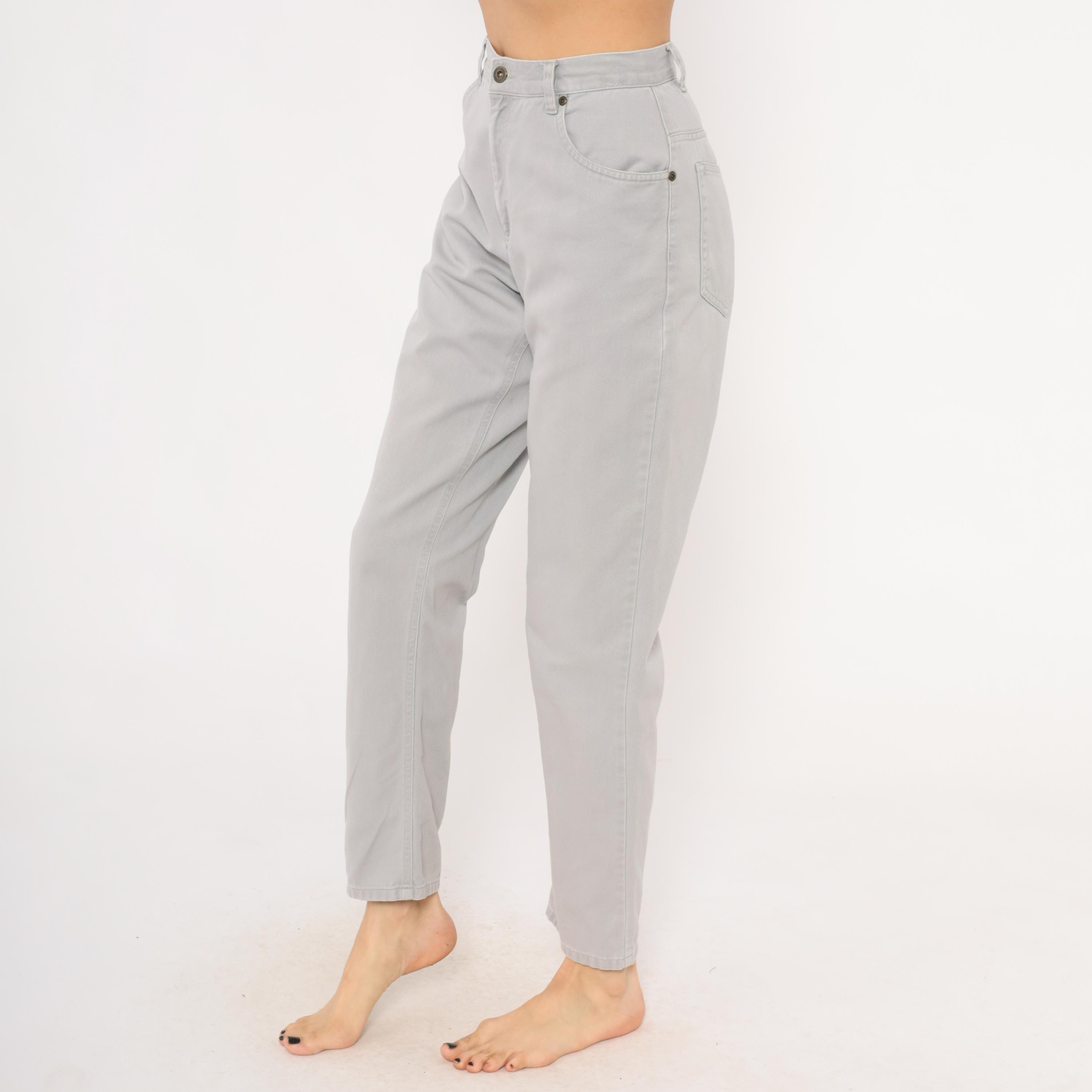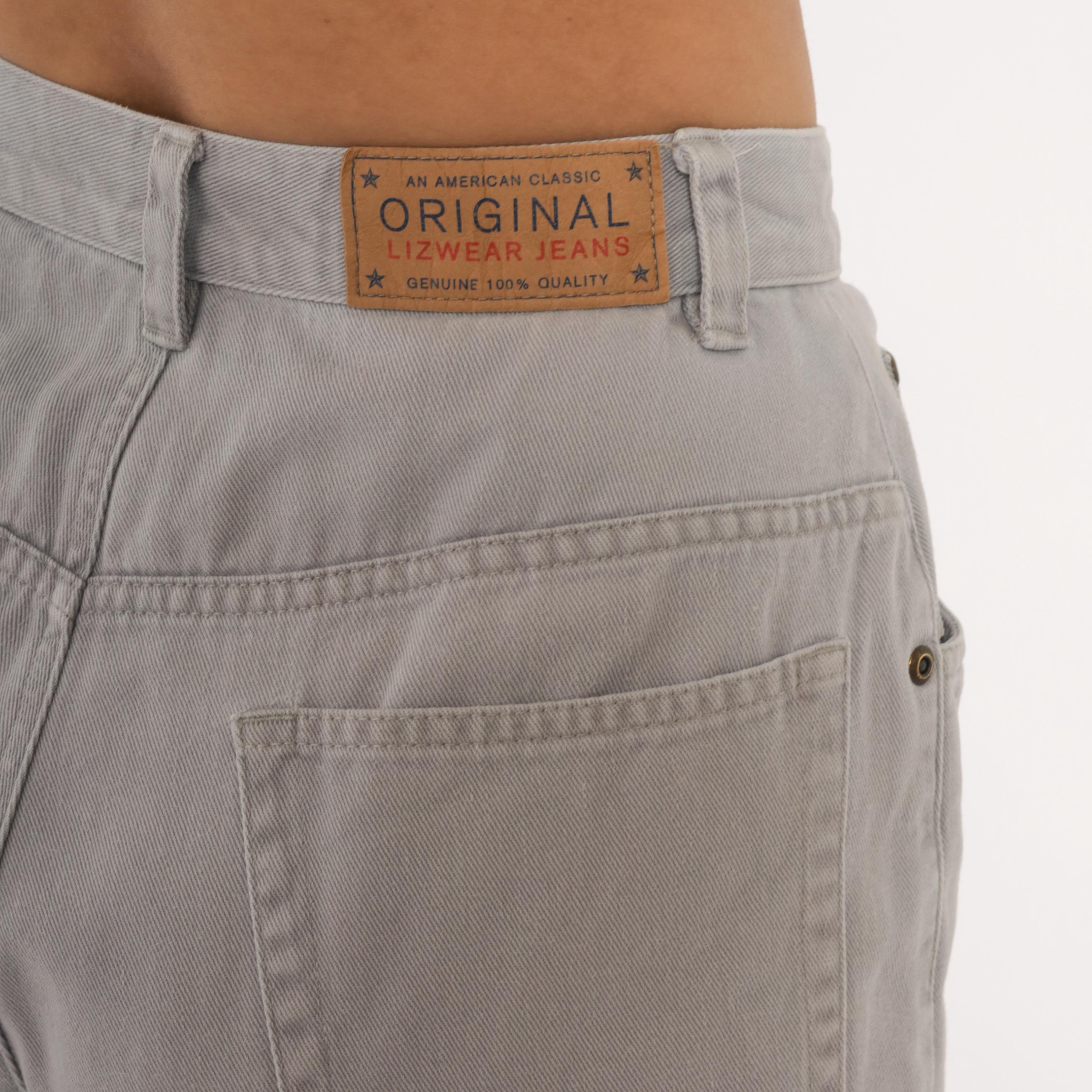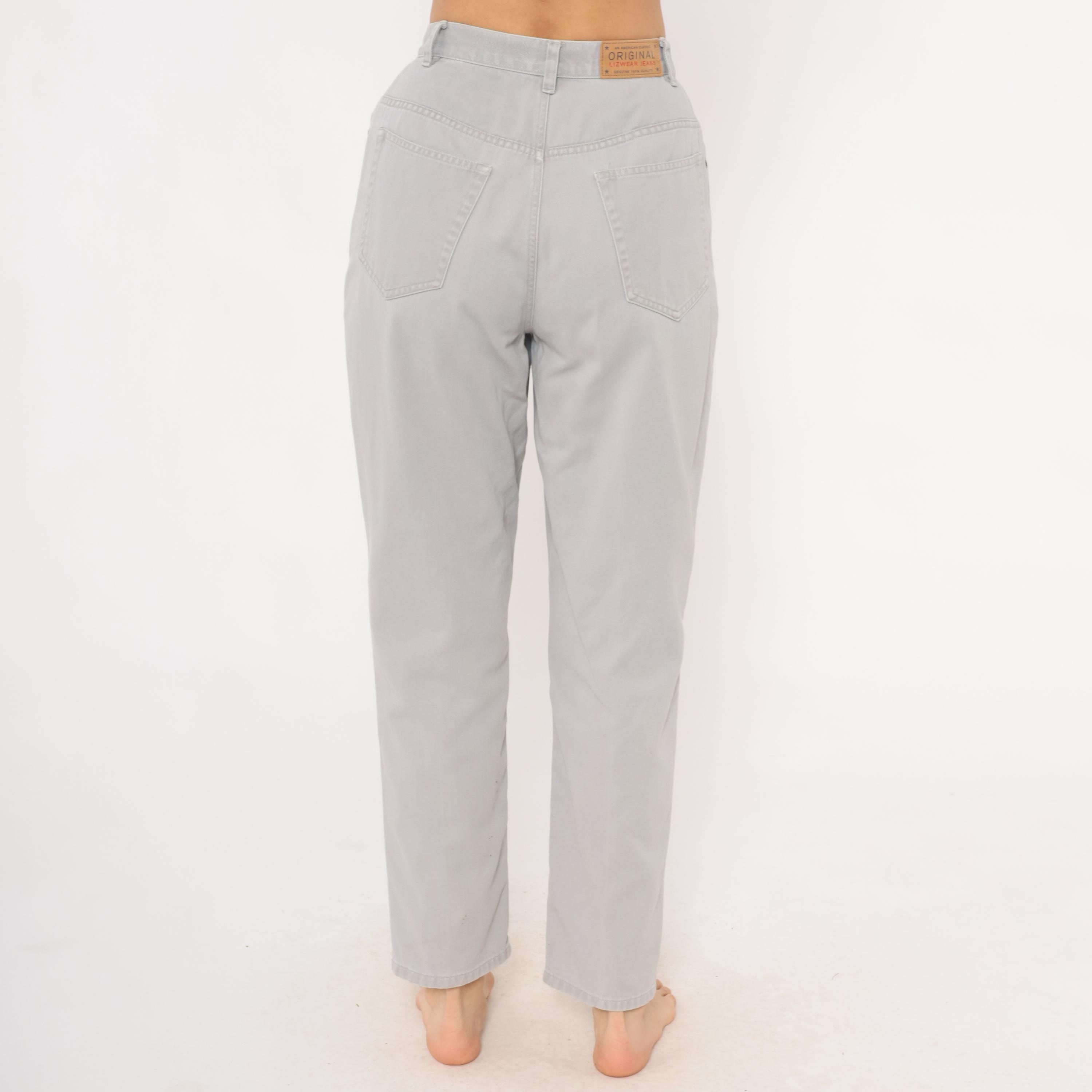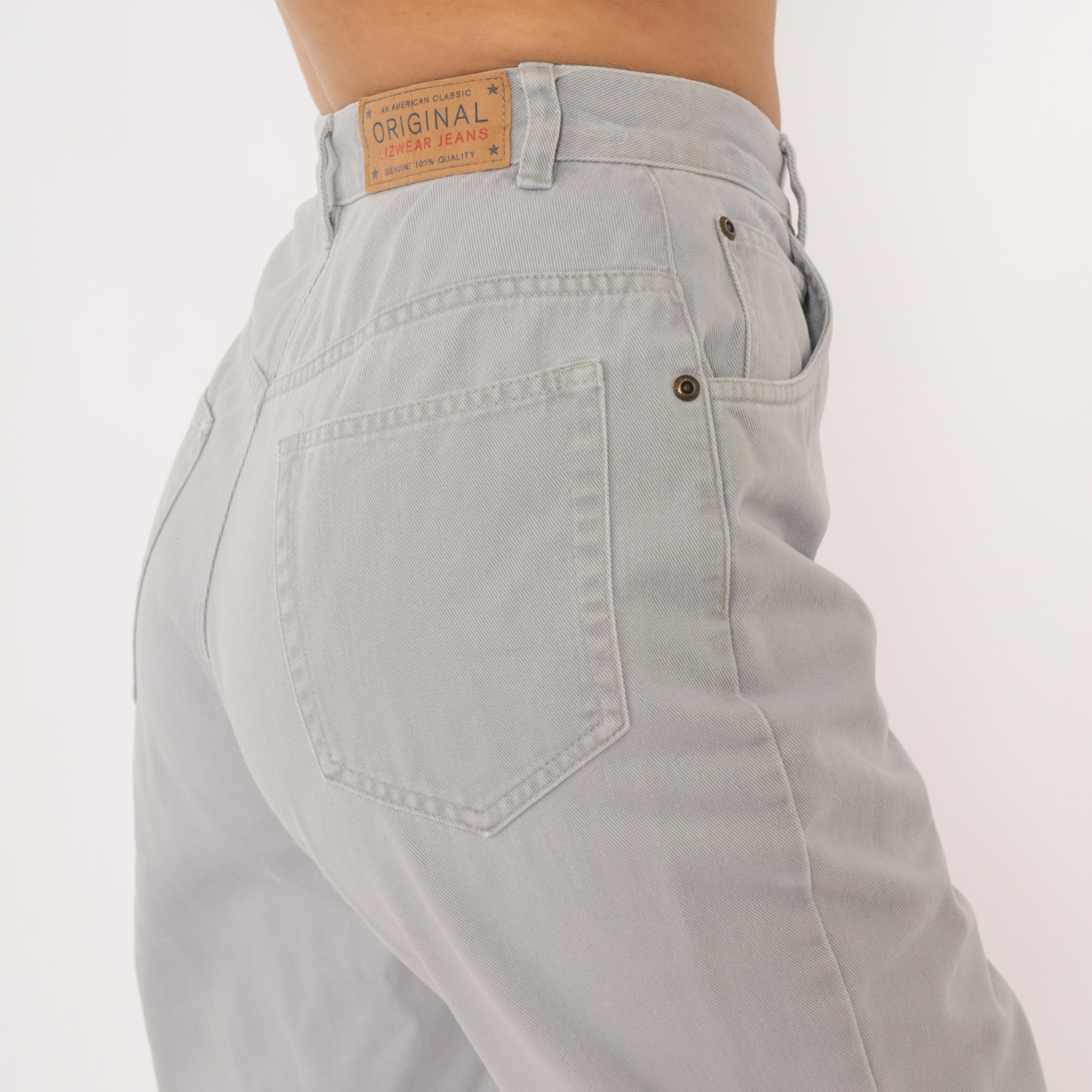 90s grey high waisted jeans from Liz Claiborne with a tapered leg and five-pocket construction. Button and zipper front closure, belt loops, and a leather brand patch on the back waistband. Tonal stitching throughout in a slate grey wash.