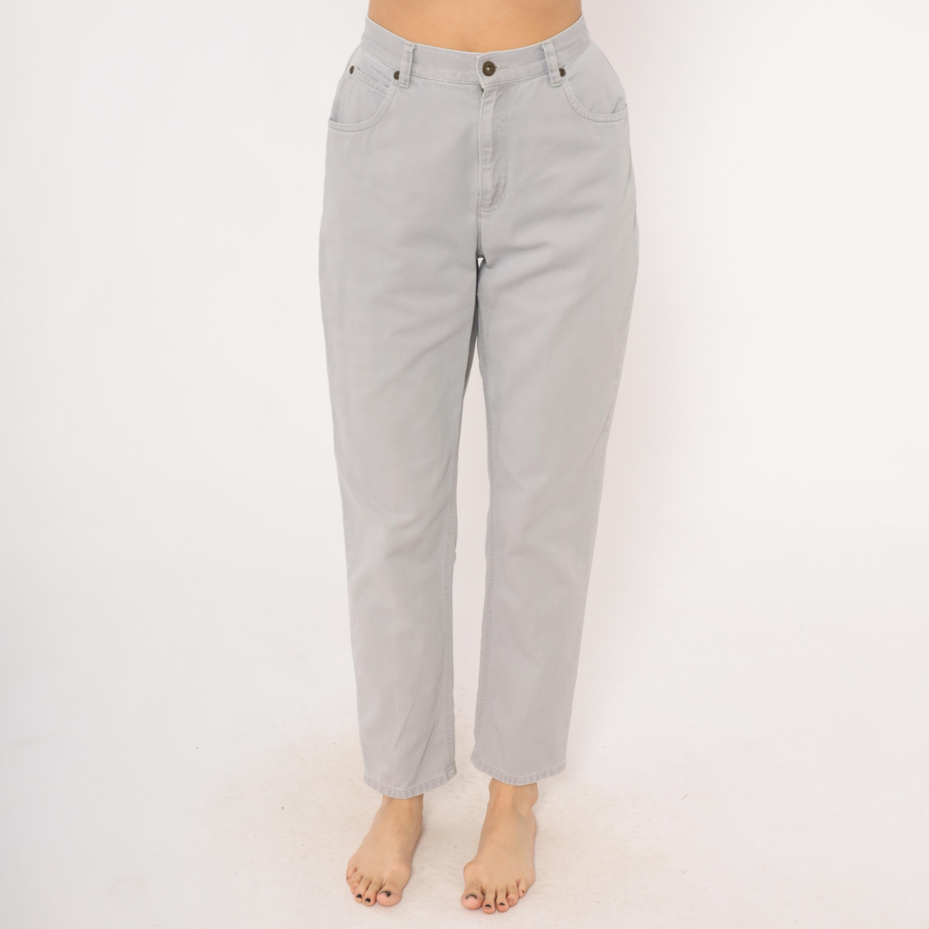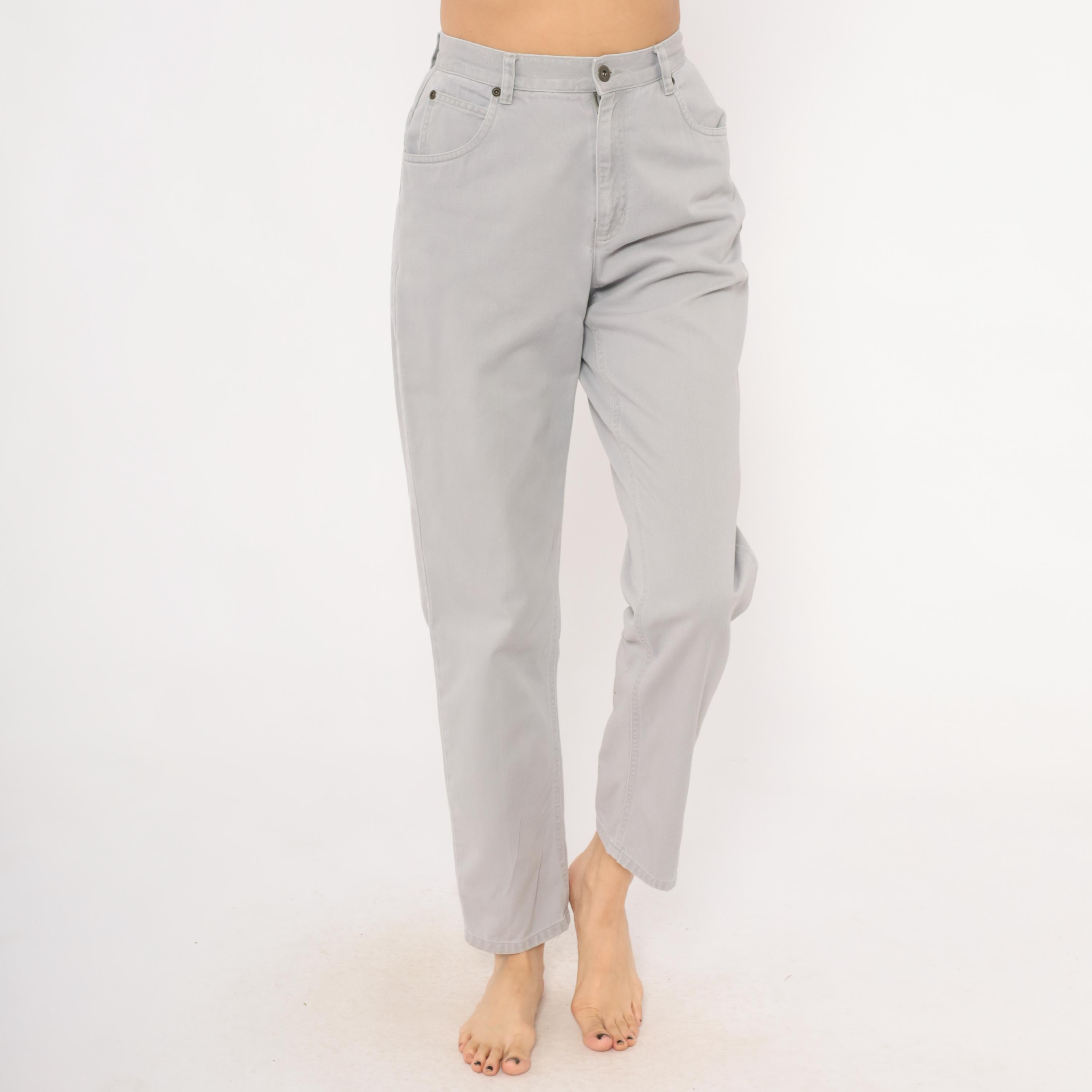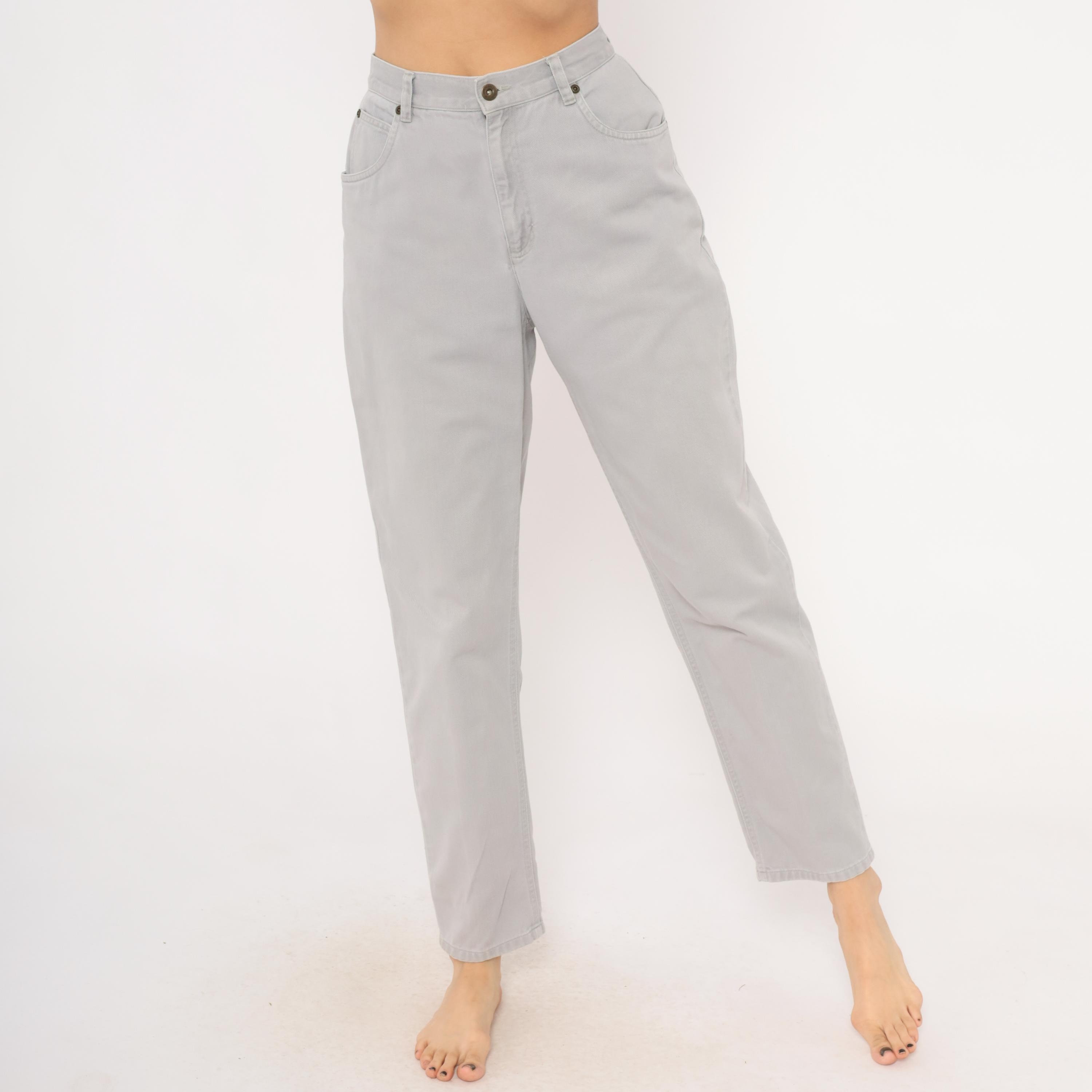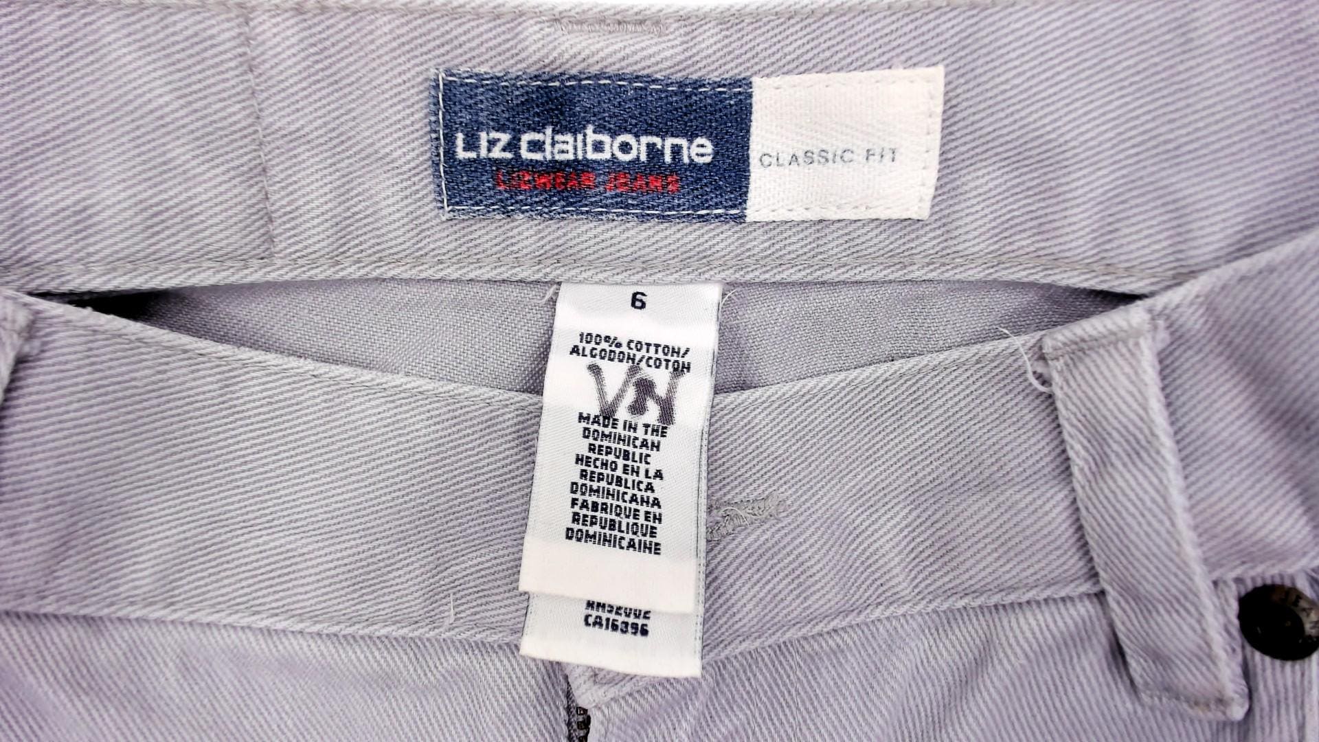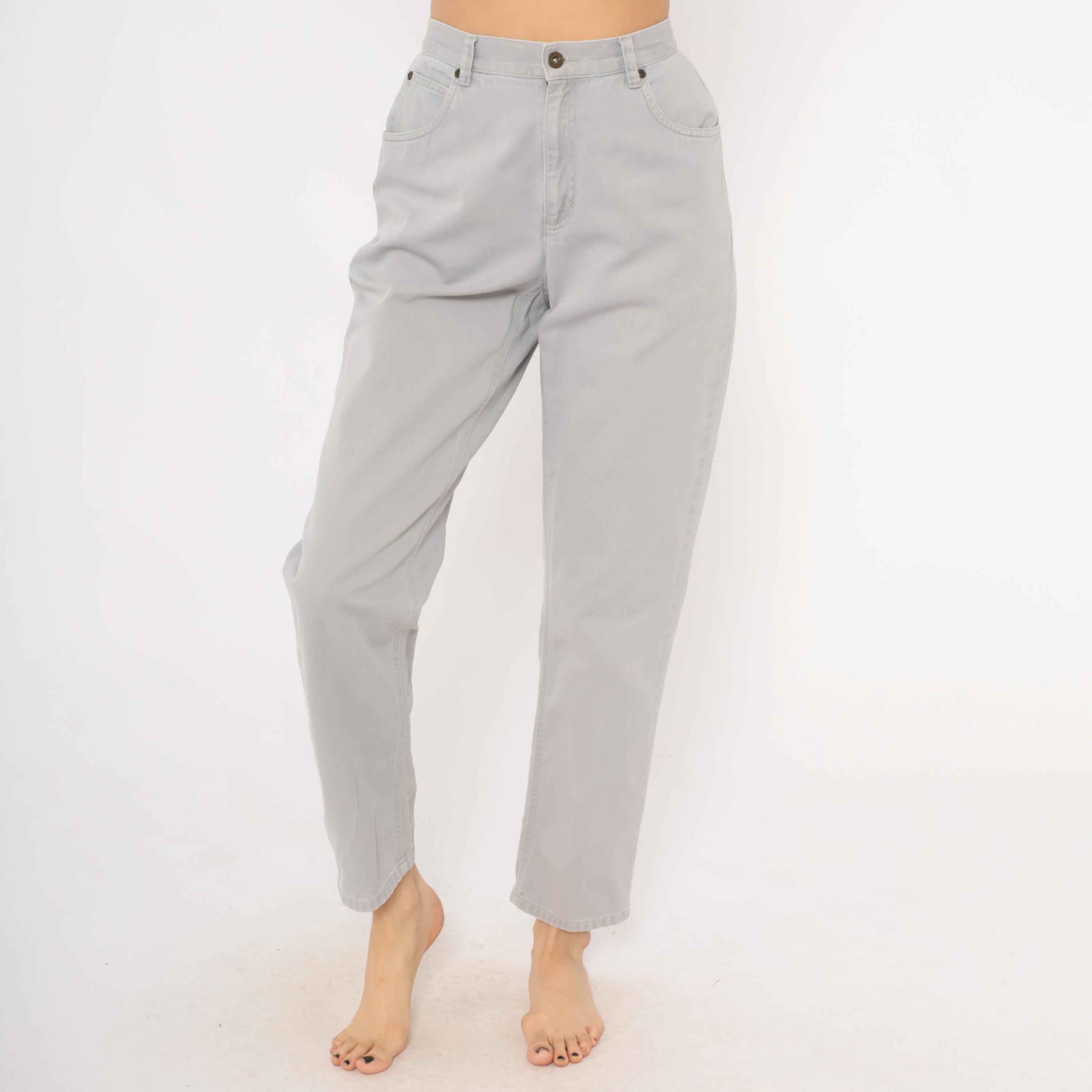 90s grey high waisted jeans from Liz Claiborne with a tapered leg and five-pocket construction. Button and zipper front closure, belt loops, and a leather brand patch on the back waistband. Tonal stitching throughout in a slate grey wash.
