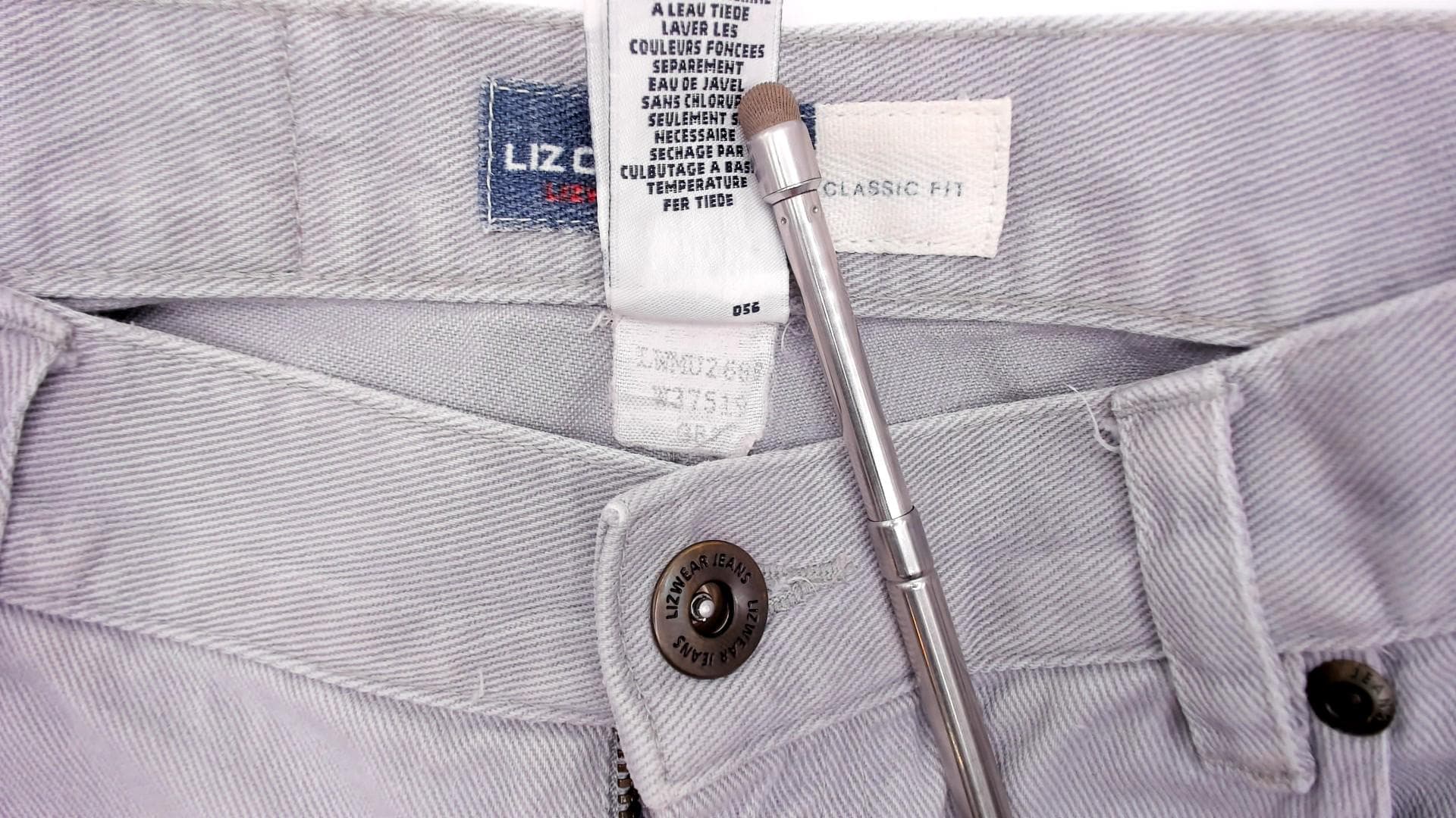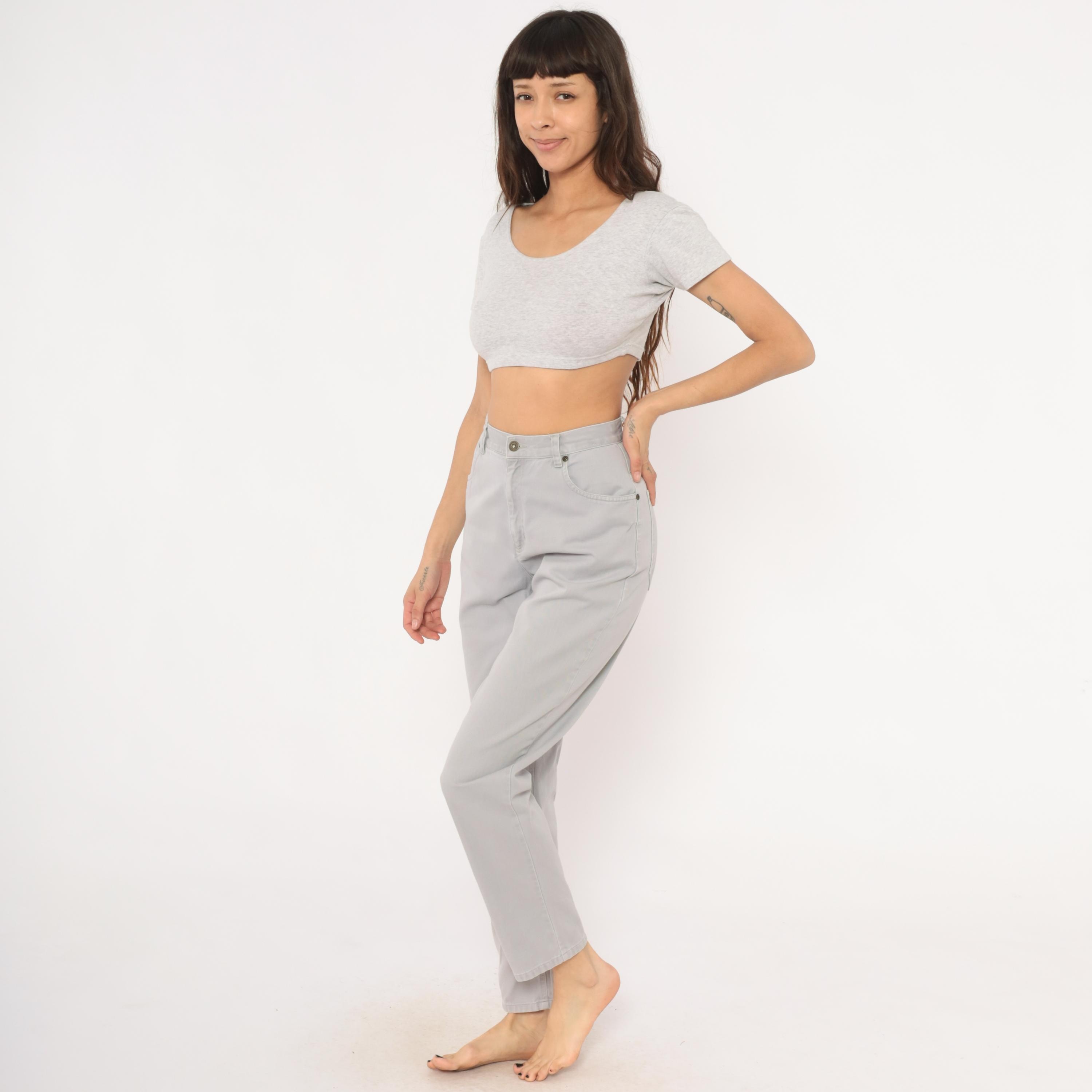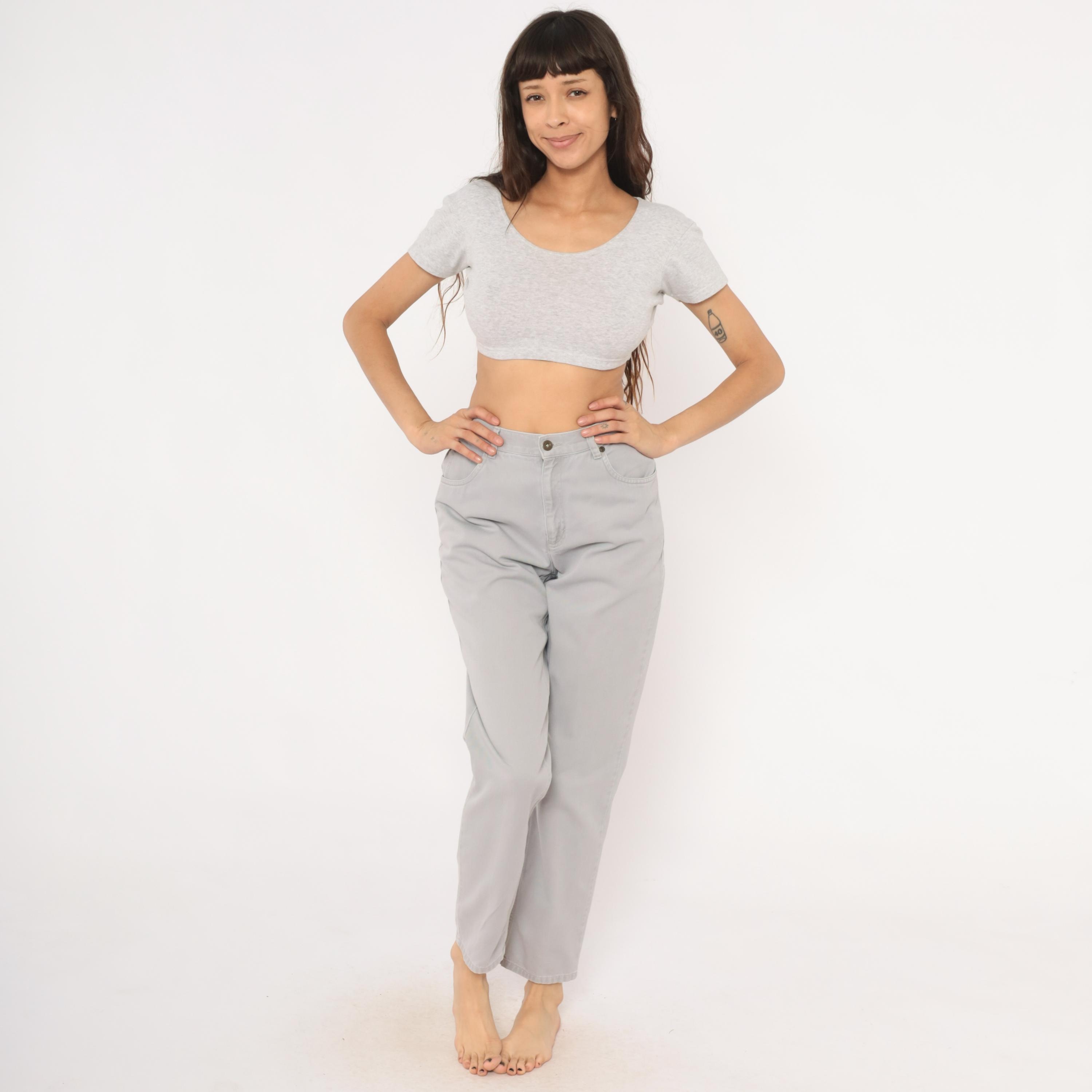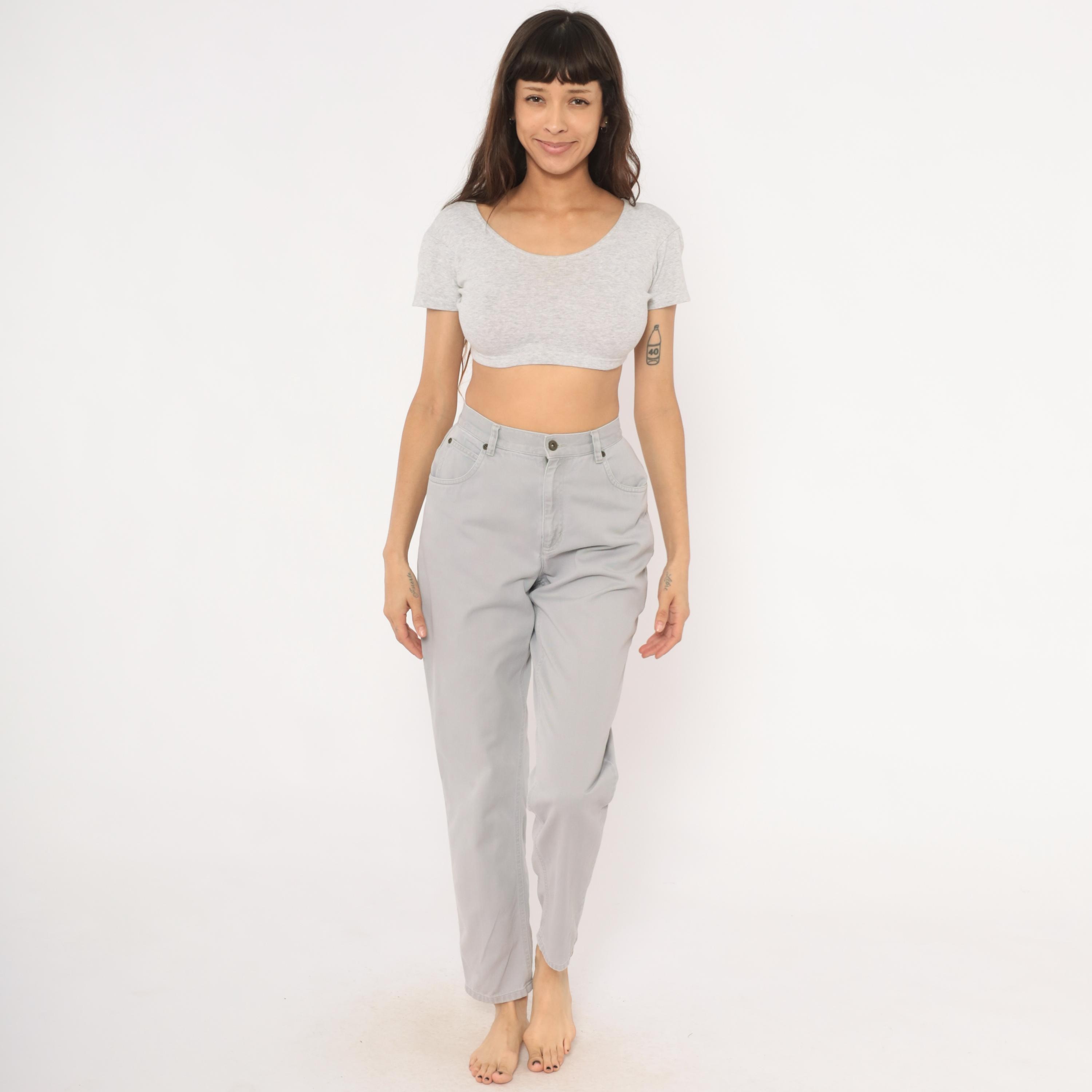 90s grey high waisted jeans from Liz Claiborne with a tapered leg and five-pocket construction. Button and zipper front closure, belt loops, and a leather brand patch on the back waistband. Tonal stitching throughout in a slate grey wash.