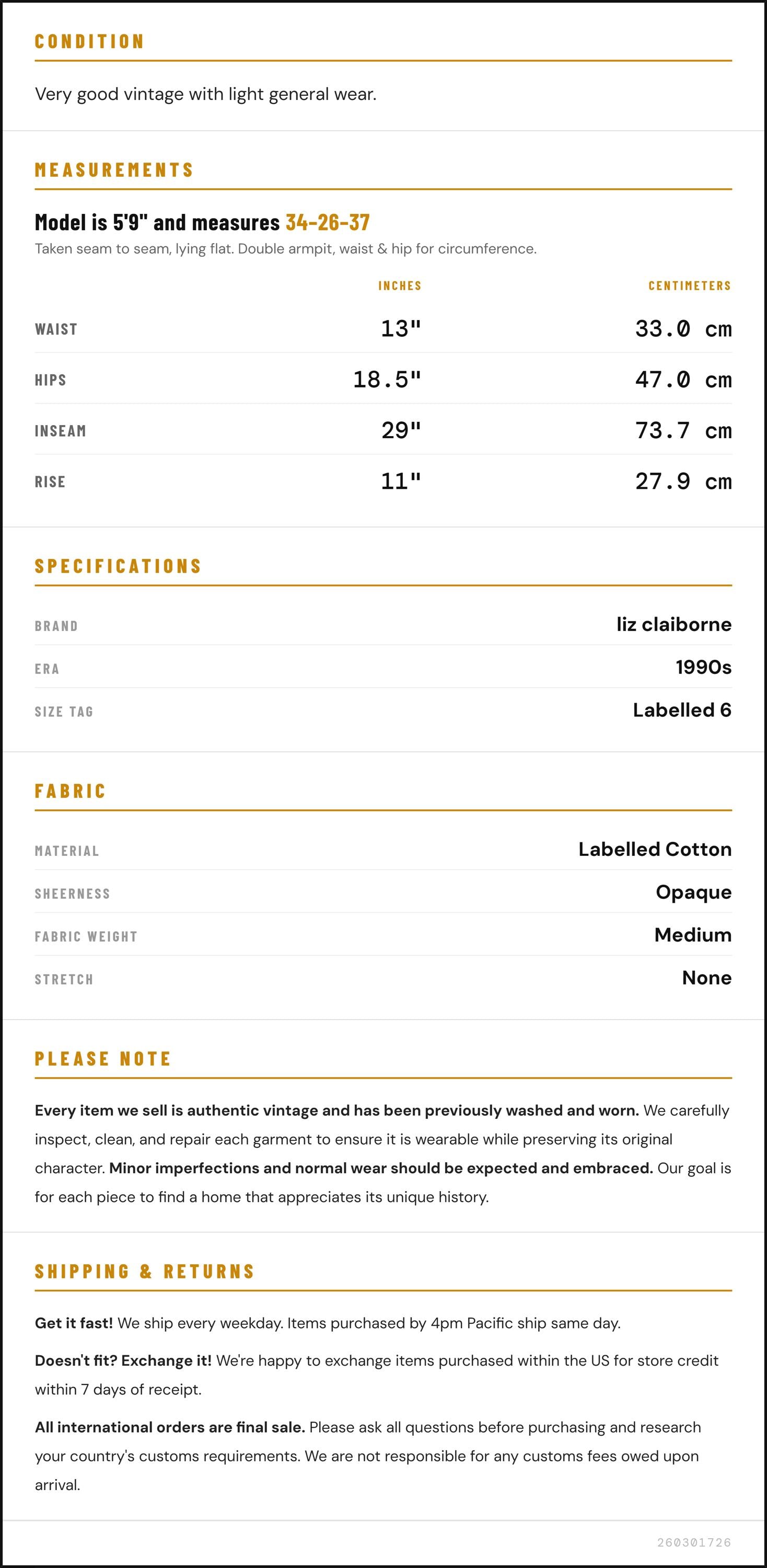 Vintage denim was usually made without any stretch, unlike modern jeans. Check the measurements to ensure proper fit, and remember to give yourself a little wiggle room in the waist and hips, depending on your preferred fit.