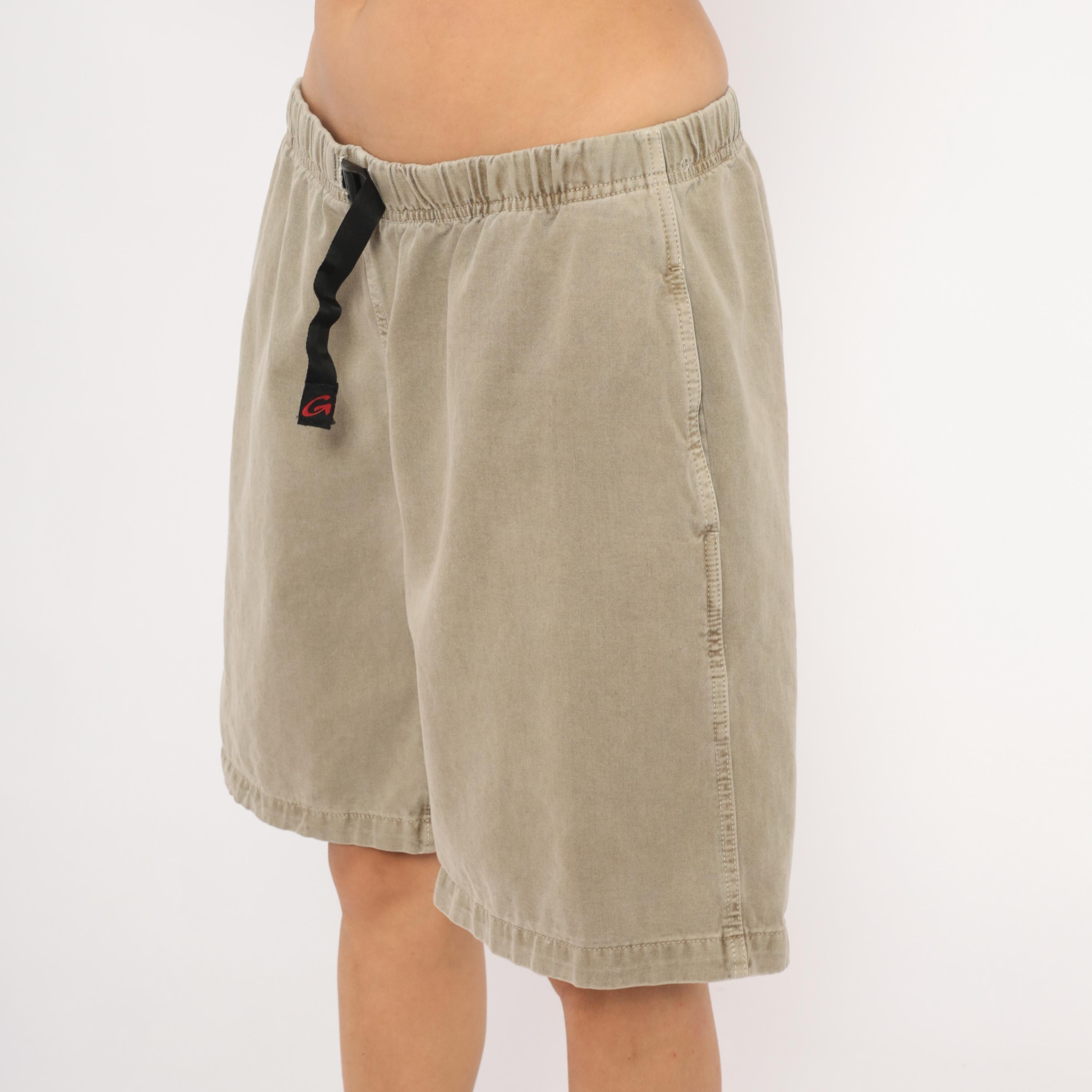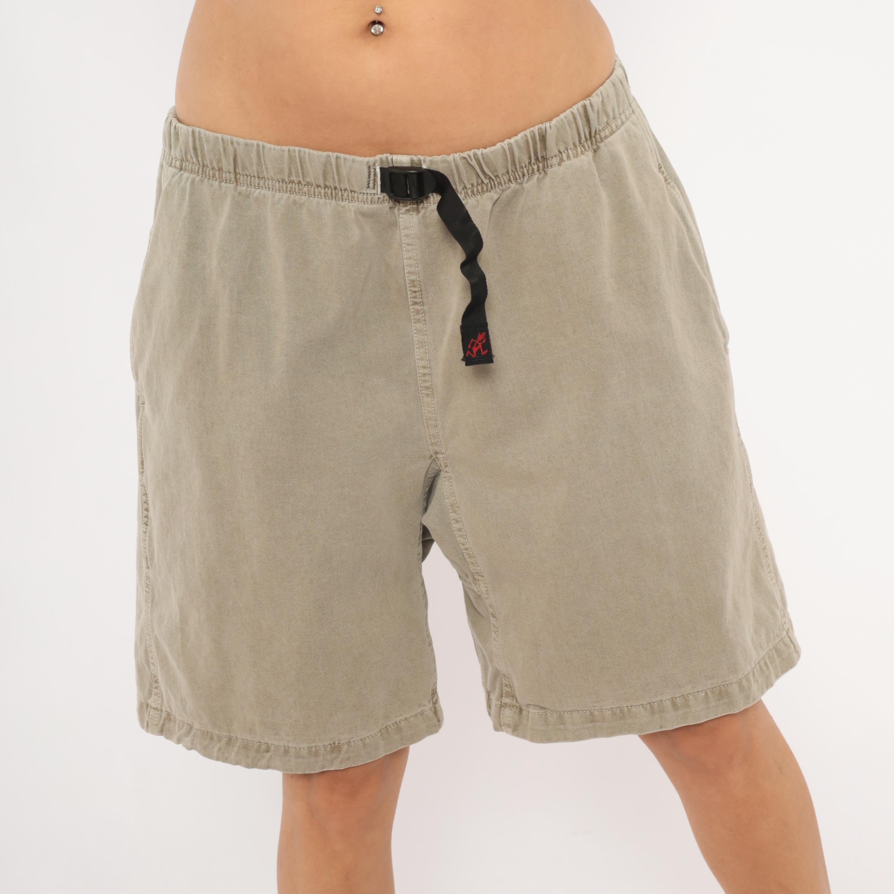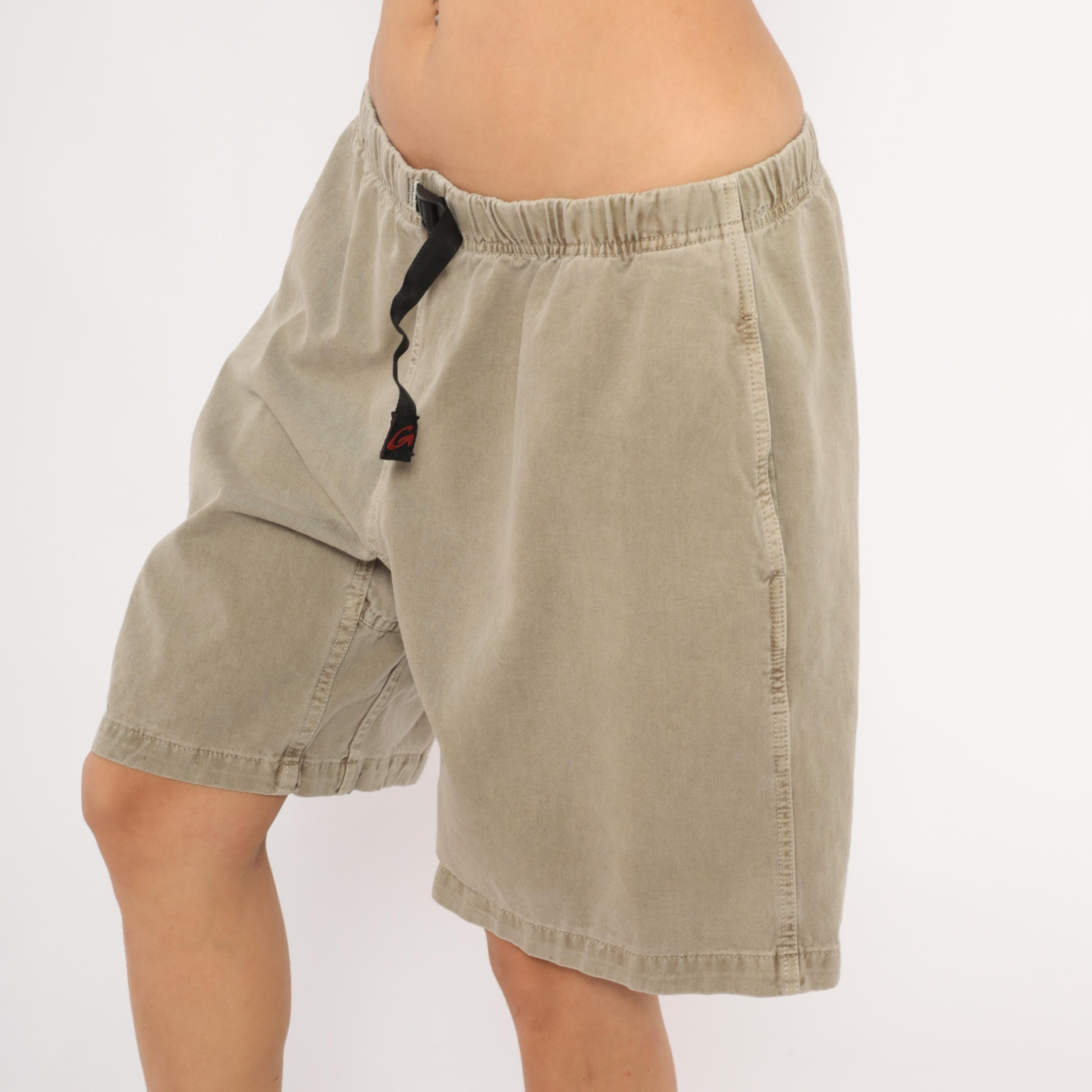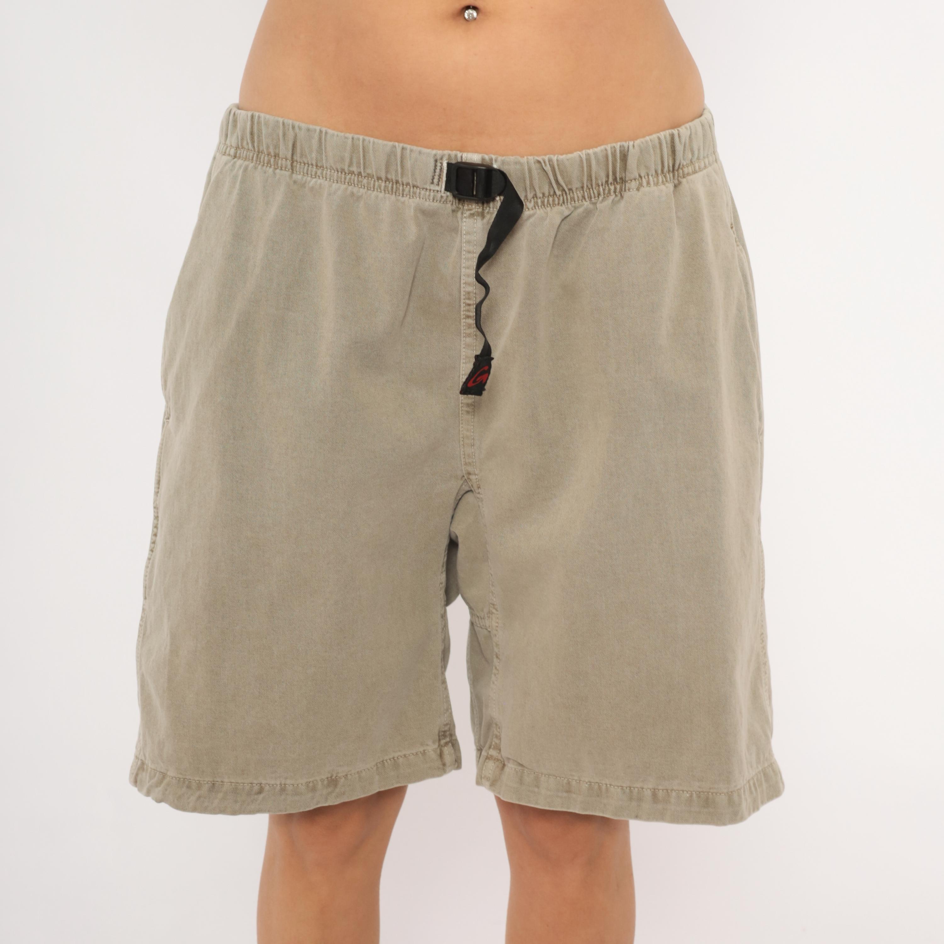 90s Gramicci climbing shorts in a faded tan with elastic waistband and signature black webbing buckle belt closure. Side seam pockets and a single rear welt pocket with branded label. Gusseted crotch seam and mid-thigh inseam length.