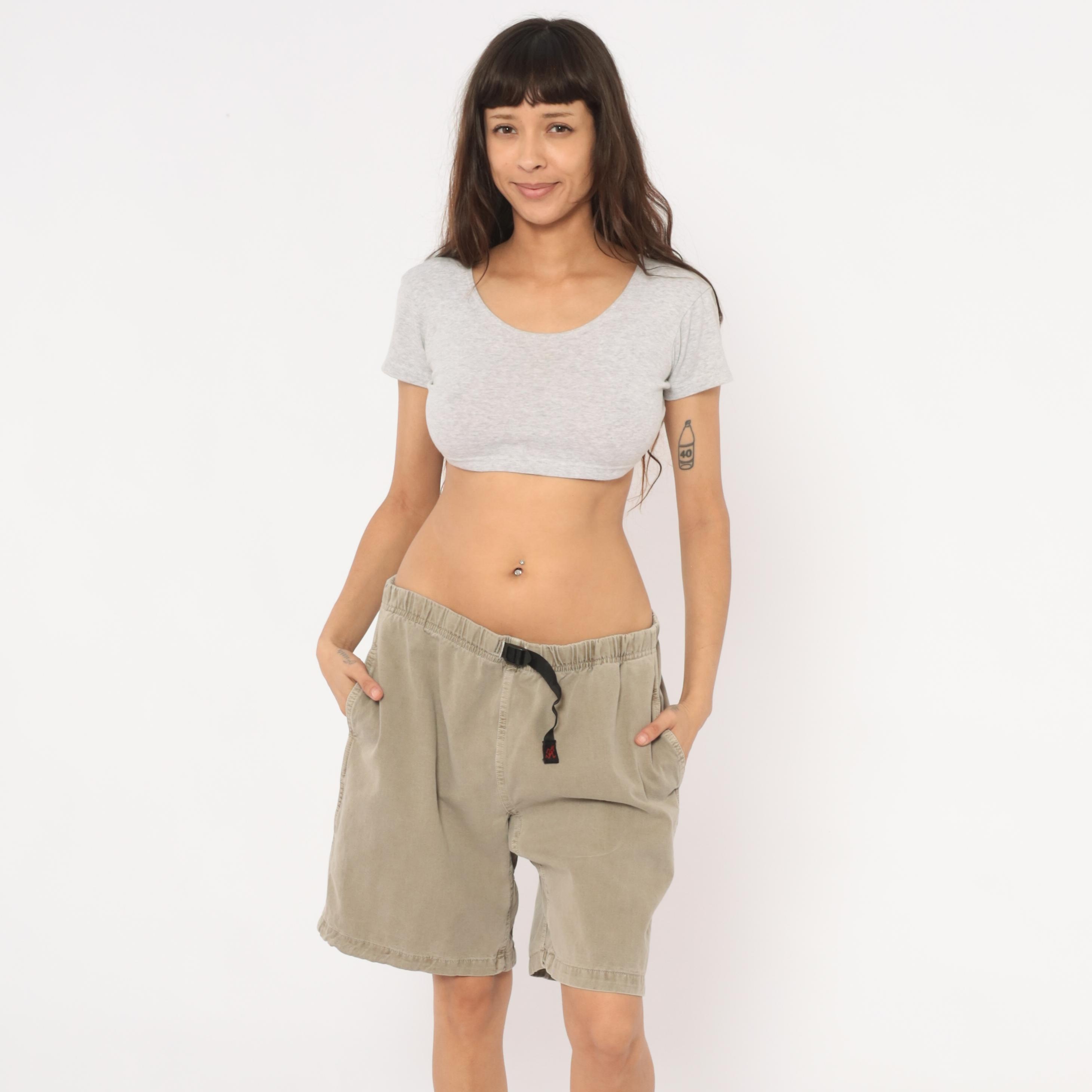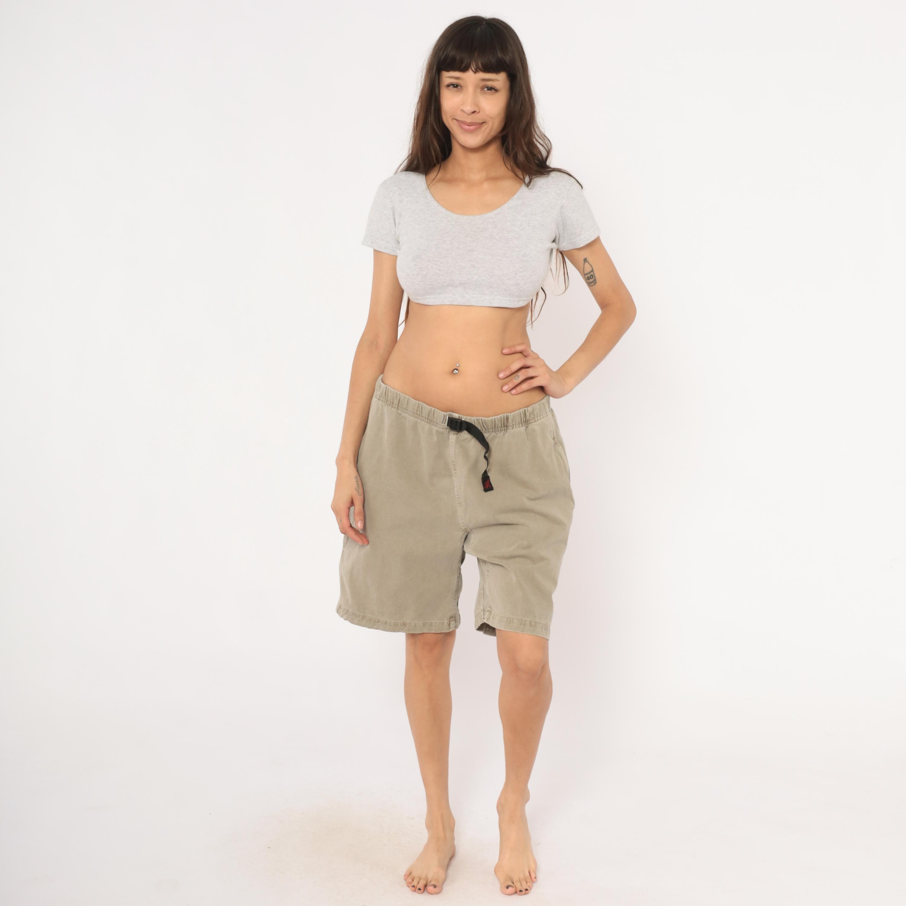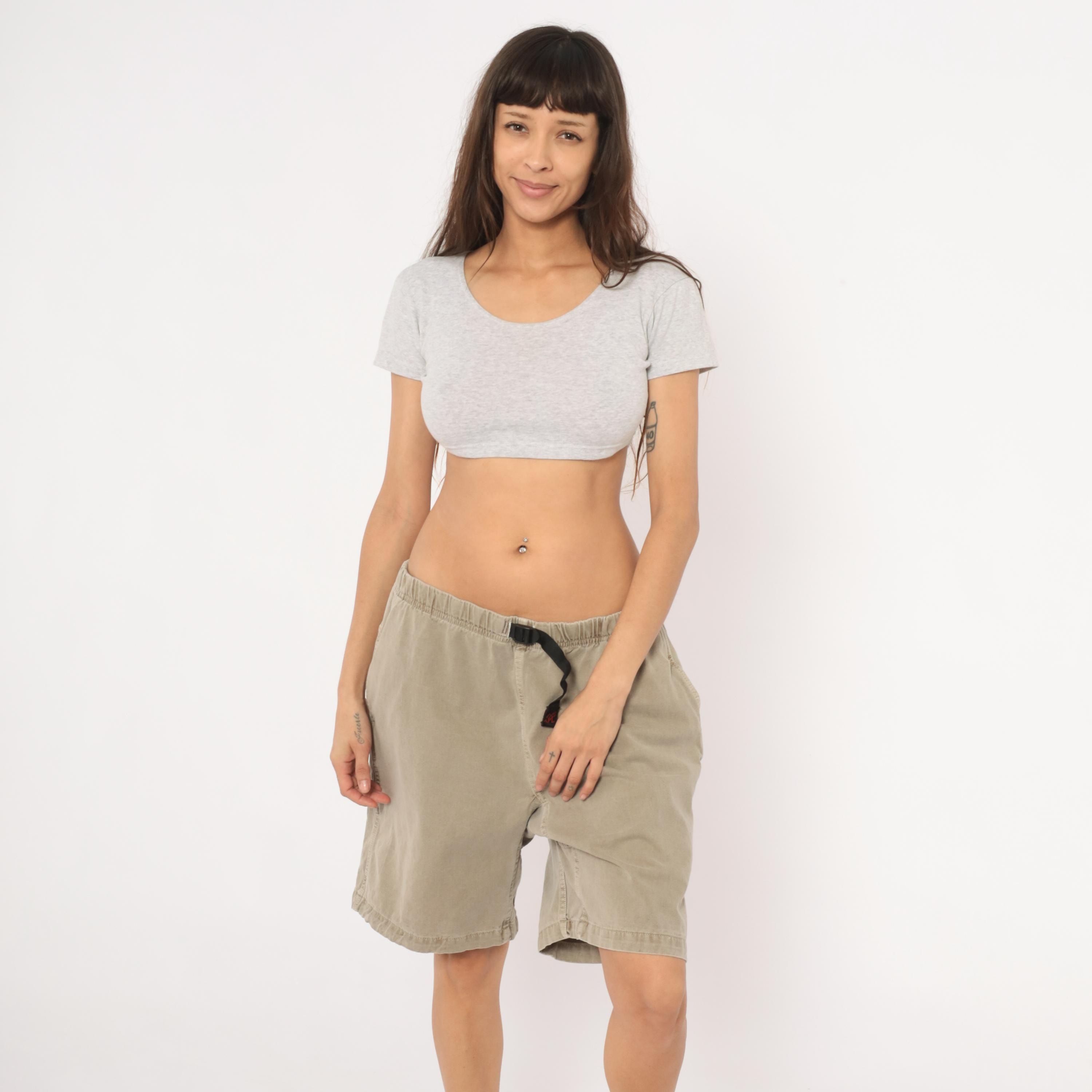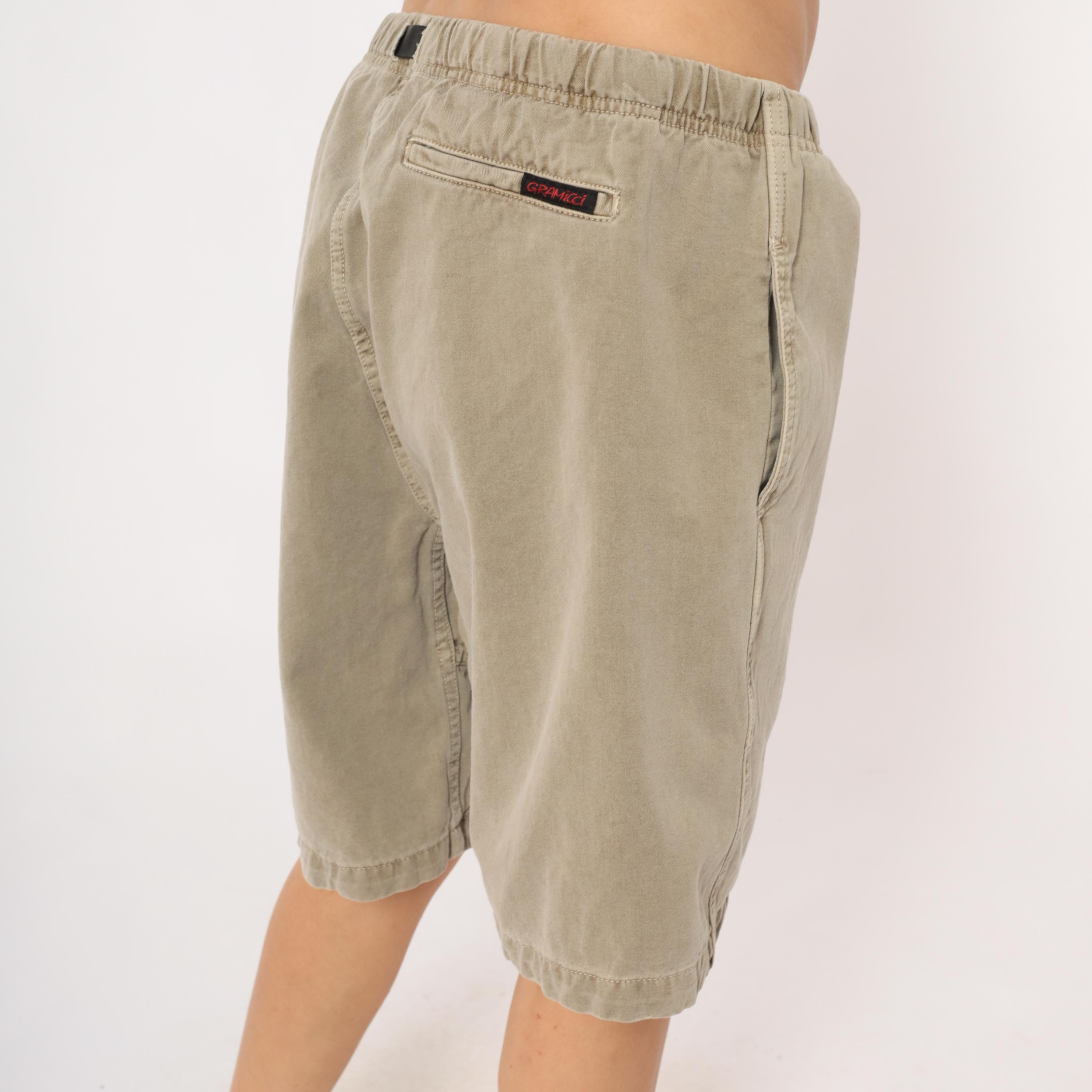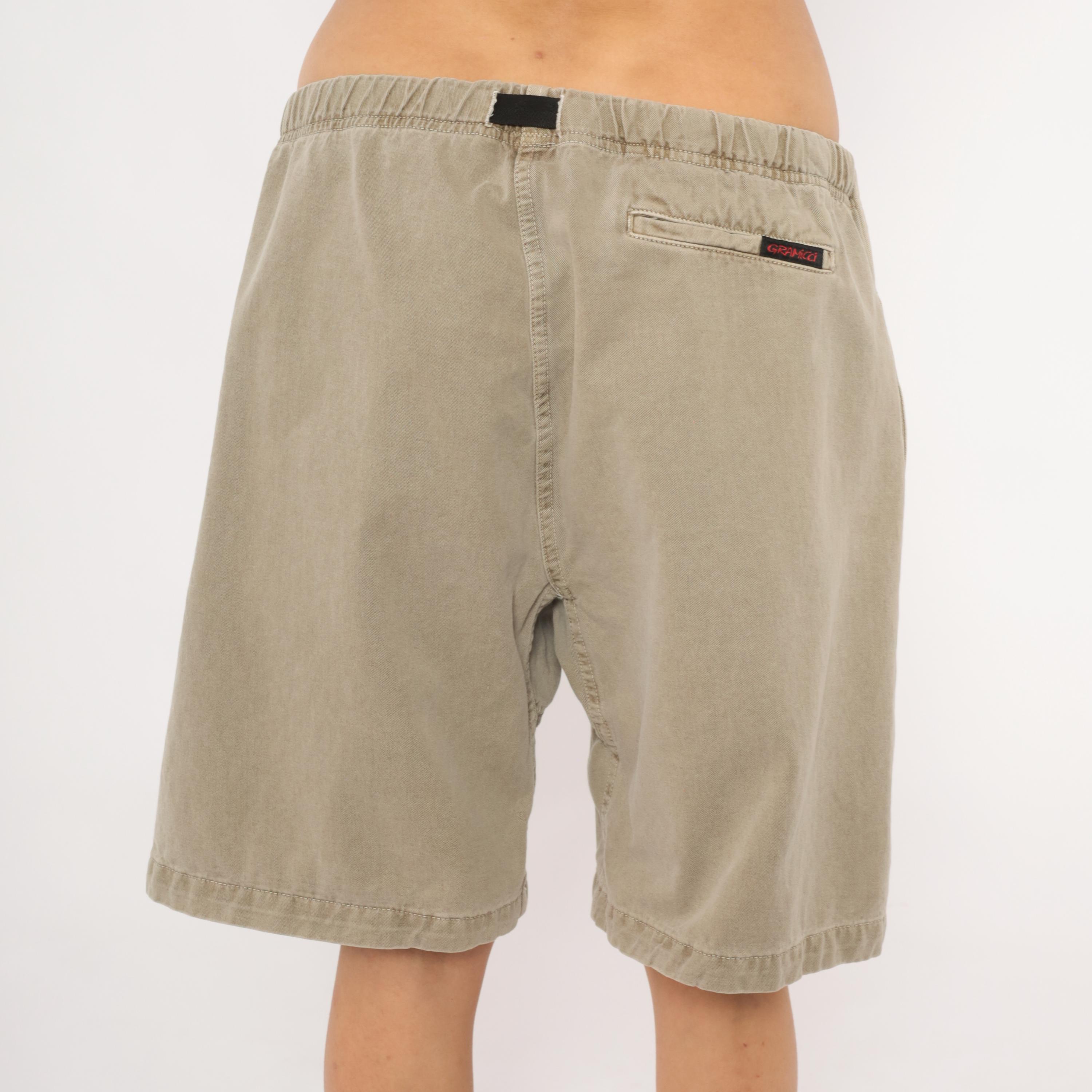 90s Gramicci climbing shorts in a faded tan with elastic waistband and signature black webbing buckle belt closure. Side seam pockets and a single rear welt pocket with branded label. Gusseted crotch seam and mid-thigh inseam length.