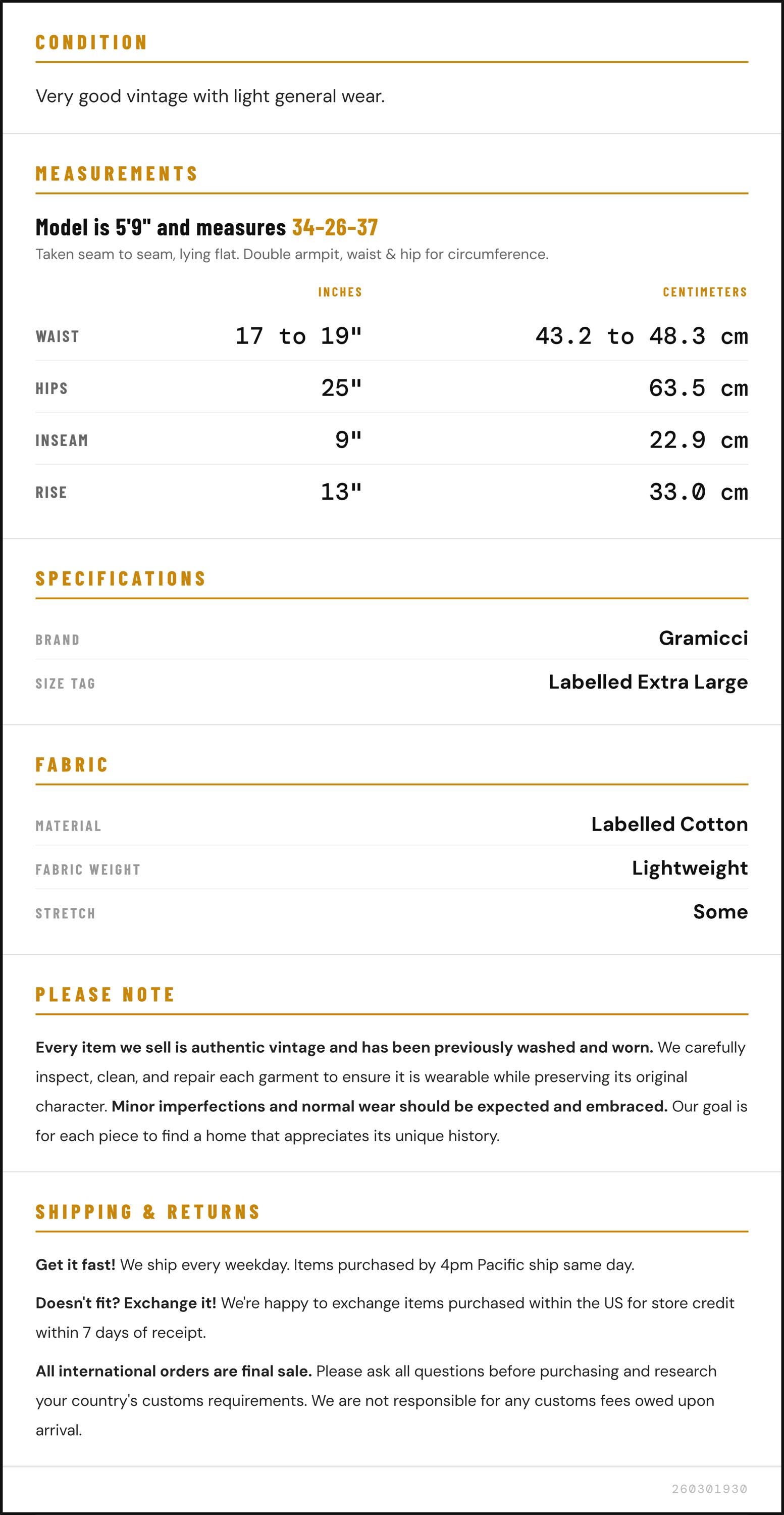 Vintage denim was usually made without any stretch, unlike modern jeans. Check the measurements to ensure proper fit, and remember to give yourself a little wiggle room in the waist and hips, depending on your preferred fit.