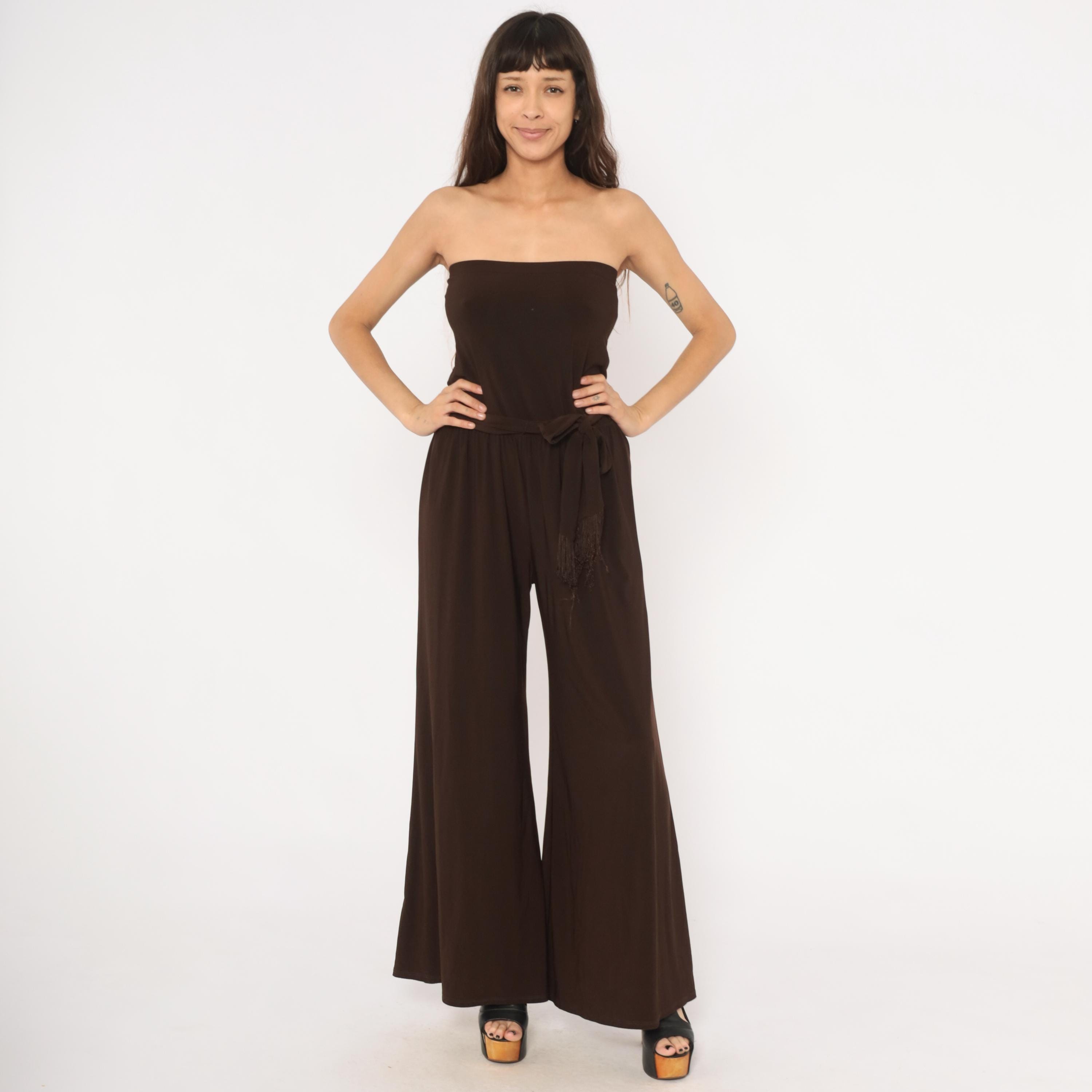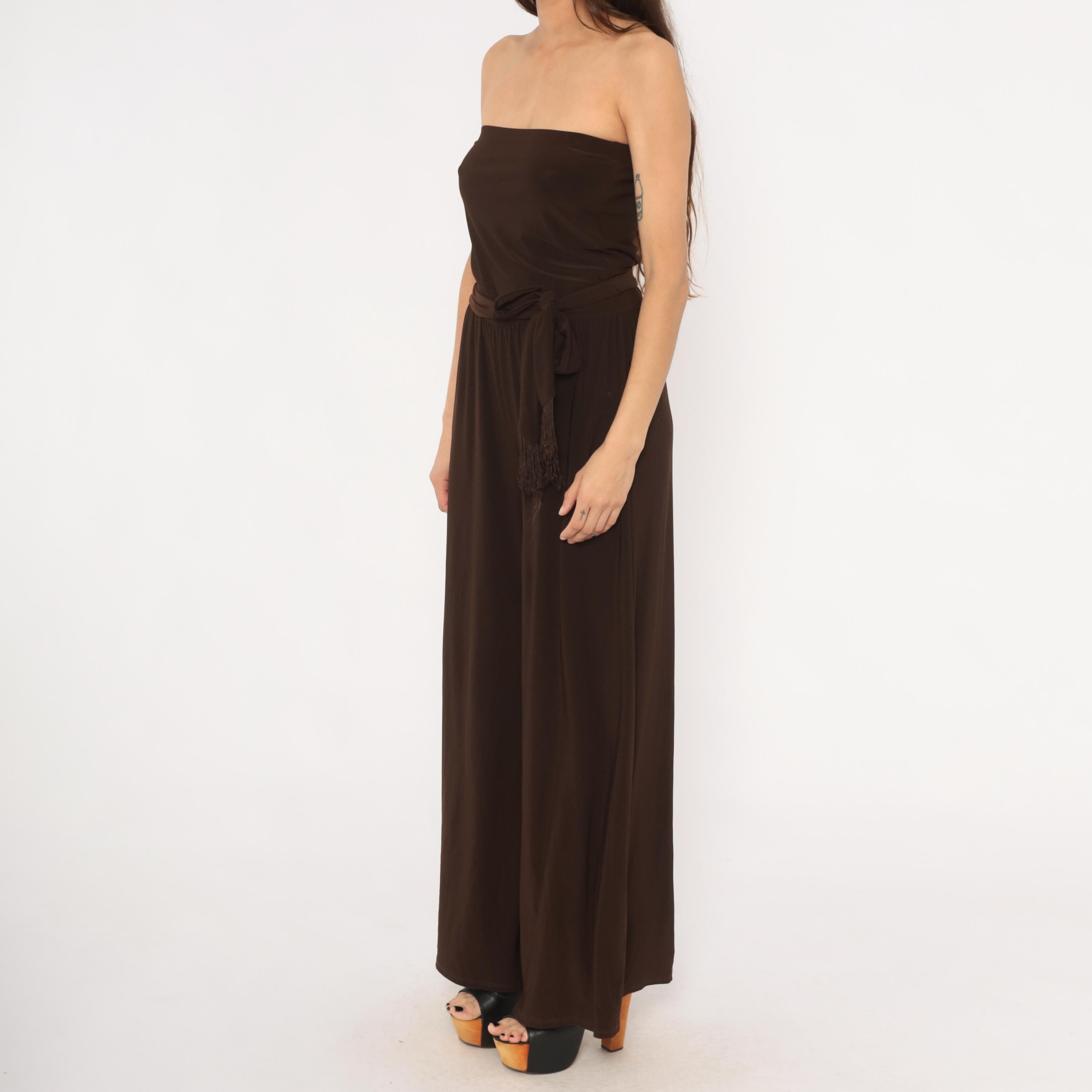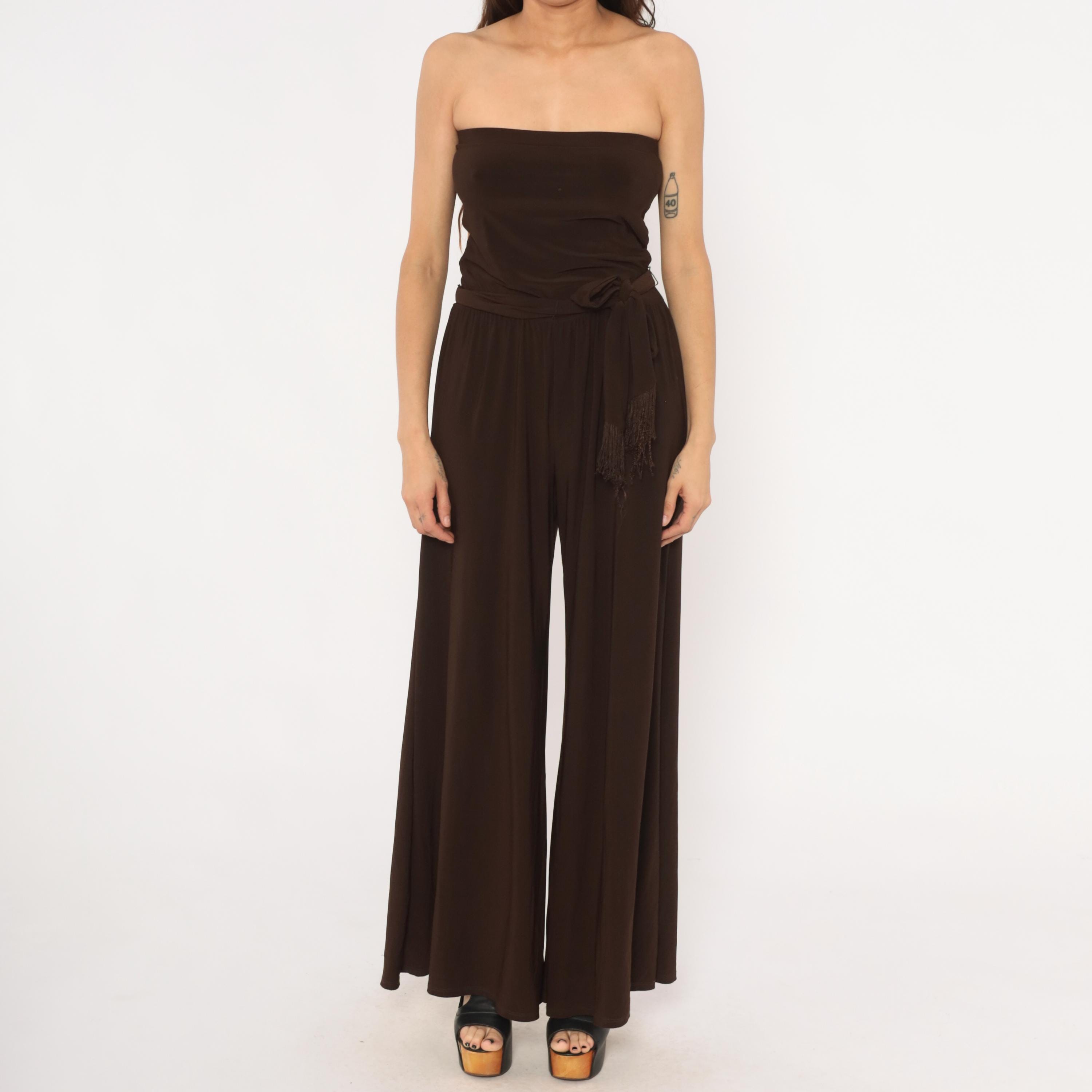 2000s chocolate brown strapless jumpsuit from MSK with a fitted tube top bodice and wide palazzo legs. Elasticized bust and gathered waist with a matching fringed sash belt that ties at the hip. Pullover closure, full-length inseam, and dramatic flared leg openings.