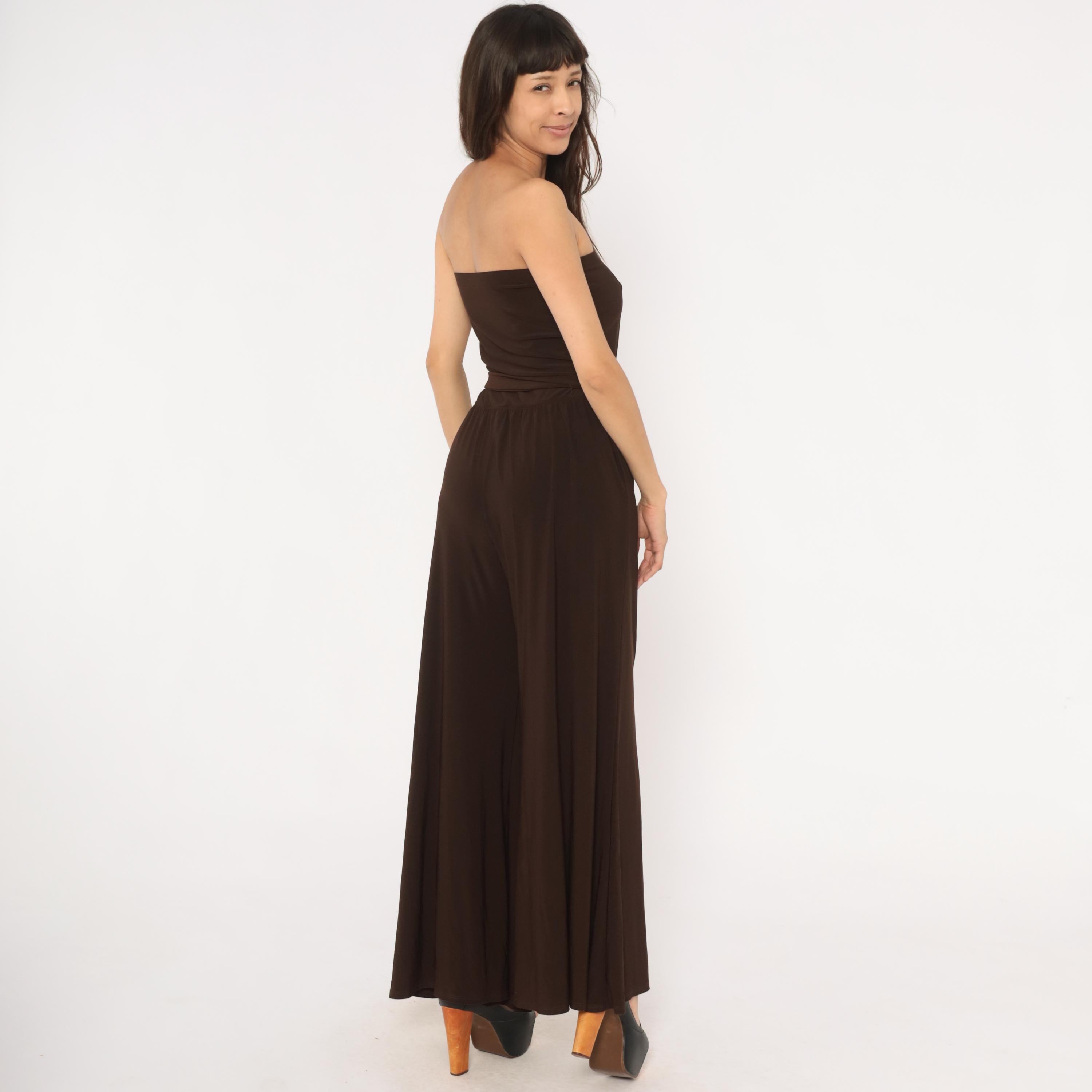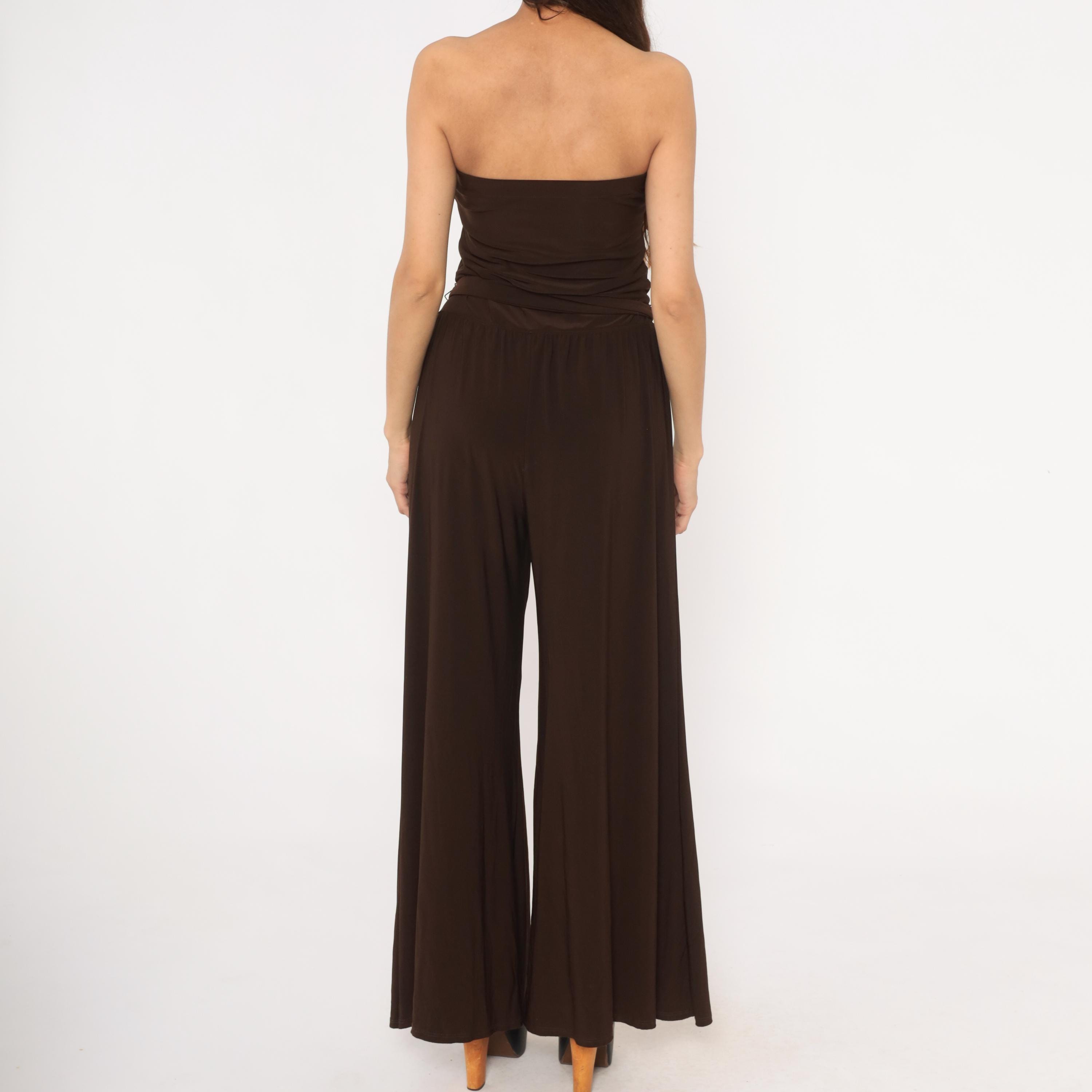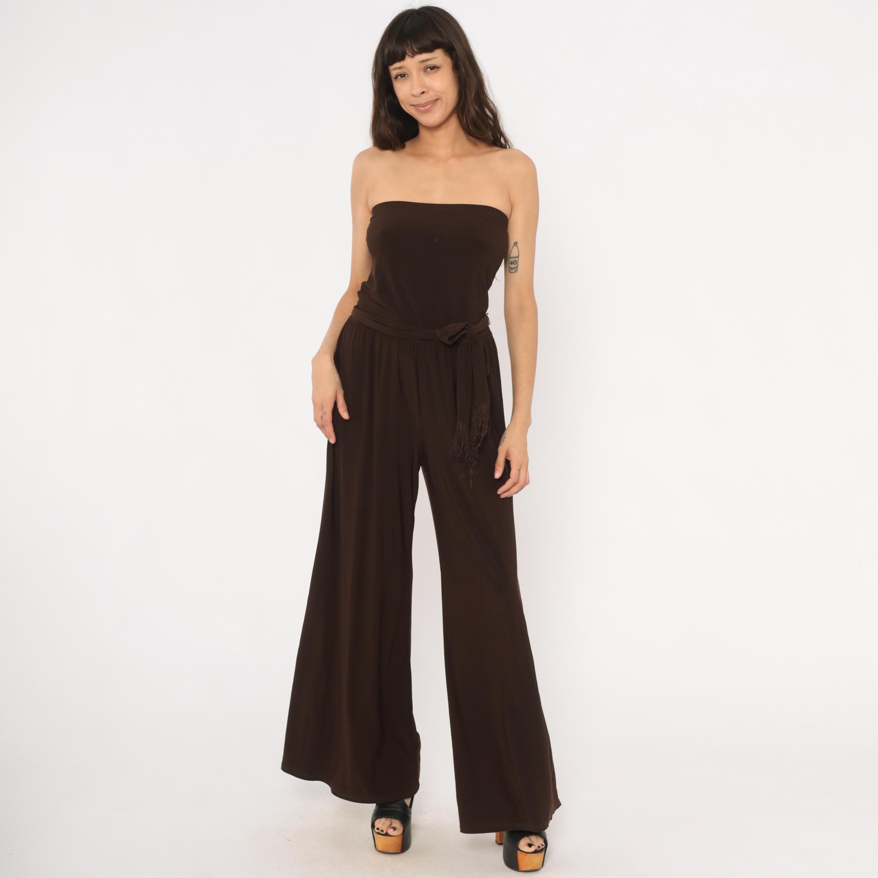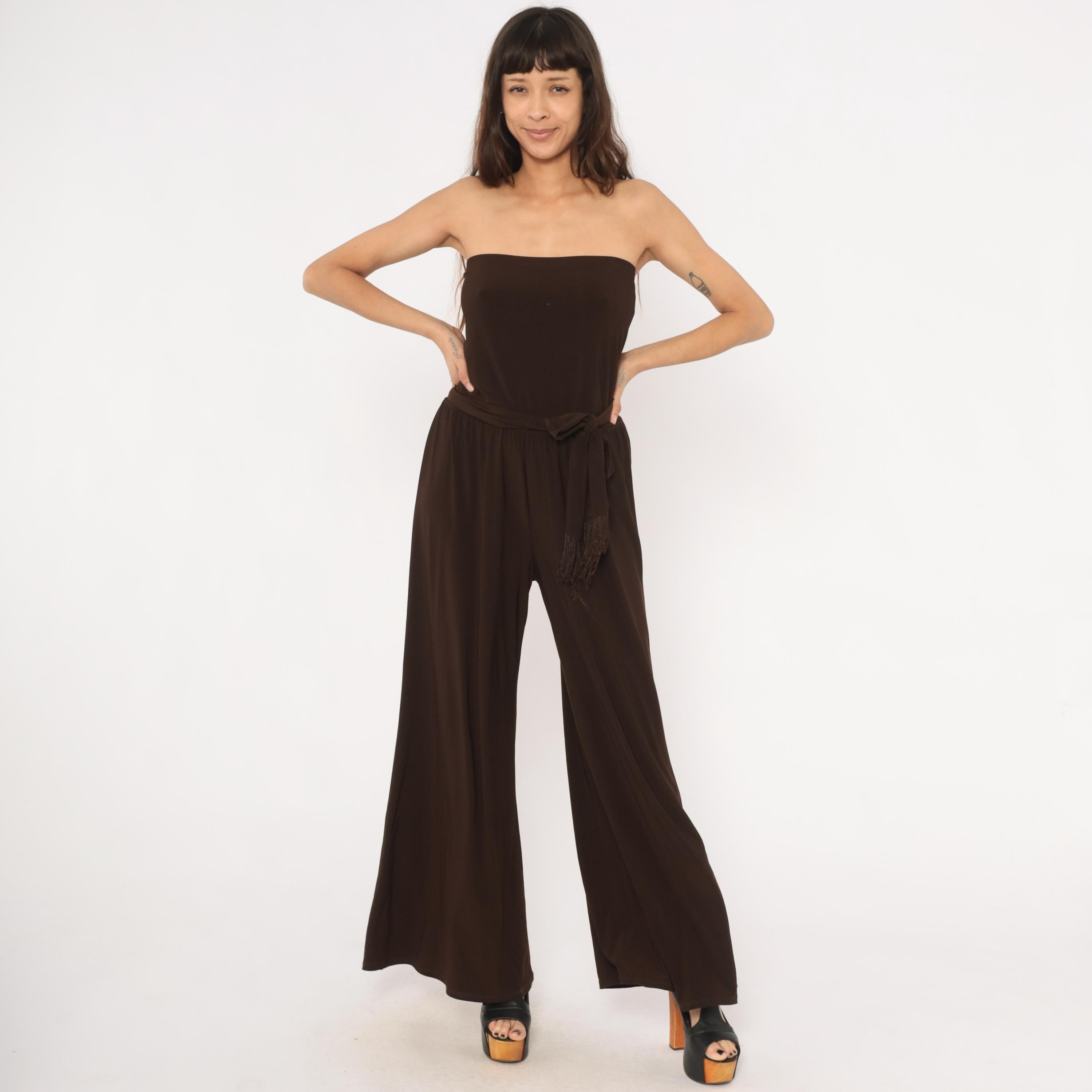 2000s chocolate brown strapless jumpsuit from MSK with a fitted tube top bodice and wide palazzo legs. Elasticized bust and gathered waist with a matching fringed sash belt that ties at the hip. Pullover closure, full-length inseam, and dramatic flared leg openings.