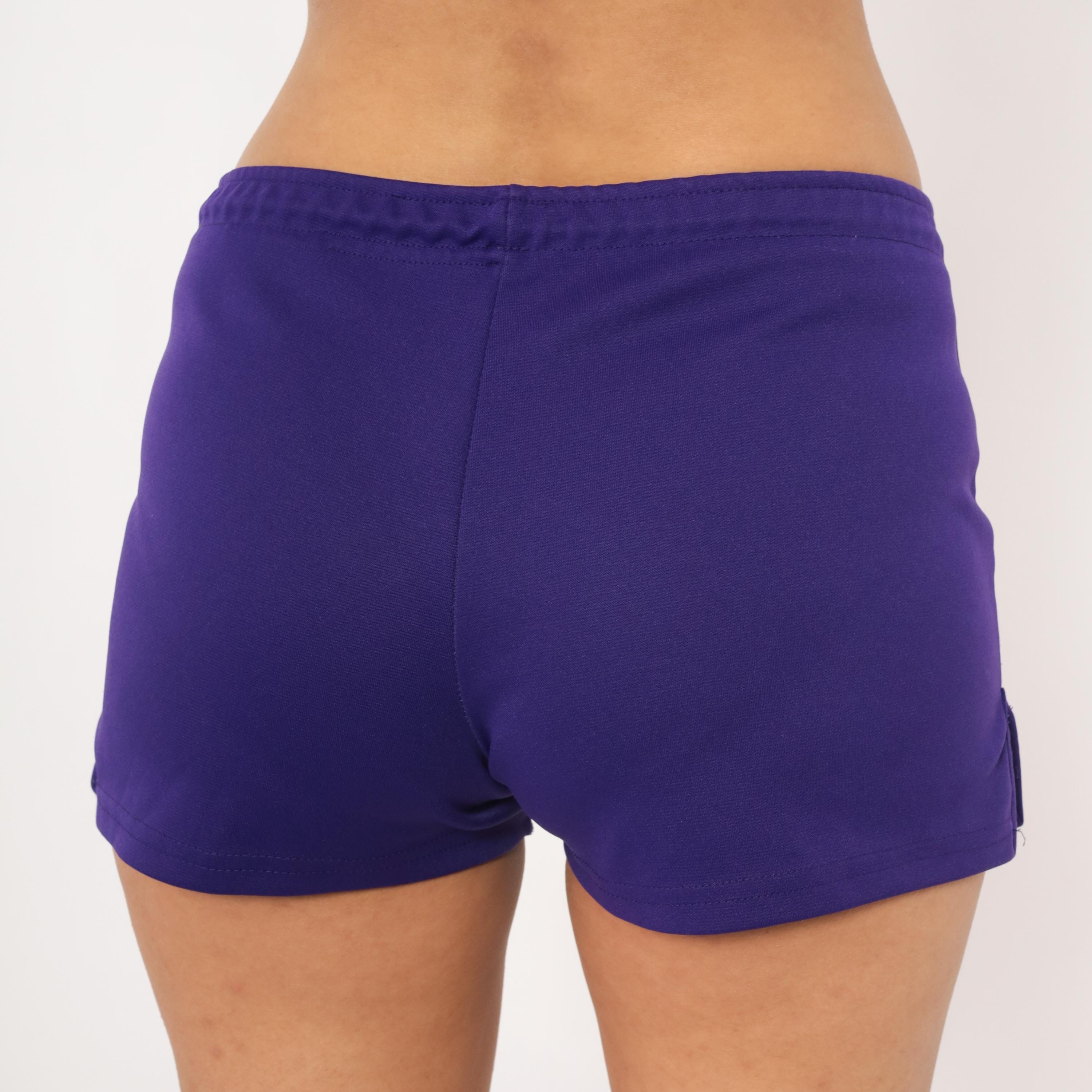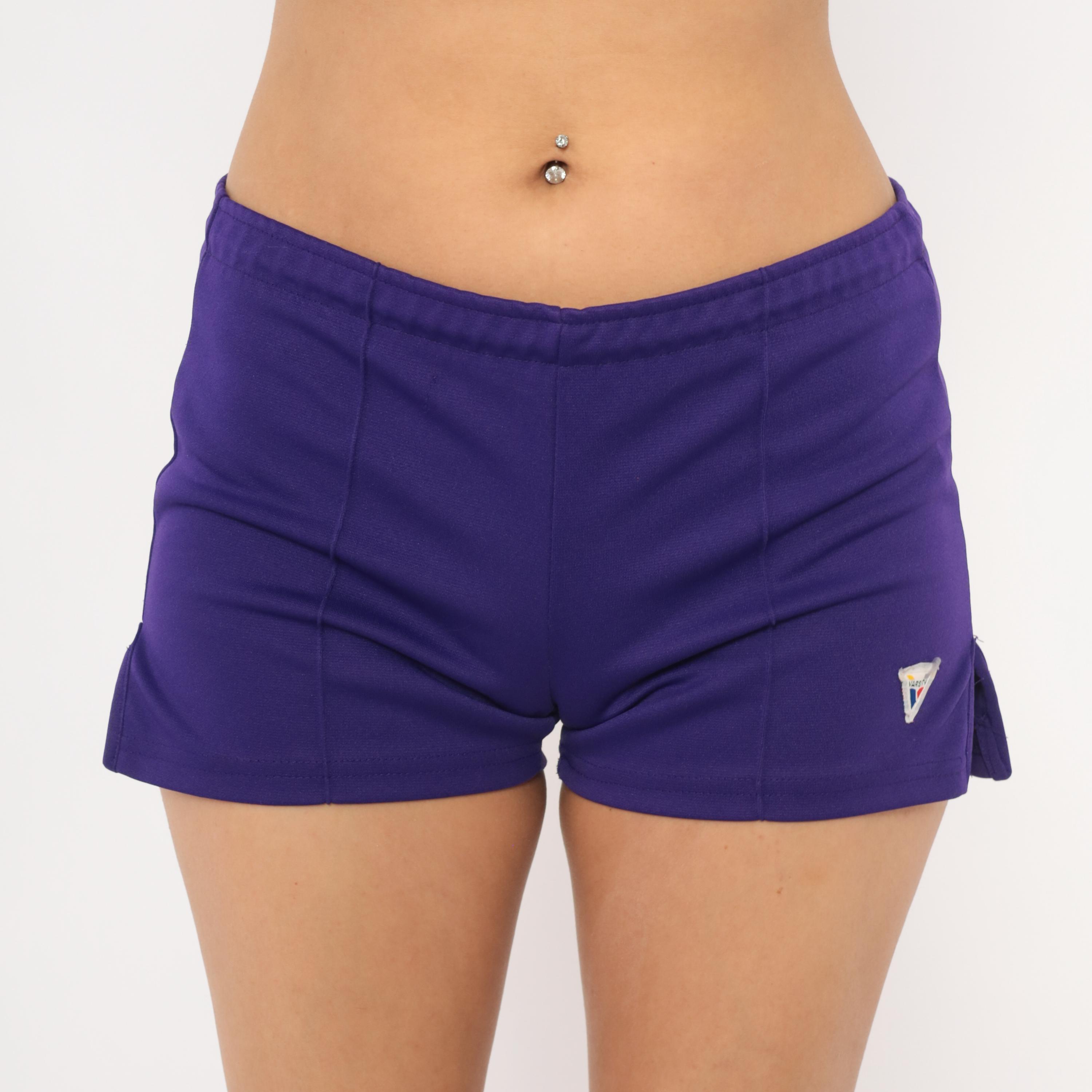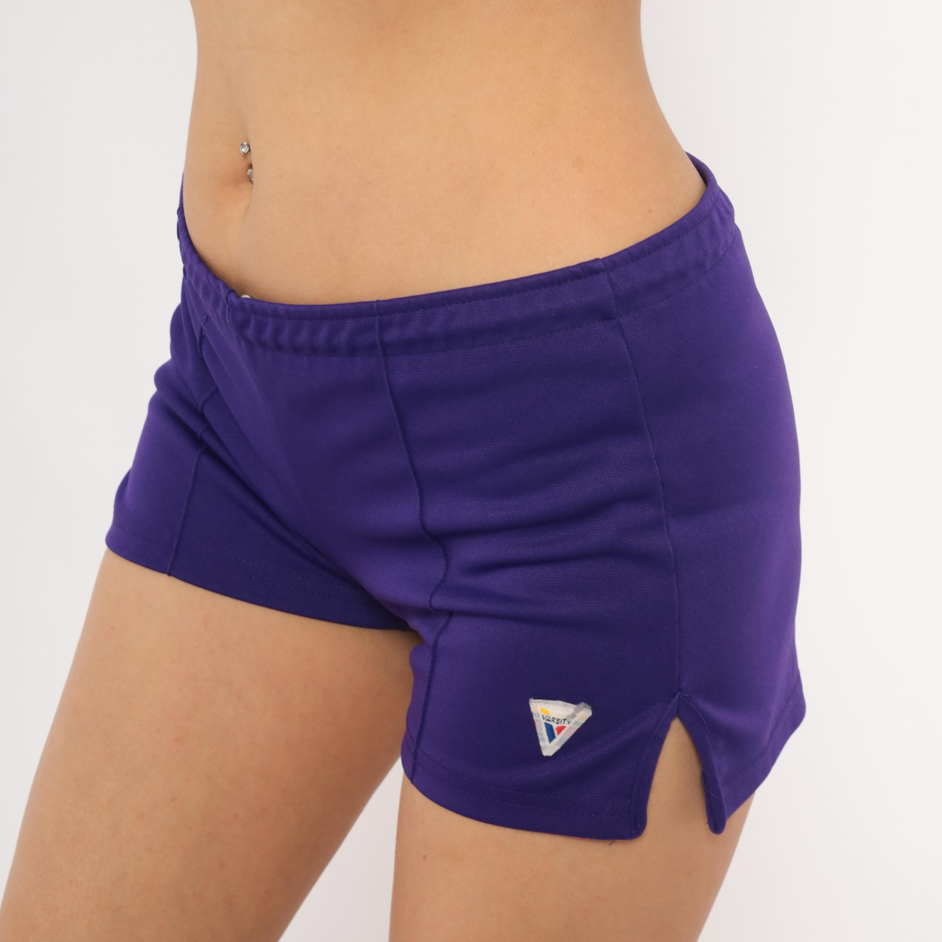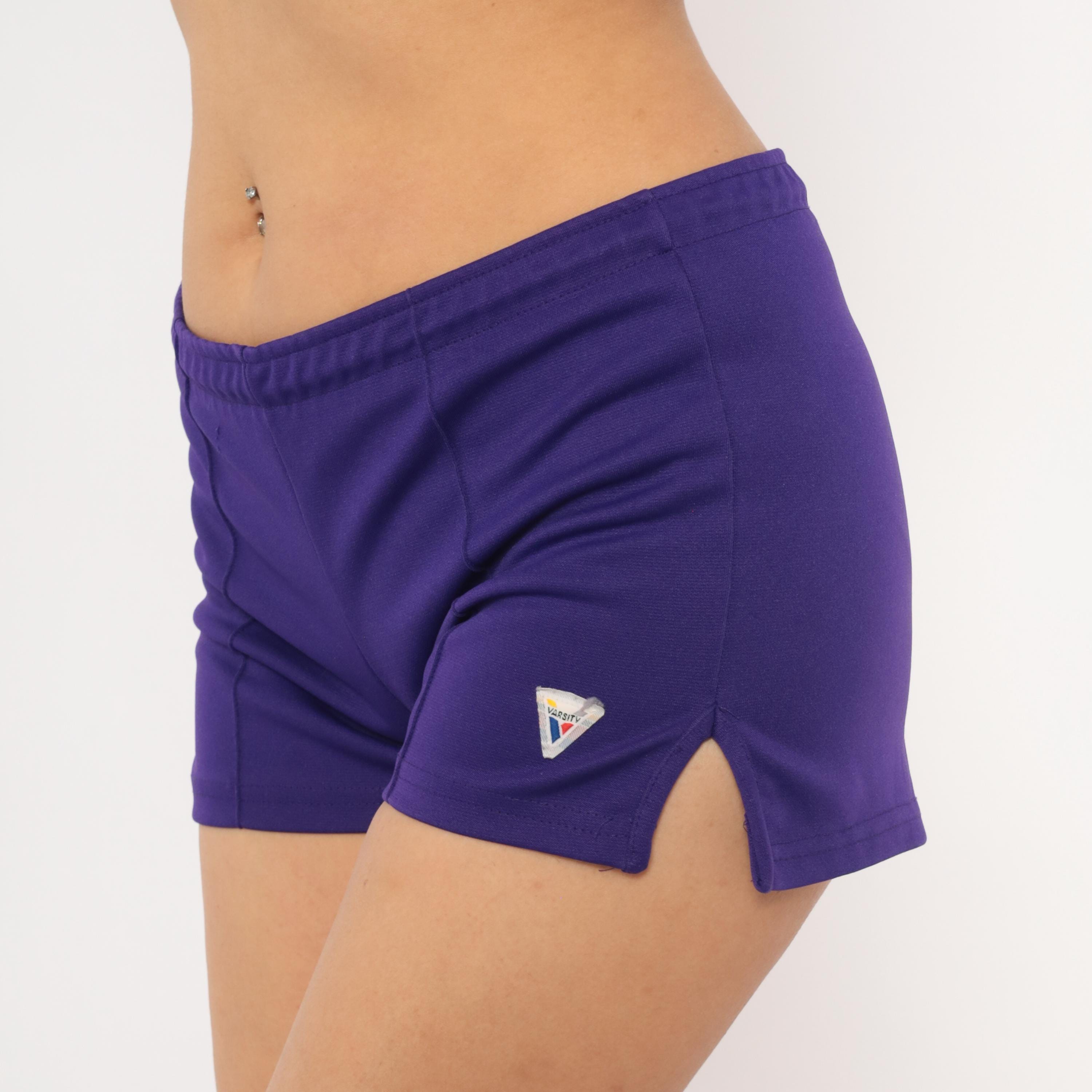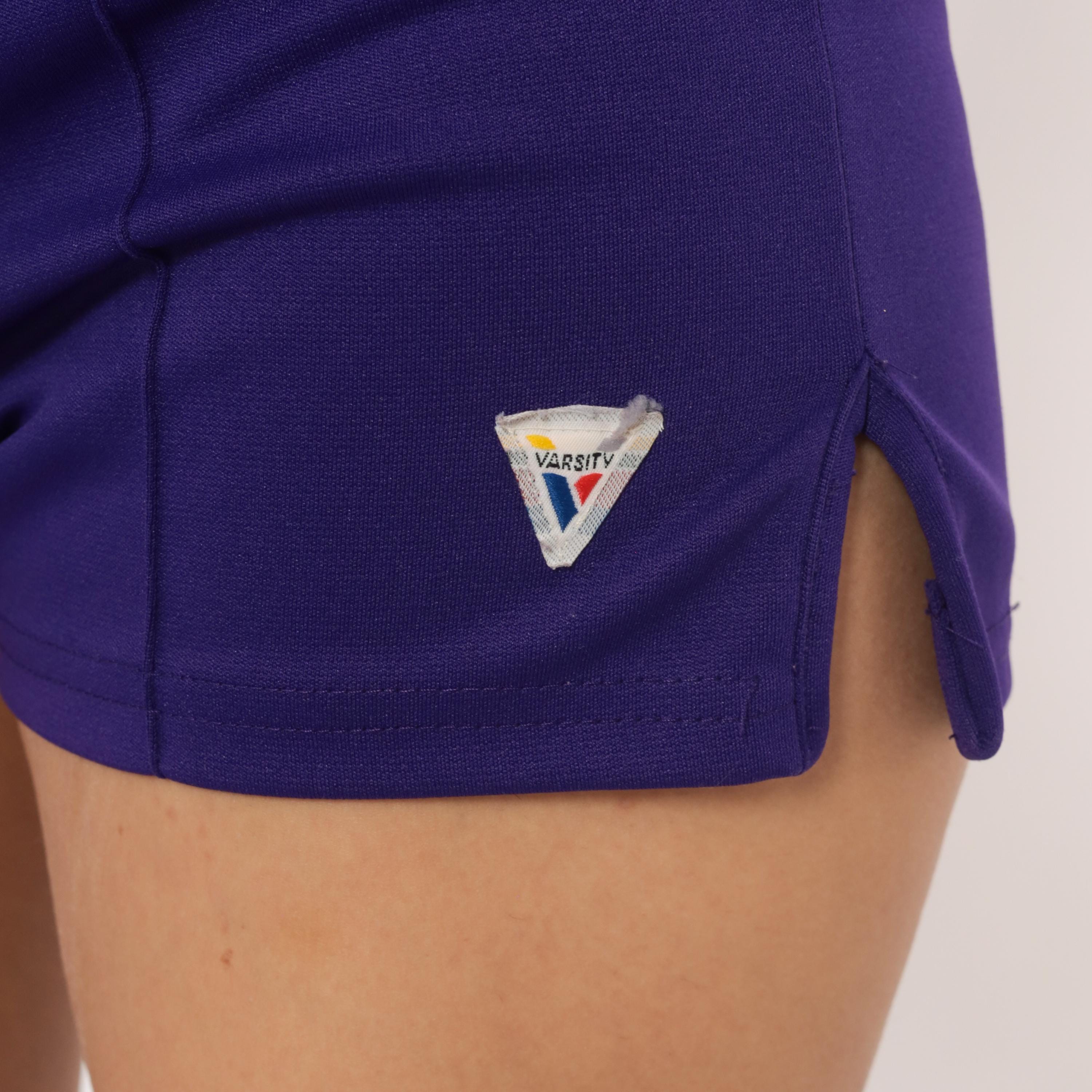 90s purple athletic shorts from Varsity with an elastic waistband and side slit hems at each leg. Small triangular brand logo patch on the lower left leg. Minimal, solid-color construction with a low-rise fit and short inseam.