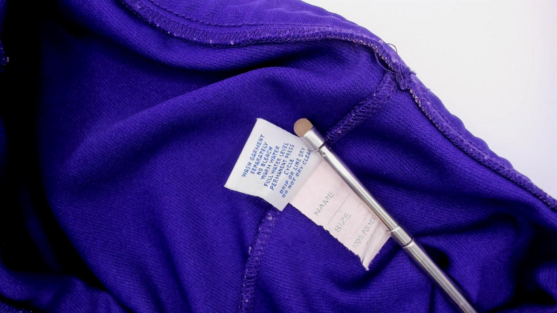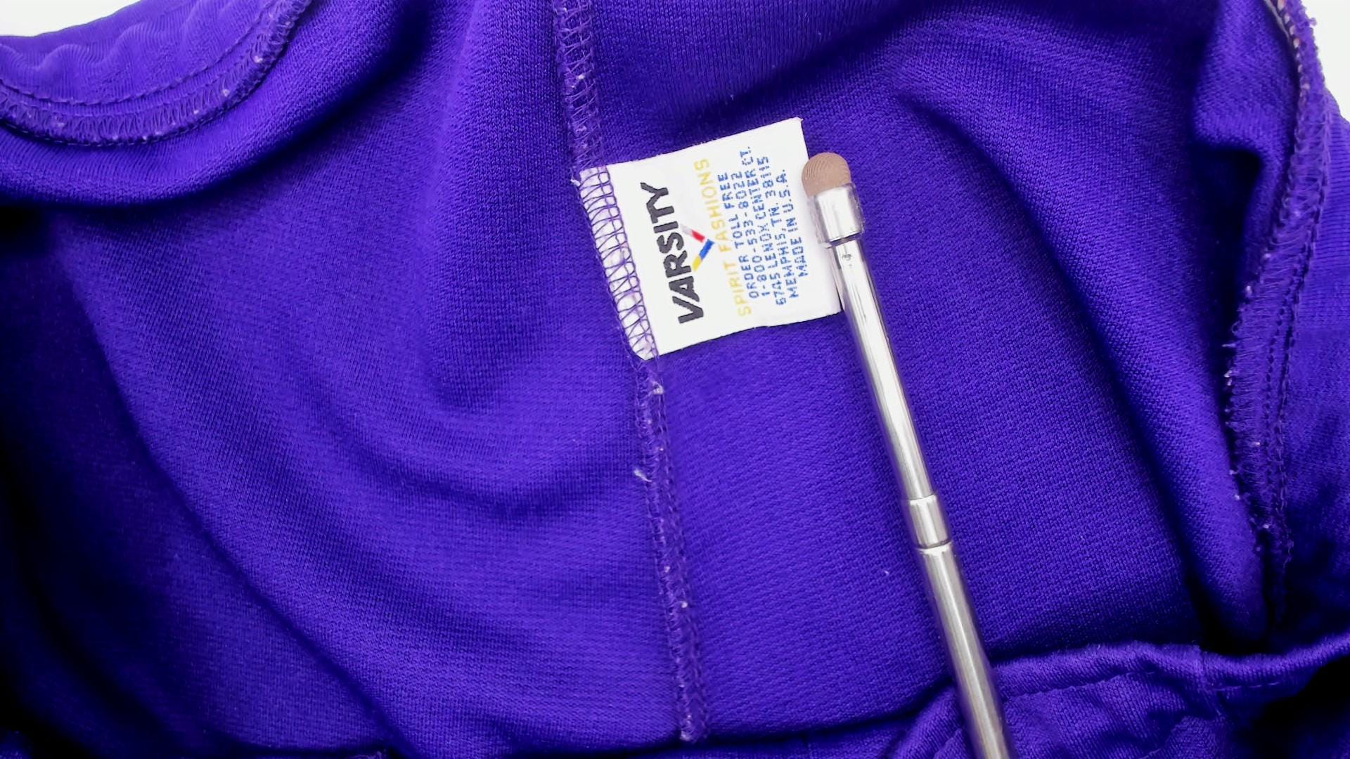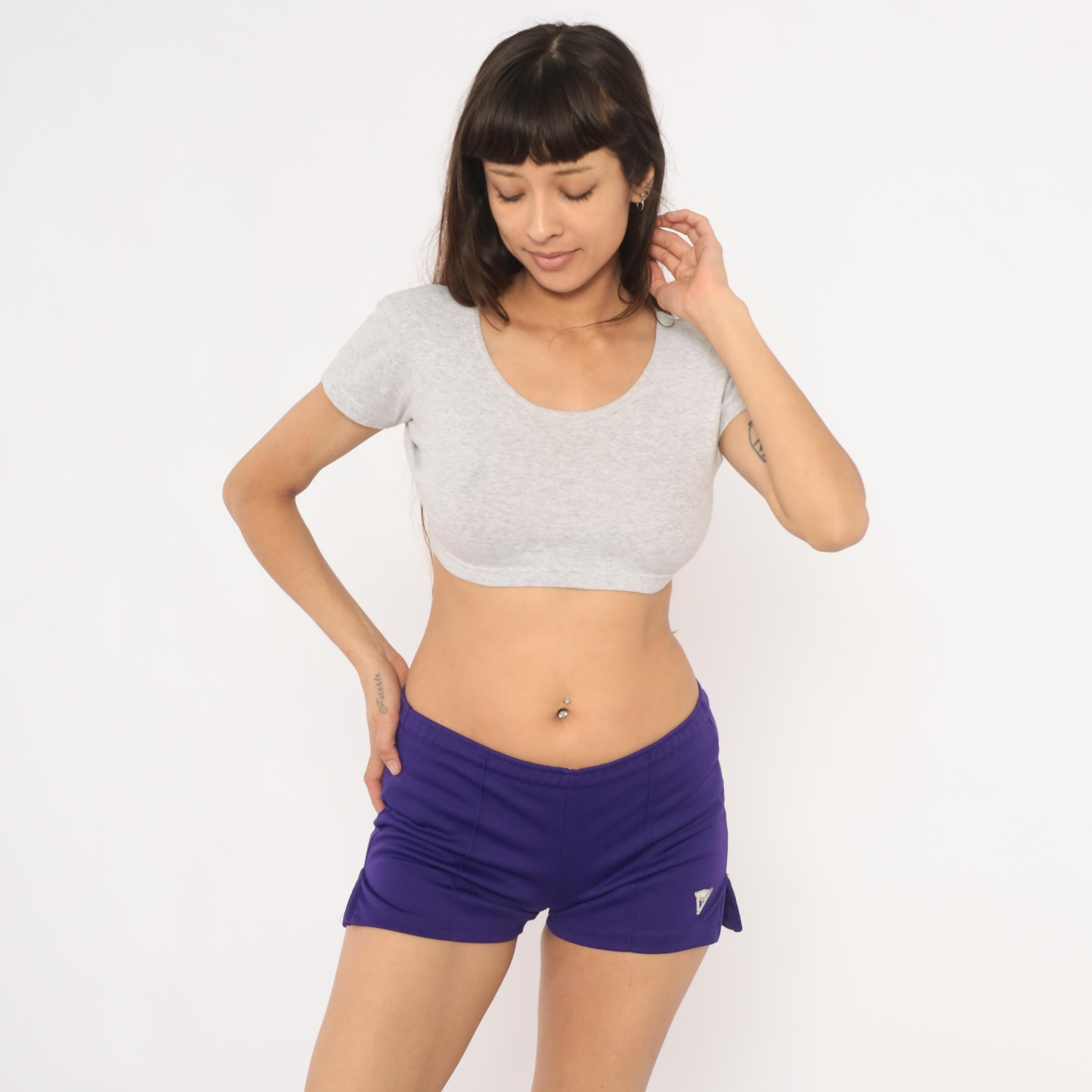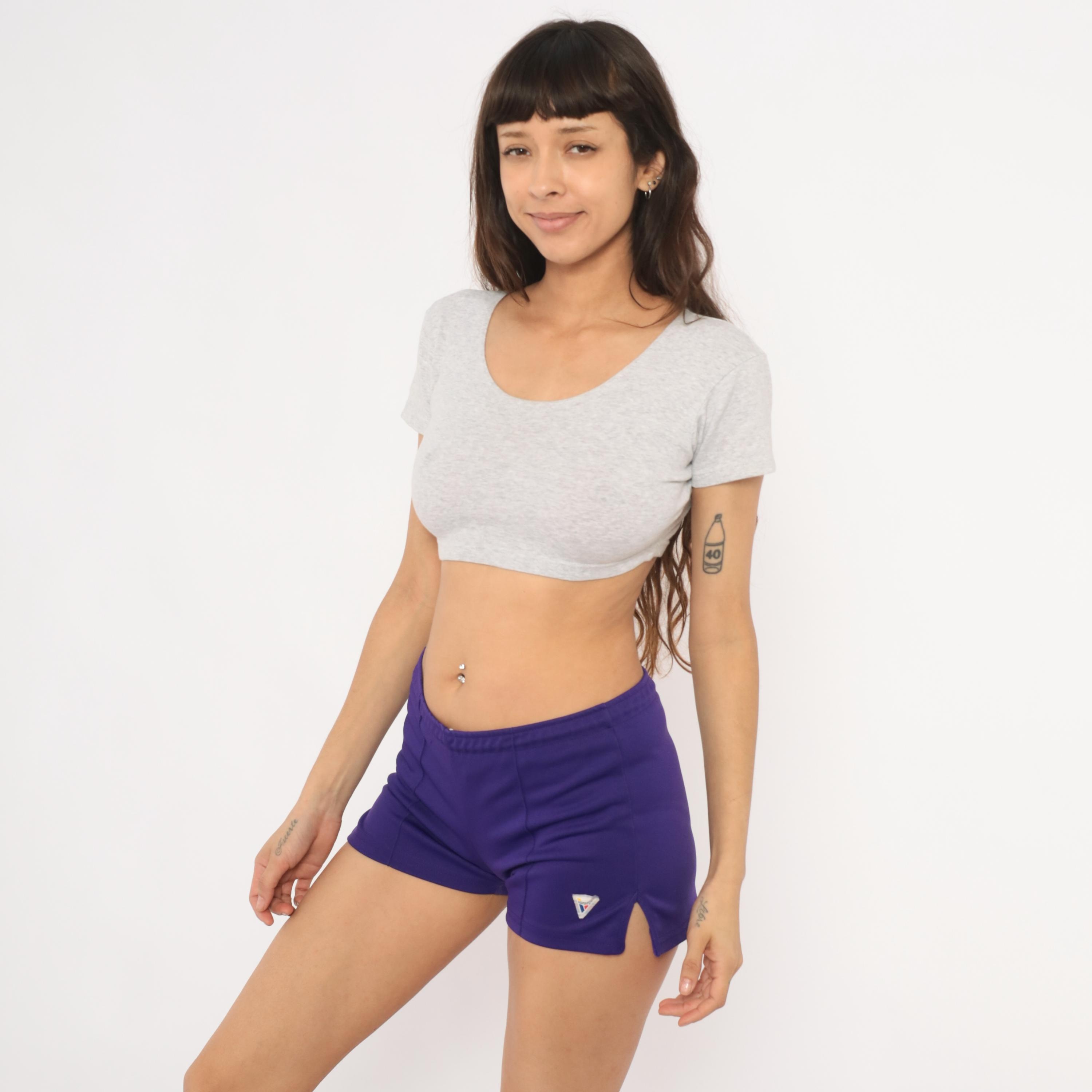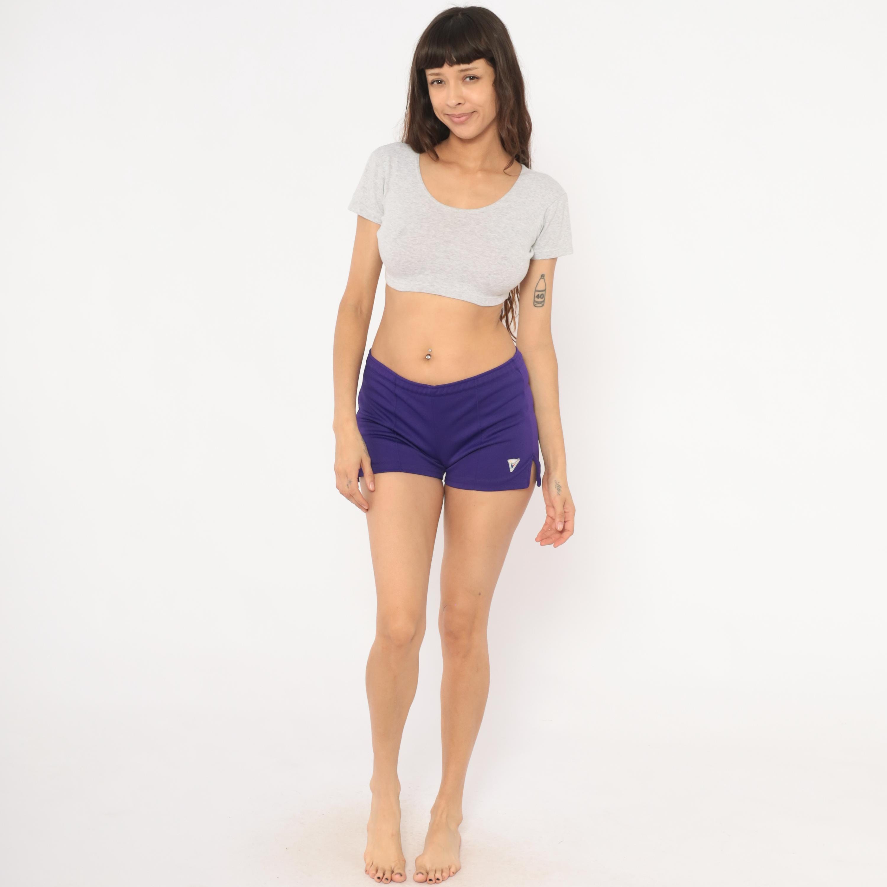 90s purple athletic shorts from Varsity with an elastic waistband and side slit hems at each leg. Small triangular brand logo patch on the lower left leg. Minimal, solid-color construction with a low-rise fit and short inseam.