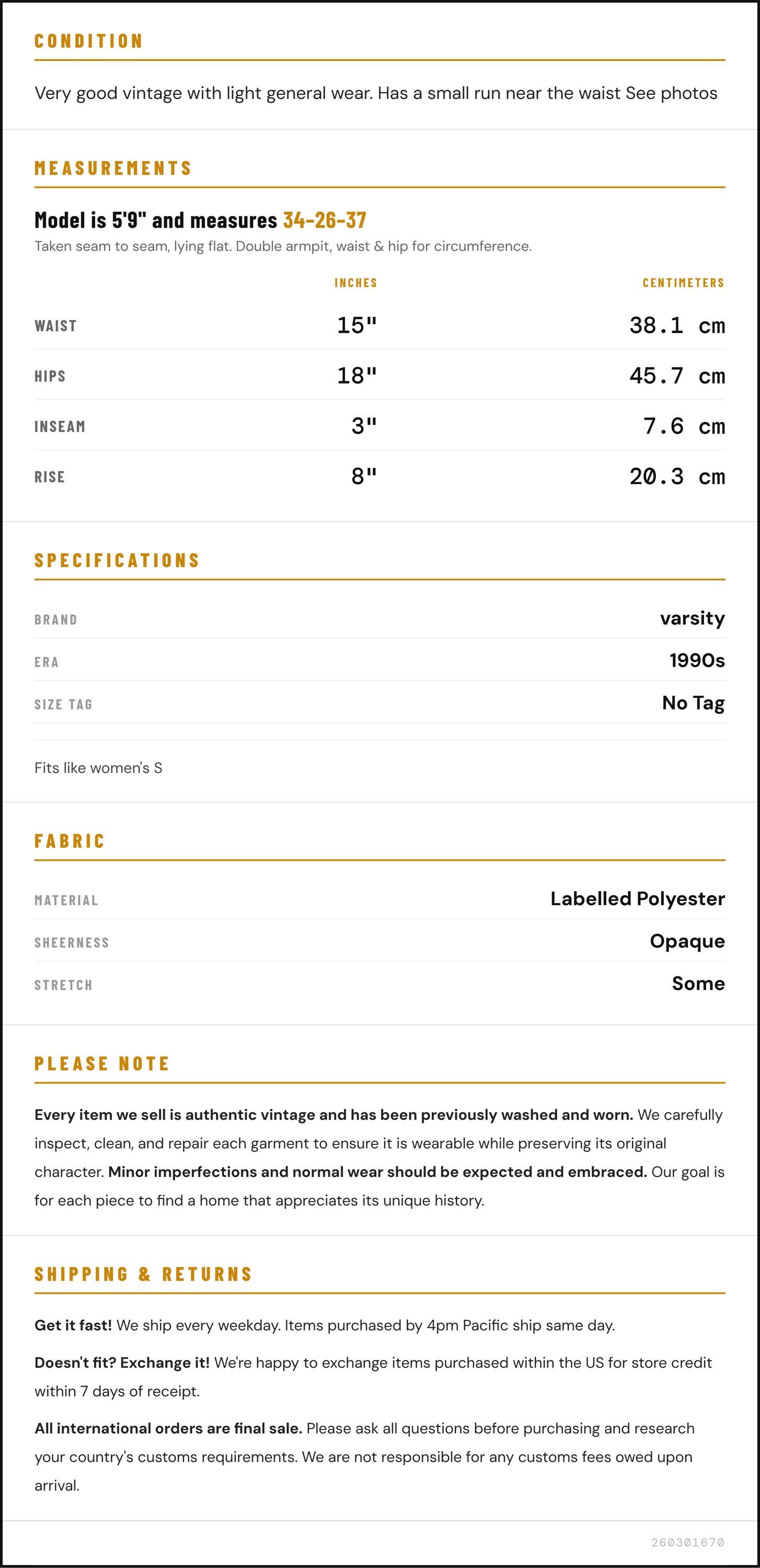 Condition: Very good vintage with light general wear. Has a small run near the waist See photos