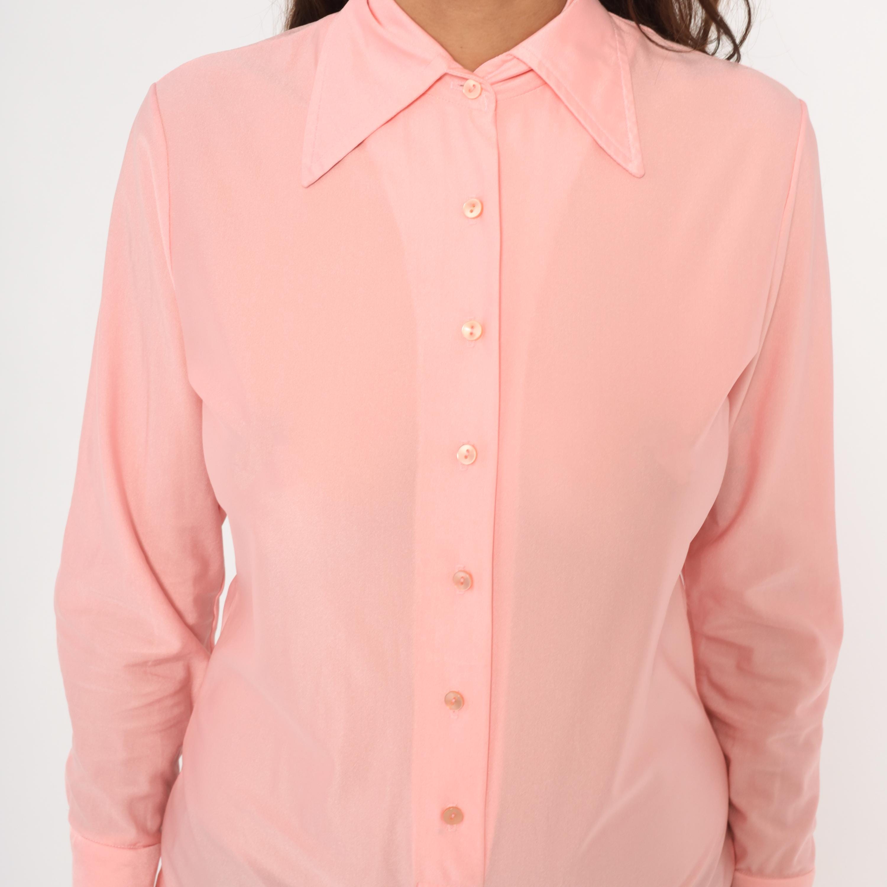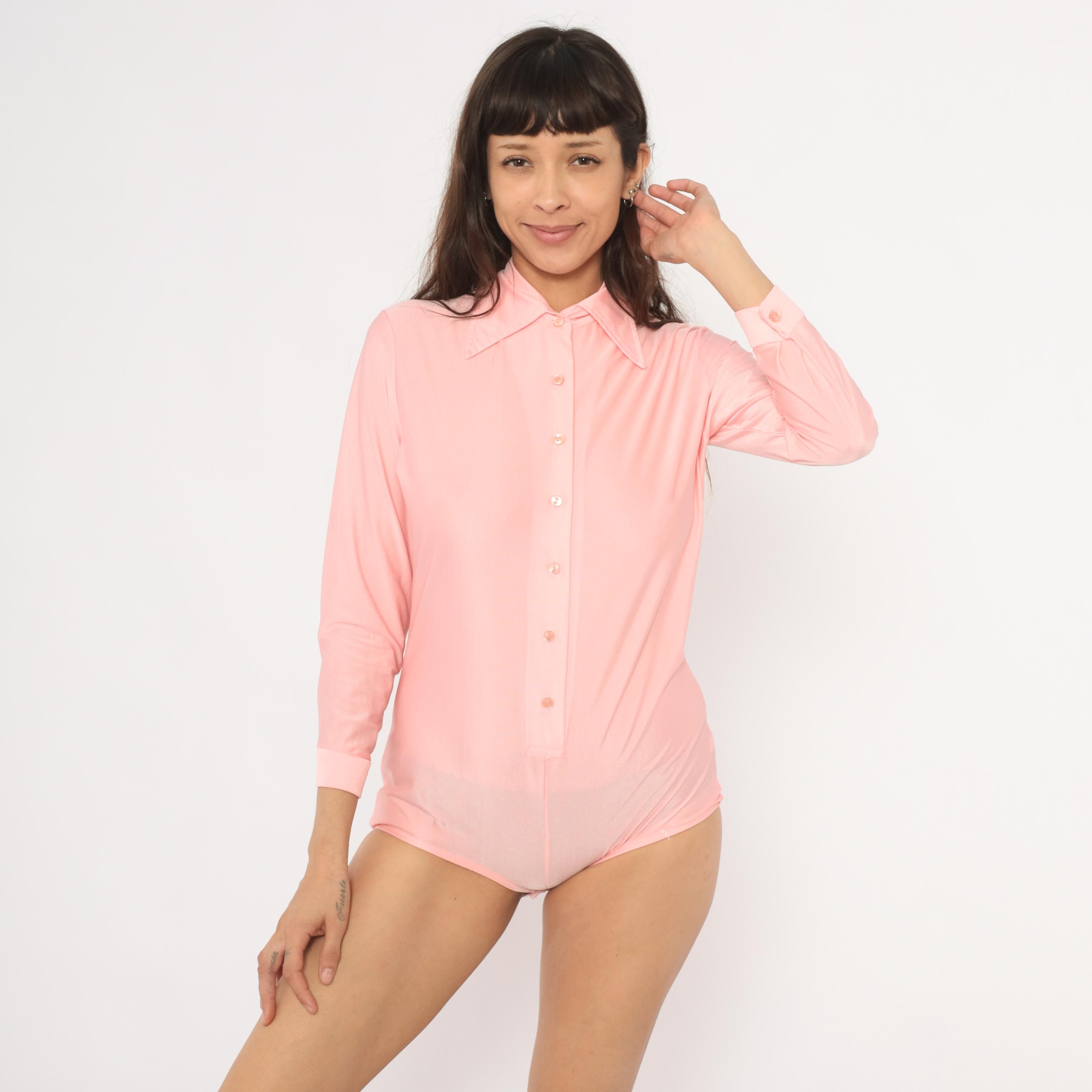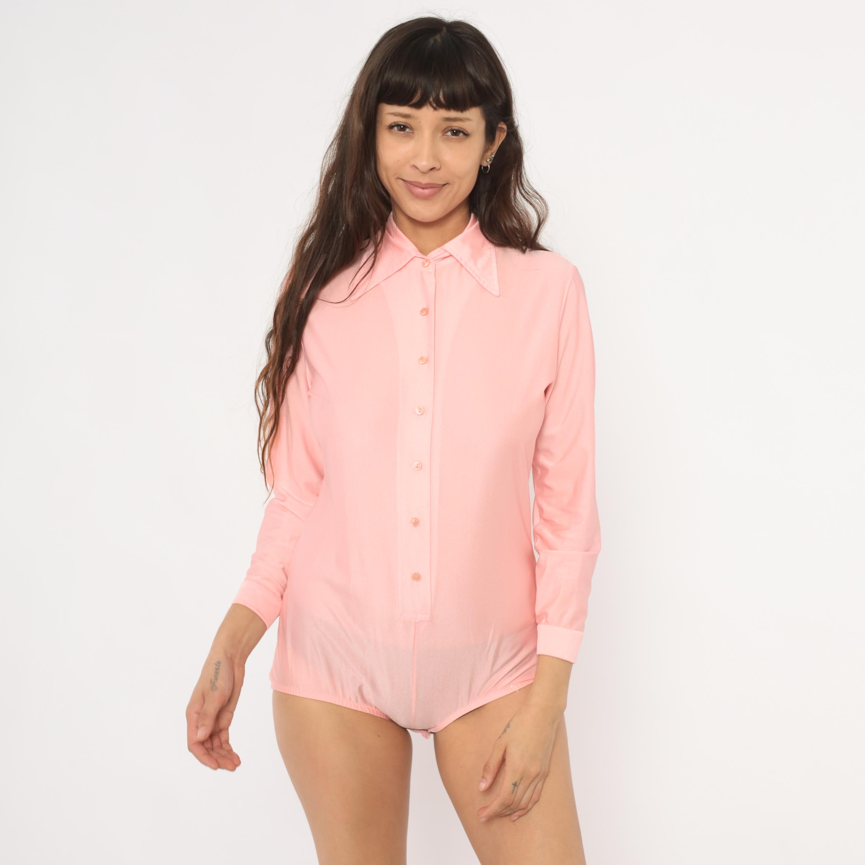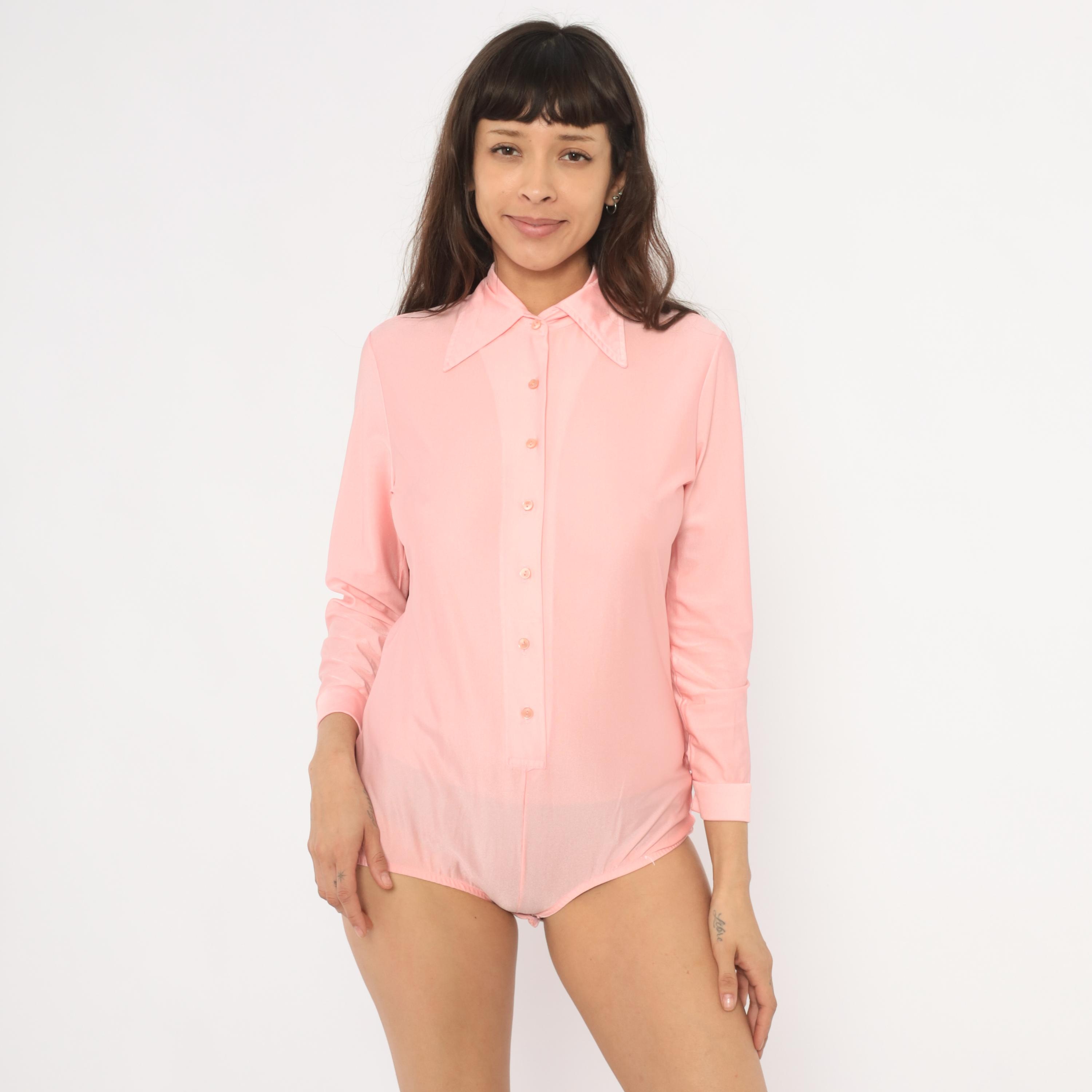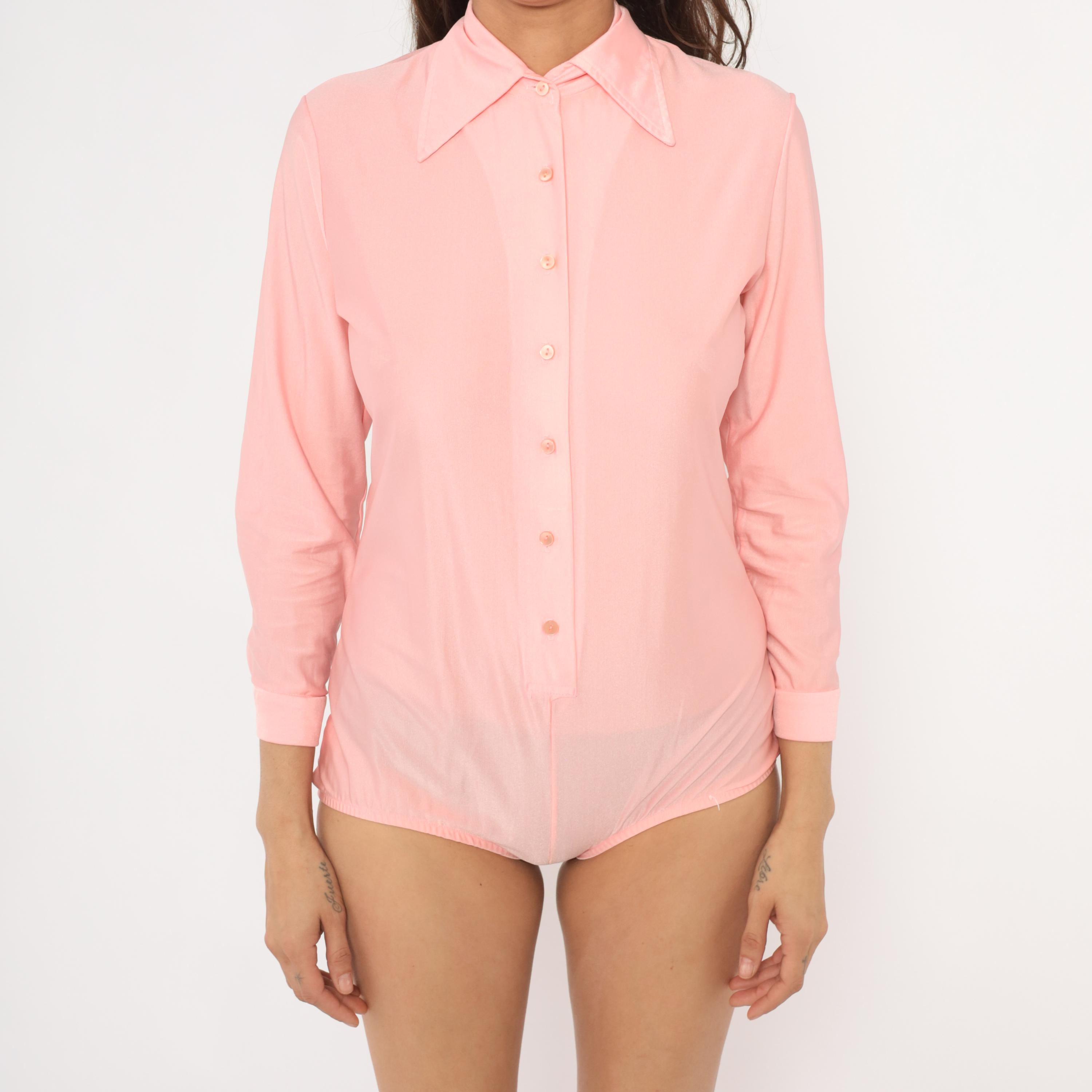 70s pink button-front bodysuit blouse from Imagnin with a wide pointed collar and long sleeves with folded cuffs. Semi-sheer fabric with matching pink buttons down the center front and snap closure at the crotch. A fitted silhouette through the torso with a briefs-style lower portion and elastic at the leg openings.