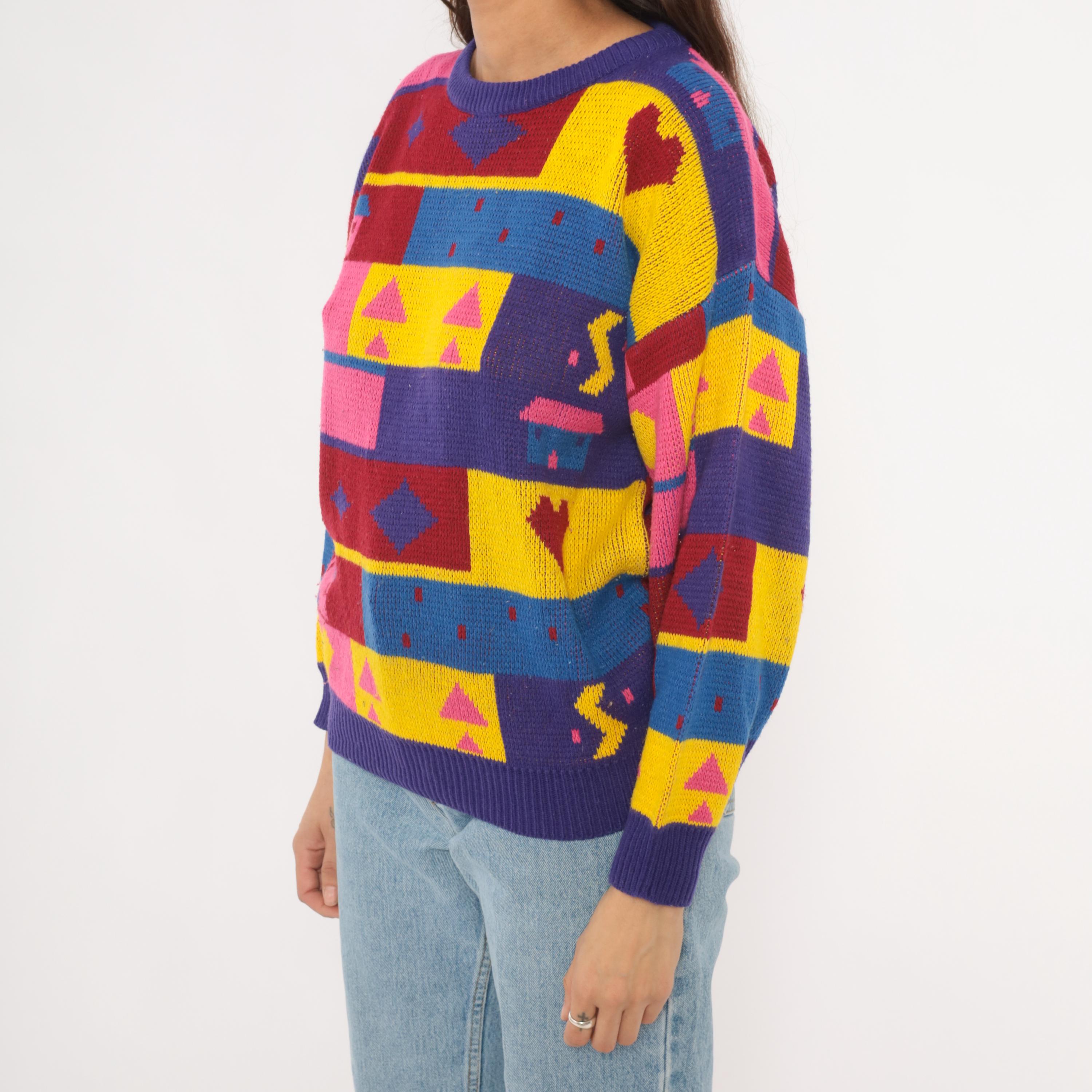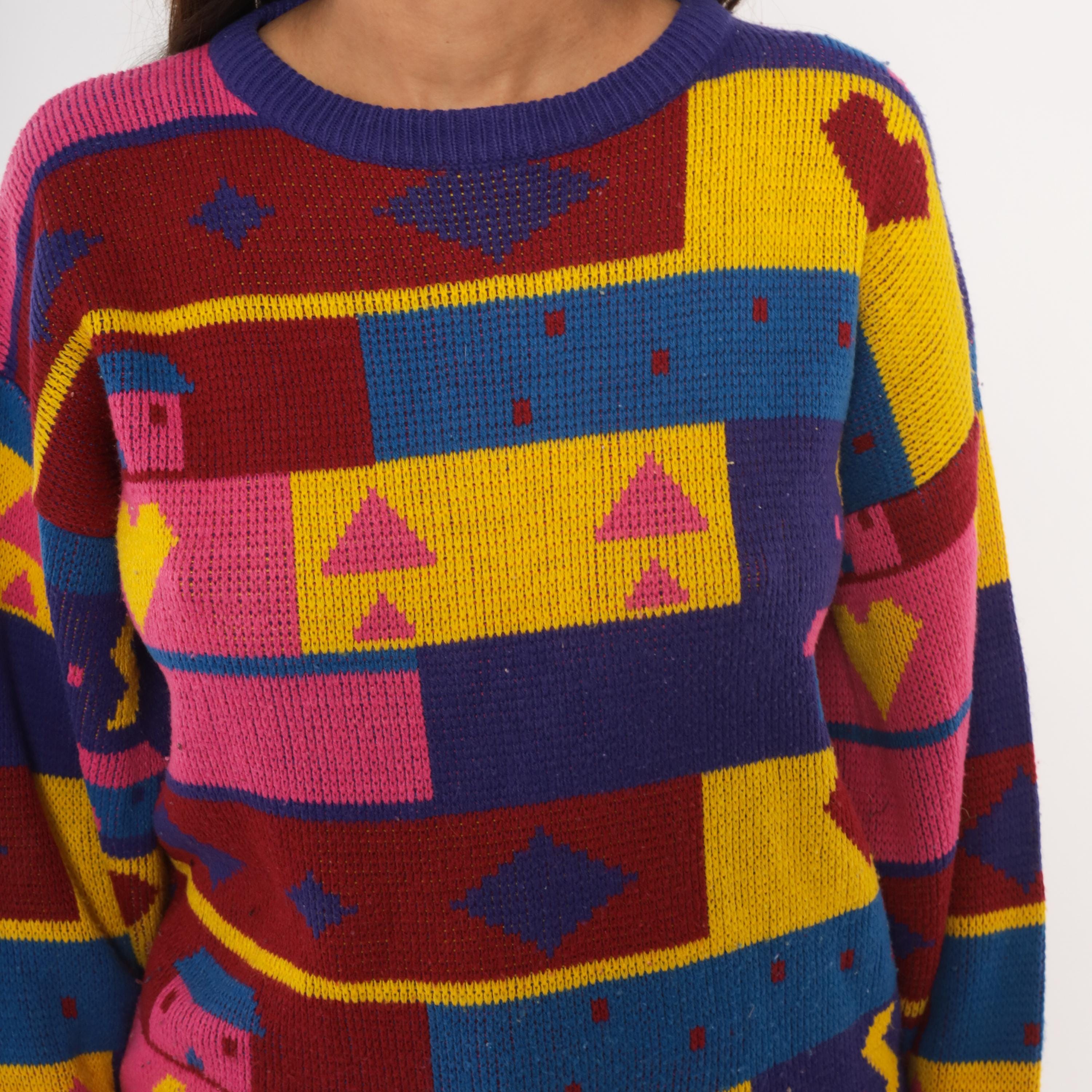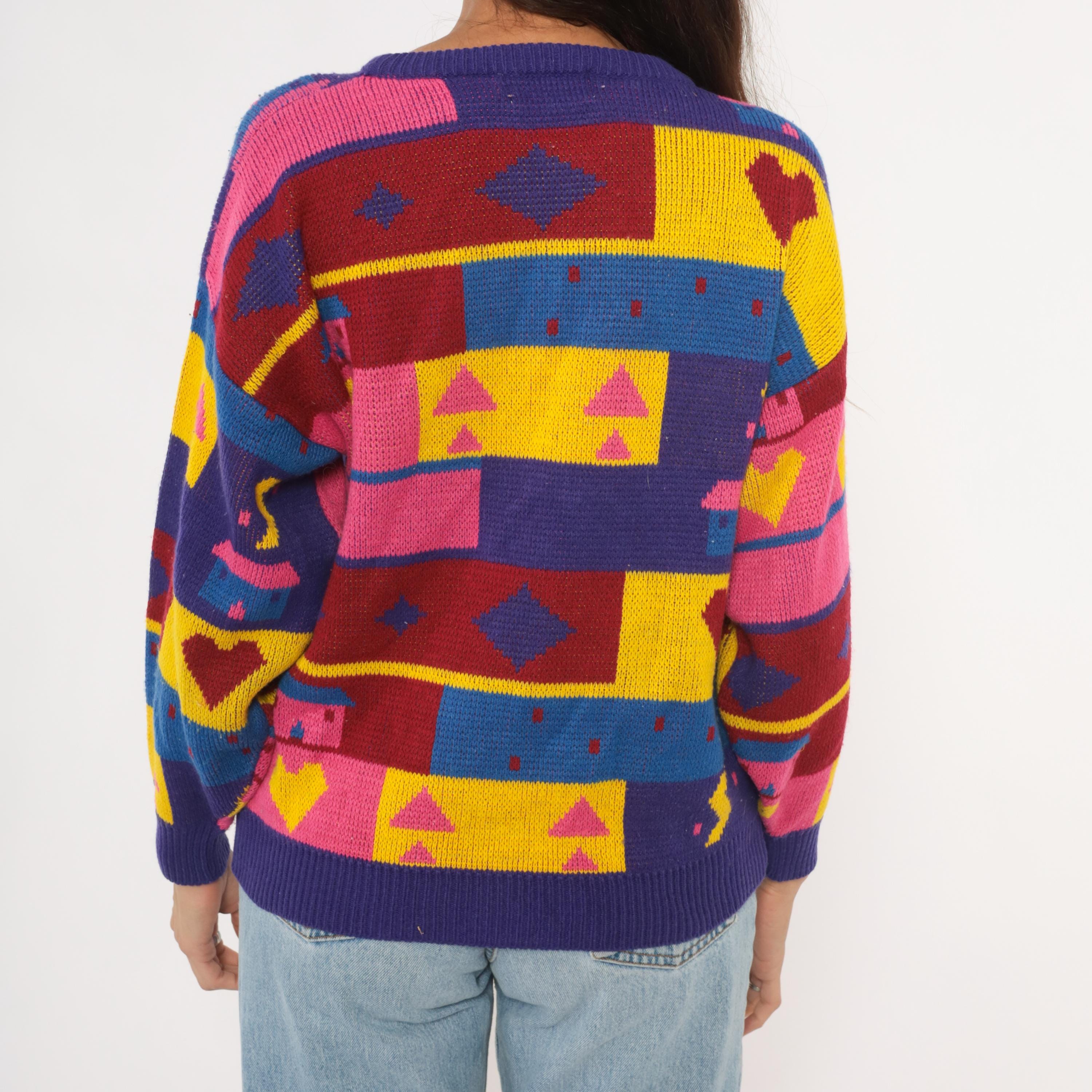 80s colorblock knit pullover with an allover geometric patchwork pattern in purple, magenta, gold, blue, and burgundy. Crew neckline with ribbed purple trim at the collar, cuffs, and waistband. Intarsia-knit hearts, triangles, diamonds, and abstract shapes scattered across color-blocked rectangular sections.