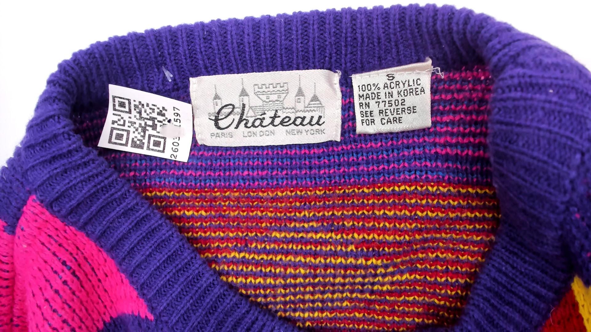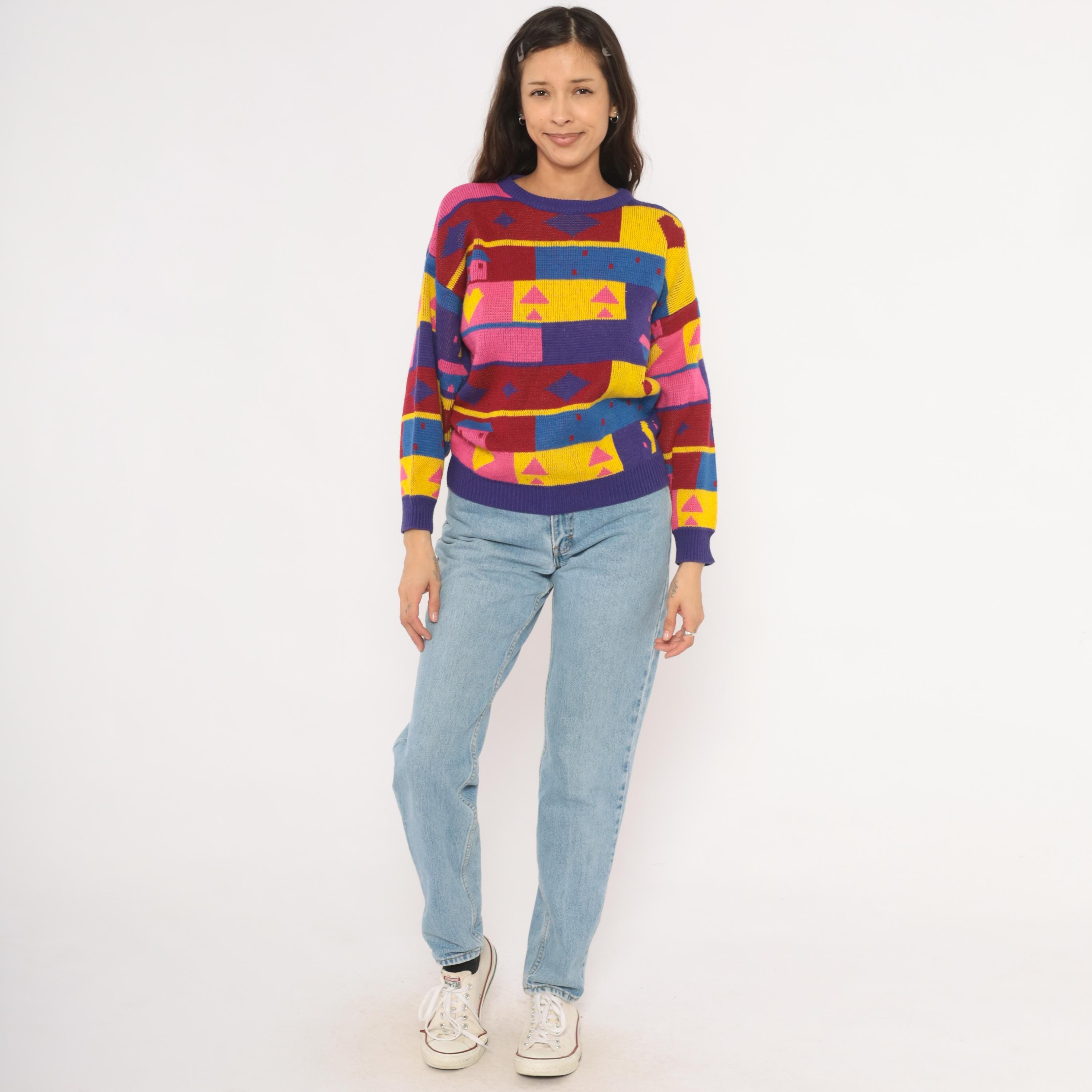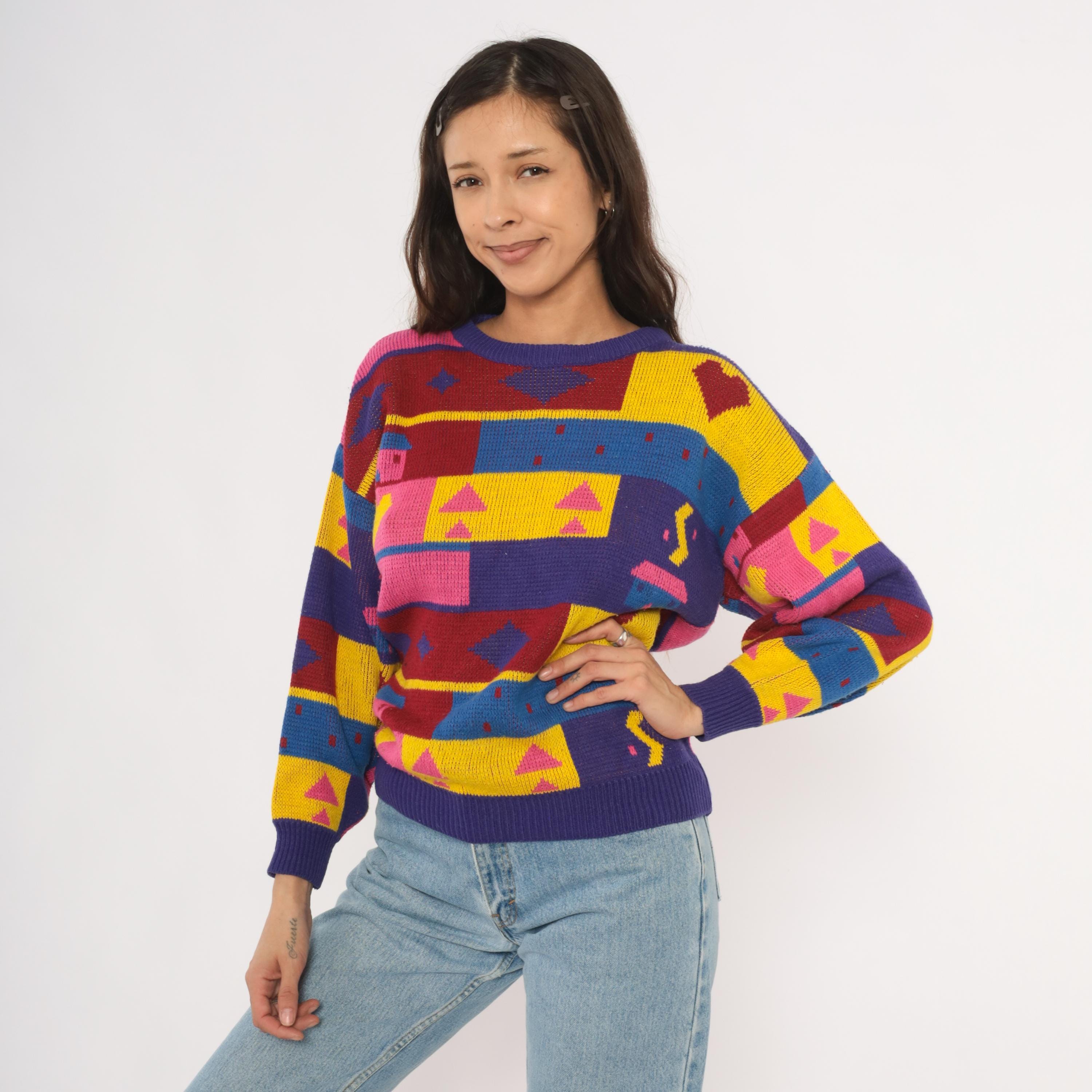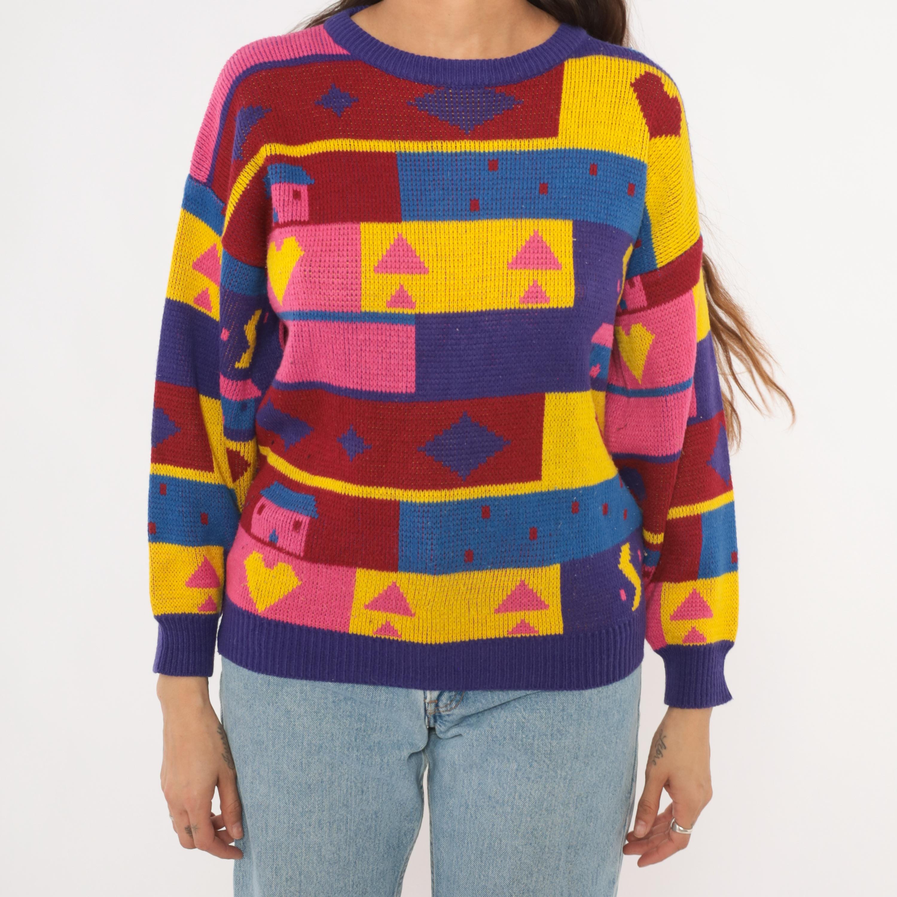 80s colorblock knit pullover with an allover geometric patchwork pattern in purple, magenta, gold, blue, and burgundy. Crew neckline with ribbed purple trim at the collar, cuffs, and waistband. Intarsia-knit hearts, triangles, diamonds, and abstract shapes scattered across color-blocked rectangular sections.