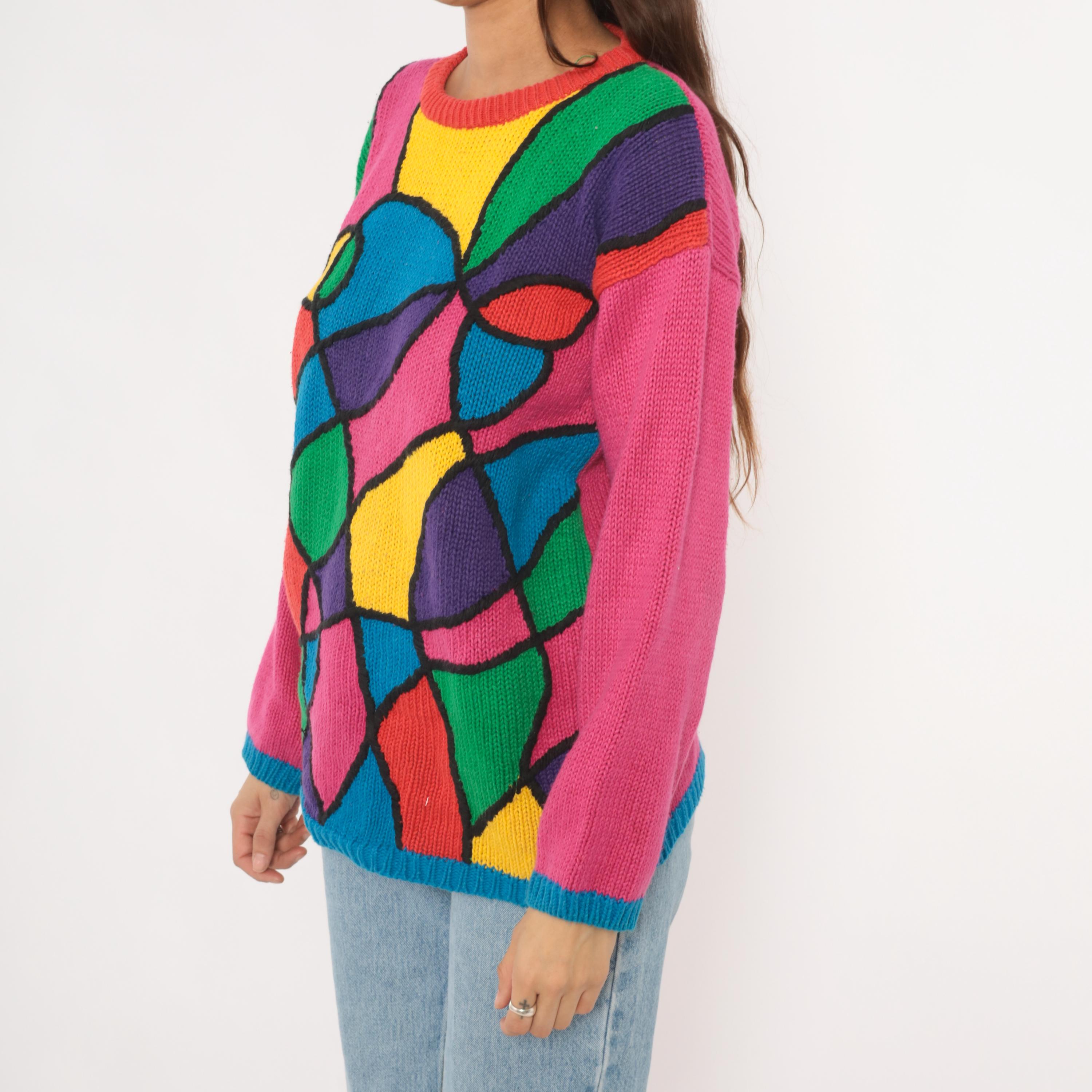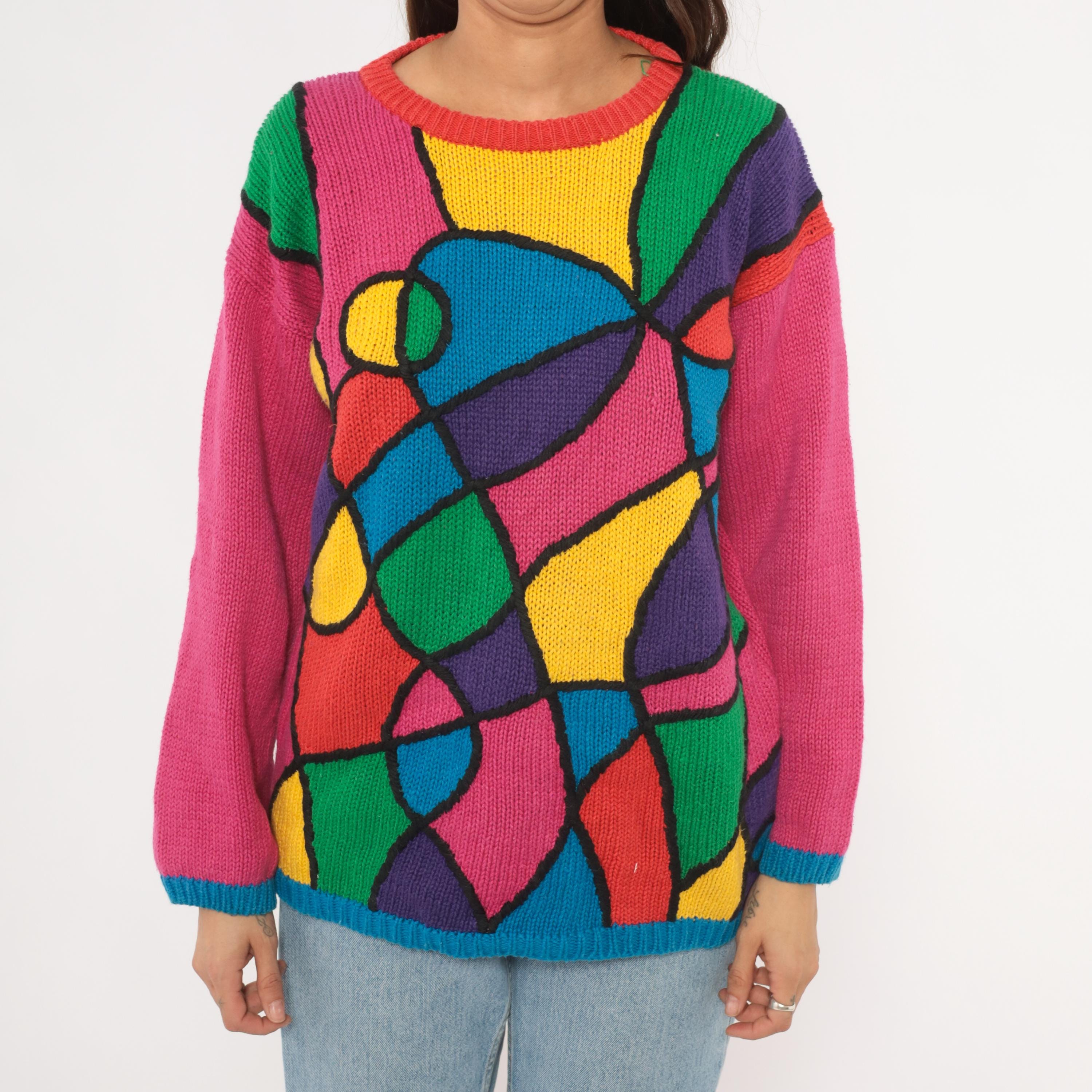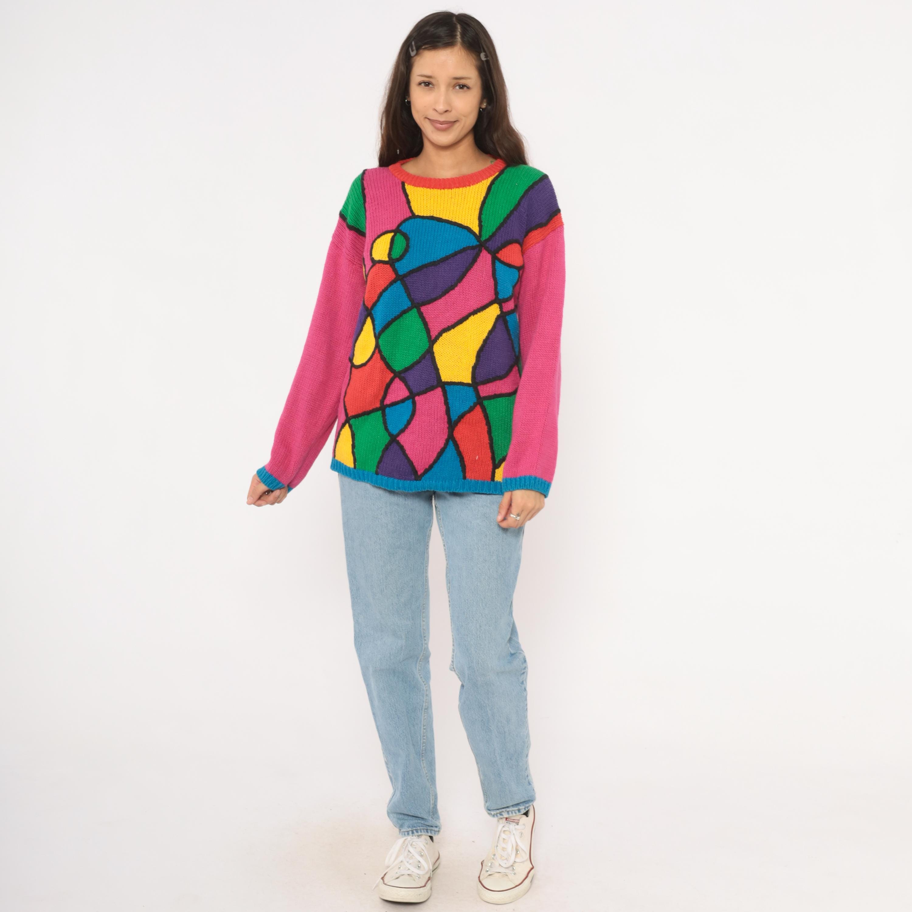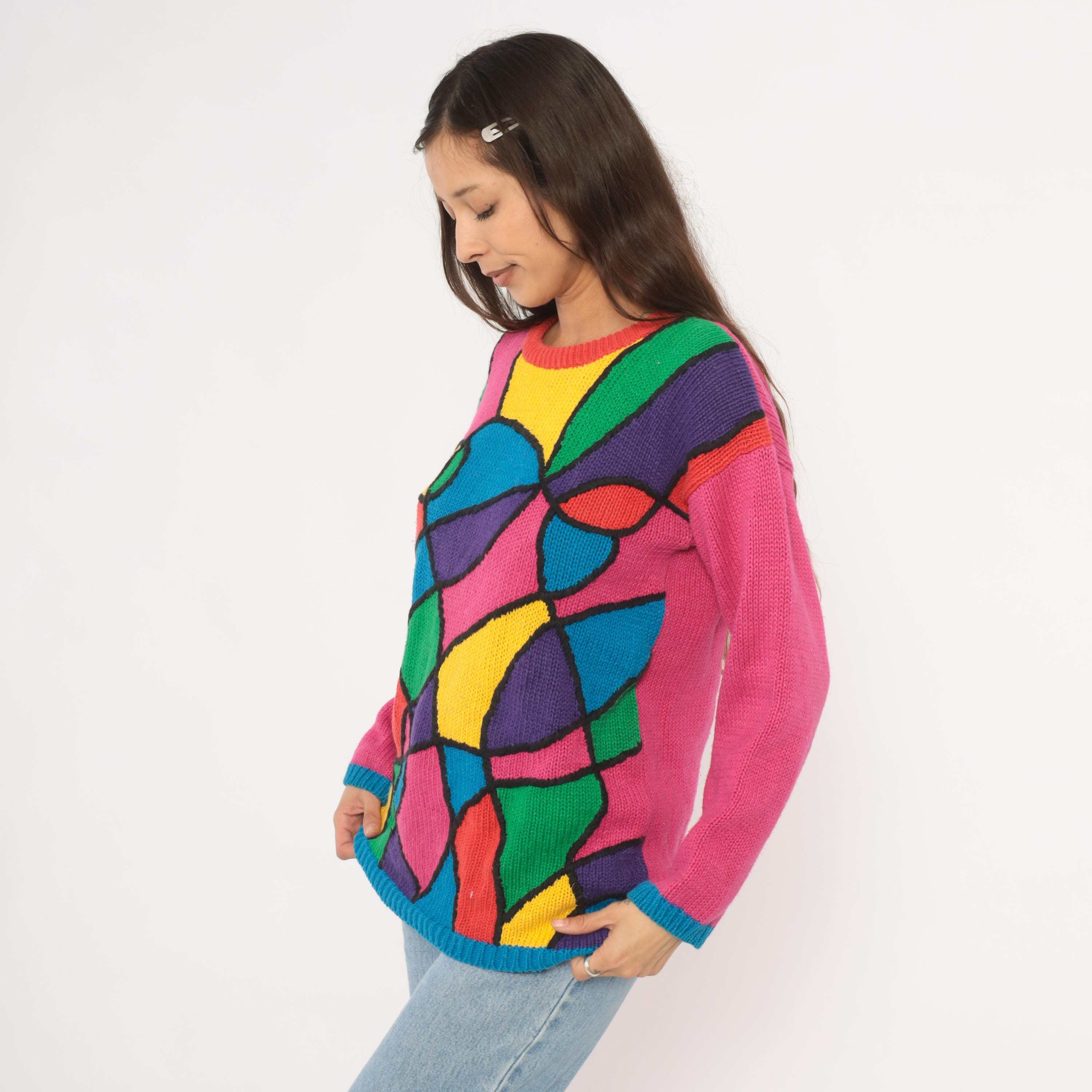 80s knit pullover with an abstract stained glass pattern across the front in pink, blue, green, yellow, purple, and red sections outlined in black. Crewneck with a red-orange ribbed collar, solid magenta sleeves and back, and teal ribbed cuffs and hem.