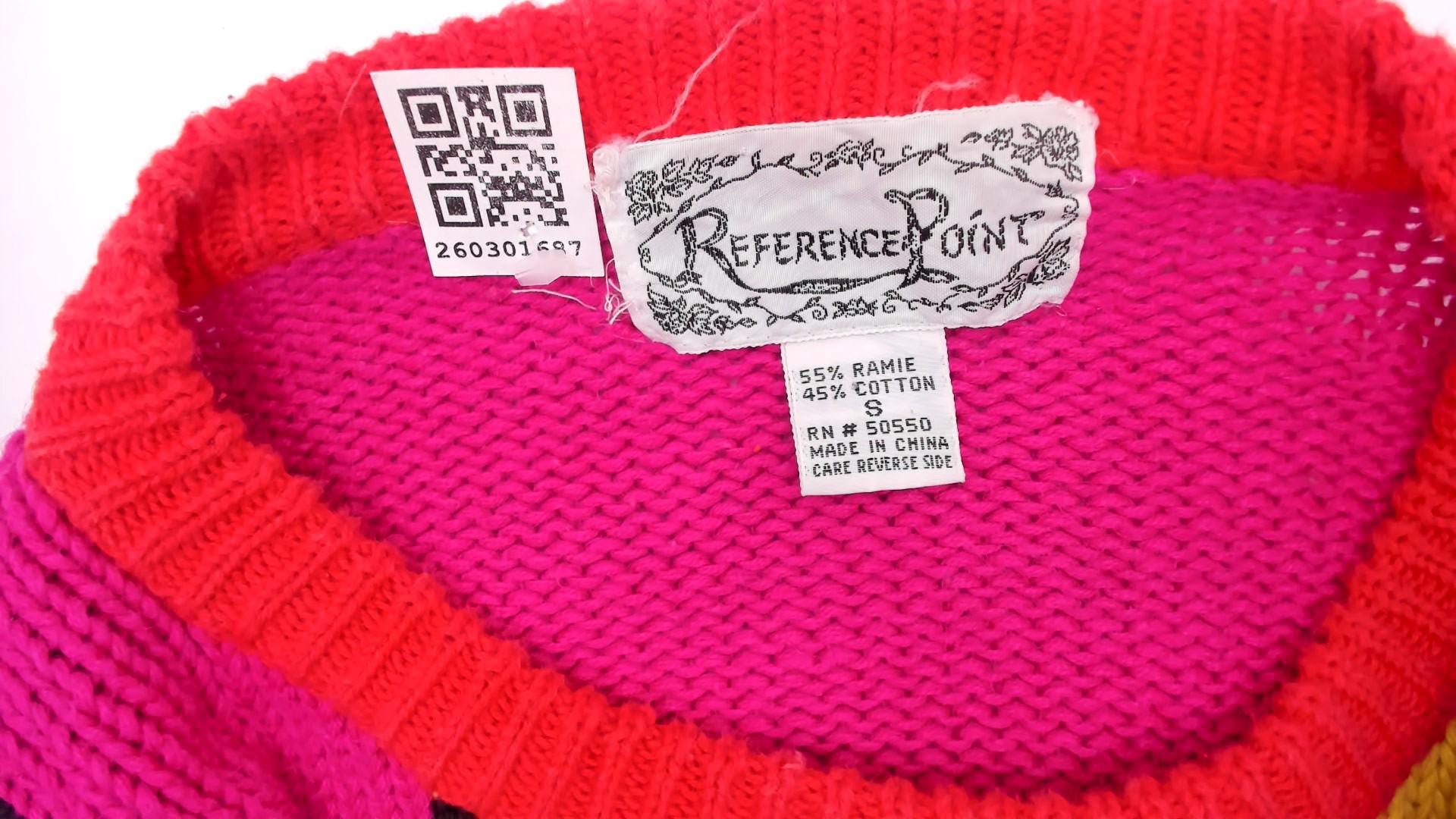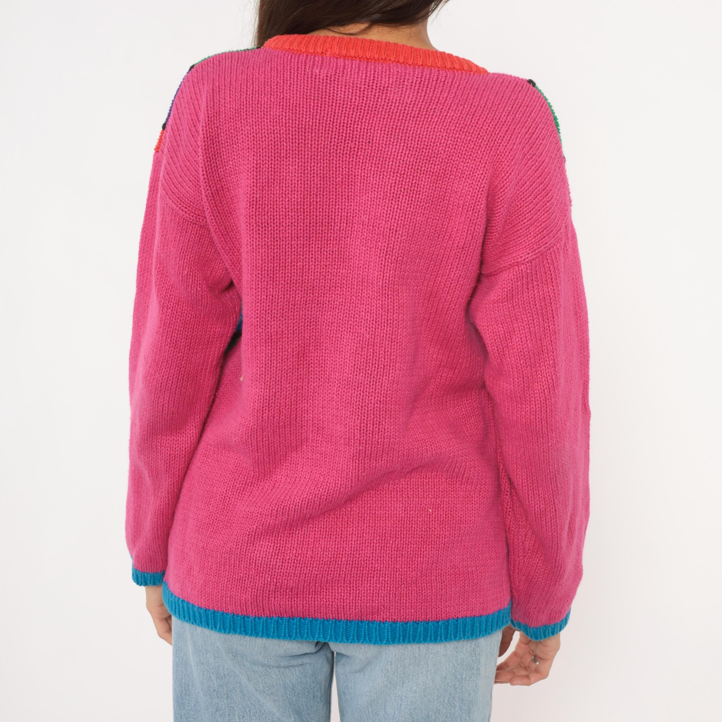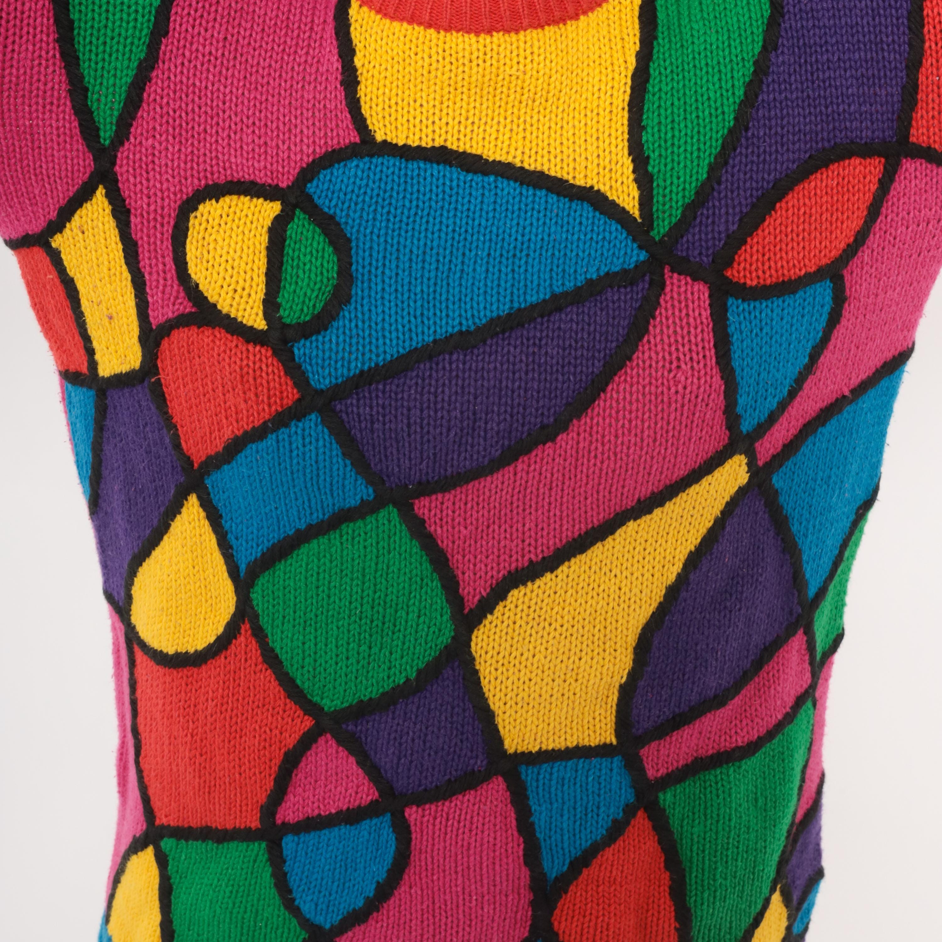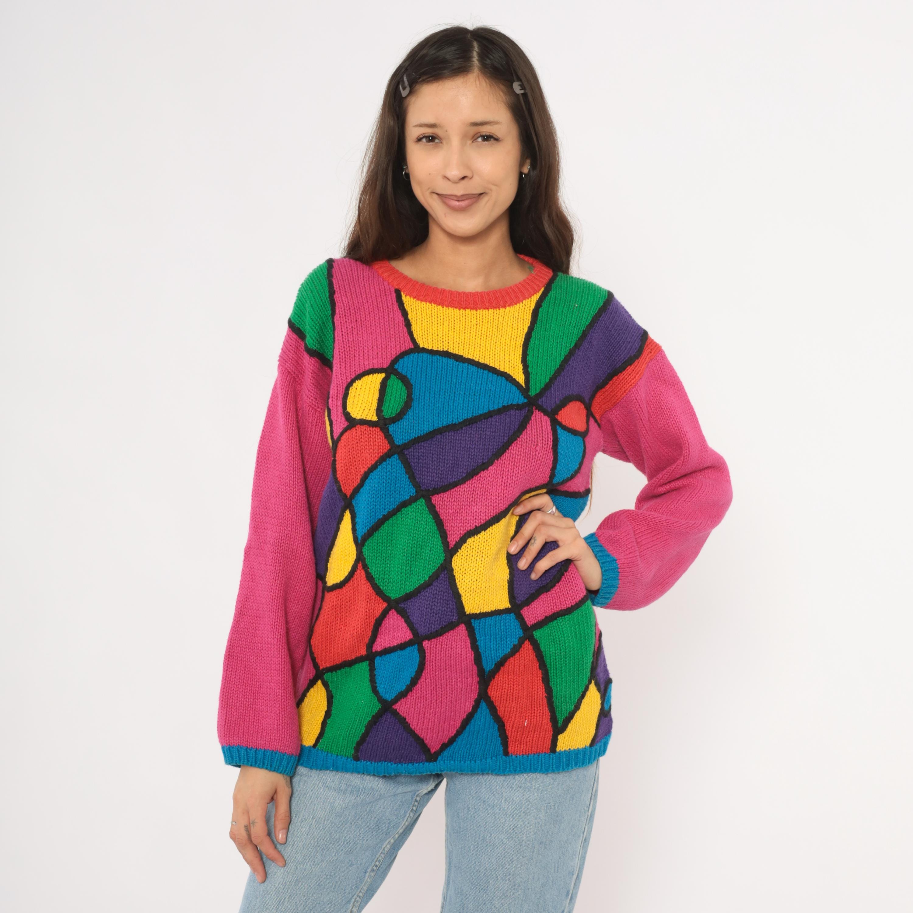 80s knit pullover with an abstract stained glass pattern across the front in pink, blue, green, yellow, purple, and red sections outlined in black. Crewneck with a red-orange ribbed collar, solid magenta sleeves and back, and teal ribbed cuffs and hem.