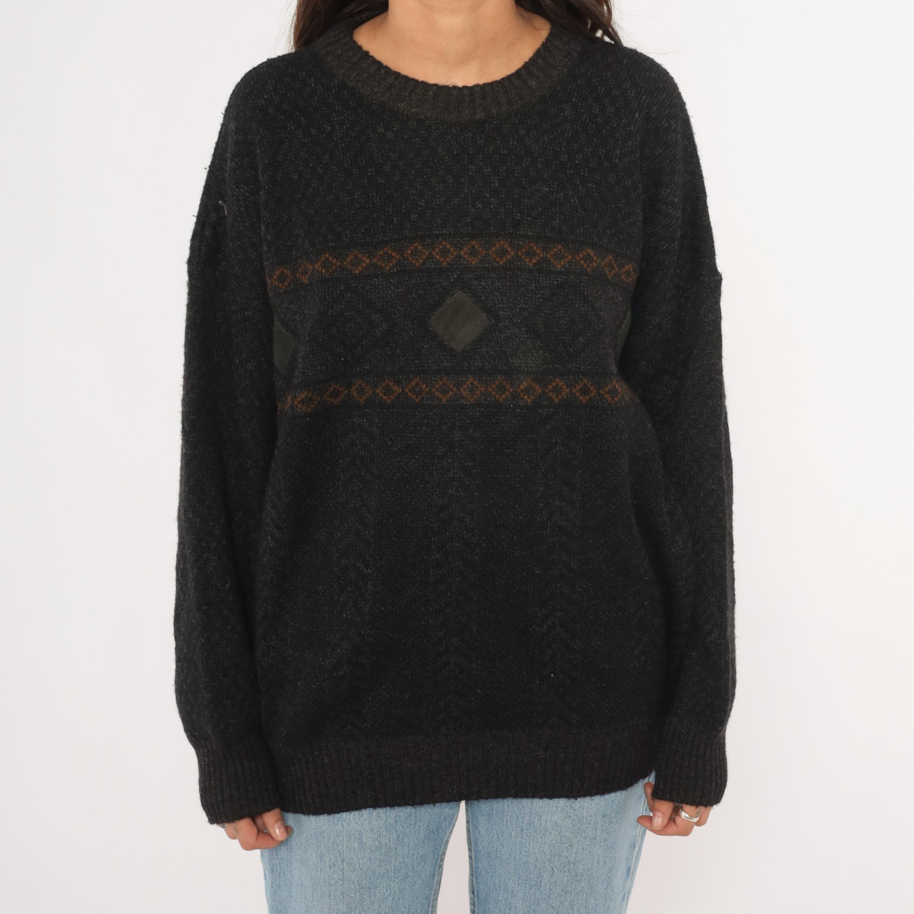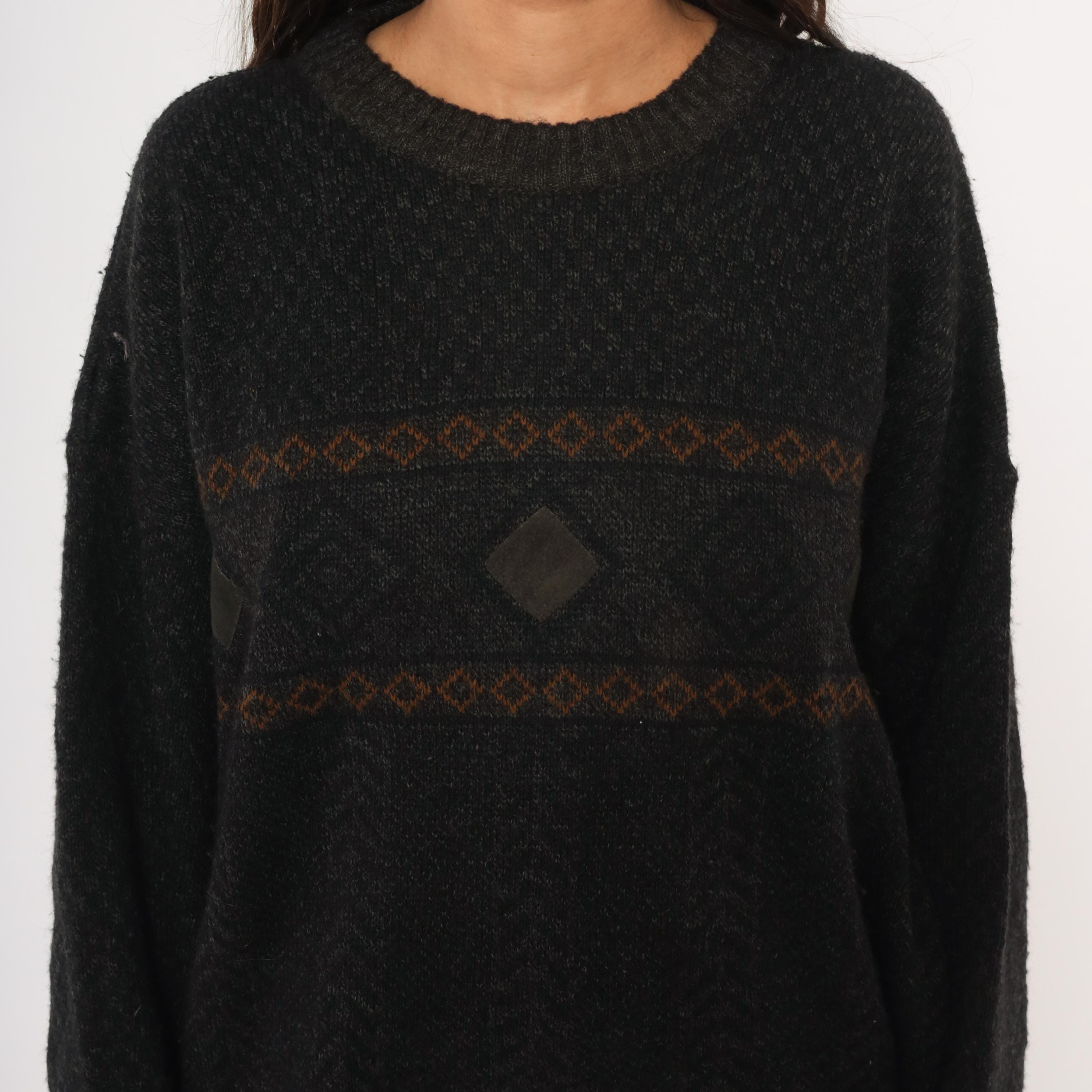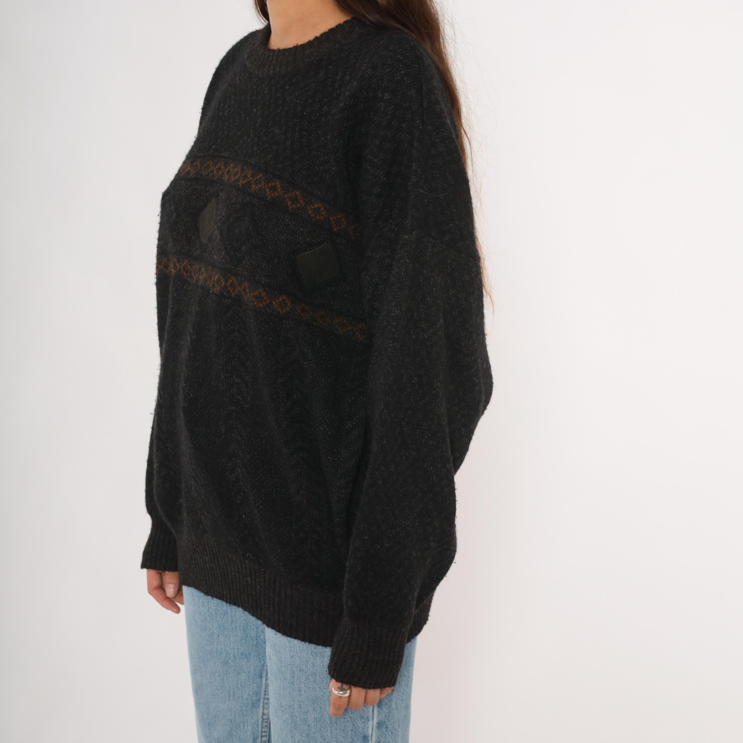 90s charcoal knit pullover with two horizontal bands of brown and rust diamond-patterned jacquard across the chest. A dark leather diamond-shaped patch sits centered between the bands, flanked by smaller leather accent pieces on each side.