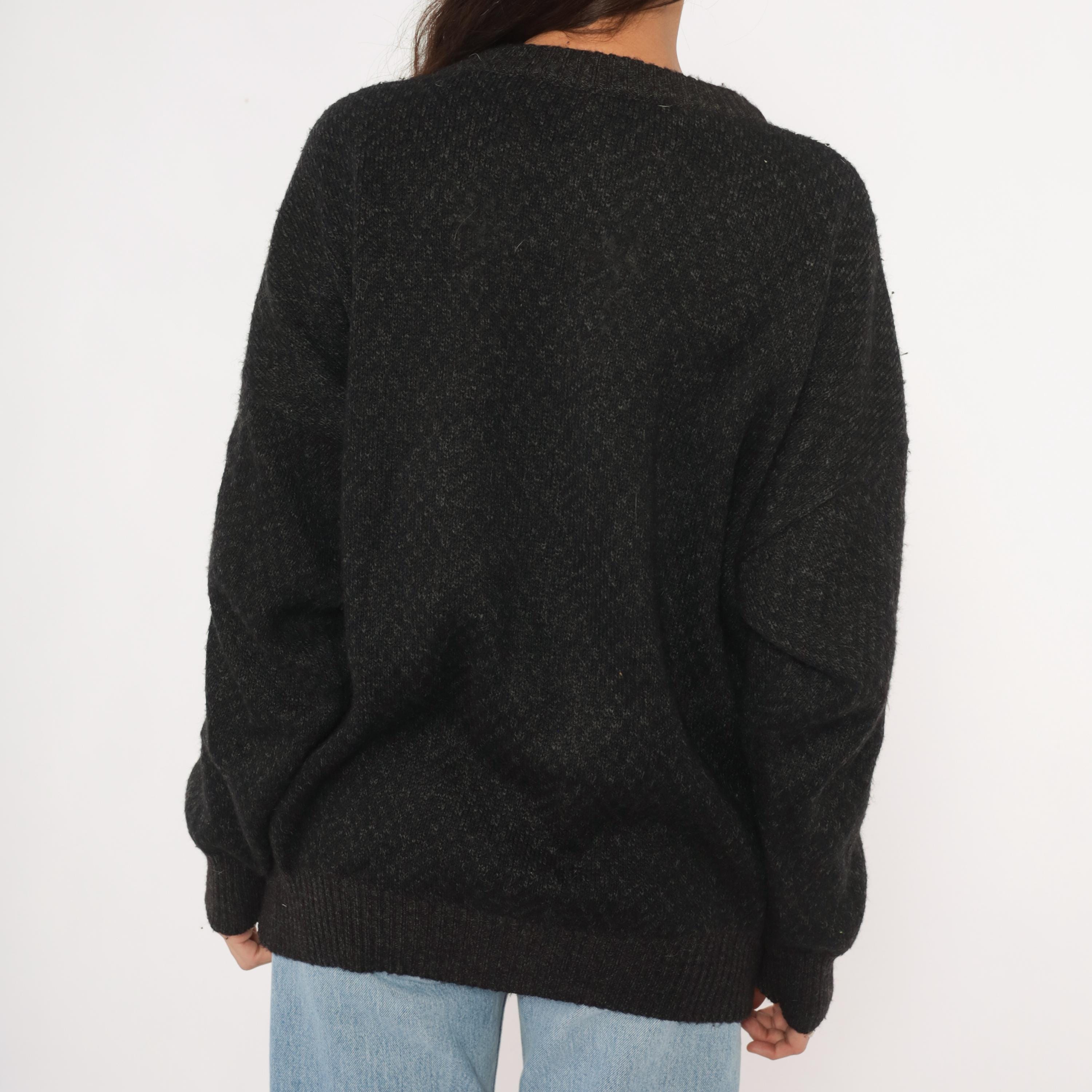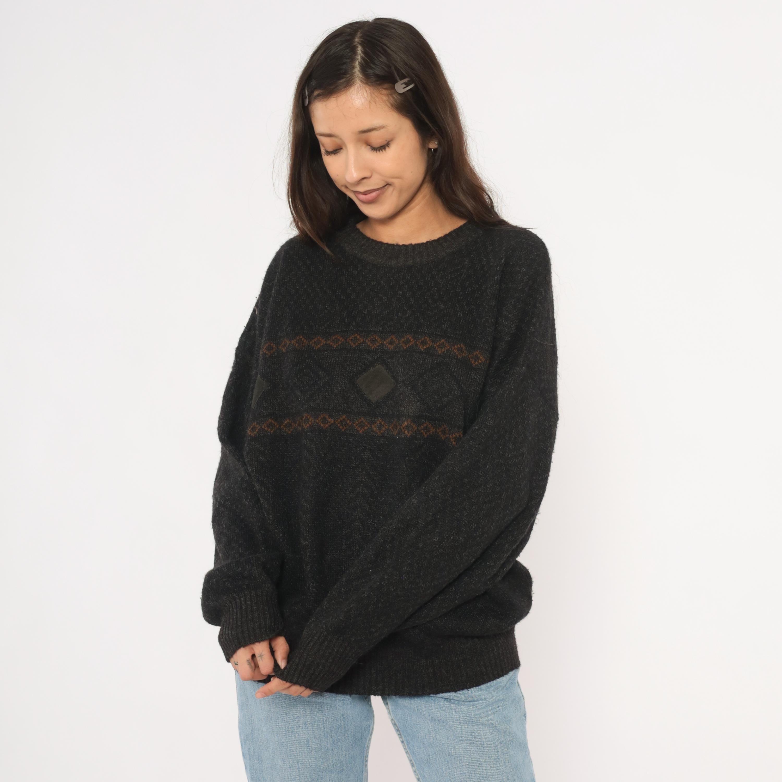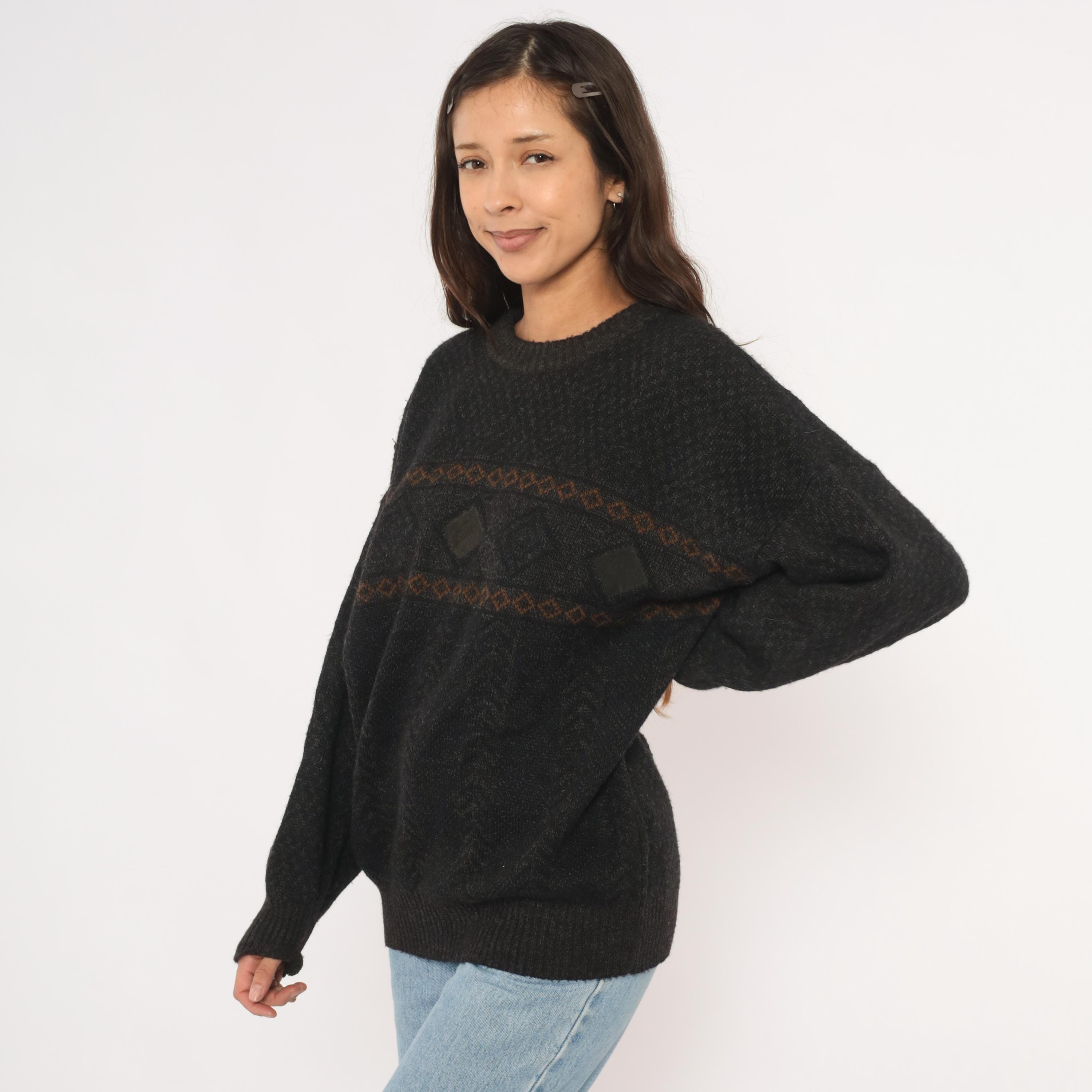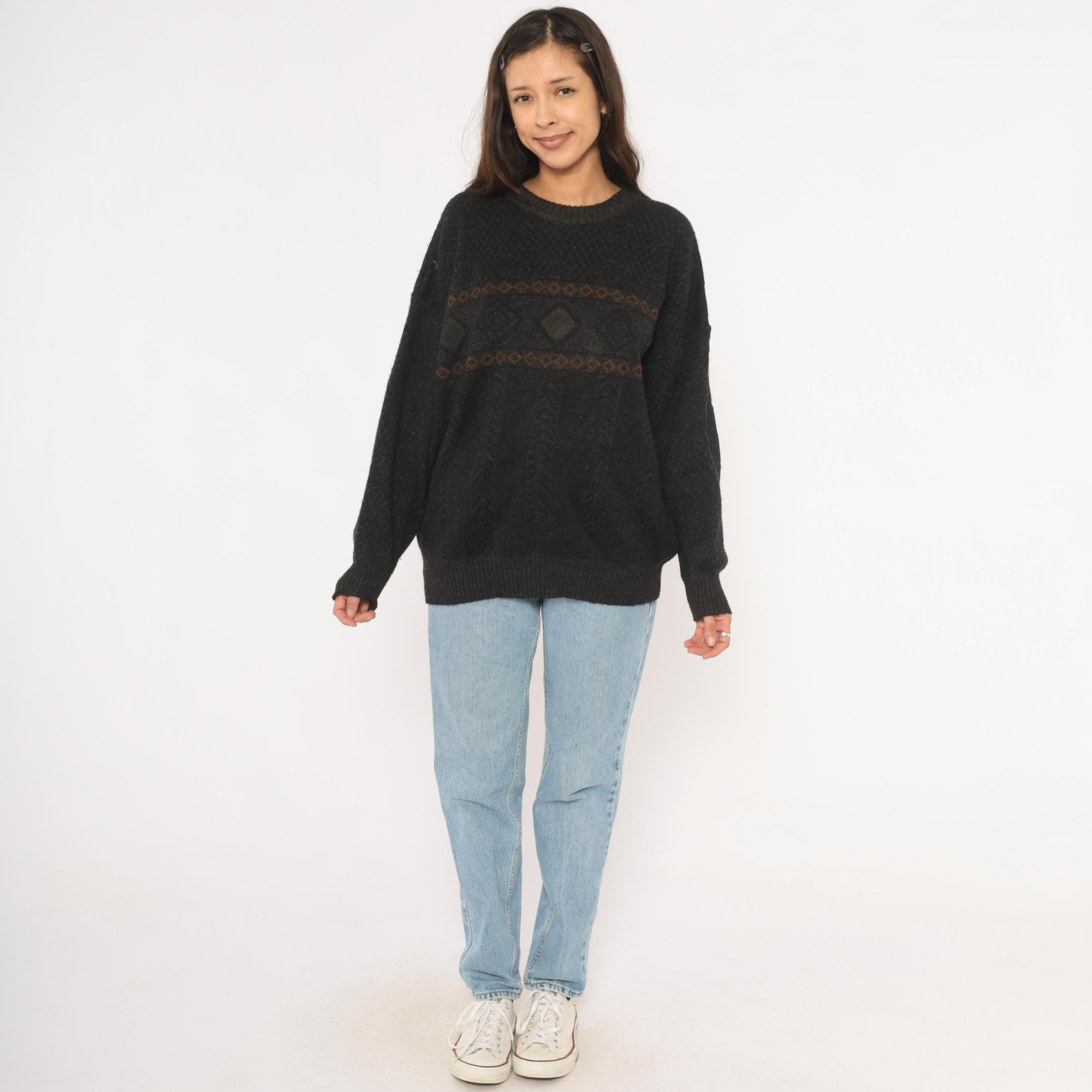 90s charcoal knit pullover with two horizontal bands of brown and rust diamond-patterned jacquard across the chest. A dark leather diamond-shaped patch sits centered between the bands, flanked by smaller leather accent pieces on each side.