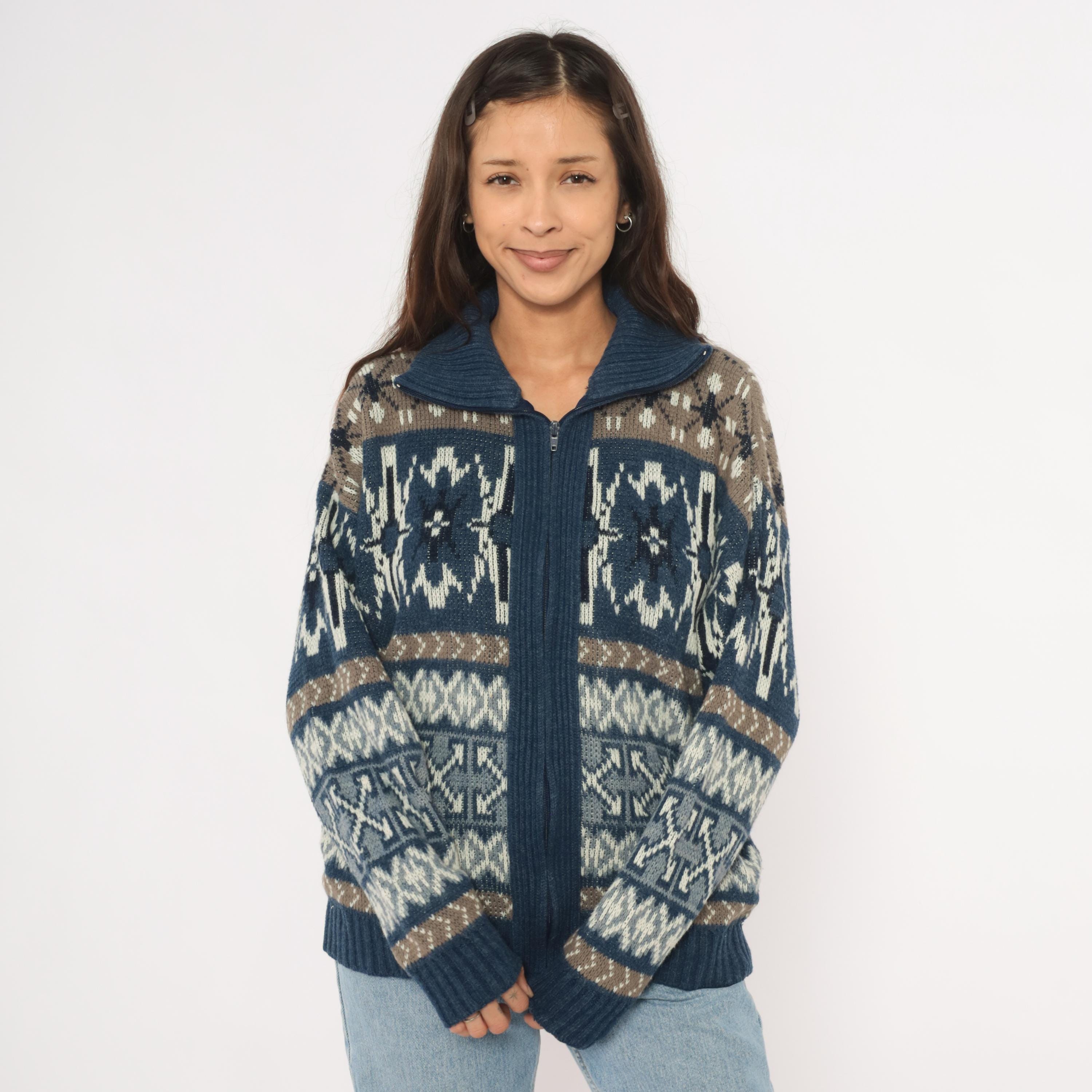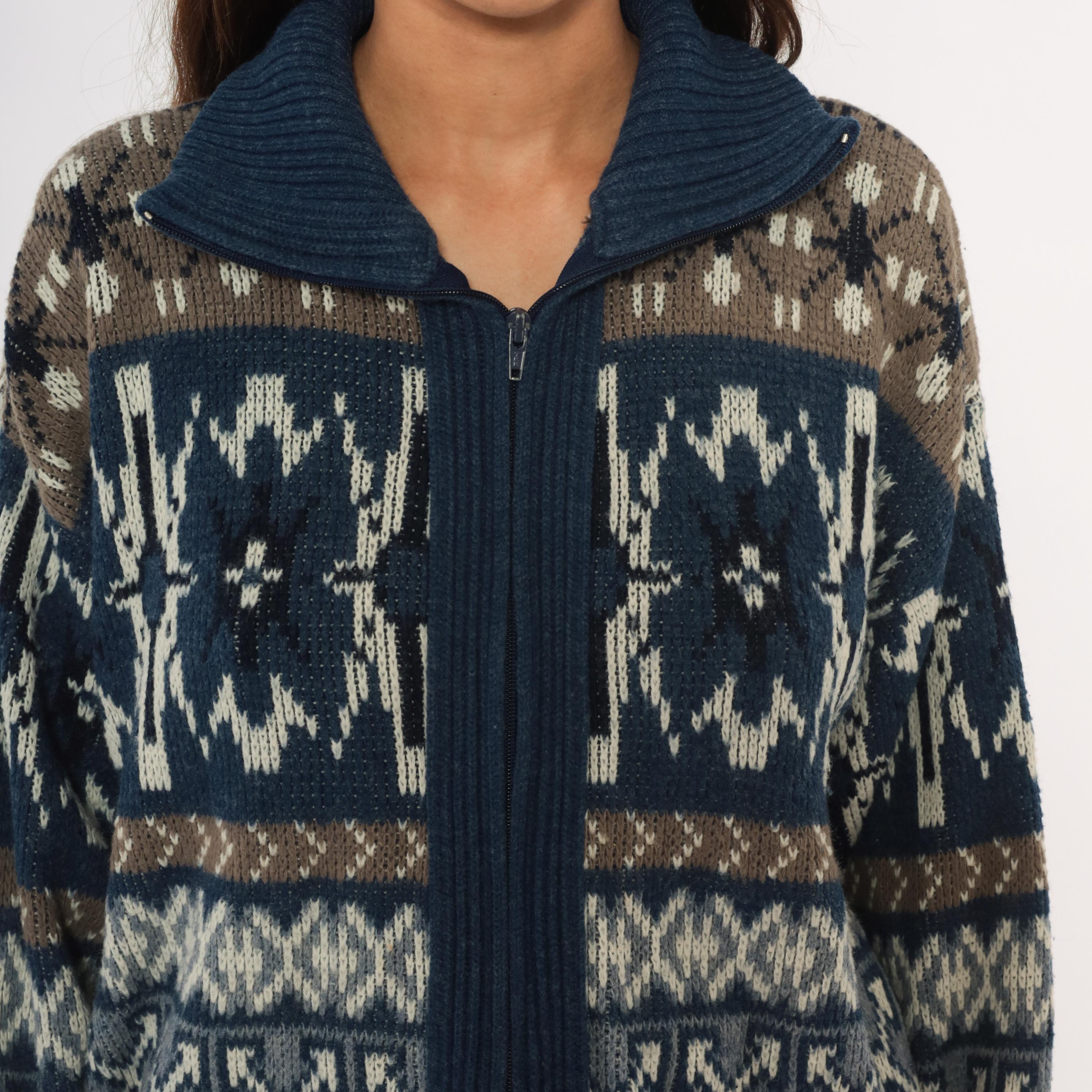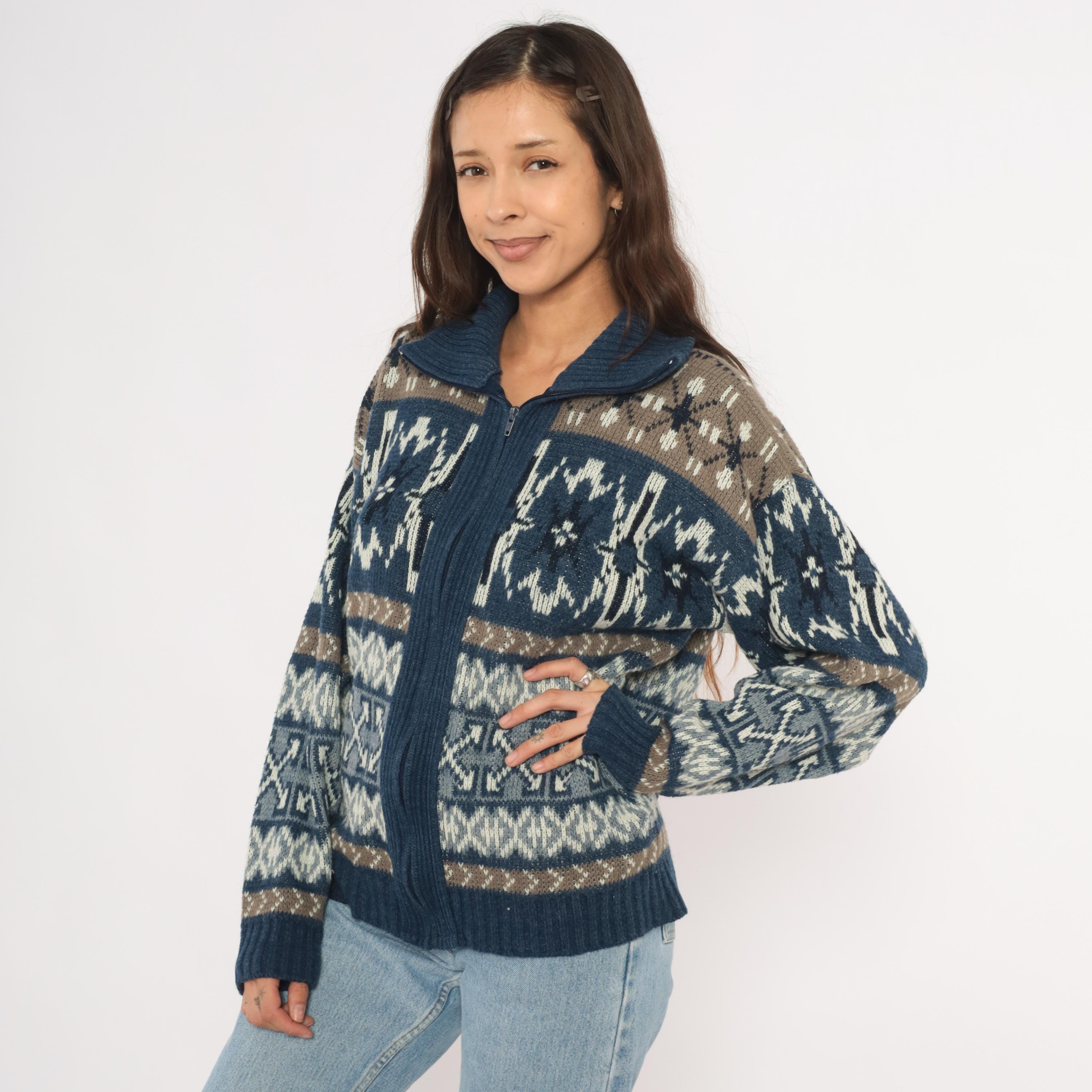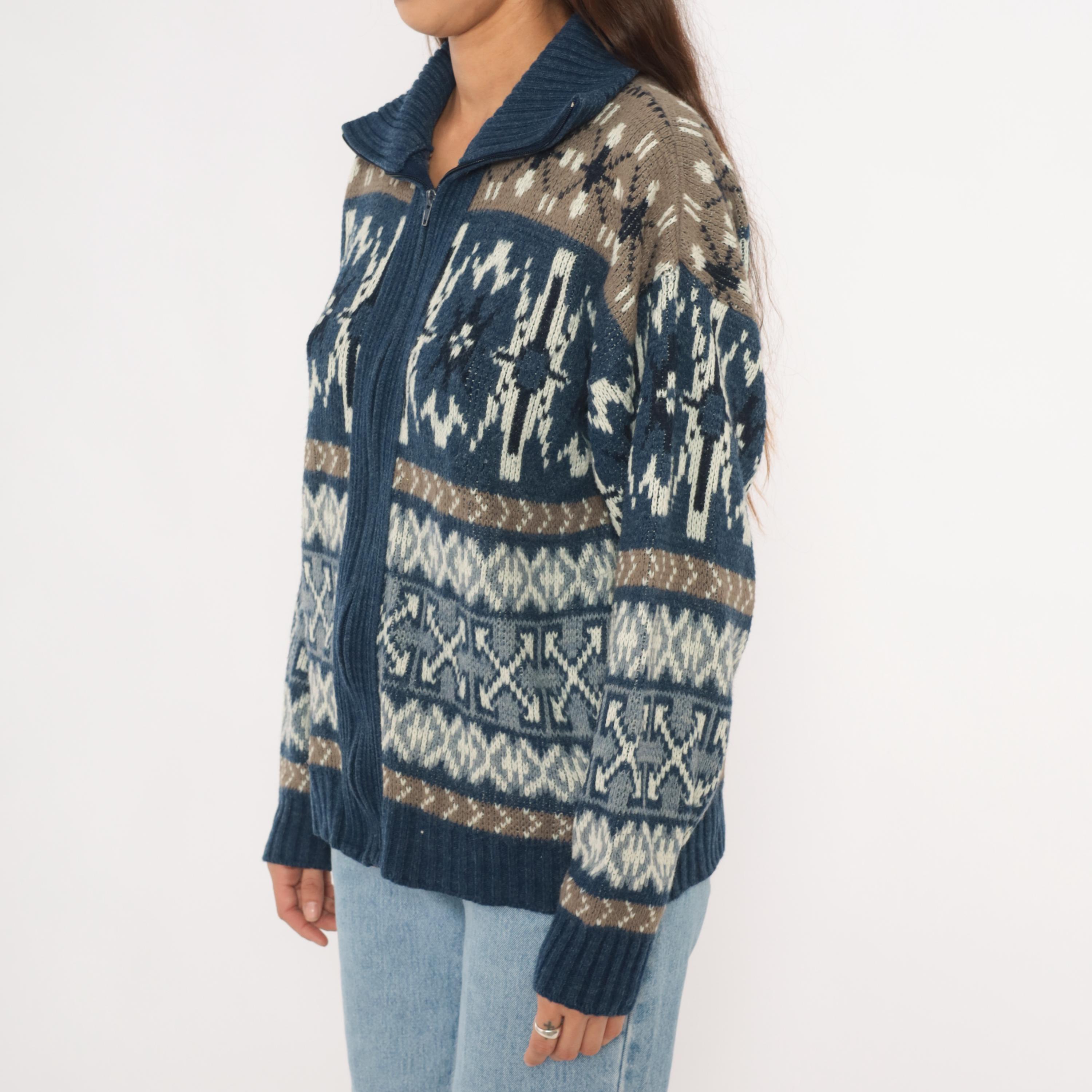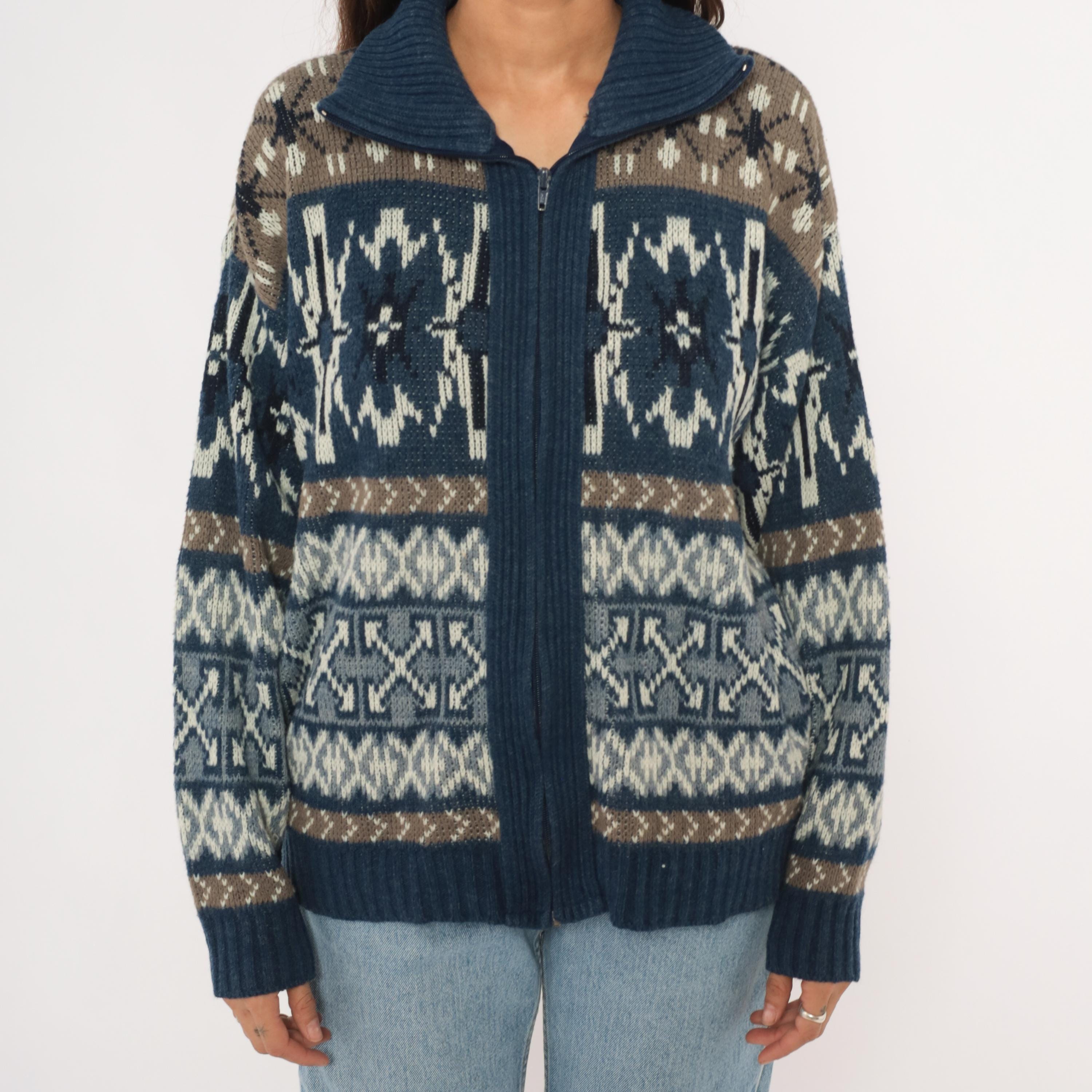 90s zip-front cardigan in navy, taupe, and cream with a Fair Isle snowflake and geometric pattern throughout. Ribbed fold-down collar, ribbed cuffs, and ribbed hem in solid navy.