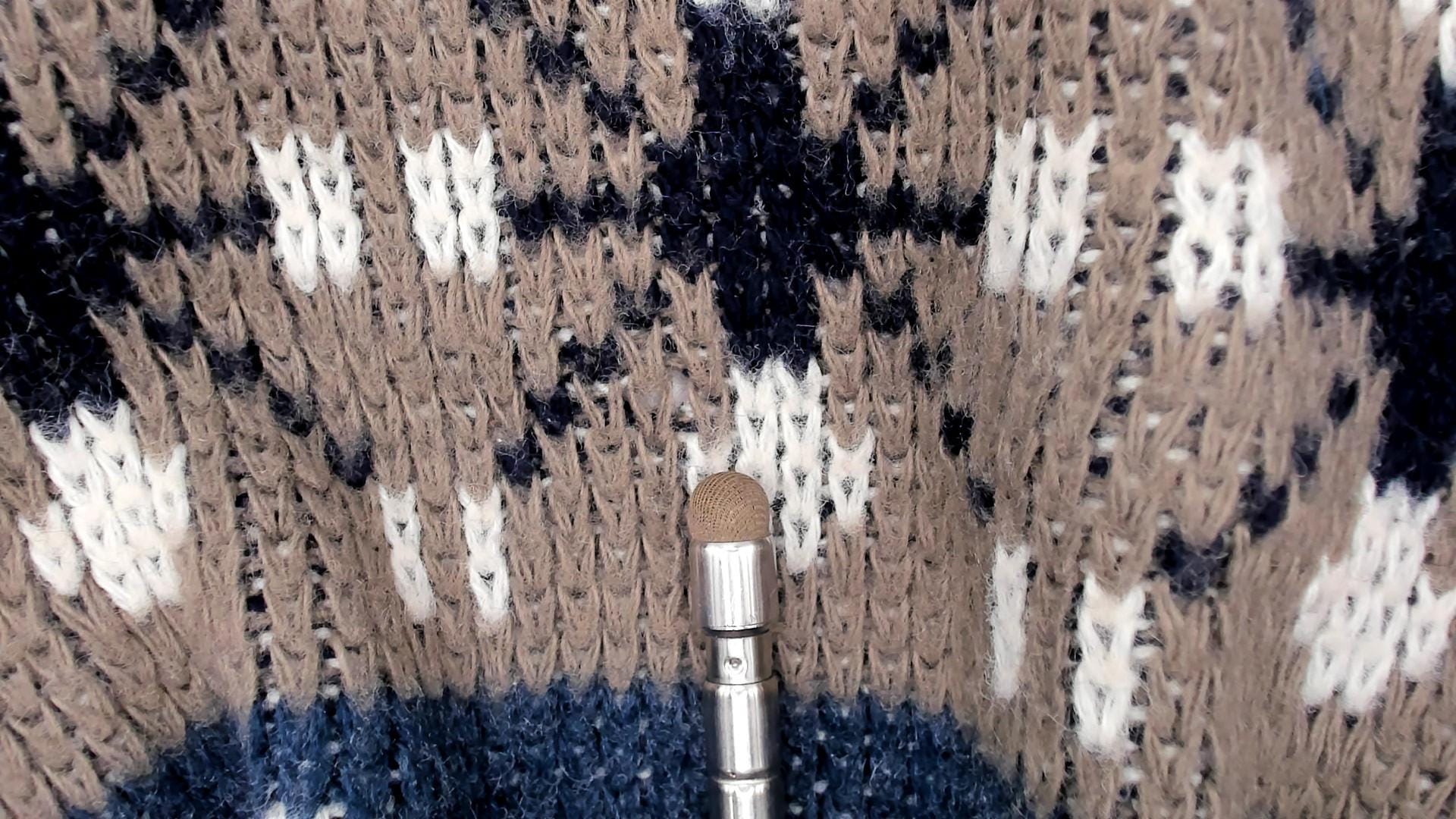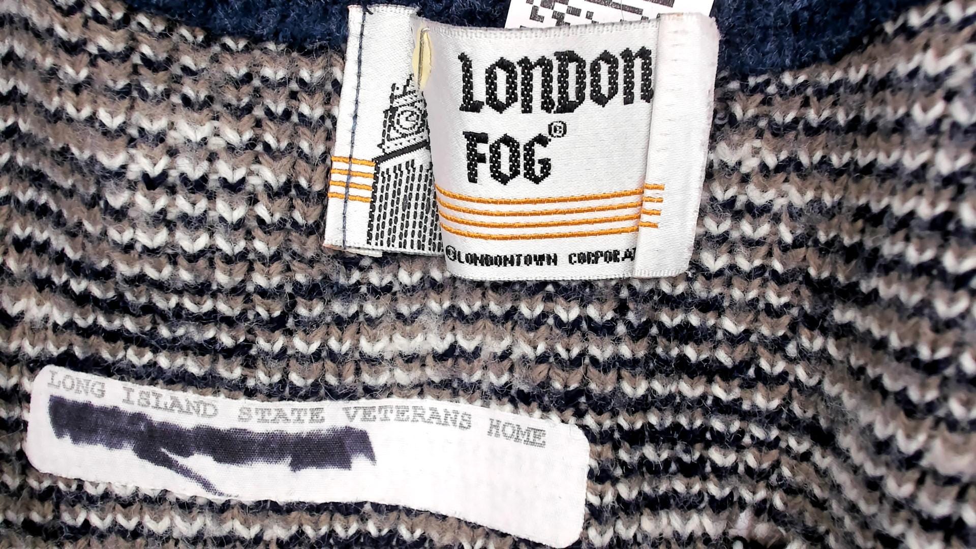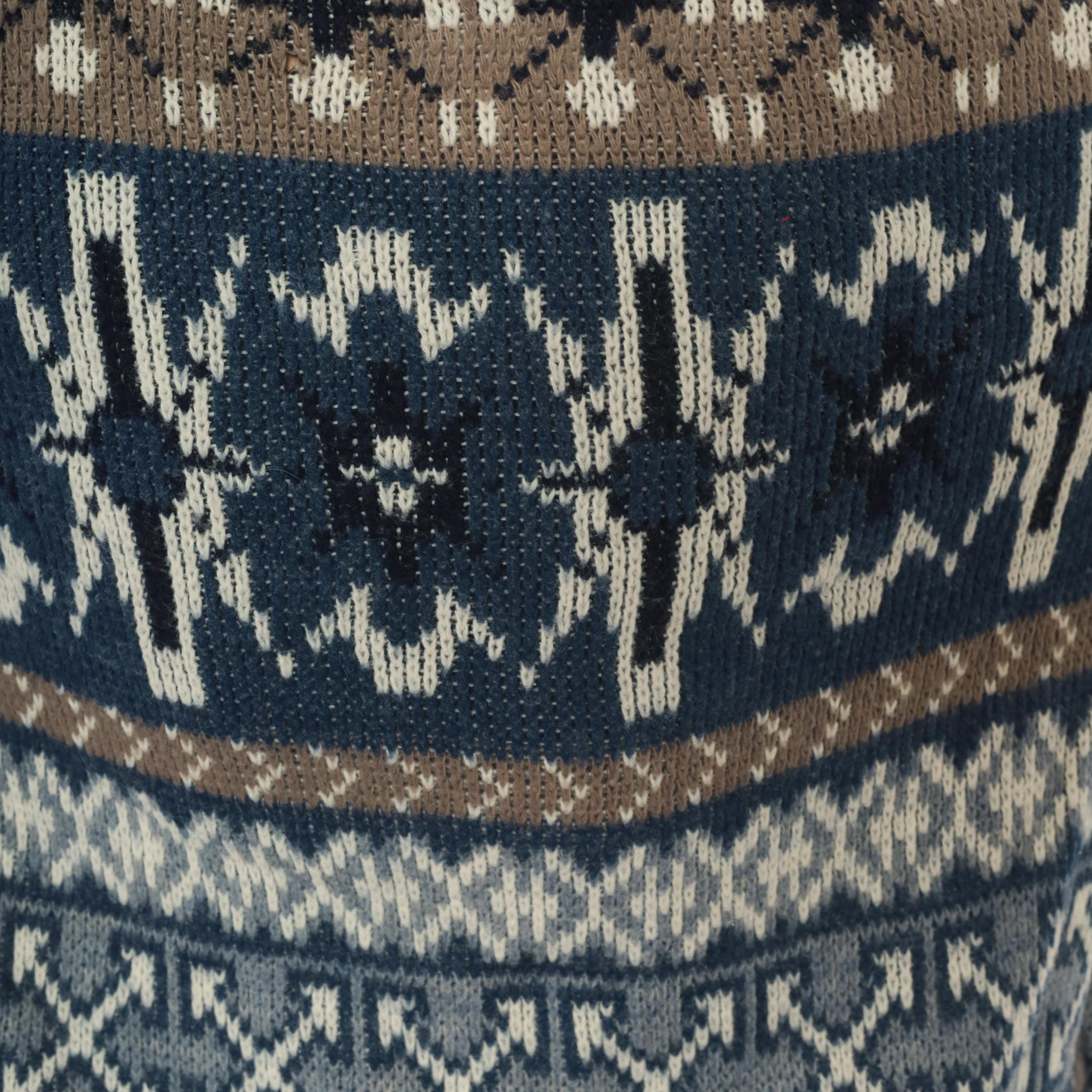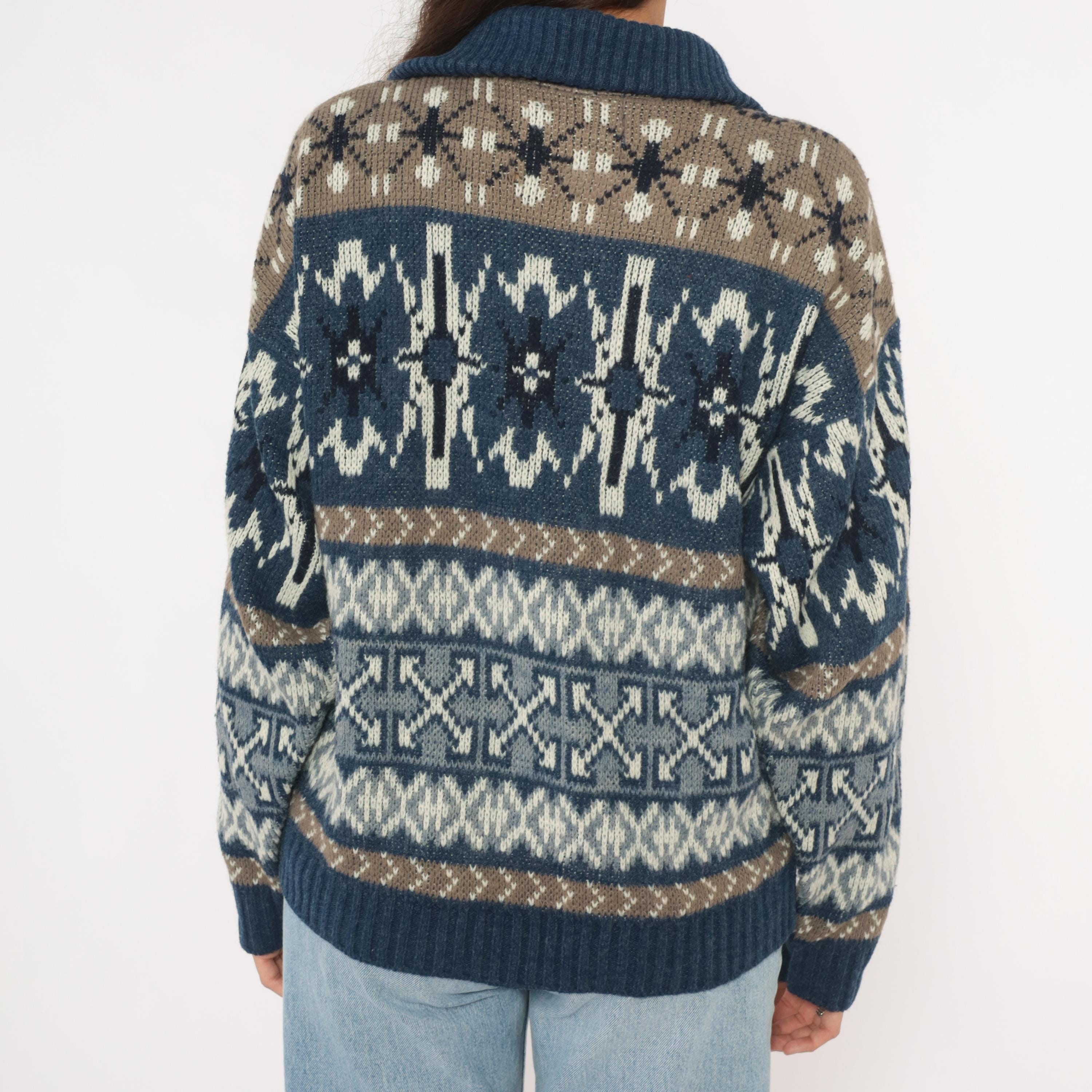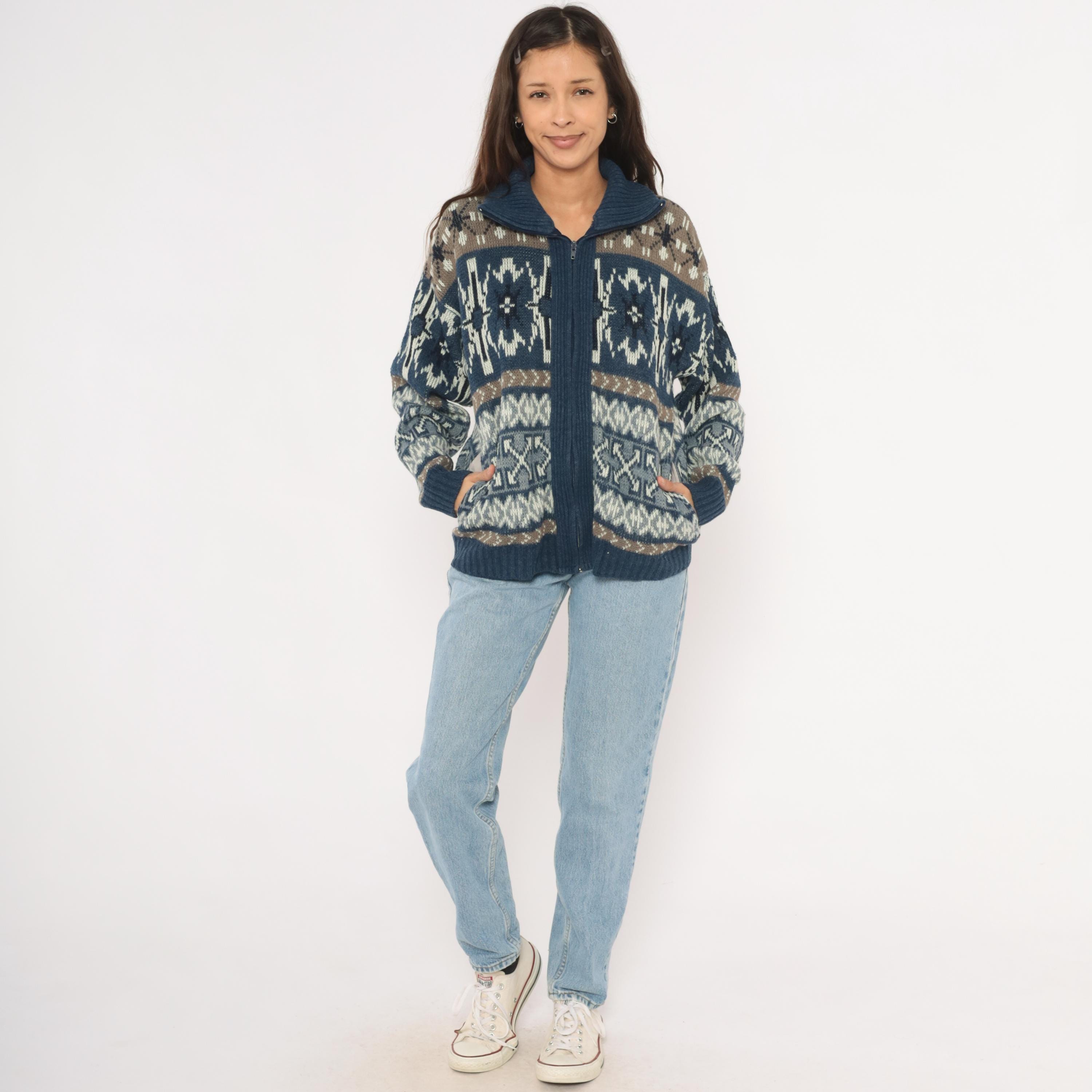 90s zip-front cardigan in navy, taupe, and cream with a Fair Isle snowflake and geometric pattern throughout. Ribbed fold-down collar, ribbed cuffs, and ribbed hem in solid navy.