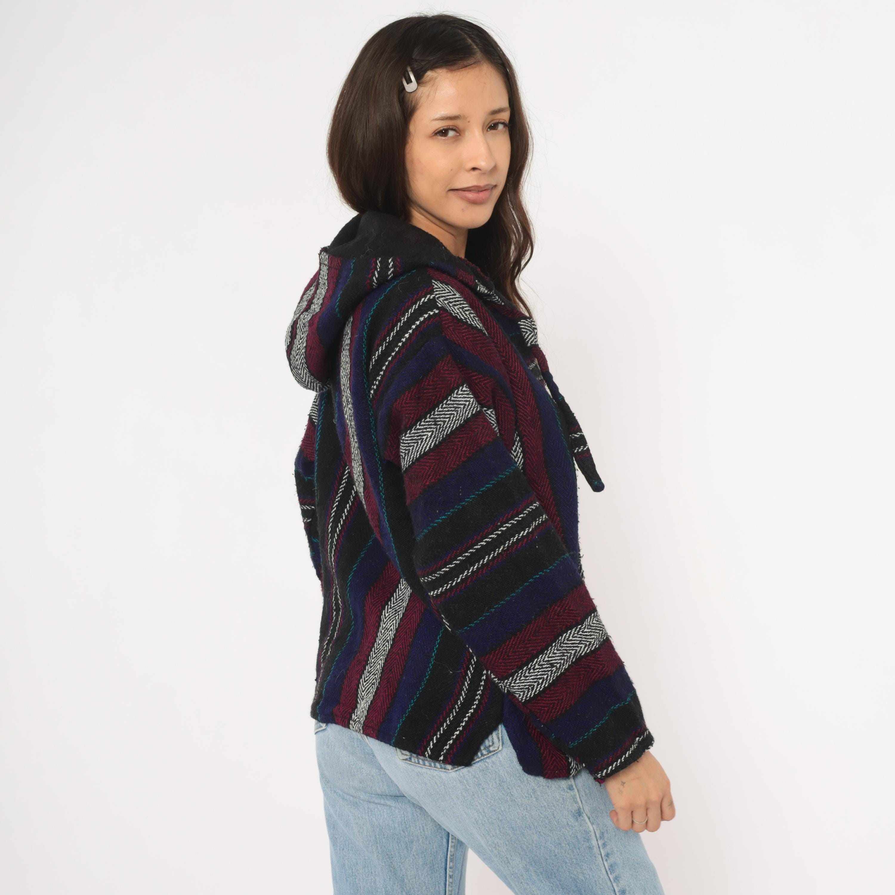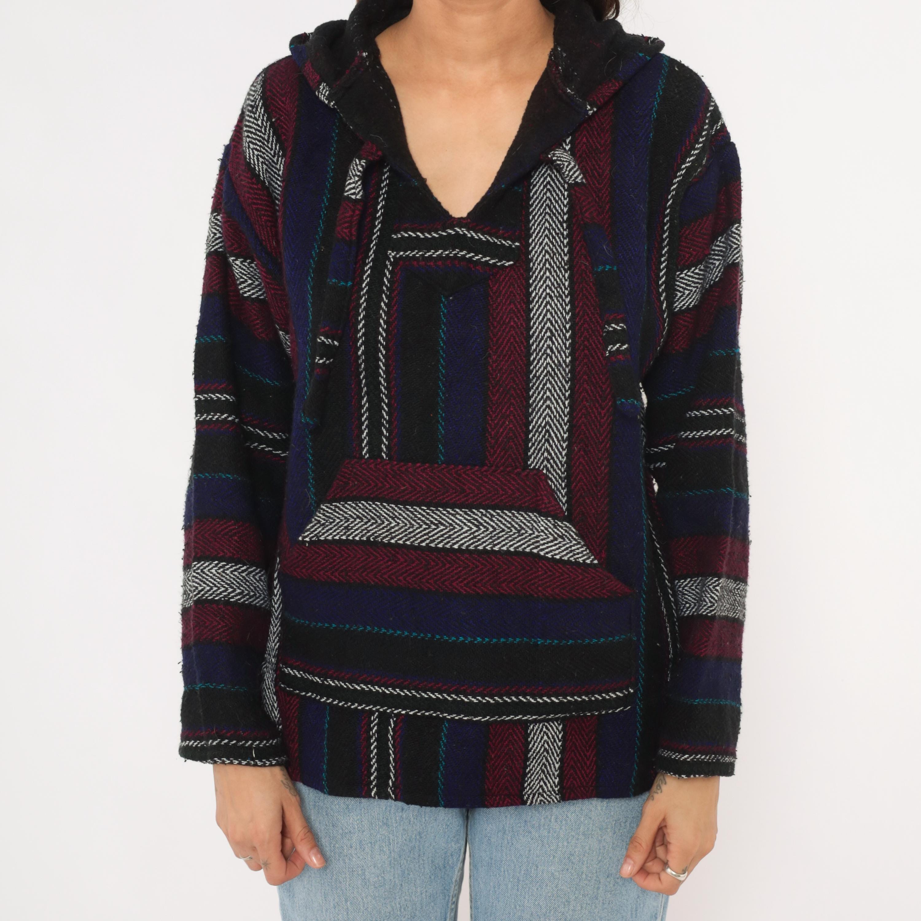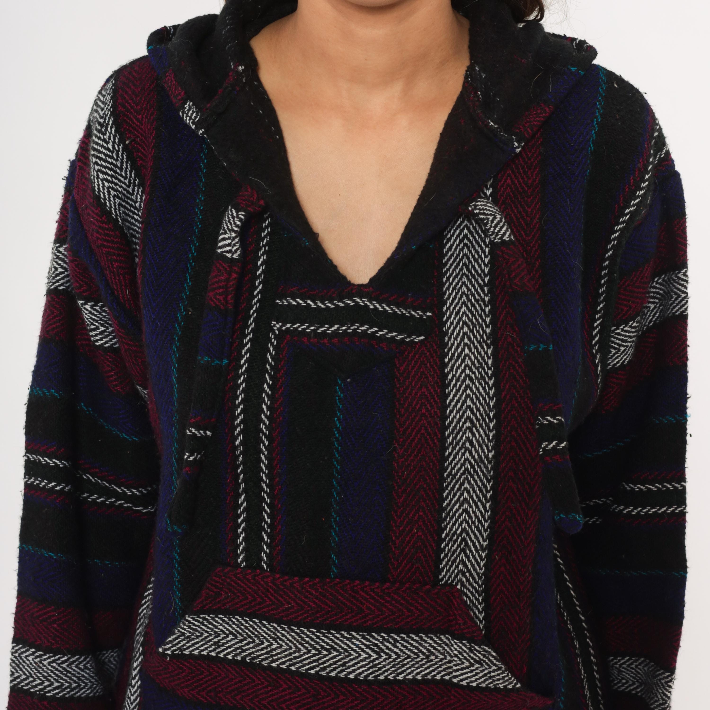 90s Baja hoodie in navy, burgundy, black, and grey herringbone woven stripes with teal accent lines. V-neckline with attached hood, kangaroo front pocket, and long sleeves with banded cuffs.