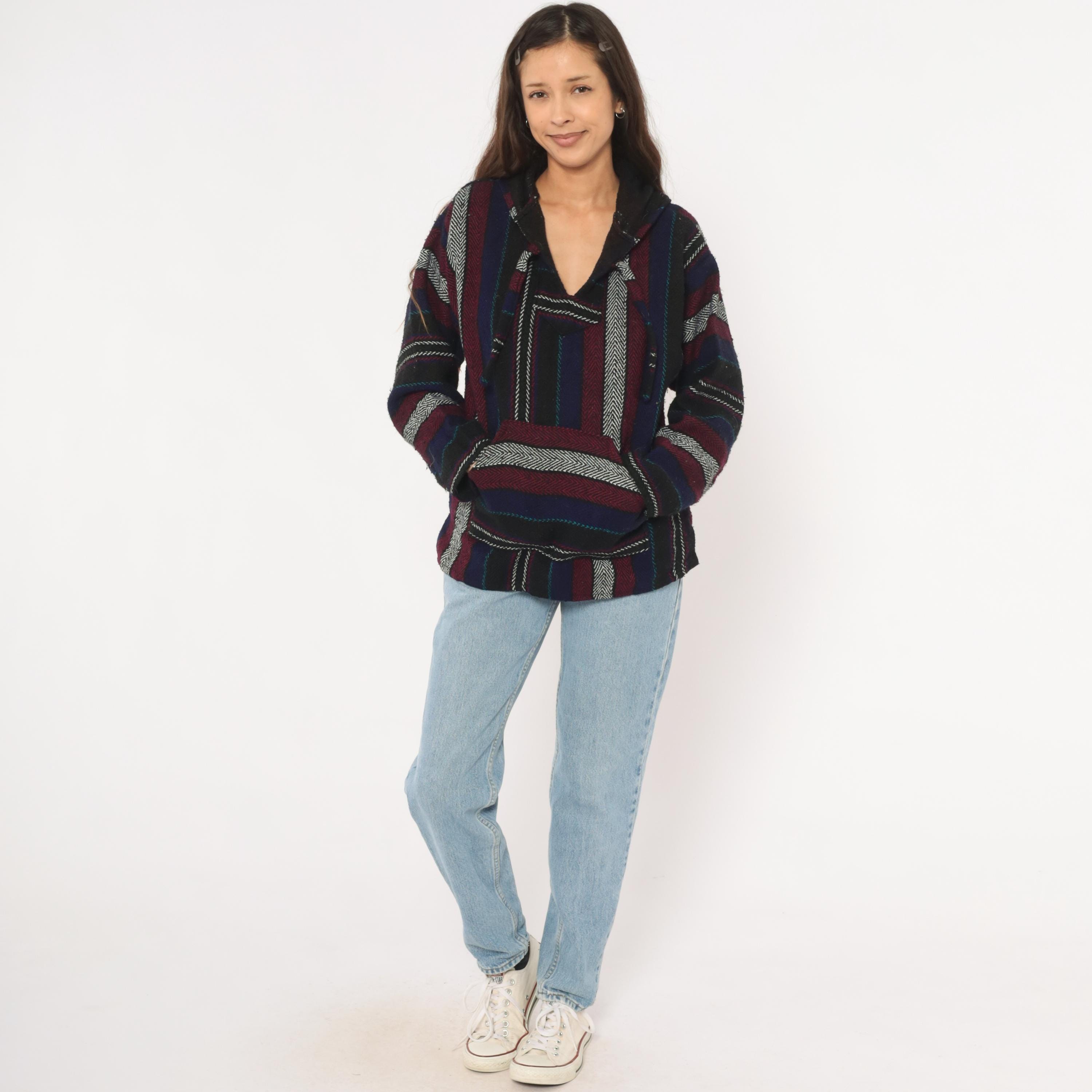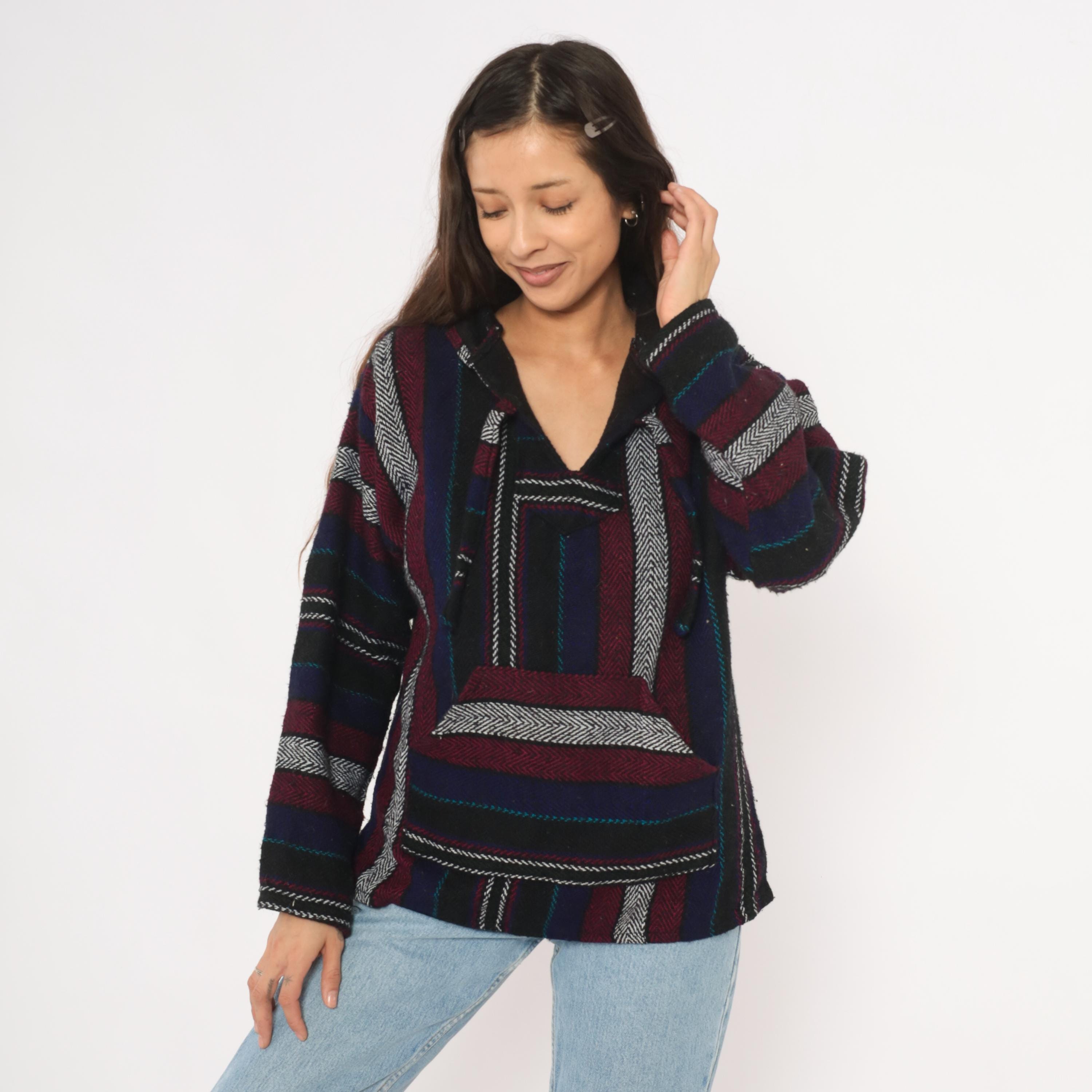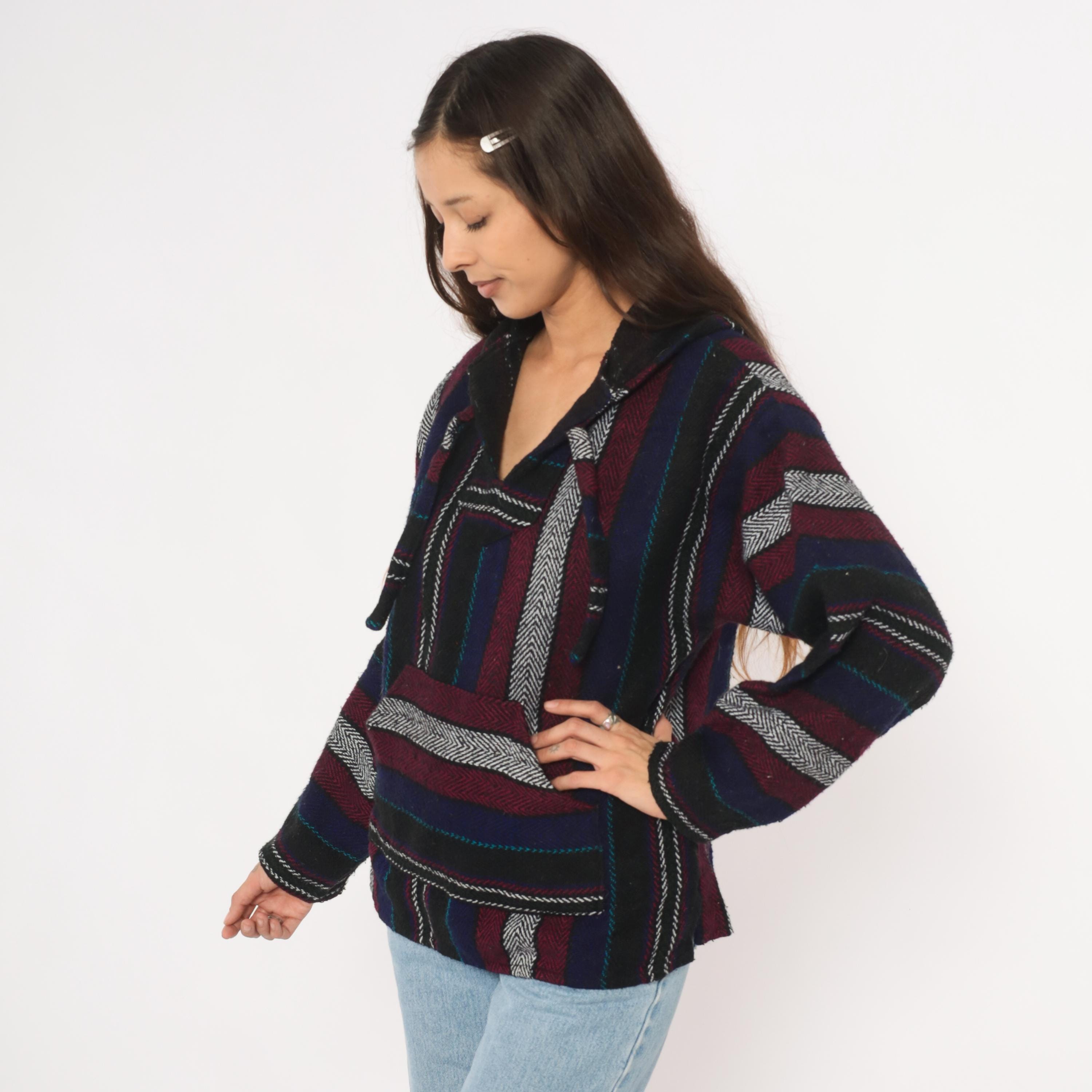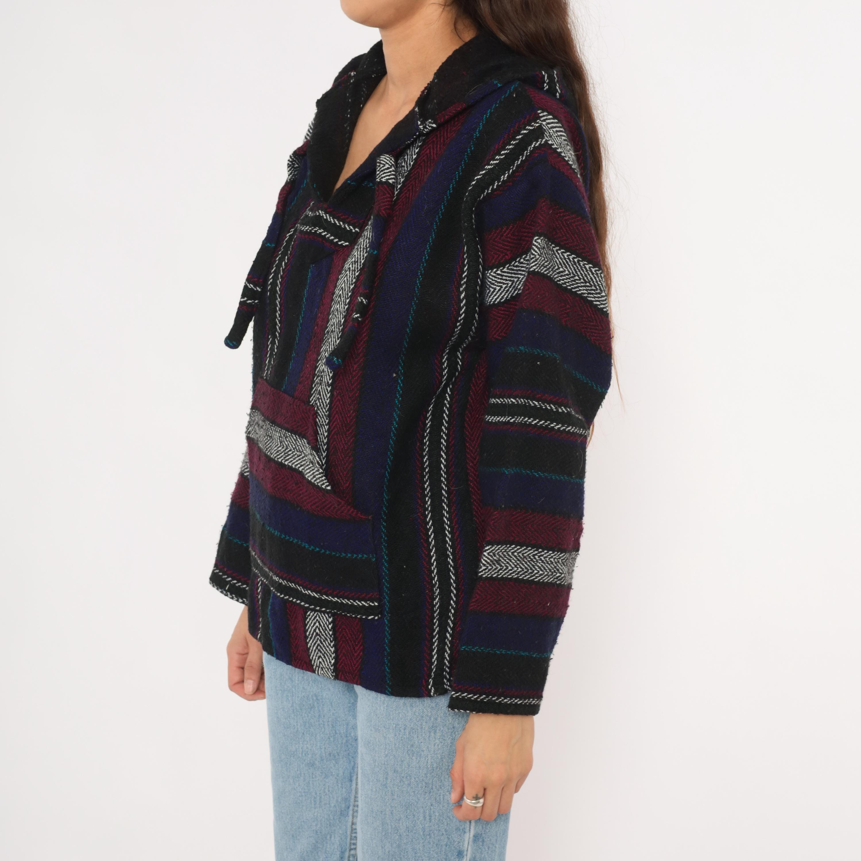 90s Baja hoodie in navy, burgundy, black, and grey herringbone woven stripes with teal accent lines. V-neckline with attached hood, kangaroo front pocket, and long sleeves with banded cuffs.