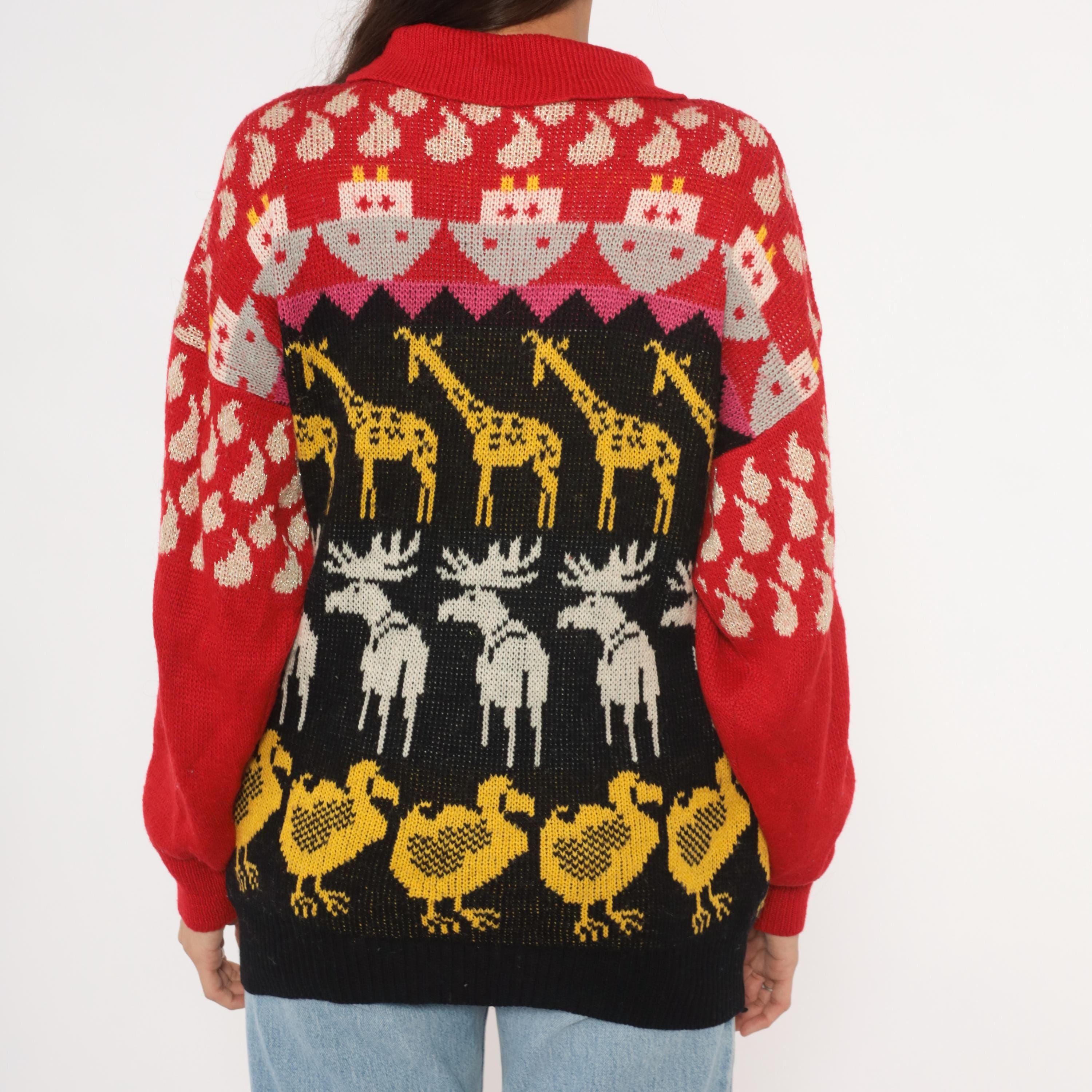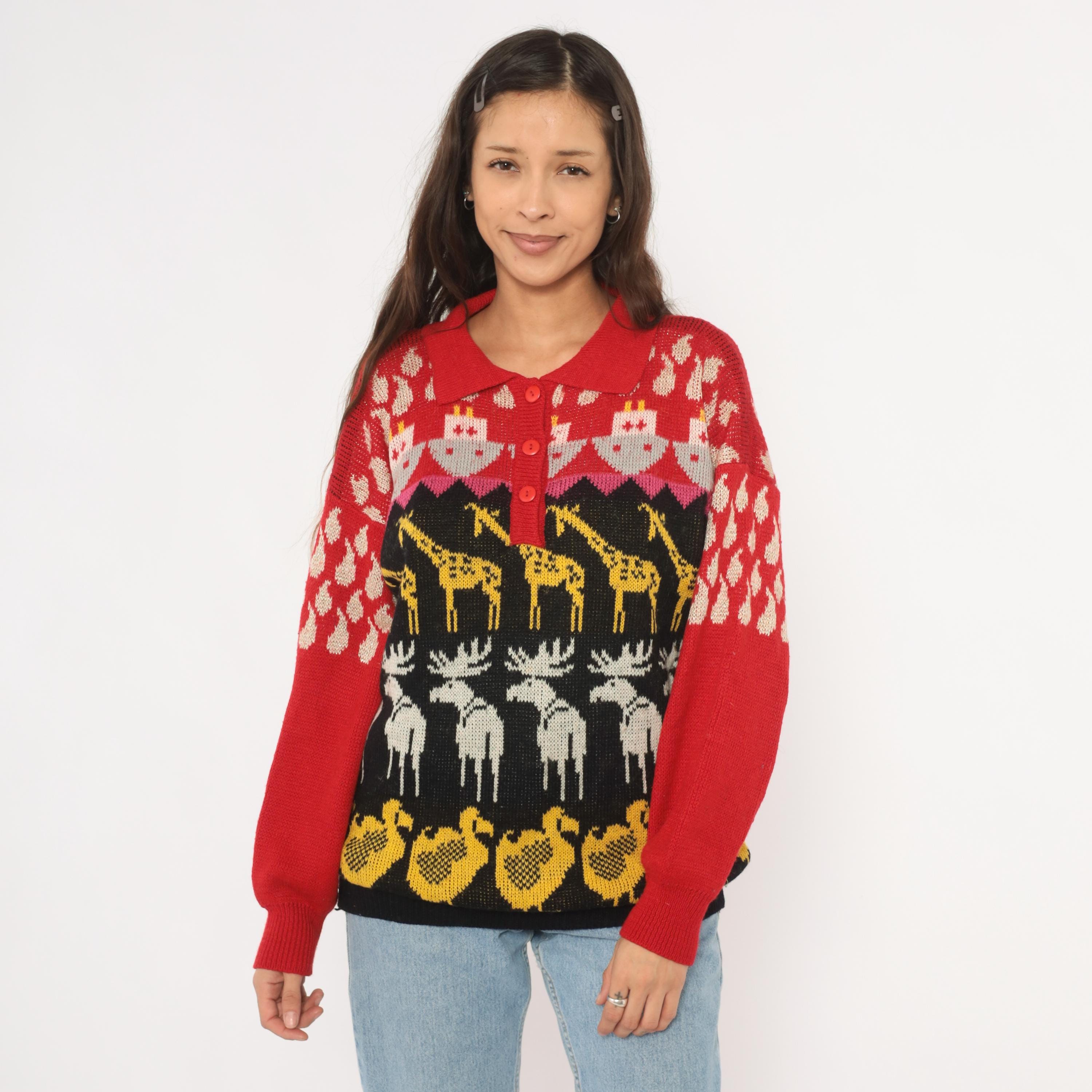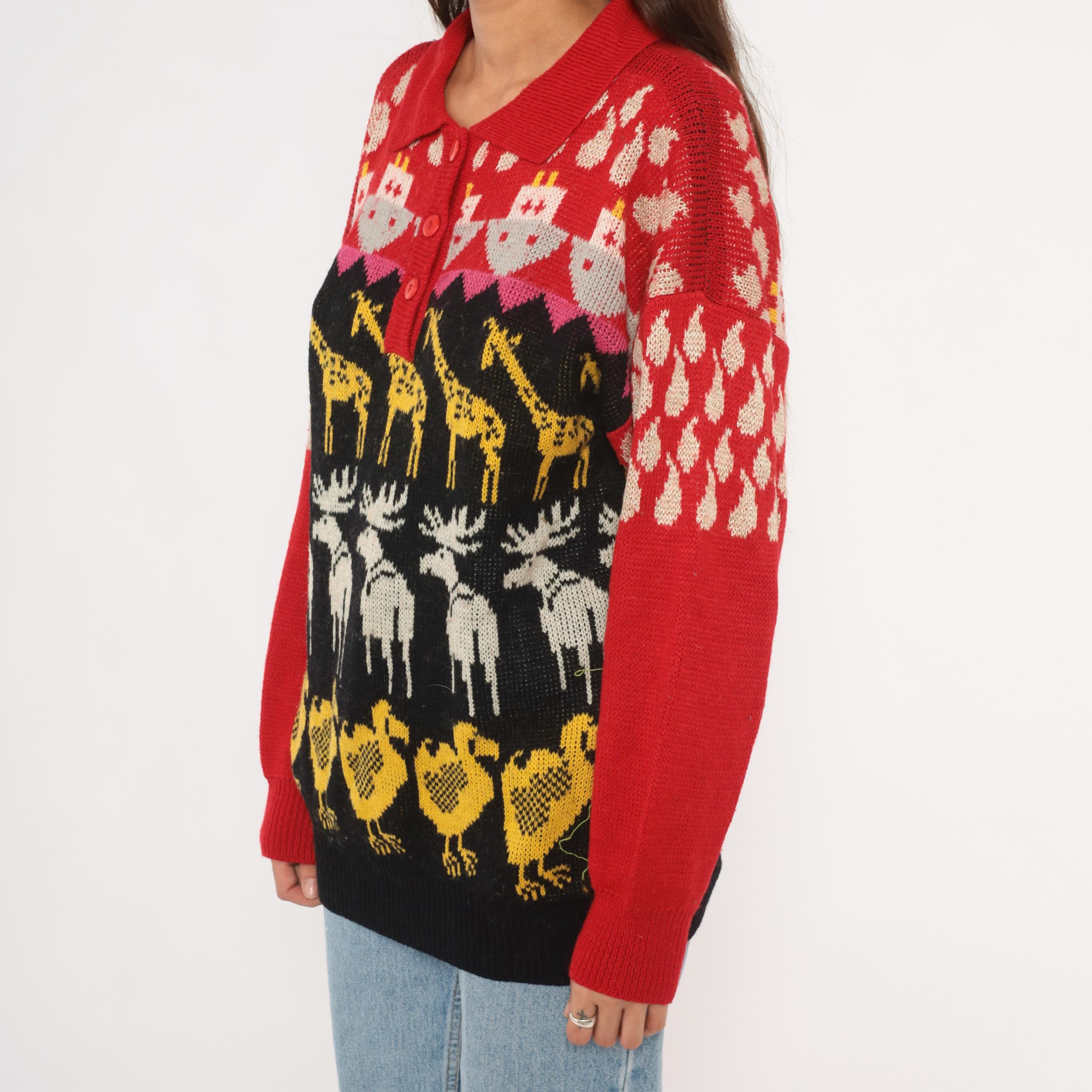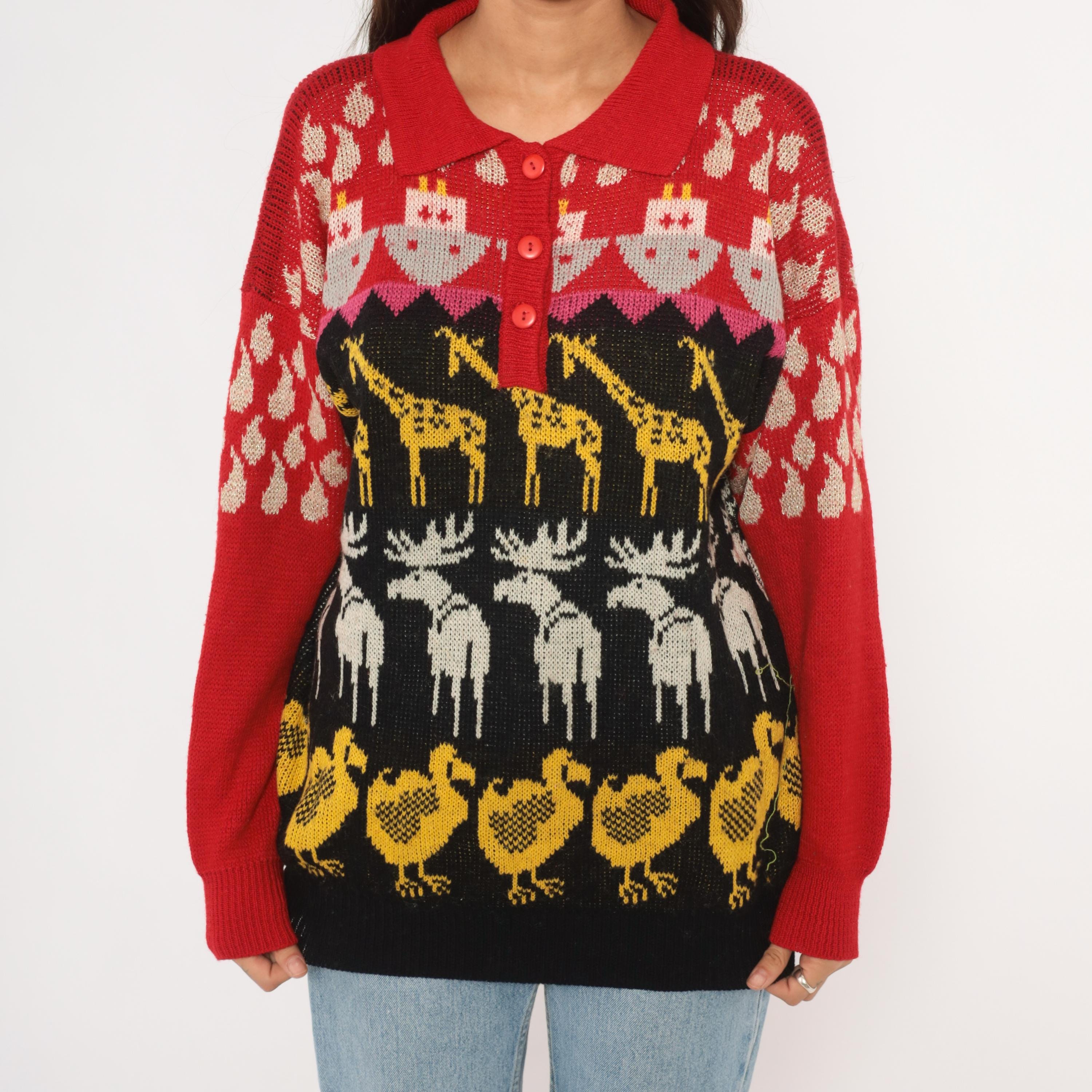 80s red and black knit pullover with a collared henley neckline and three red button closure. Intarsia animal motifs arranged in horizontal bands across the front and back, including yellow giraffes, white moose with antlers, yellow ducks, and crowned figures near the shoulders. Cream teardrop or leaf-shaped pattern scattered across the red upper chest and sleeves.