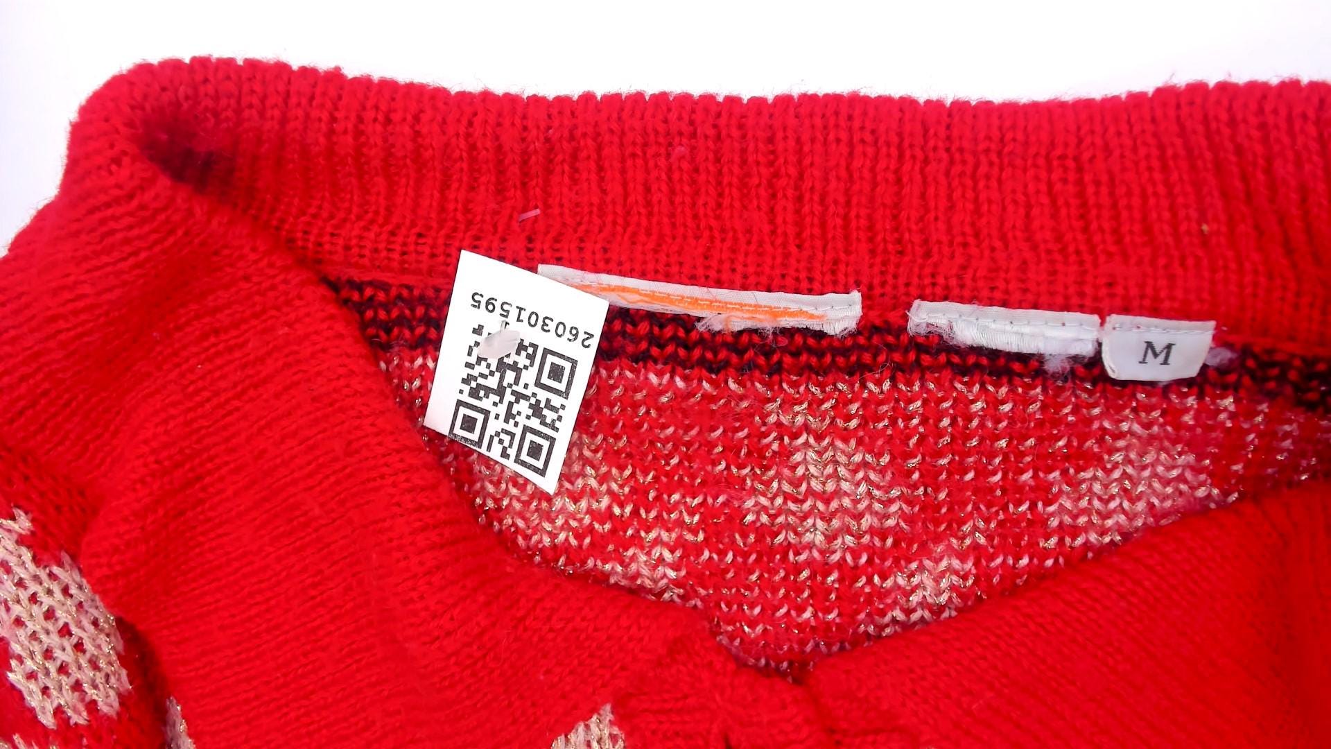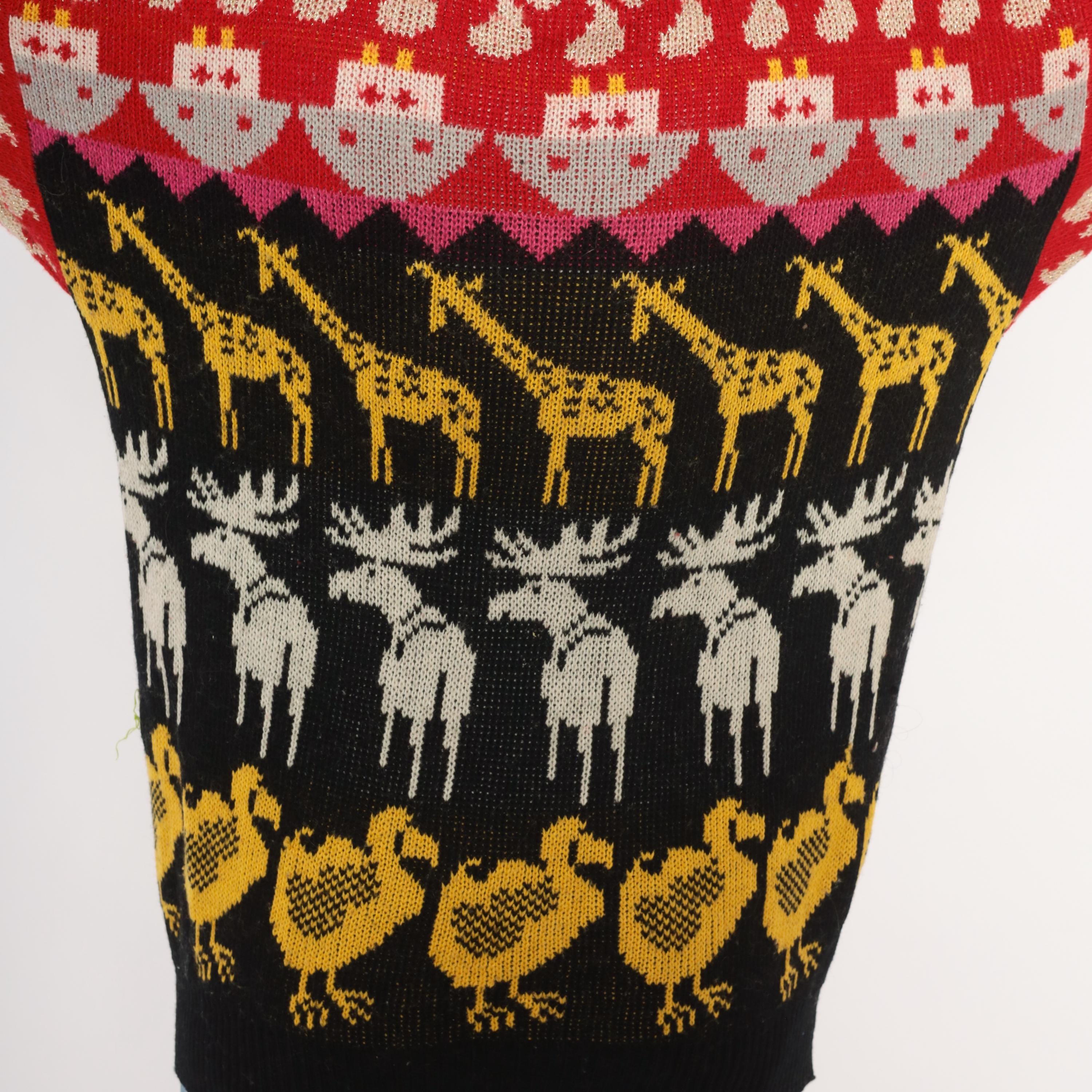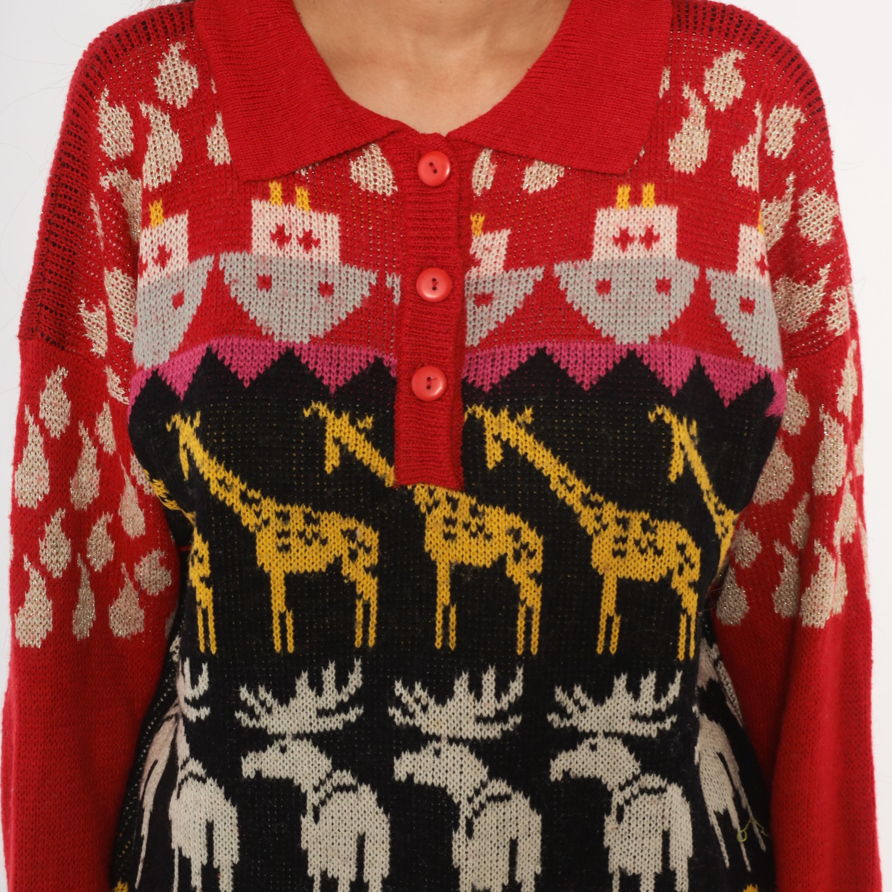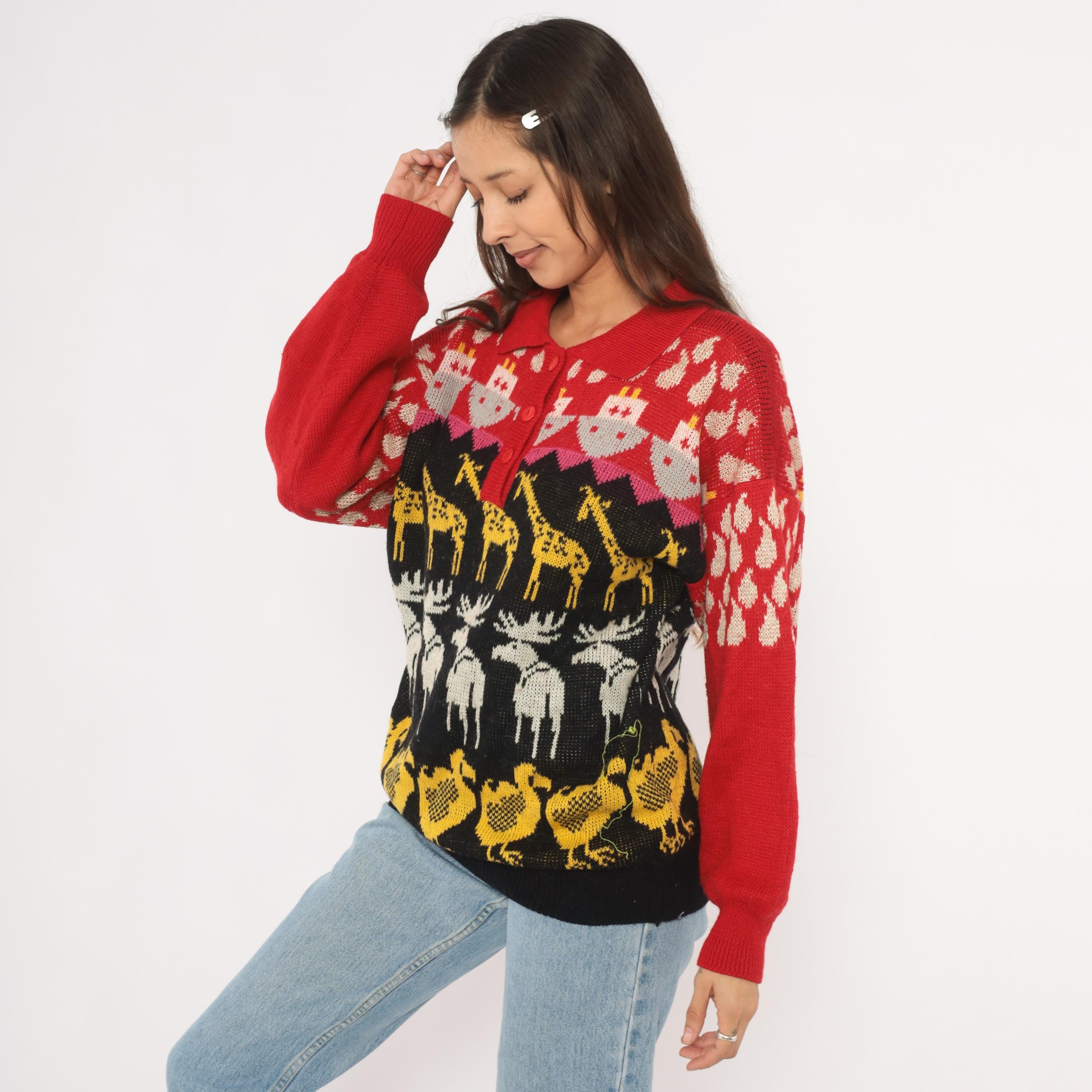 80s red and black knit pullover with a collared henley neckline and three red button closure. Intarsia animal motifs arranged in horizontal bands across the front and back, including yellow giraffes, white moose with antlers, yellow ducks, and crowned figures near the shoulders. Cream teardrop or leaf-shaped pattern scattered across the red upper chest and sleeves.