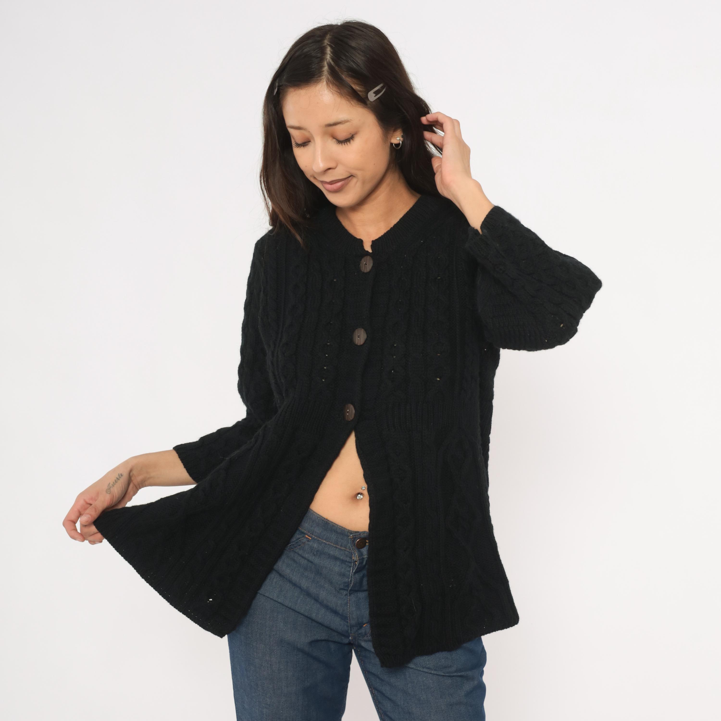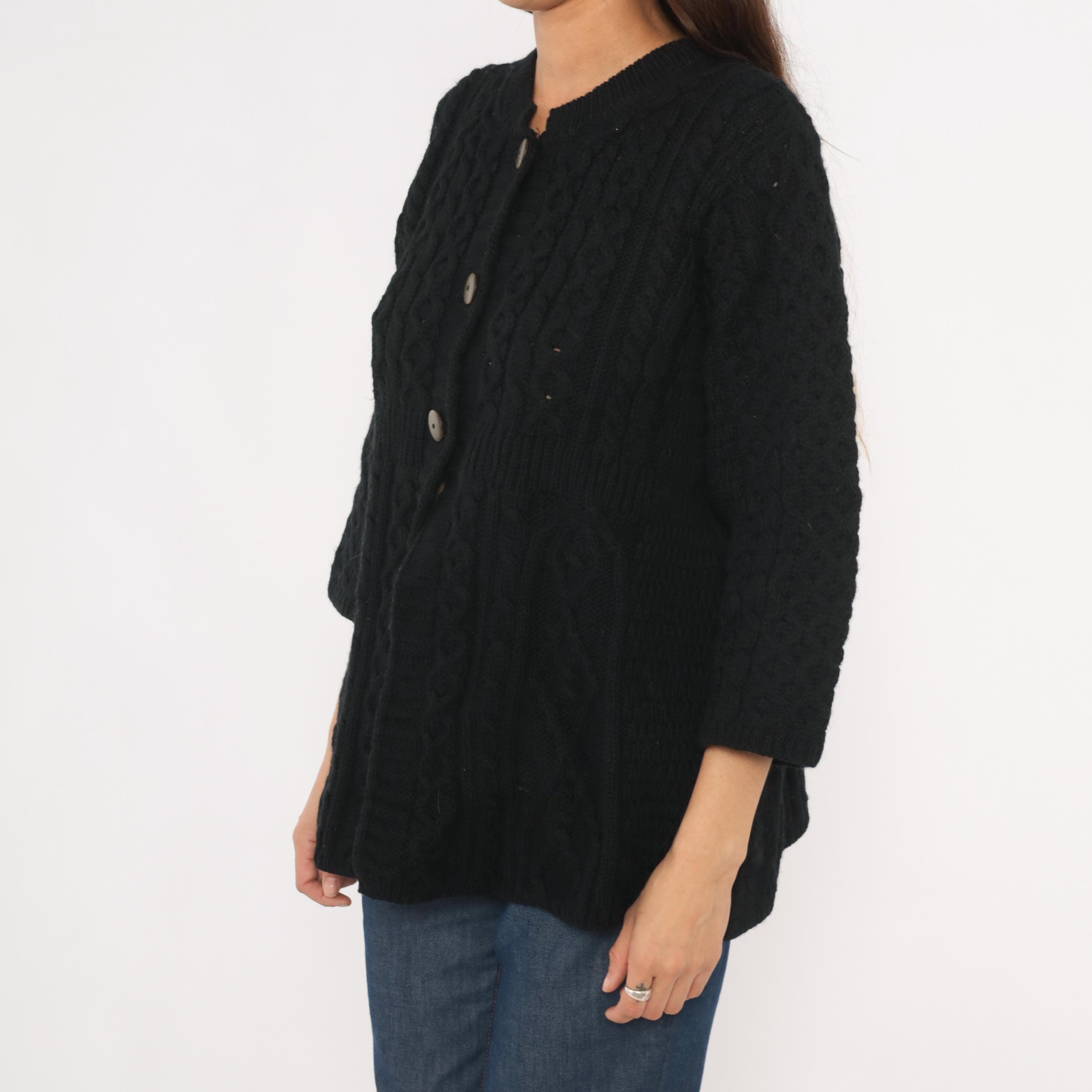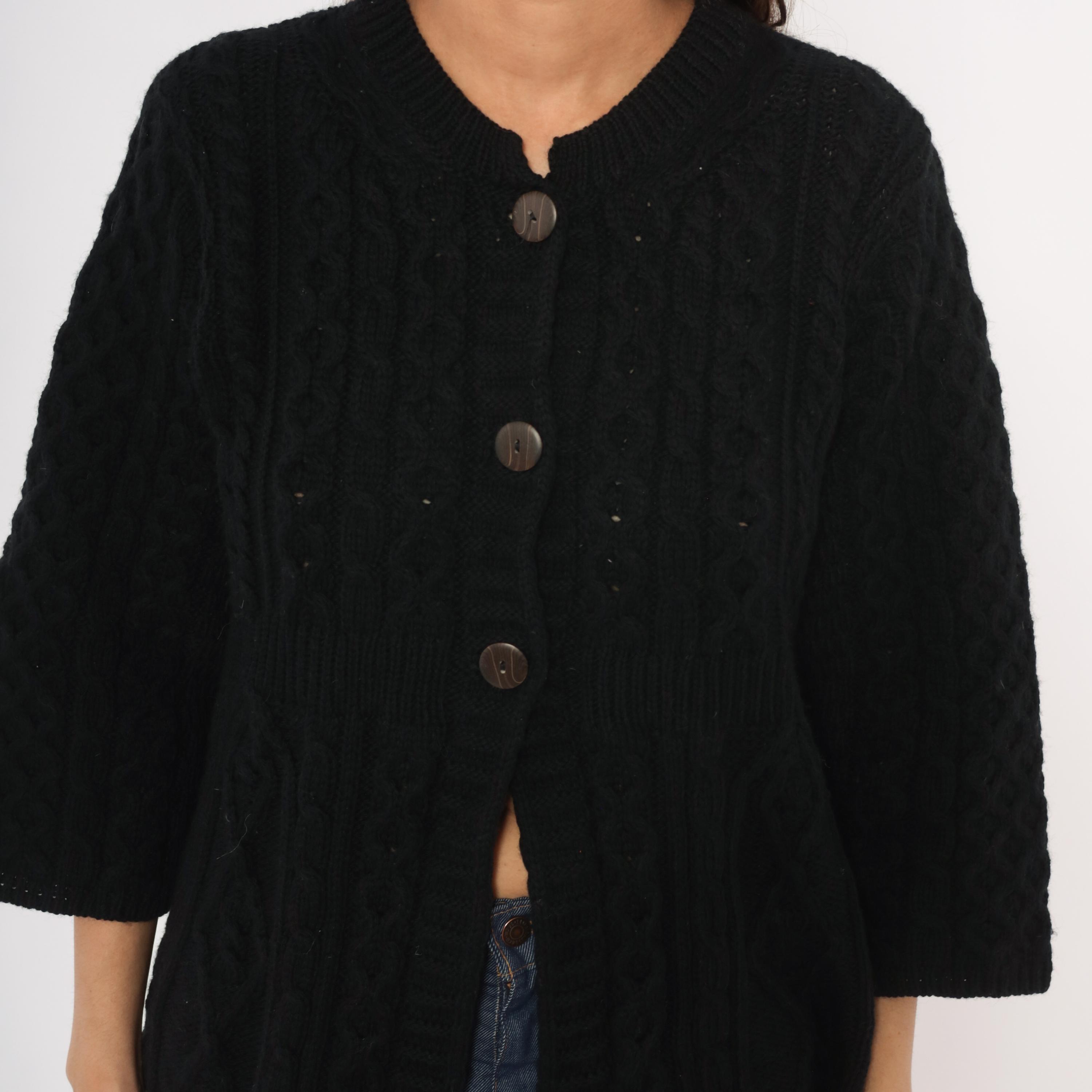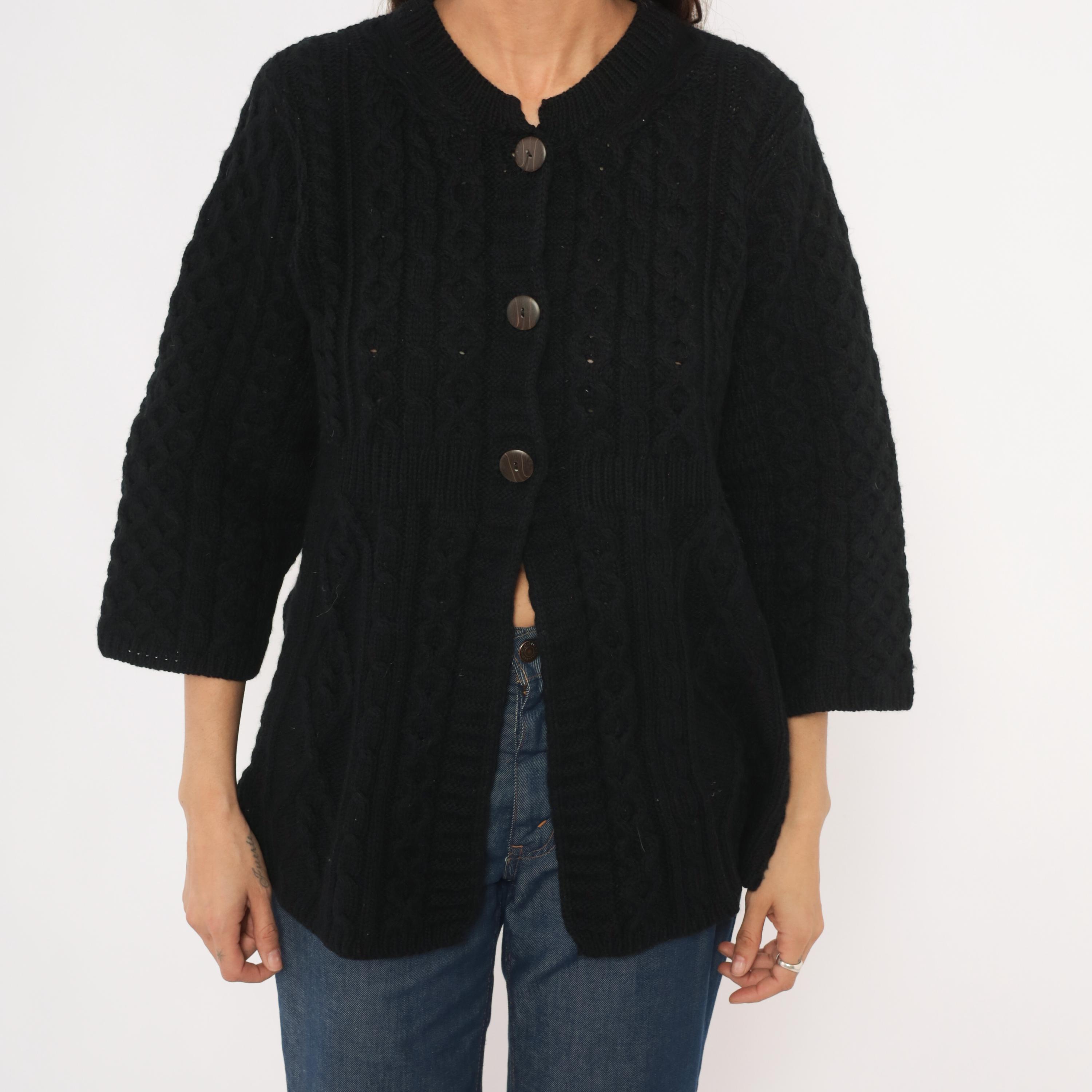 Black cable knit cardigan with an A-line swing silhouette and three quarter length sleeves. Crew neckline with ribbed band, three large round dark brown buttons at the upper front closure, and open drape below. Allover Aran-style cable and honeycomb stitch patterns across the body and sleeves, with a ribbed waistband seam at the empire line.