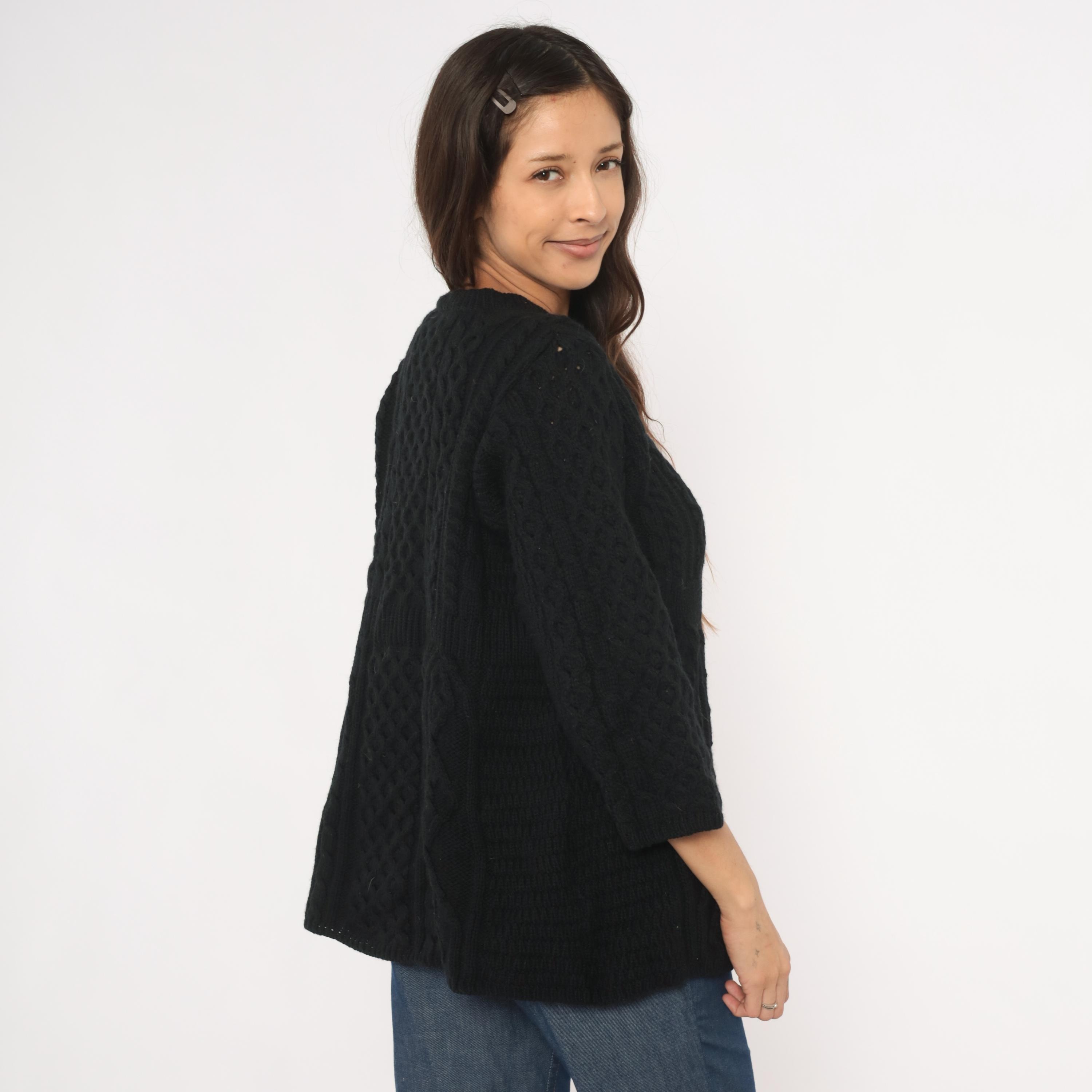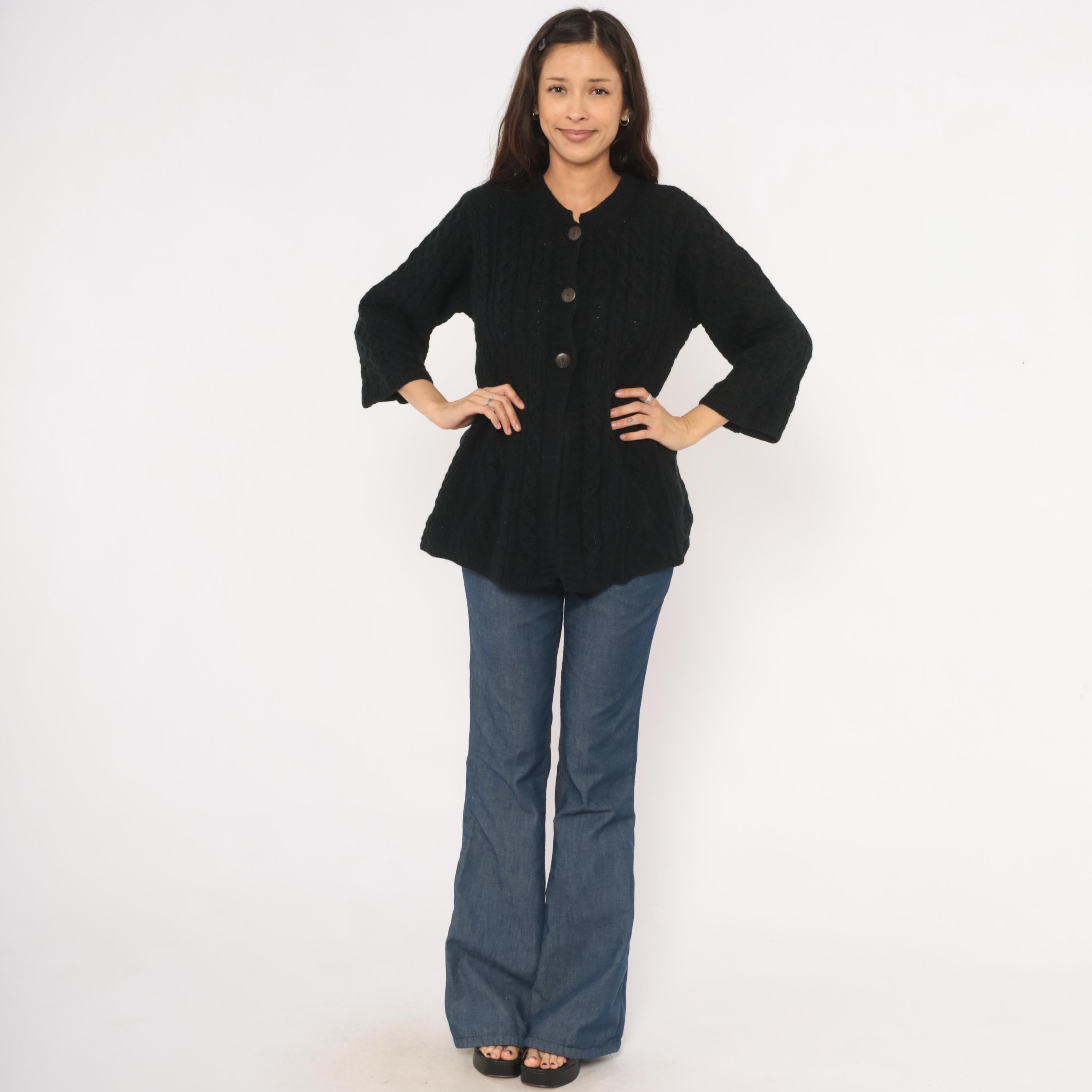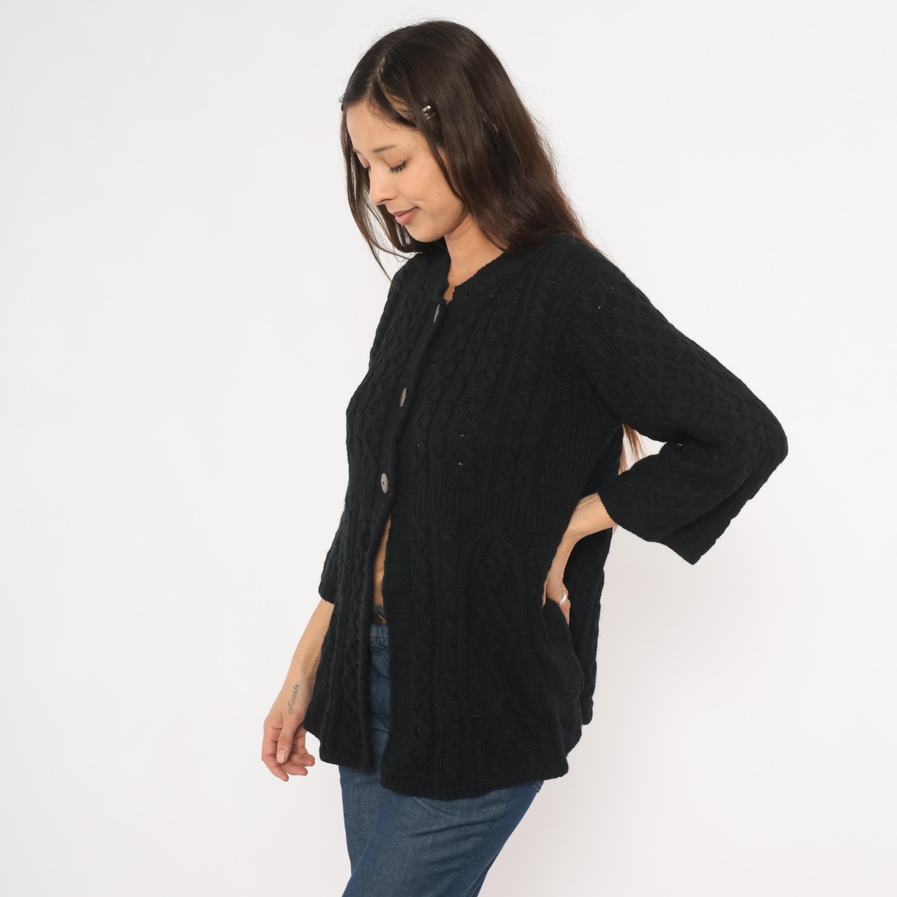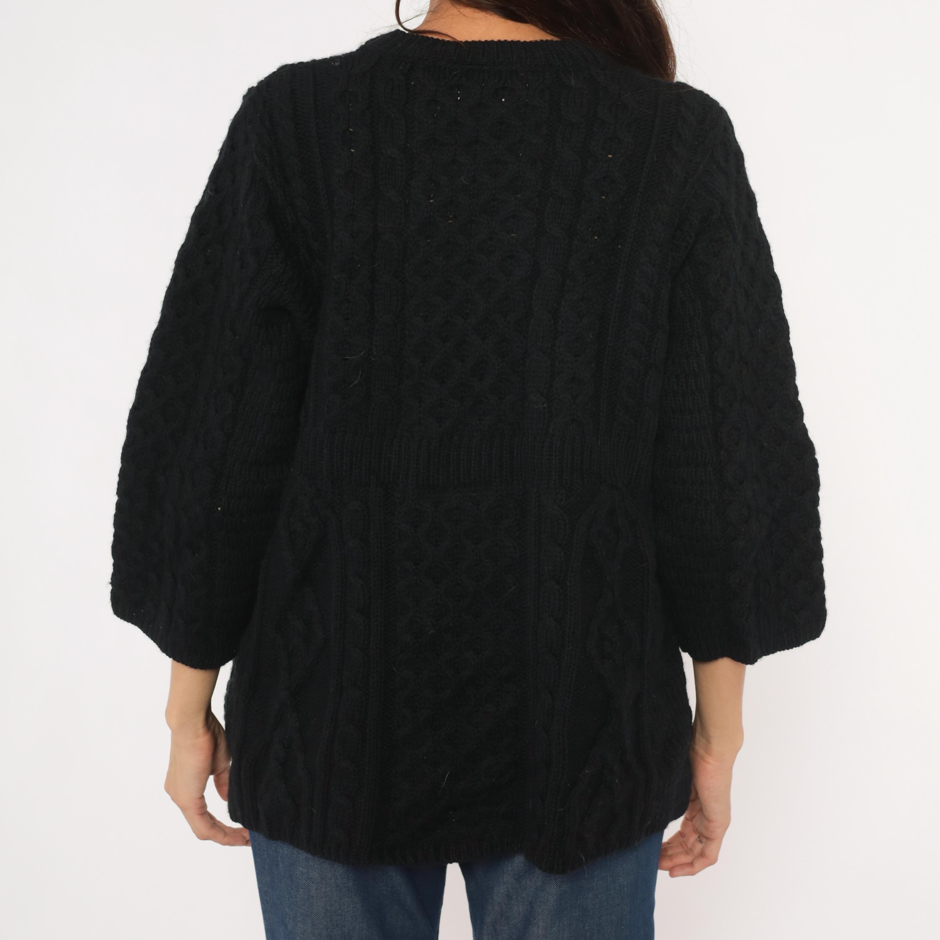 Black cable knit cardigan with an A-line swing silhouette and three quarter length sleeves. Crew neckline with ribbed band, three large round dark brown buttons at the upper front closure, and open drape below. Allover Aran-style cable and honeycomb stitch patterns across the body and sleeves, with a ribbed waistband seam at the empire line.