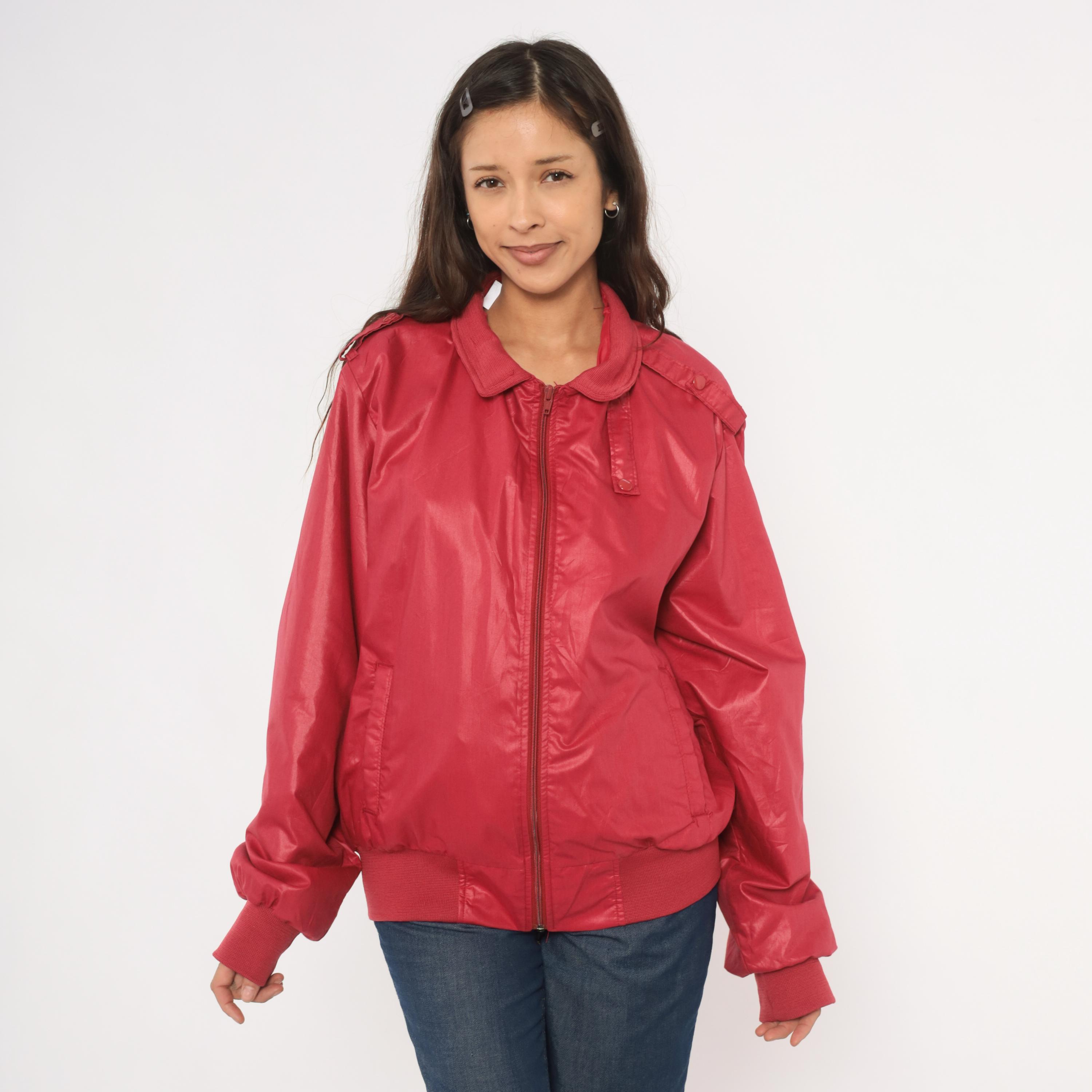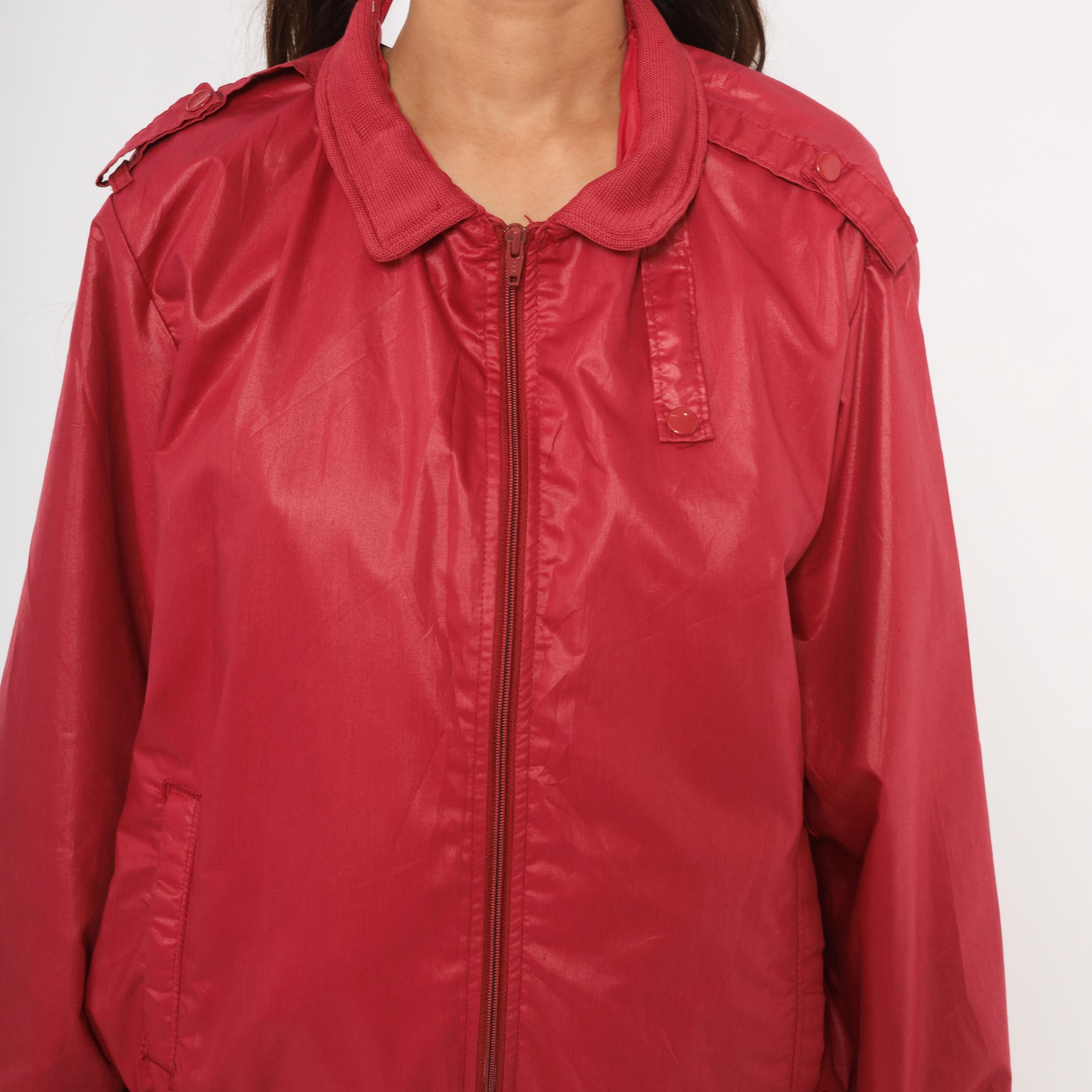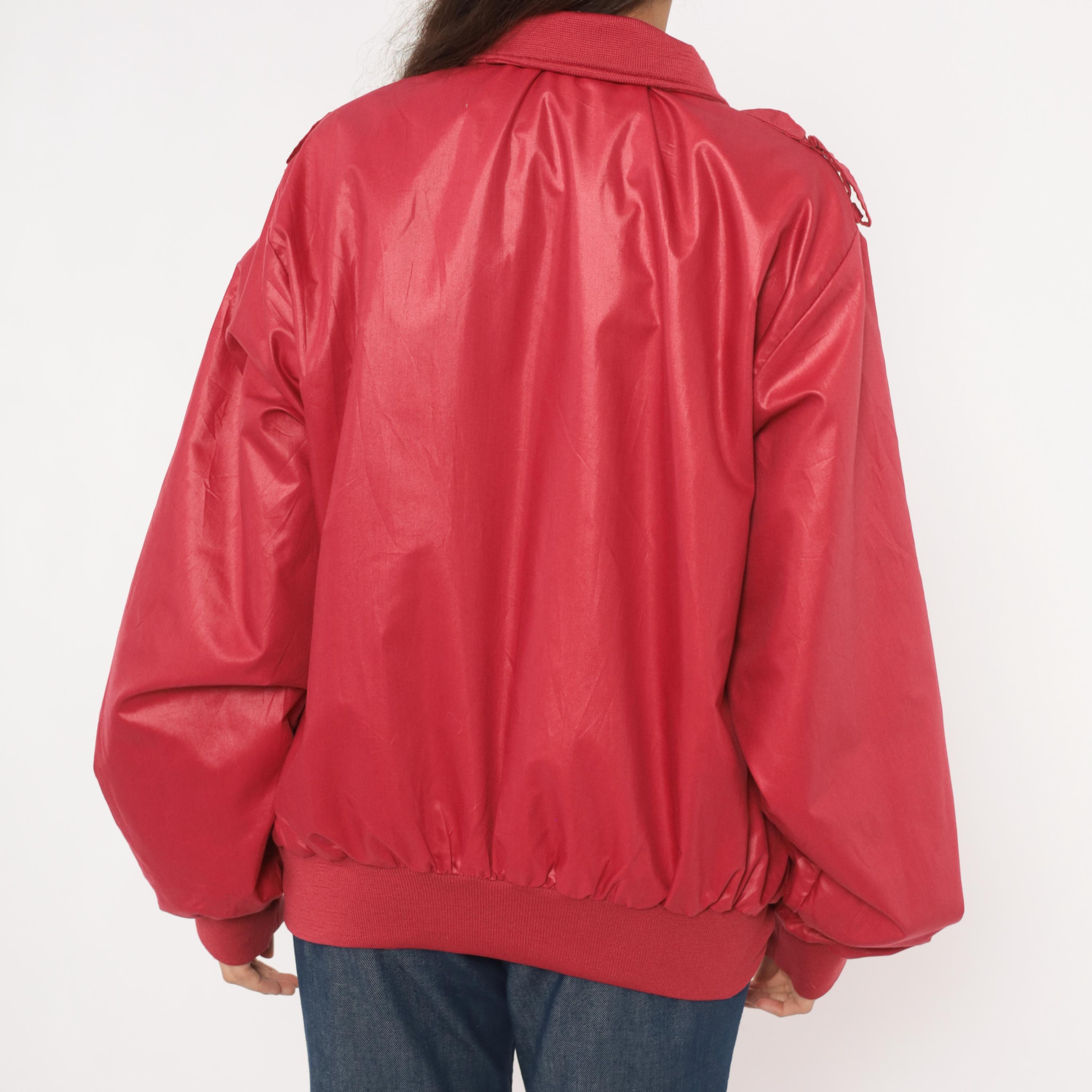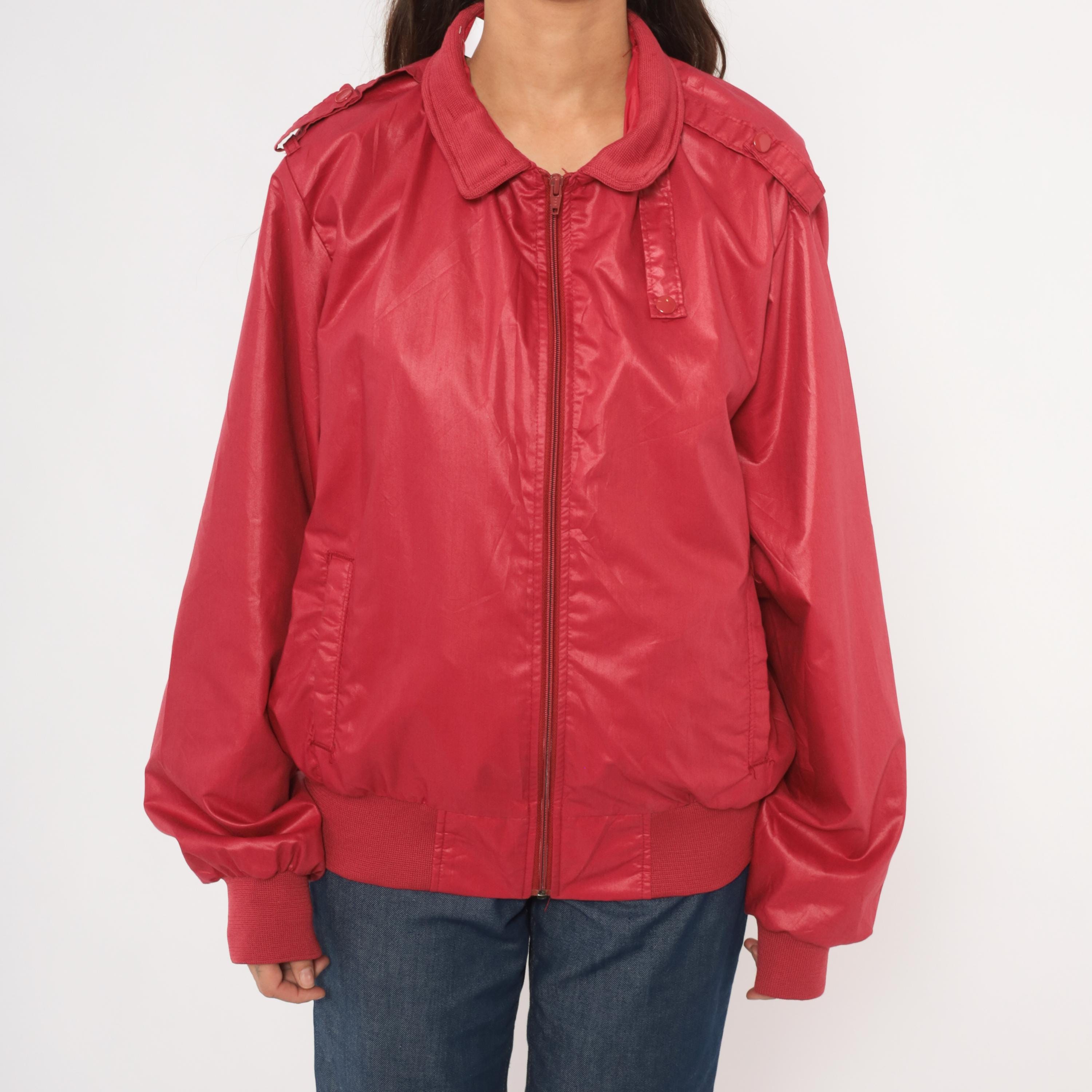 80s raspberry red bomber jacket with full zip front closure and snap-secured storm flap over the zipper. Fold-down ribbed knit collar, epaulette shoulder tabs with button closures on both sides, and slanted welt pockets at the hip.