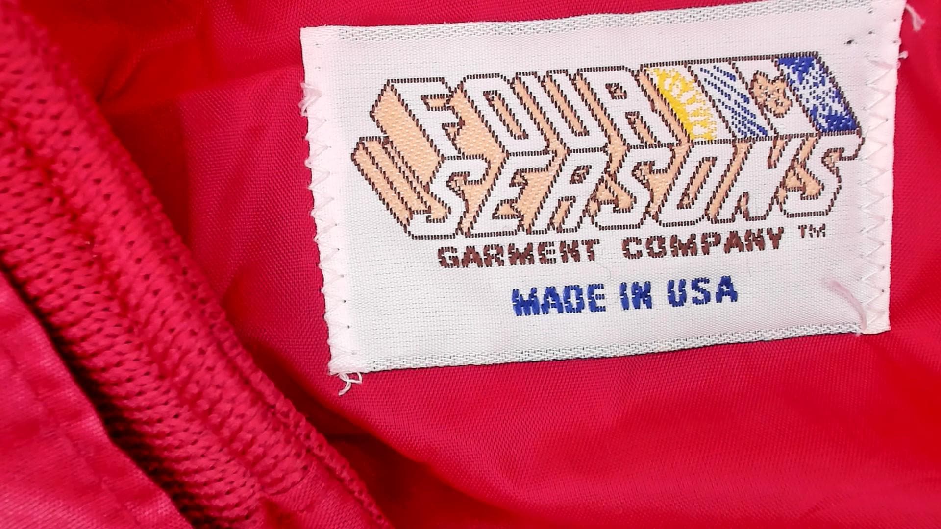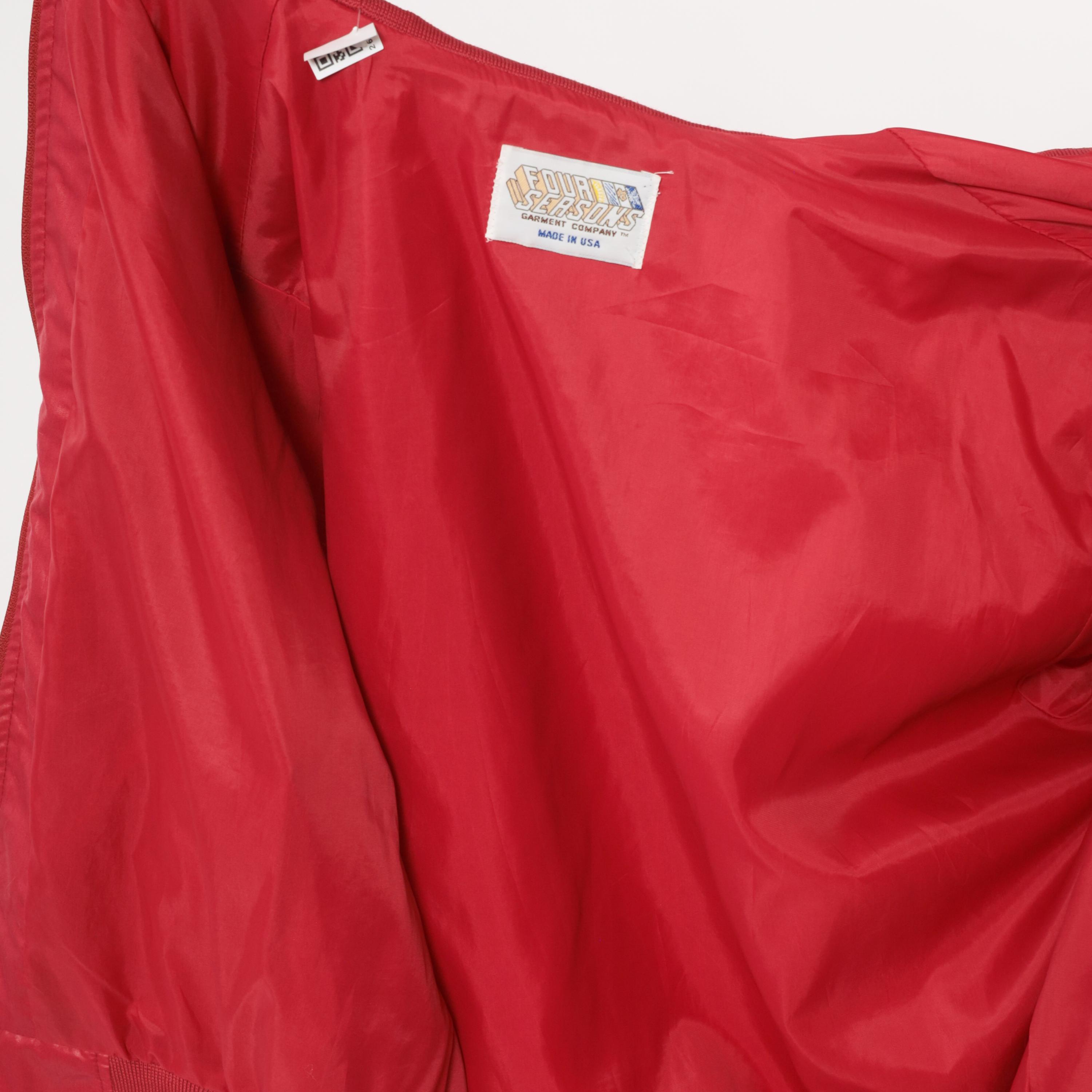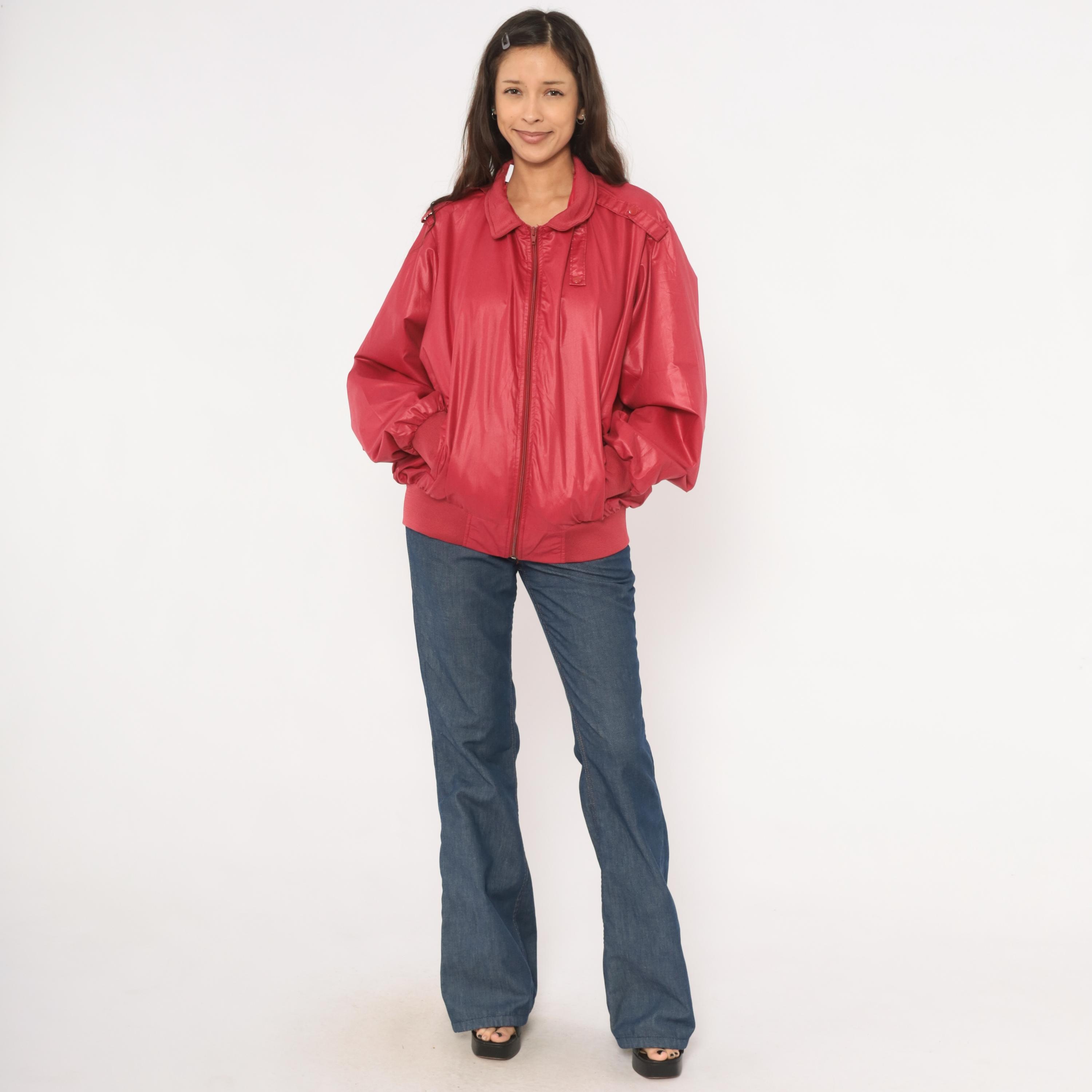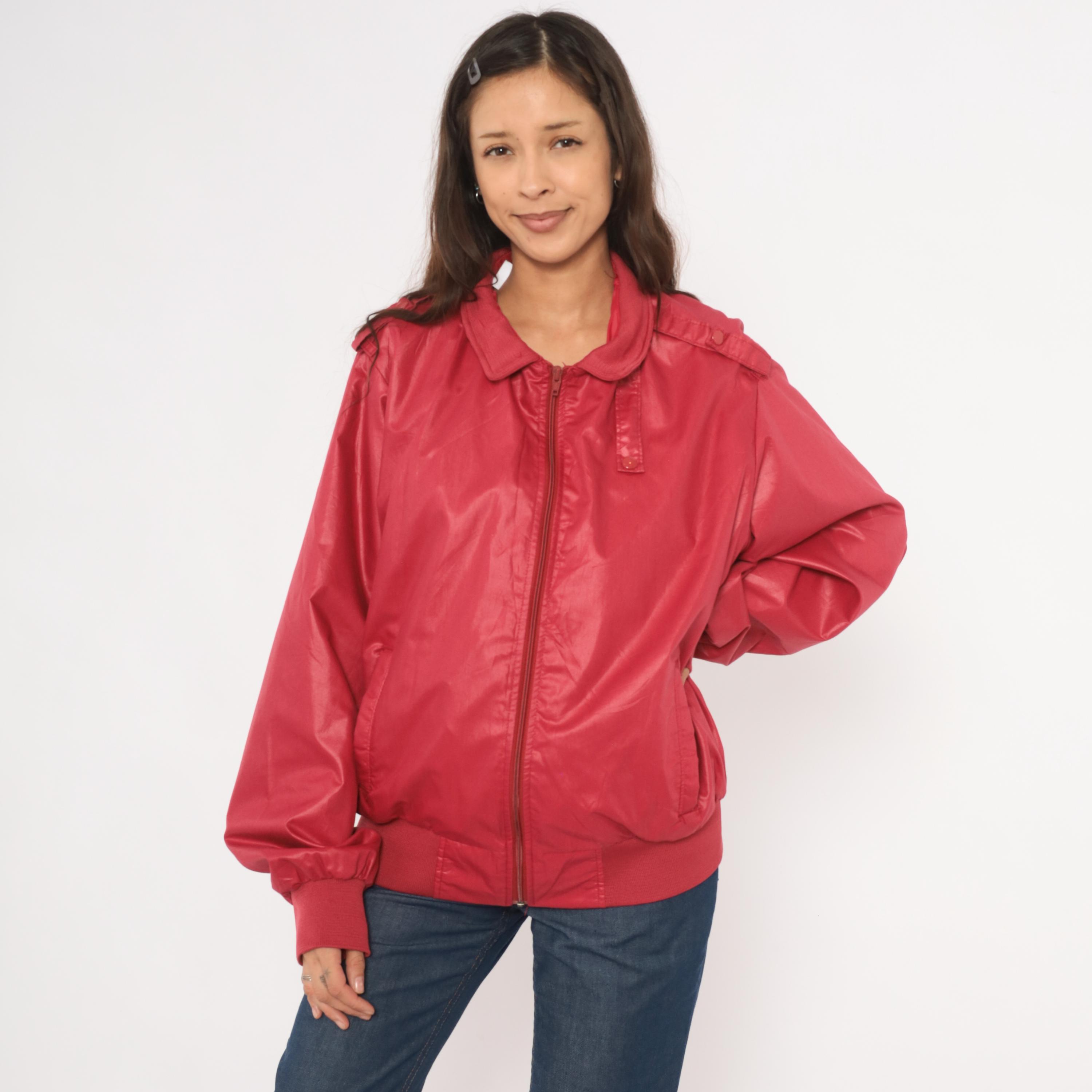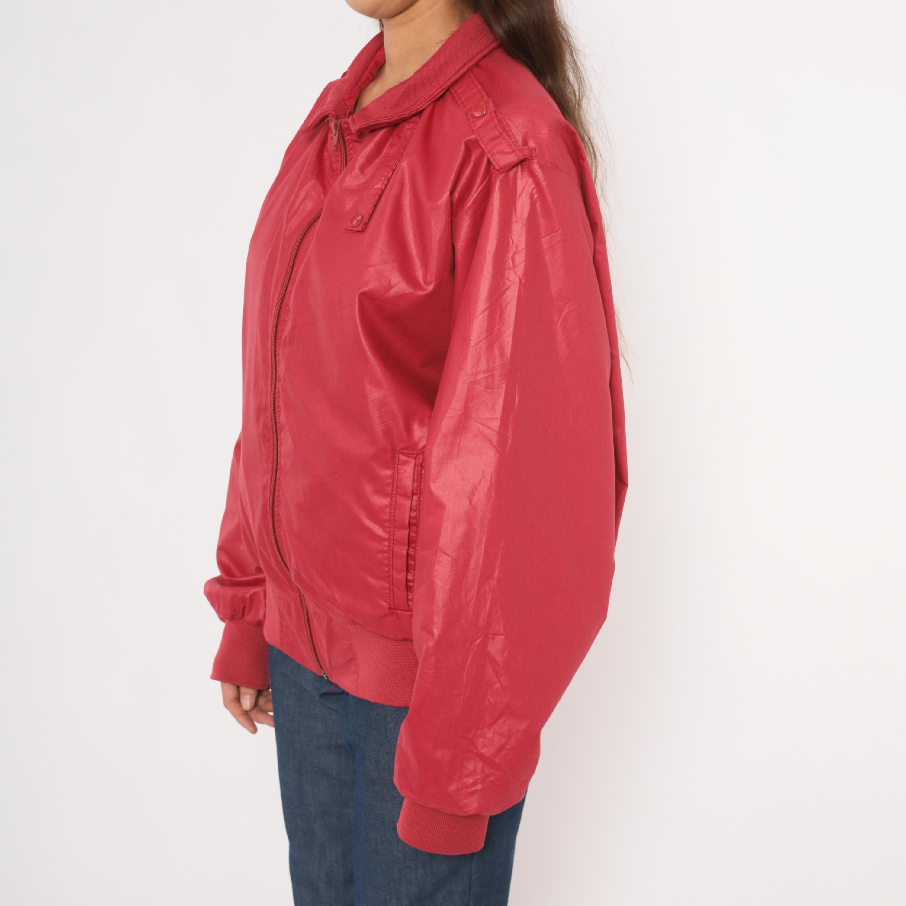 80s raspberry red bomber jacket with full zip front closure and snap-secured storm flap over the zipper. Fold-down ribbed knit collar, epaulette shoulder tabs with button closures on both sides, and slanted welt pockets at the hip.