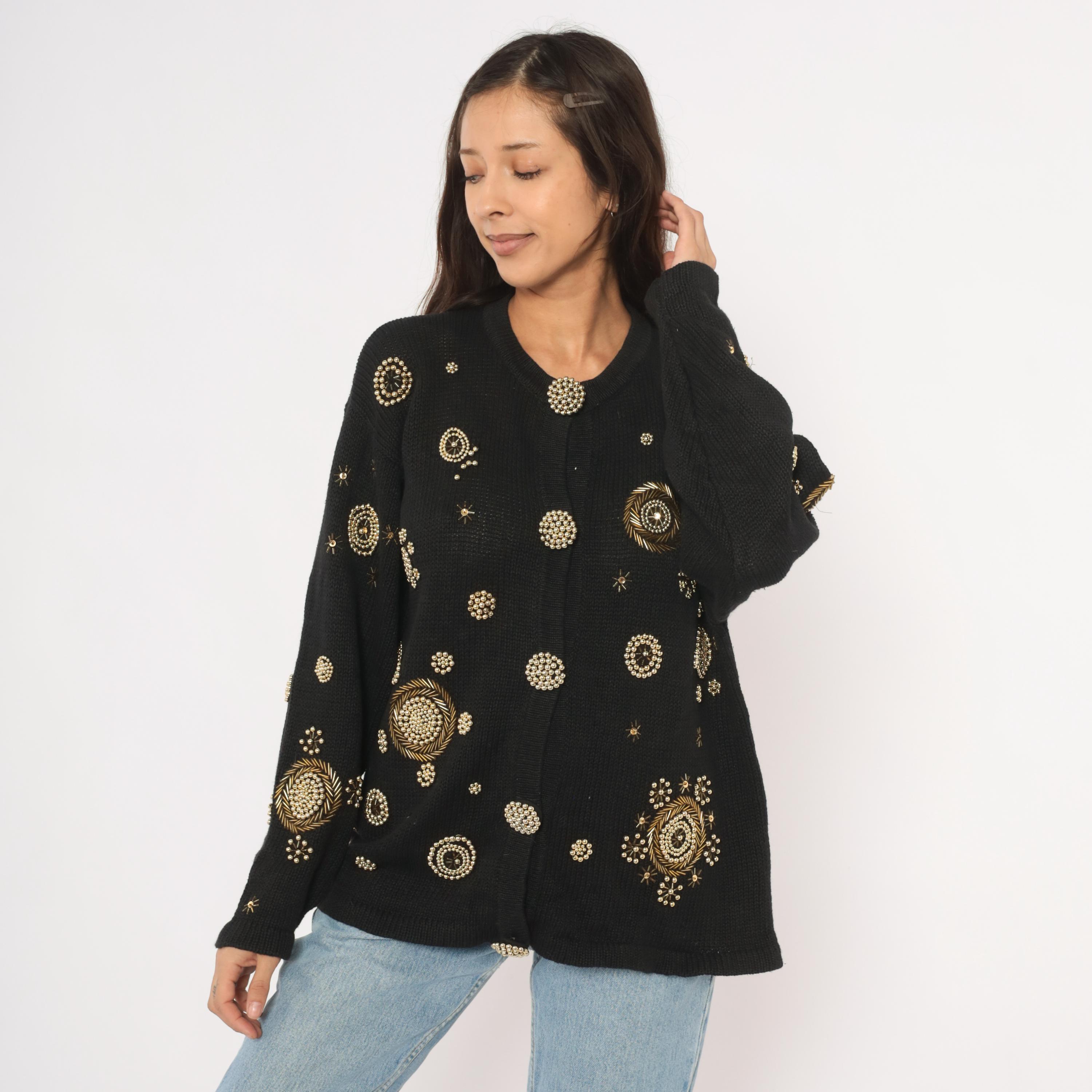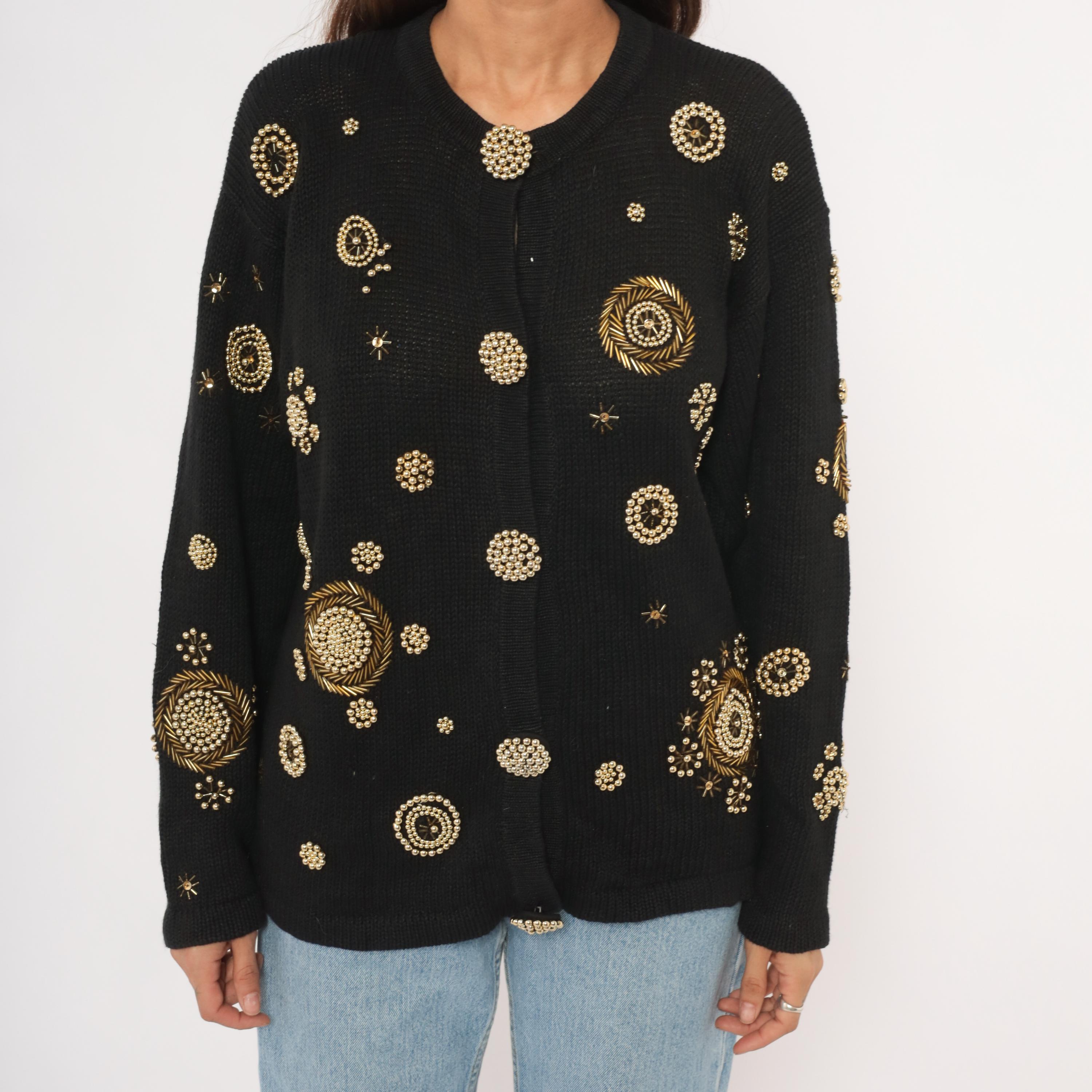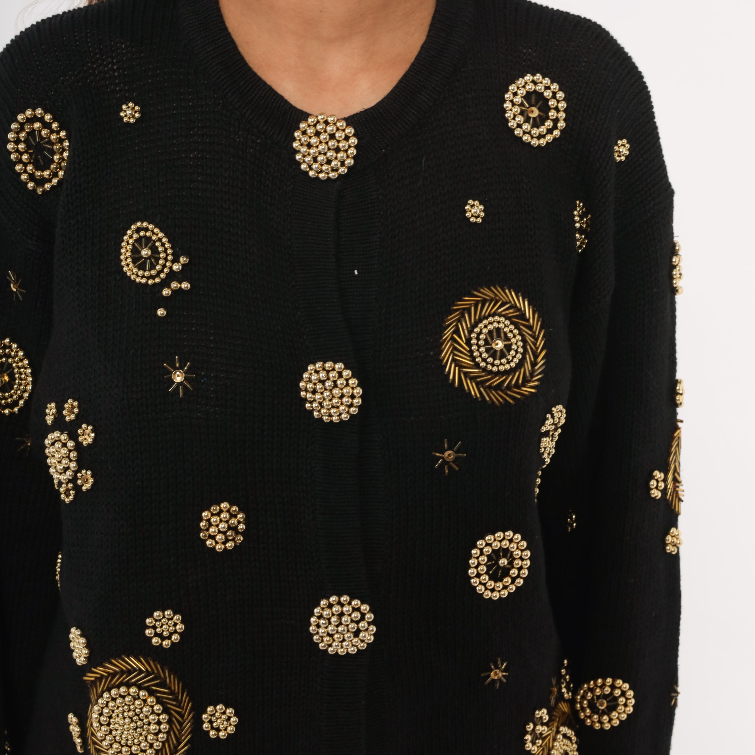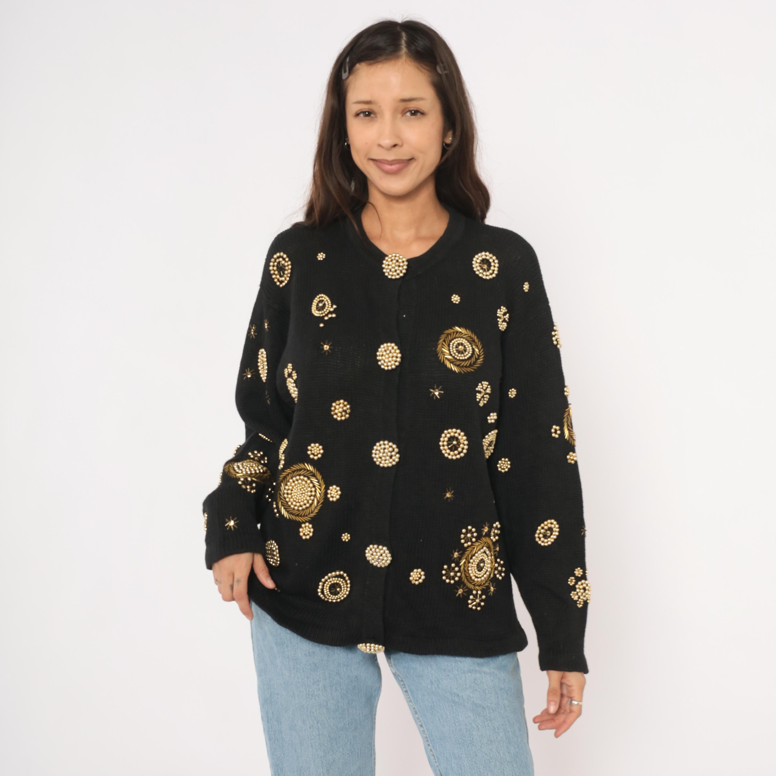 80s black knit cardigan covered in gold-toned beaded medallion embellishments across the front and sleeves, with scattered starburst and circular pearl-cluster motifs in varying sizes. Button front closure with a round neckline, long sleeves, and ribbed cuffs and hem.