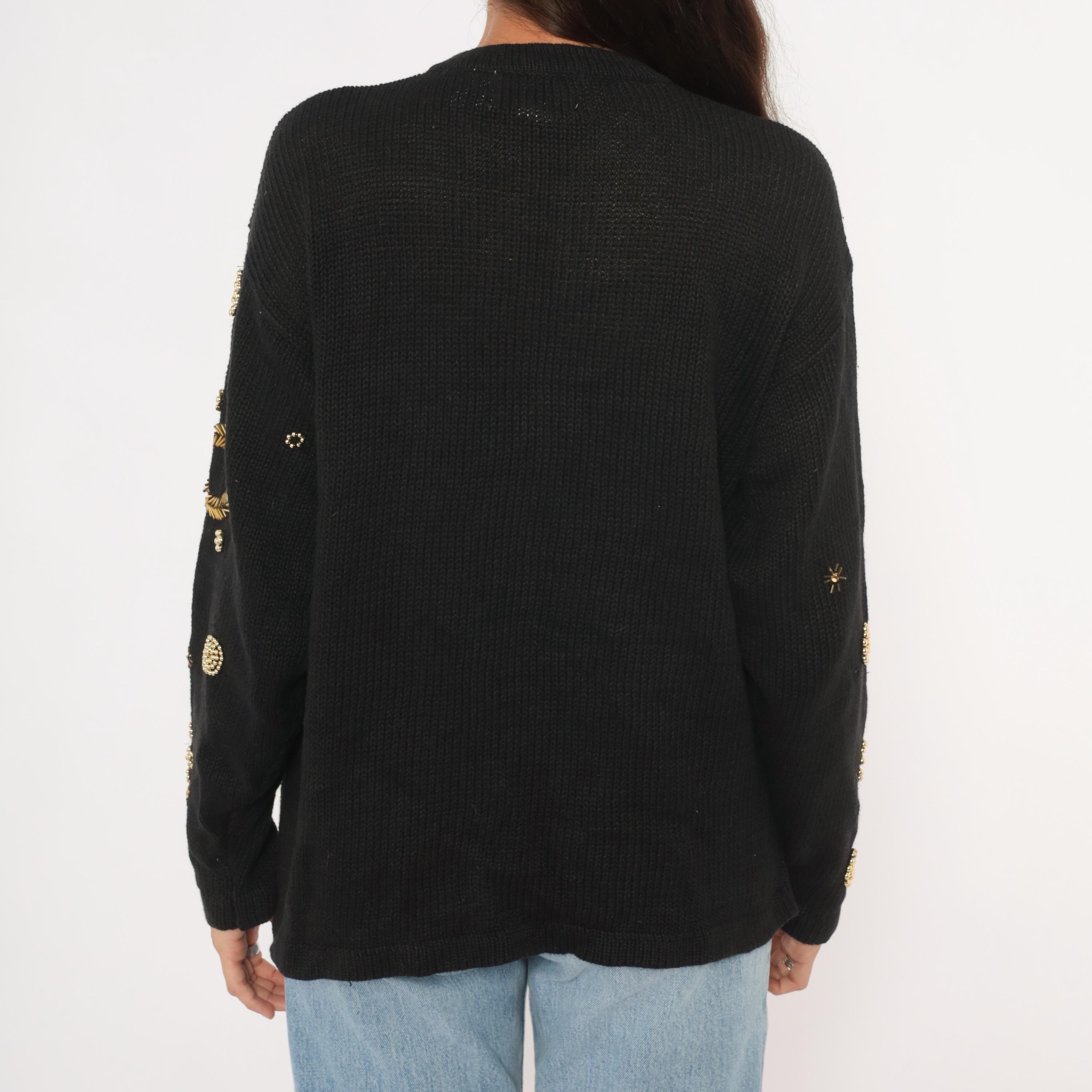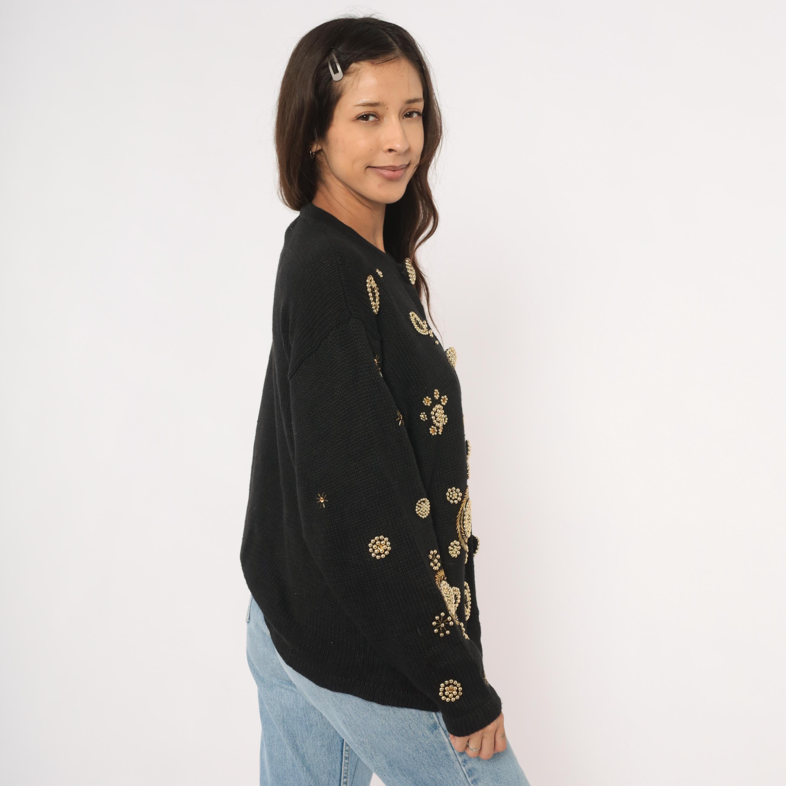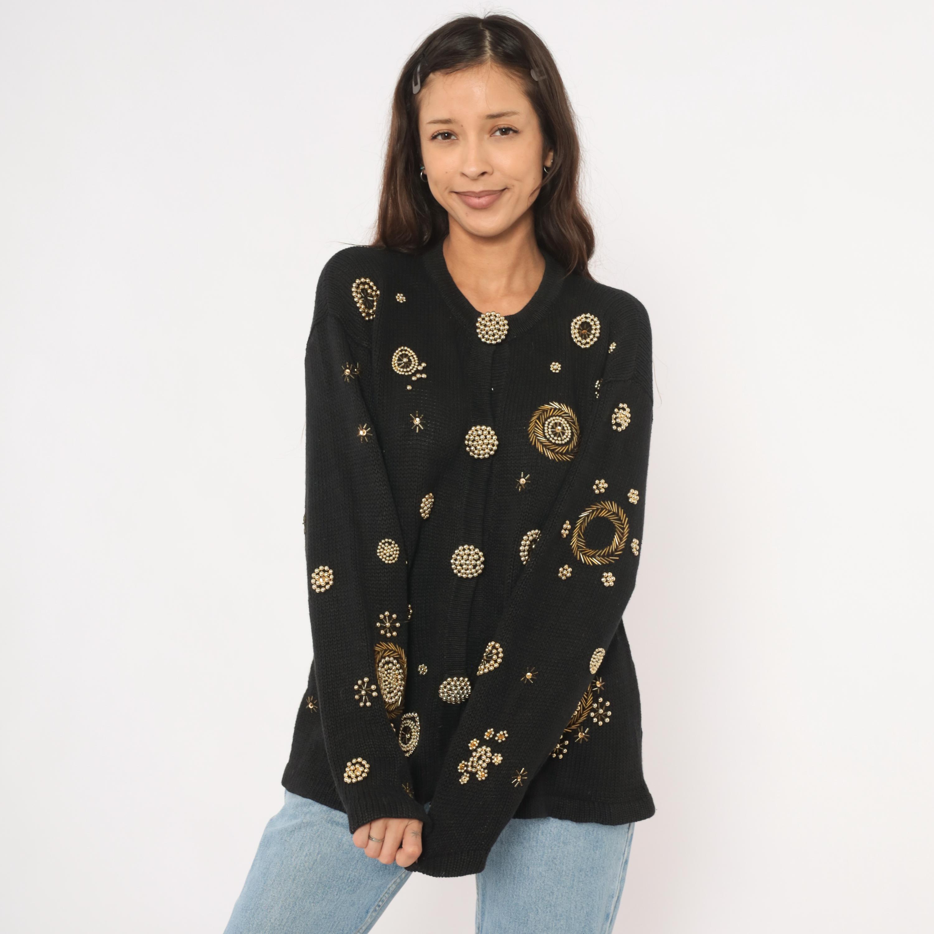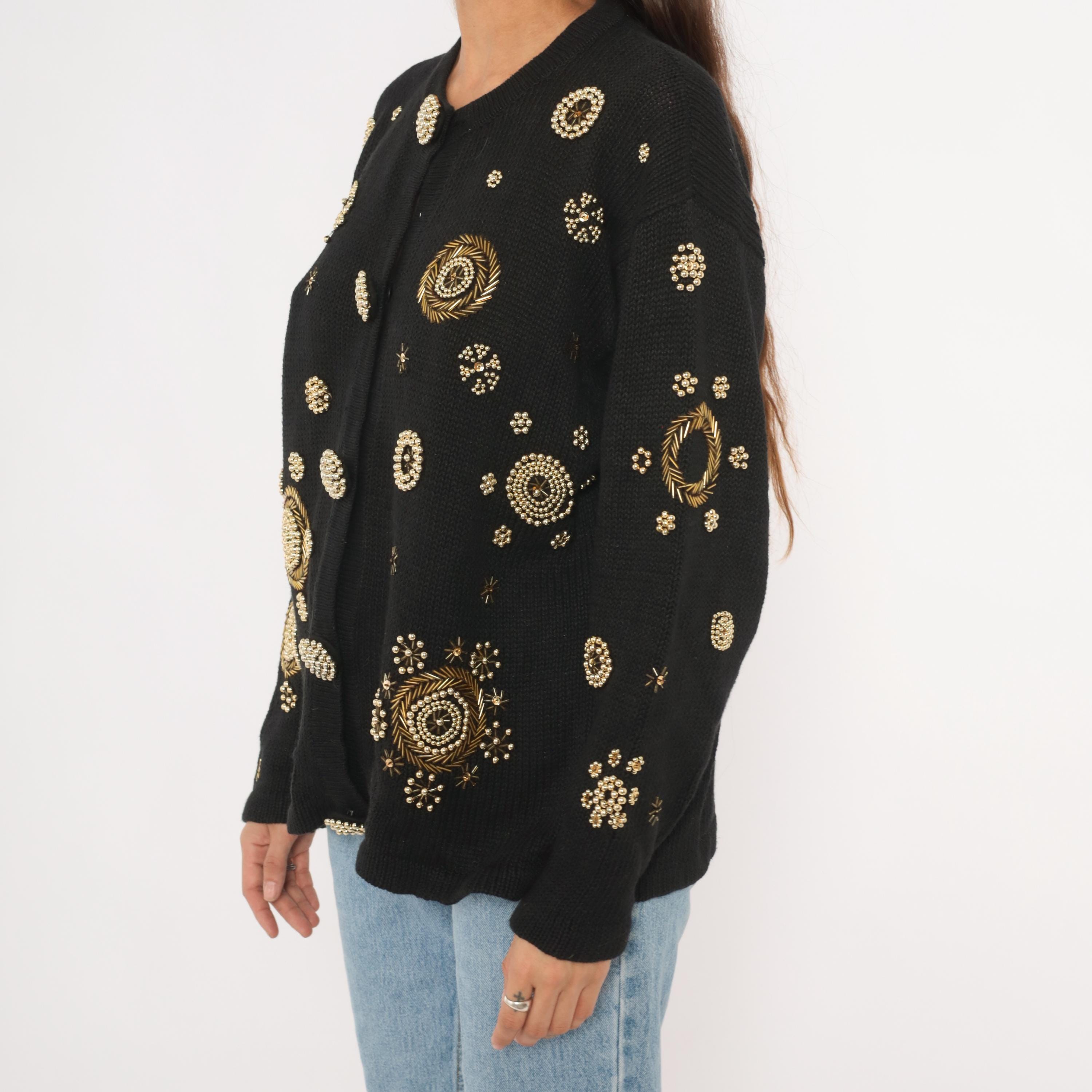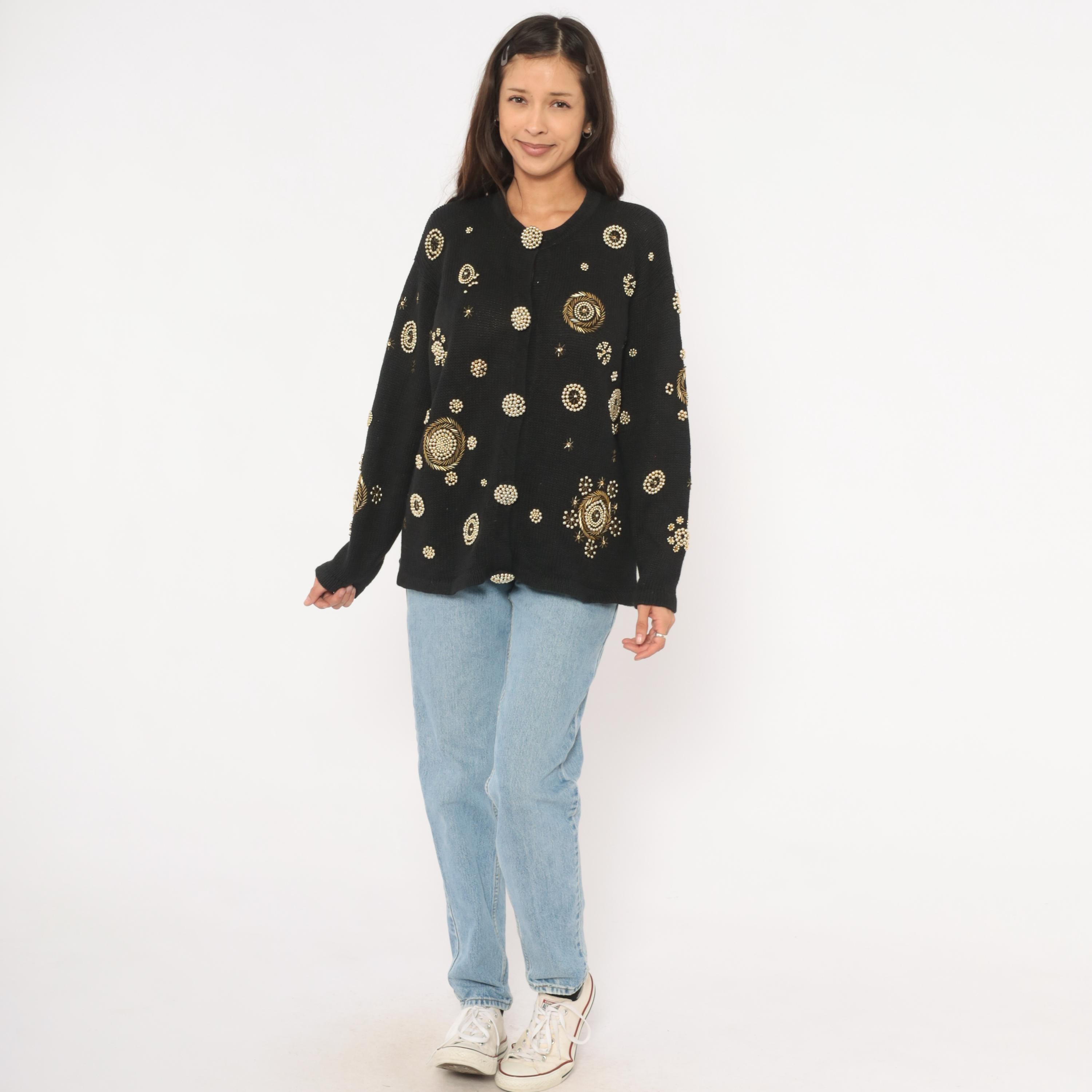 80s black knit cardigan covered in gold-toned beaded medallion embellishments across the front and sleeves, with scattered starburst and circular pearl-cluster motifs in varying sizes. Button front closure with a round neckline, long sleeves, and ribbed cuffs and hem.