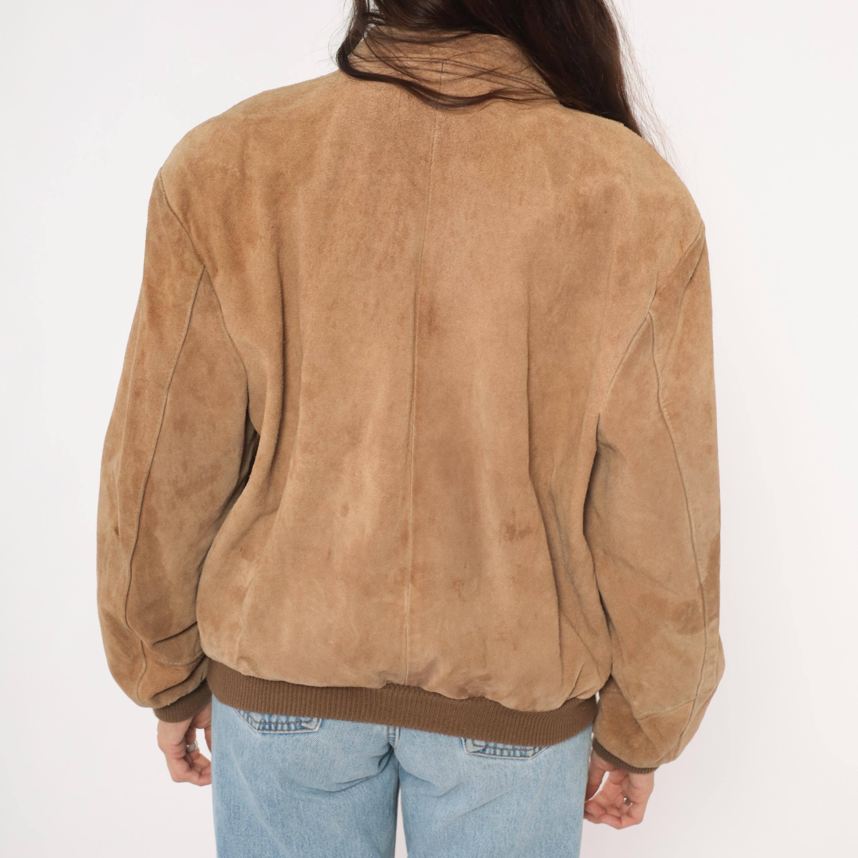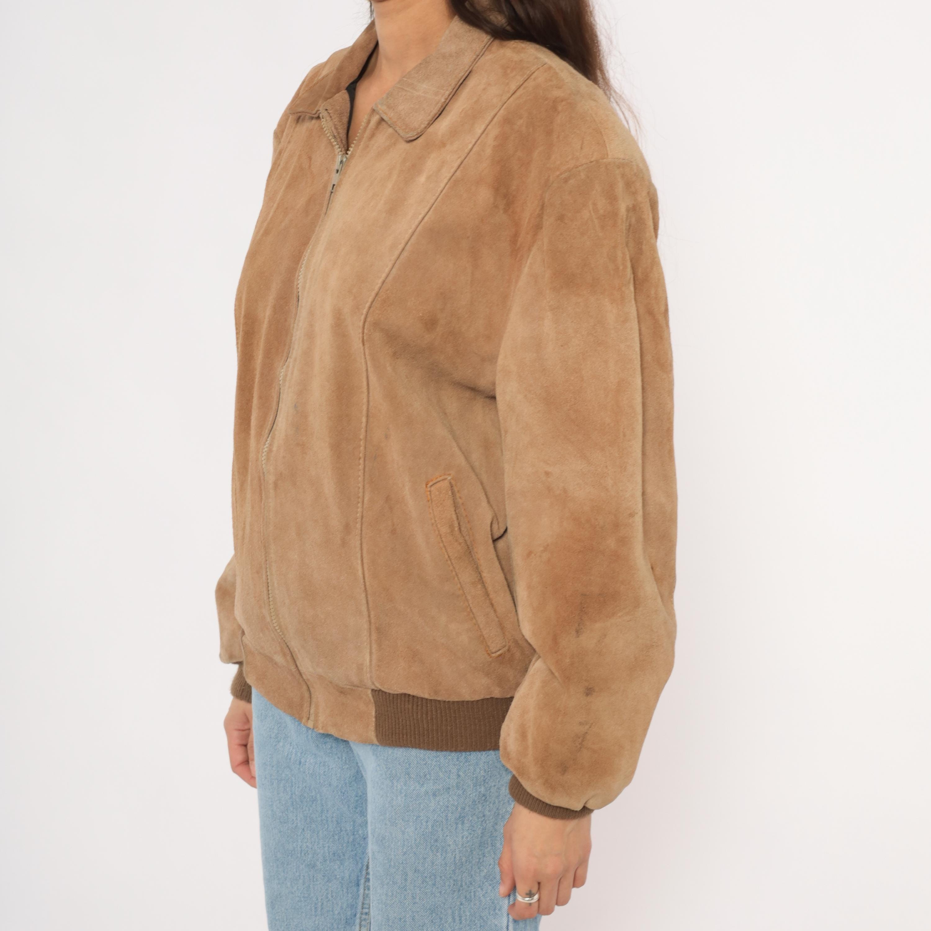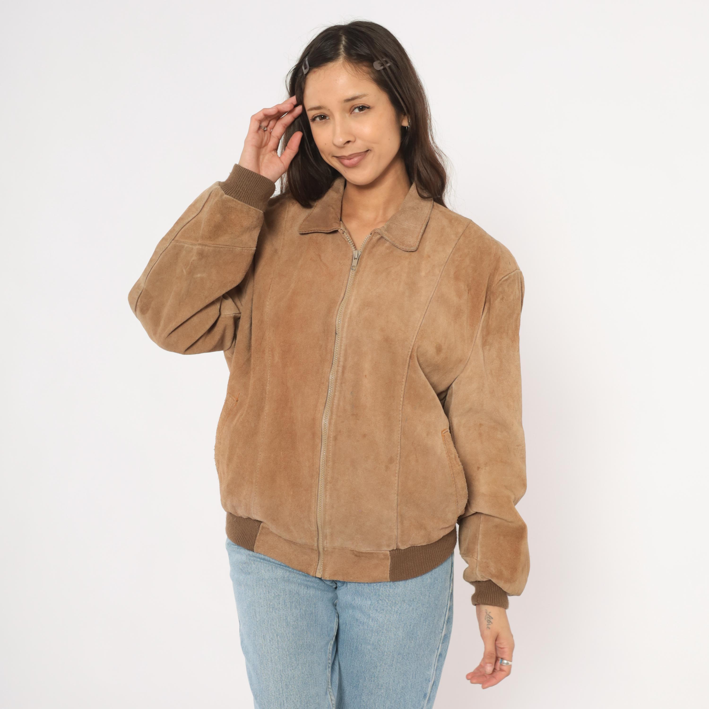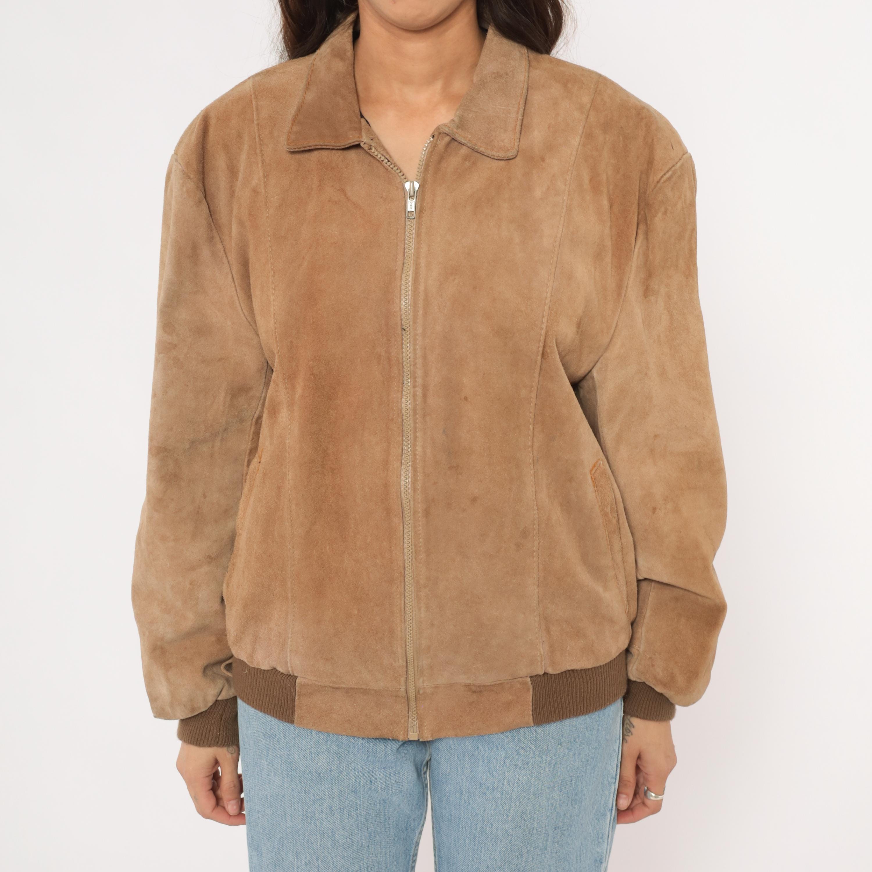 90s tan suede bomber jacket with a pointed collar, full zip front closure, and slanted welt pockets at the hip. Ribbed knit cuffs and waistband in a darker brown tone. Paneled construction with seaming across the shoulders, chest, and back center seam.
