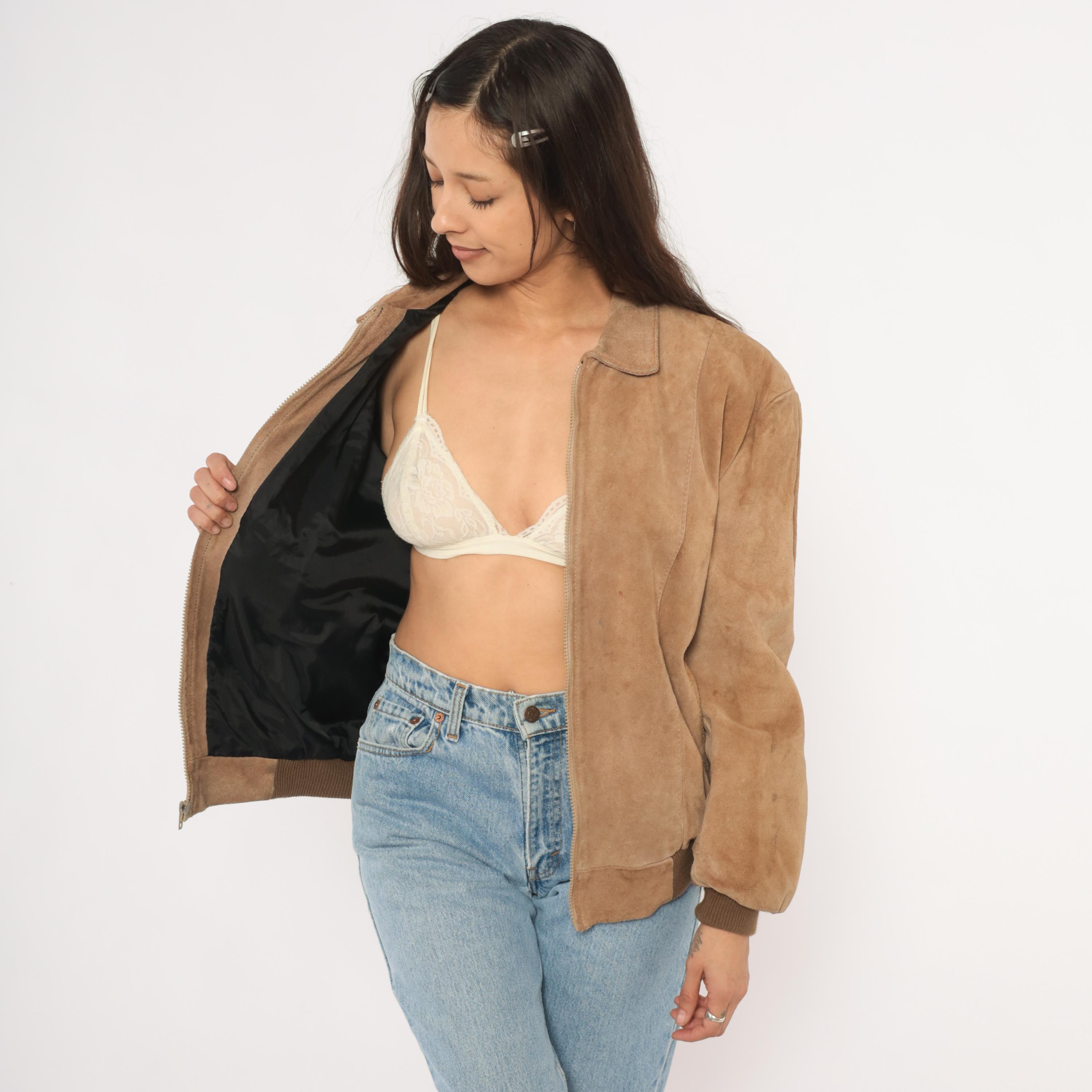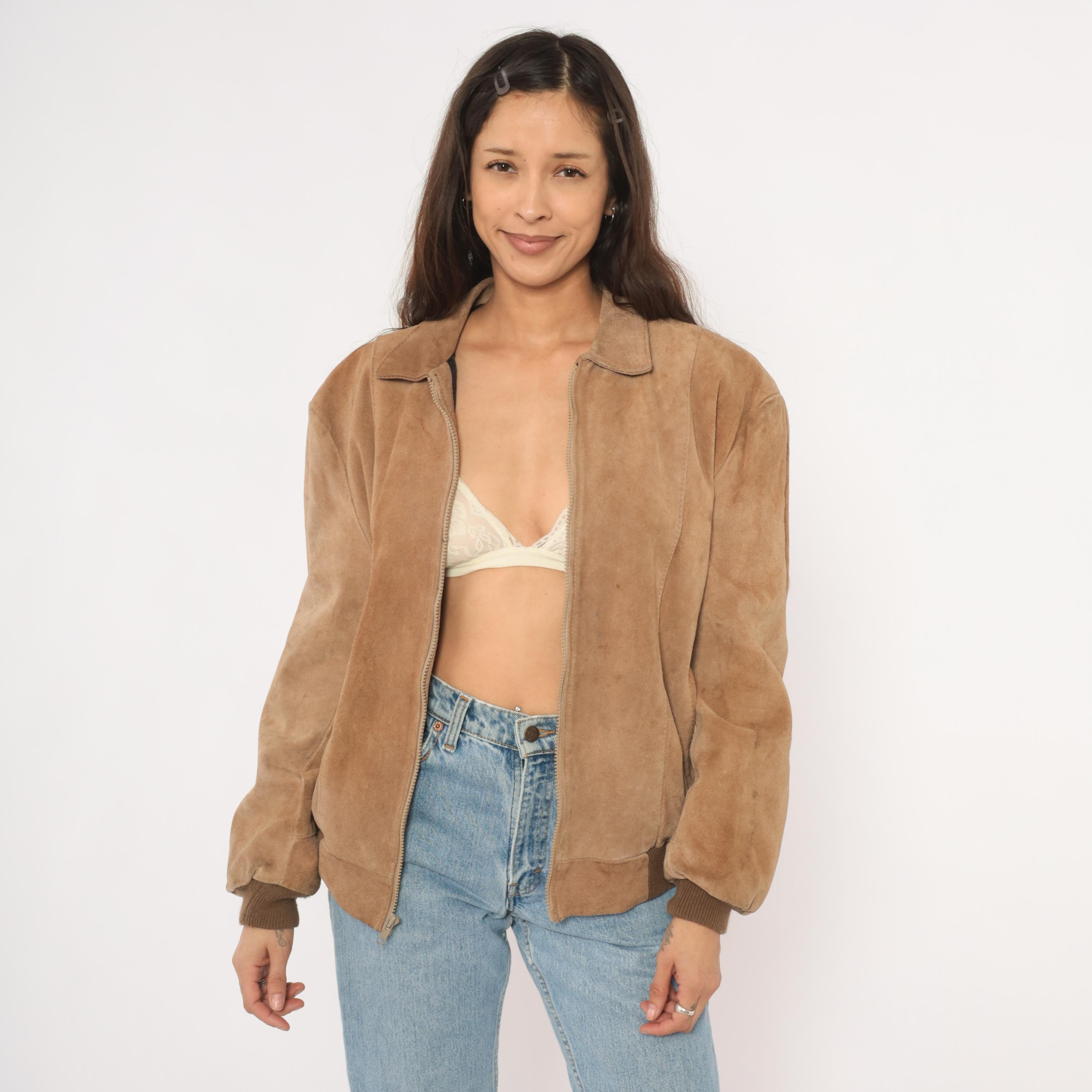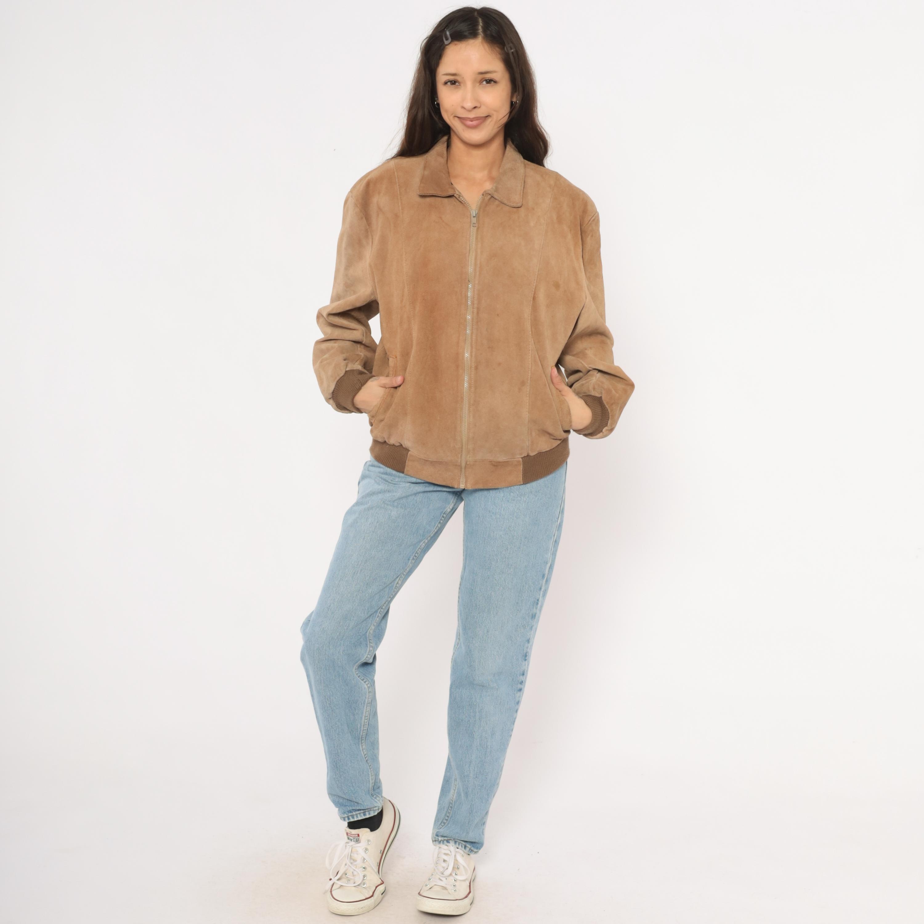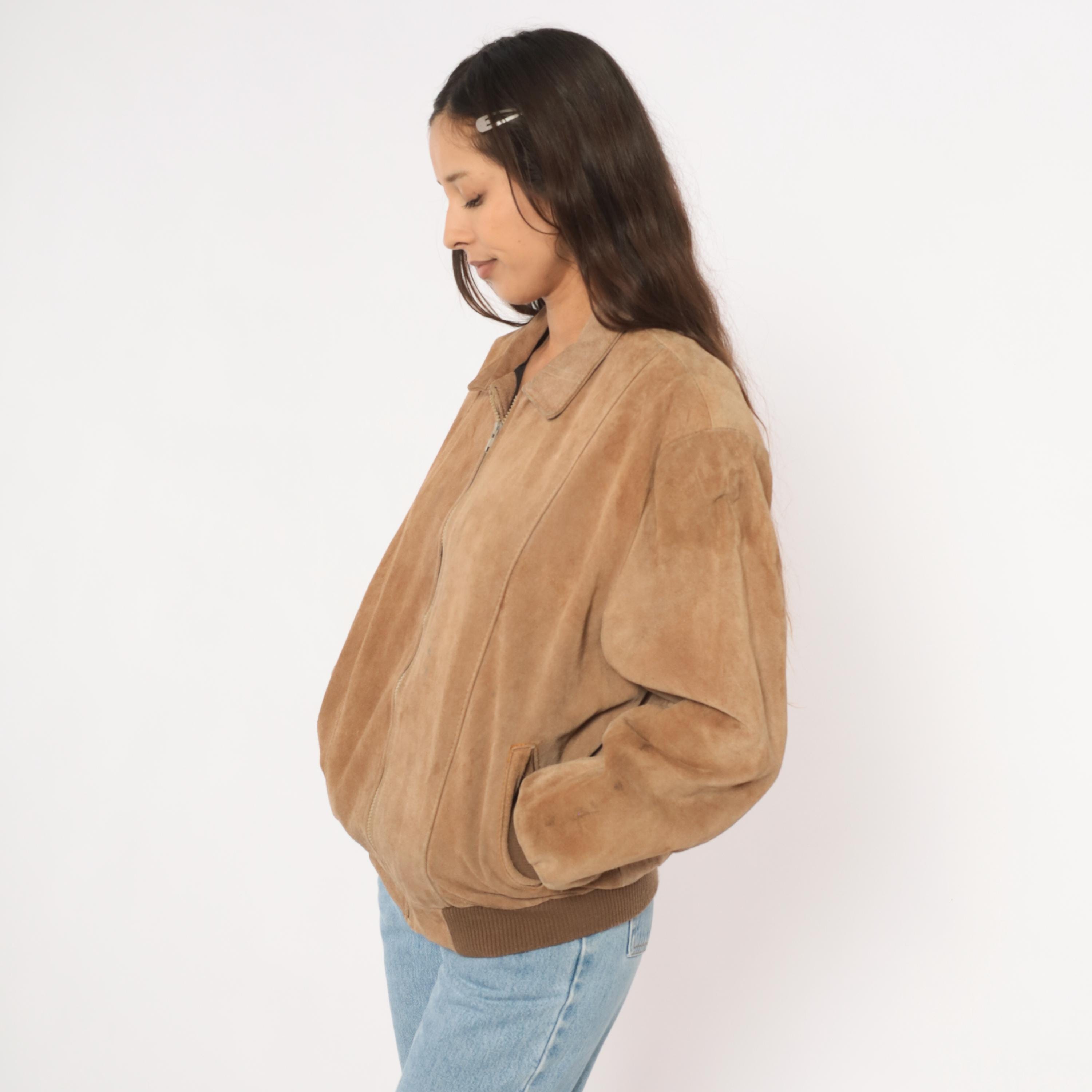 90s tan suede bomber jacket with a pointed collar, full zip front closure, and slanted welt pockets at the hip. Ribbed knit cuffs and waistband in a darker brown tone. Paneled construction with seaming across the shoulders, chest, and back center seam.