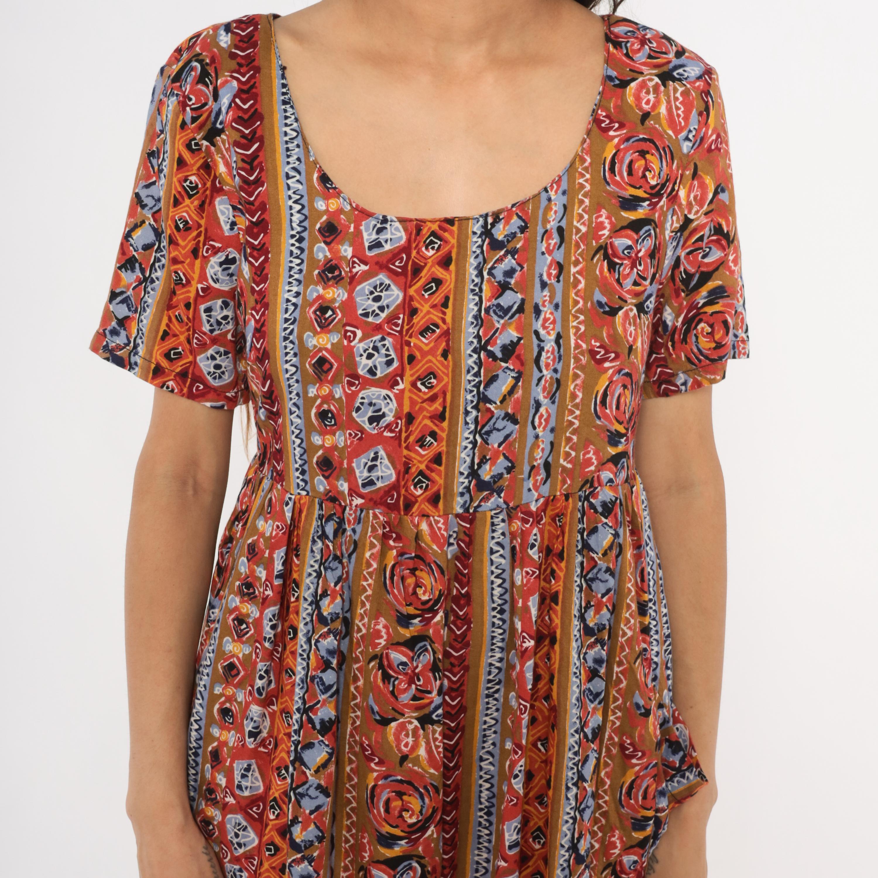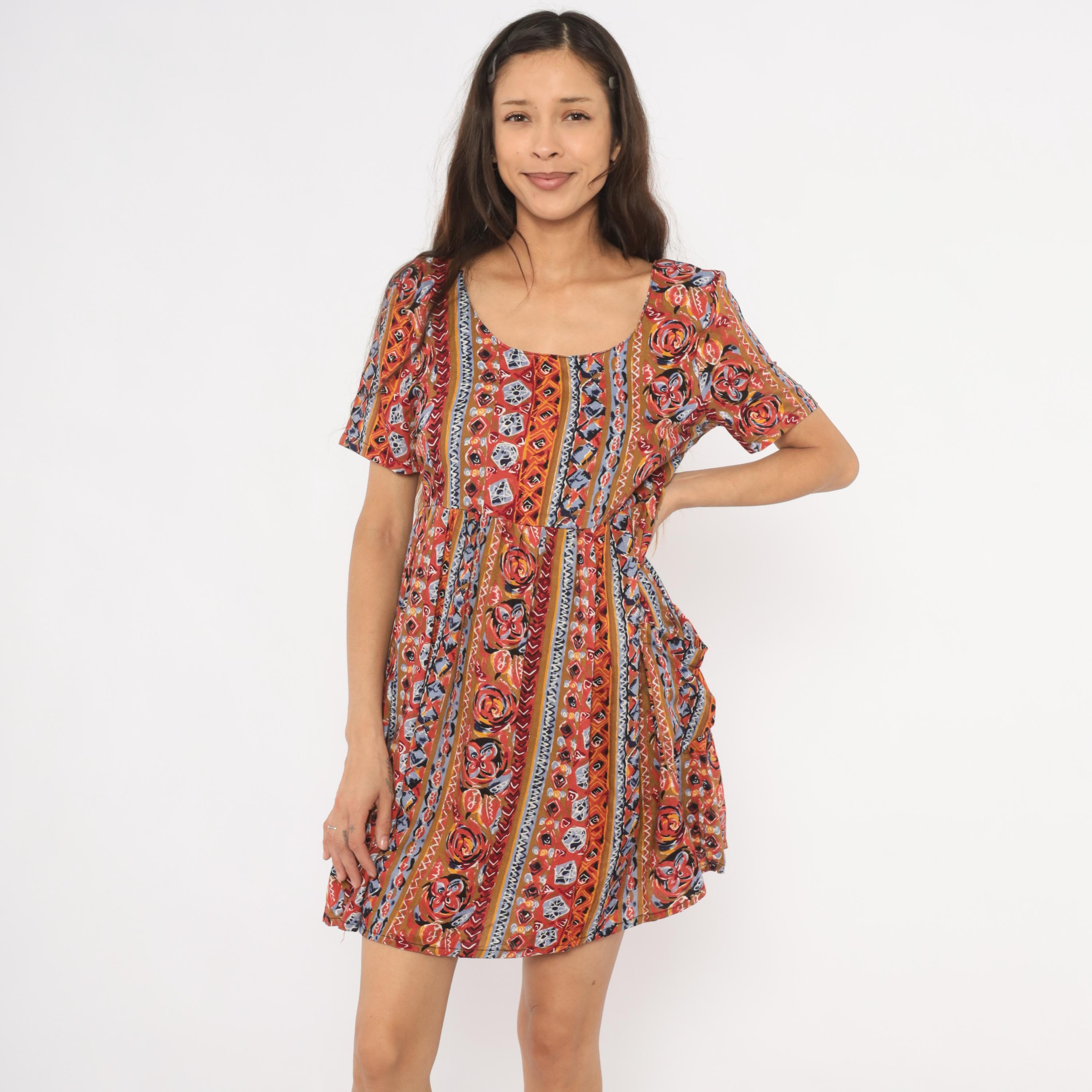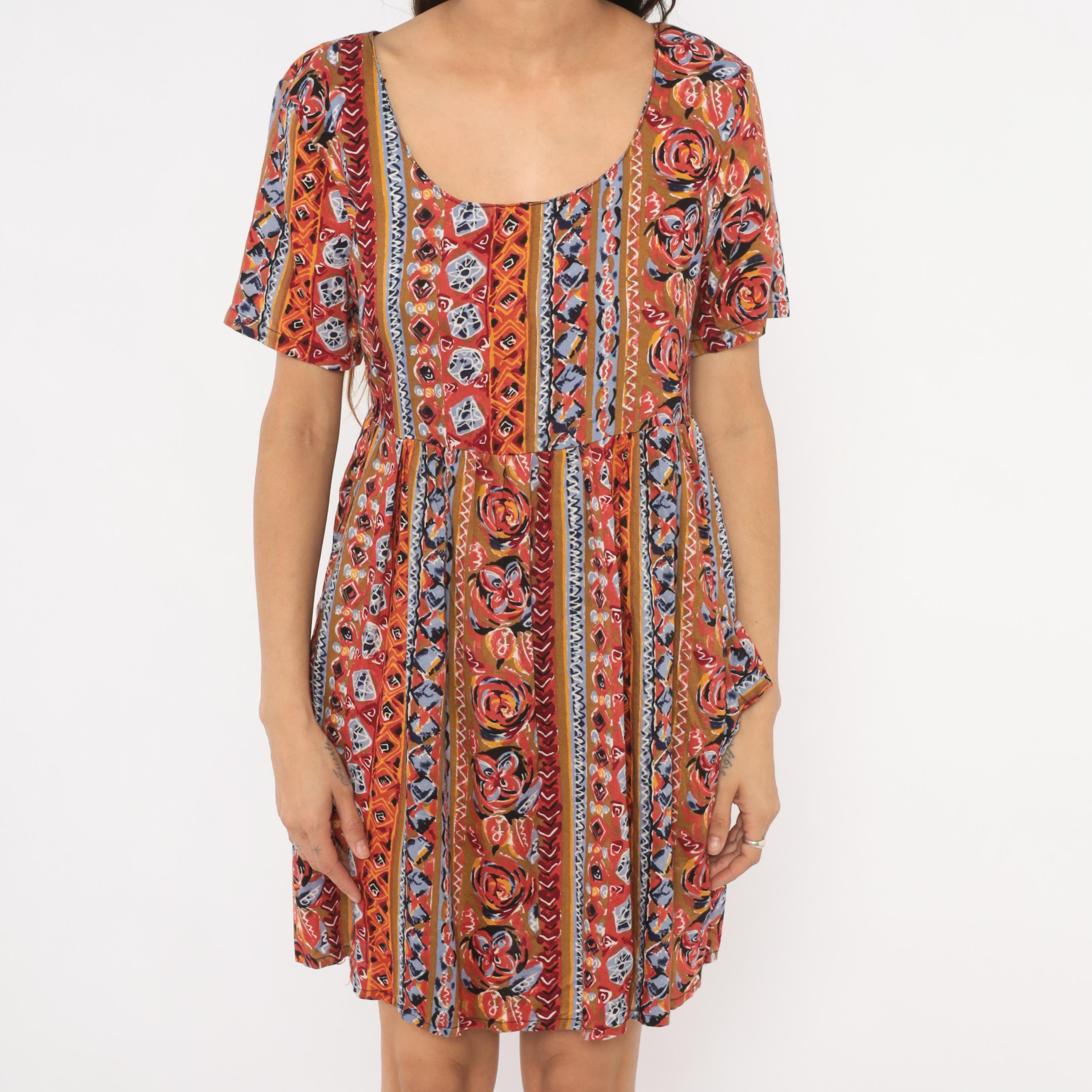 90s babydoll mini dress with a vertical striped pattern of abstract roses, geometric shapes, and zigzag motifs in rust, red, dusty blue, ochre, and black. Scoop neckline, short sleeves, and a seamed waist with gathered skirt. Pull-on style with no visible closures.