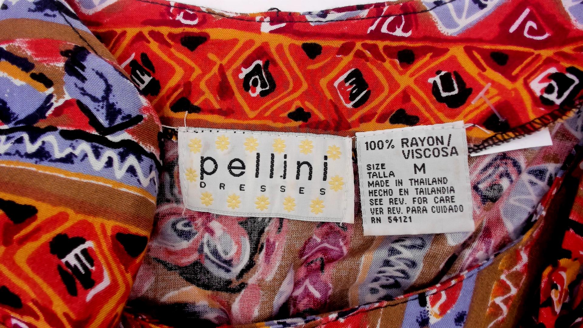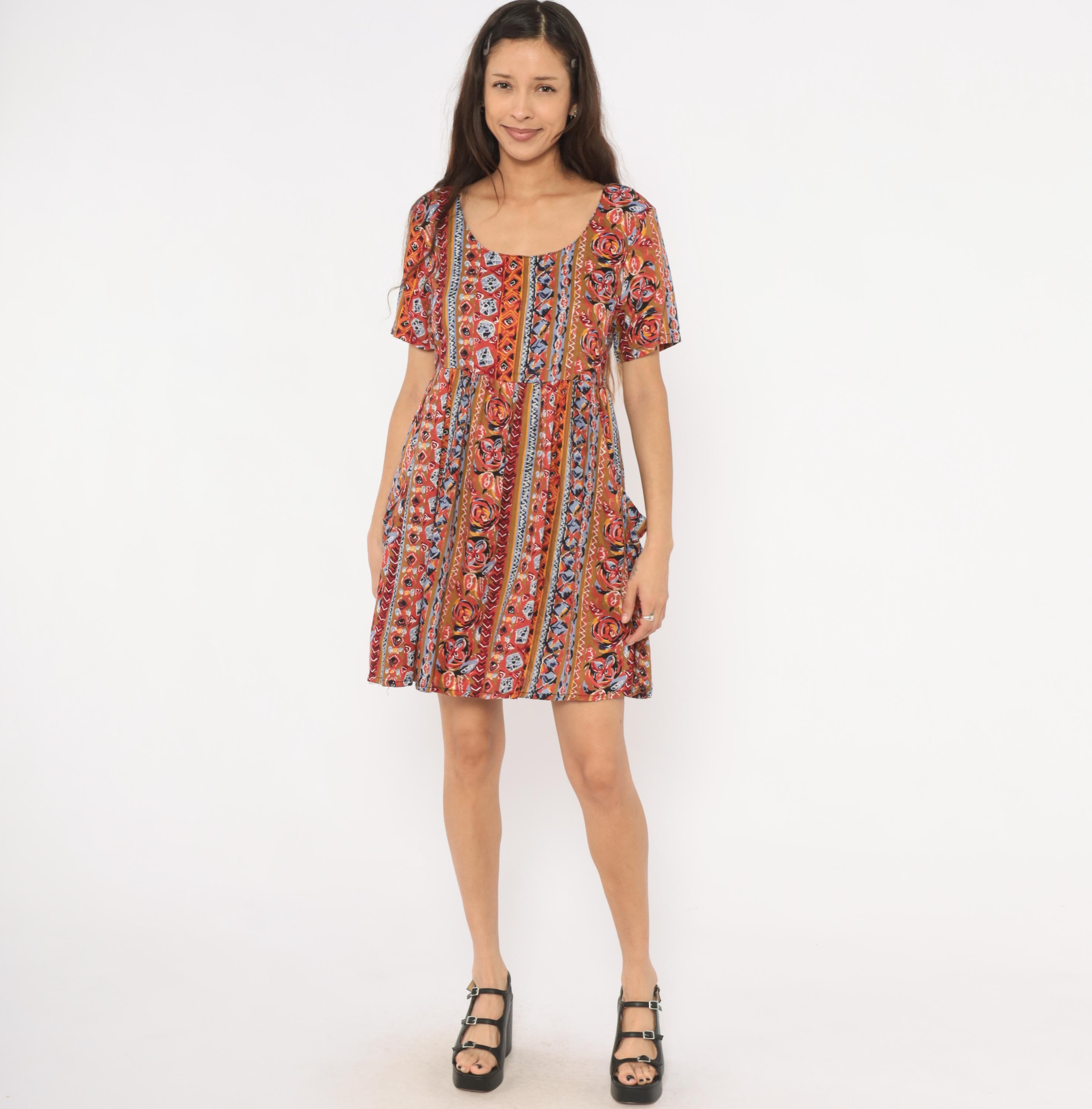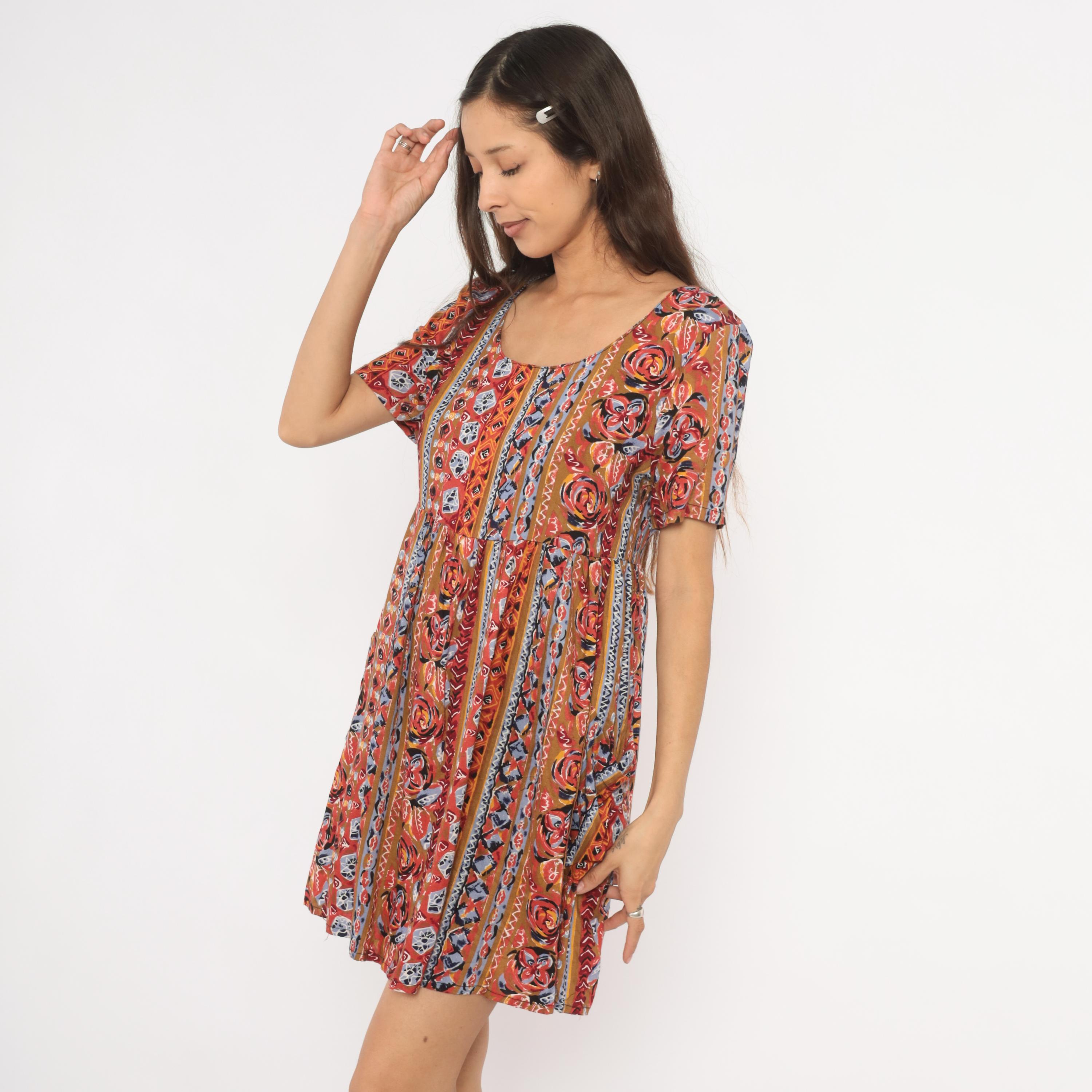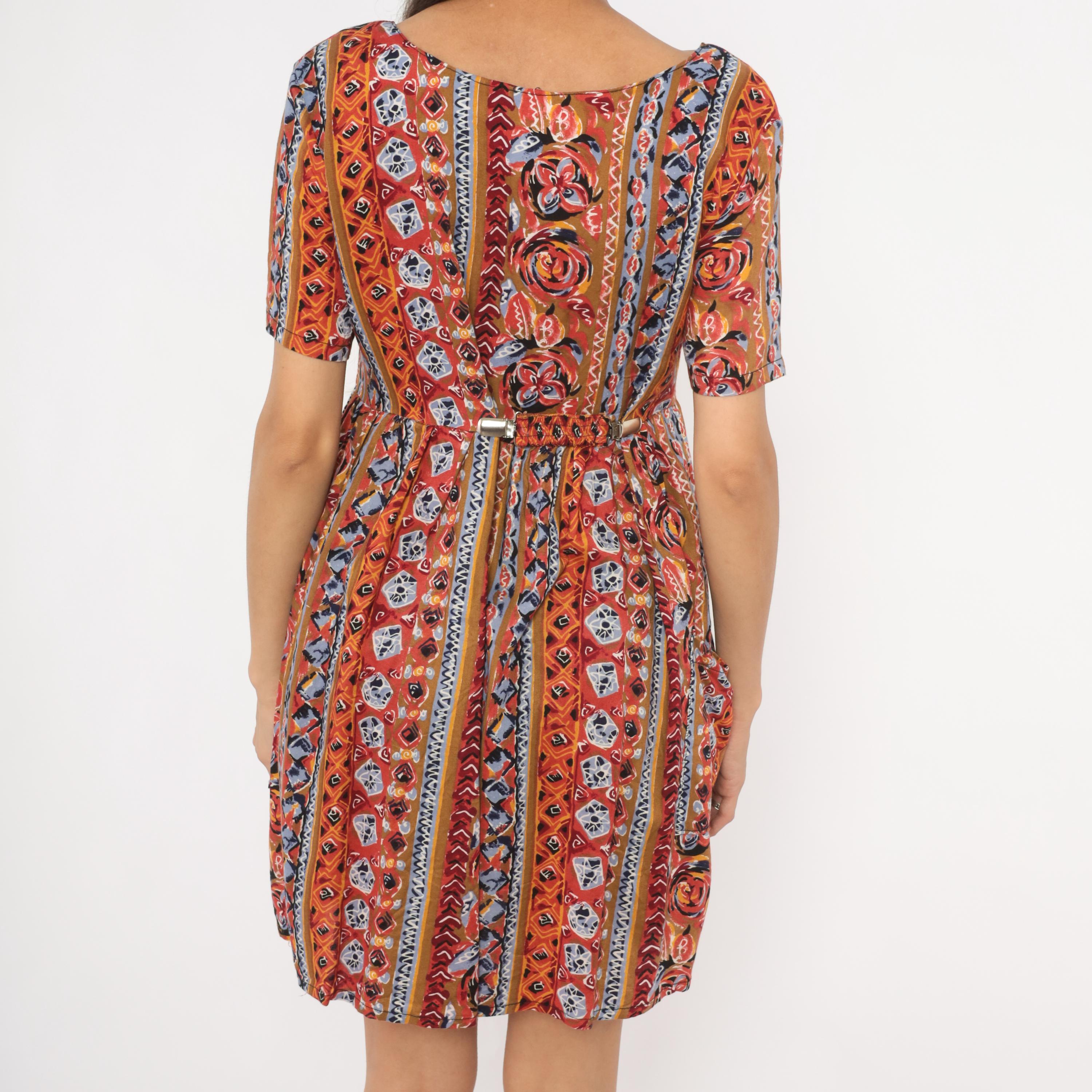 90s babydoll mini dress with a vertical striped pattern of abstract roses, geometric shapes, and zigzag motifs in rust, red, dusty blue, ochre, and black. Scoop neckline, short sleeves, and a seamed waist with gathered skirt. Pull-on style with no visible closures.