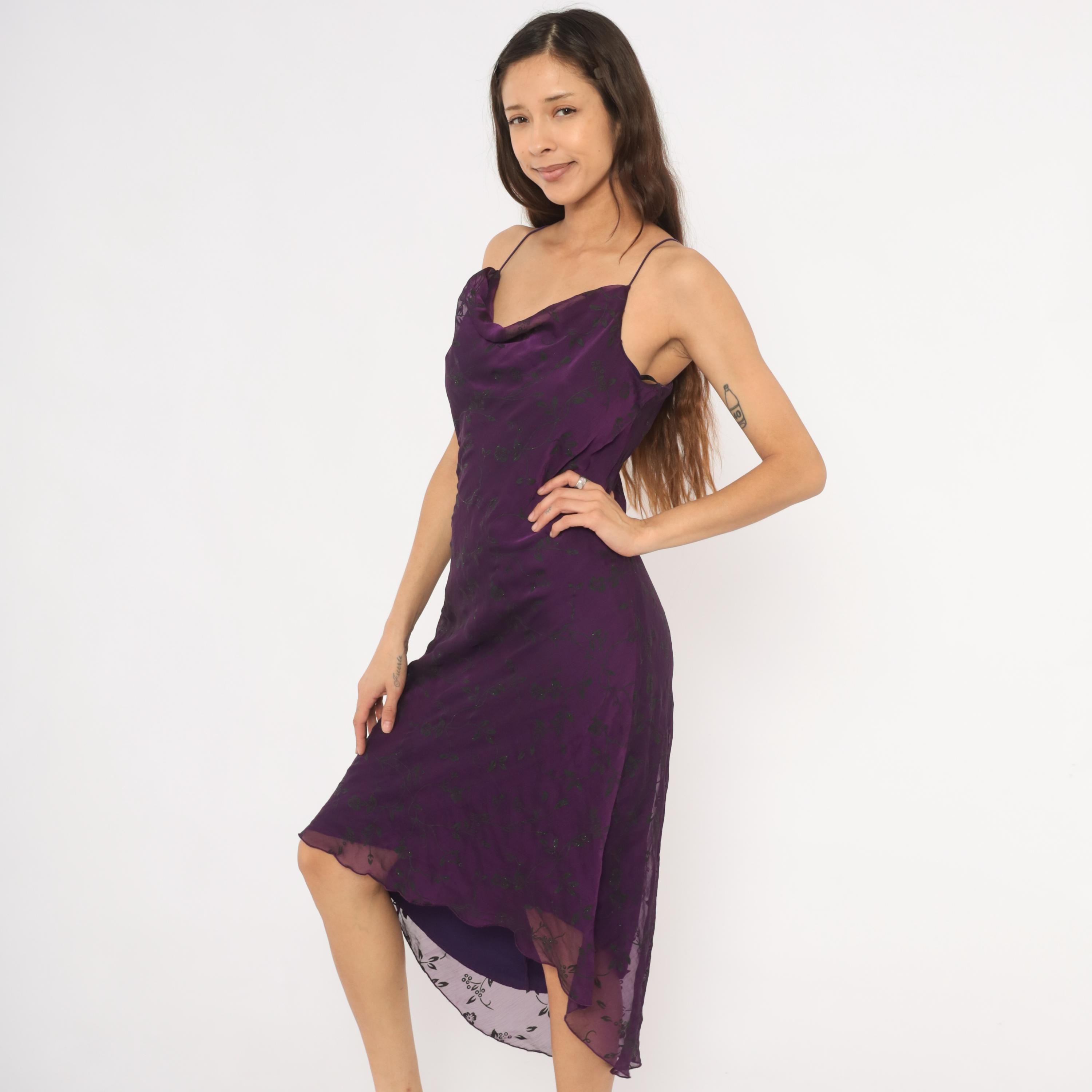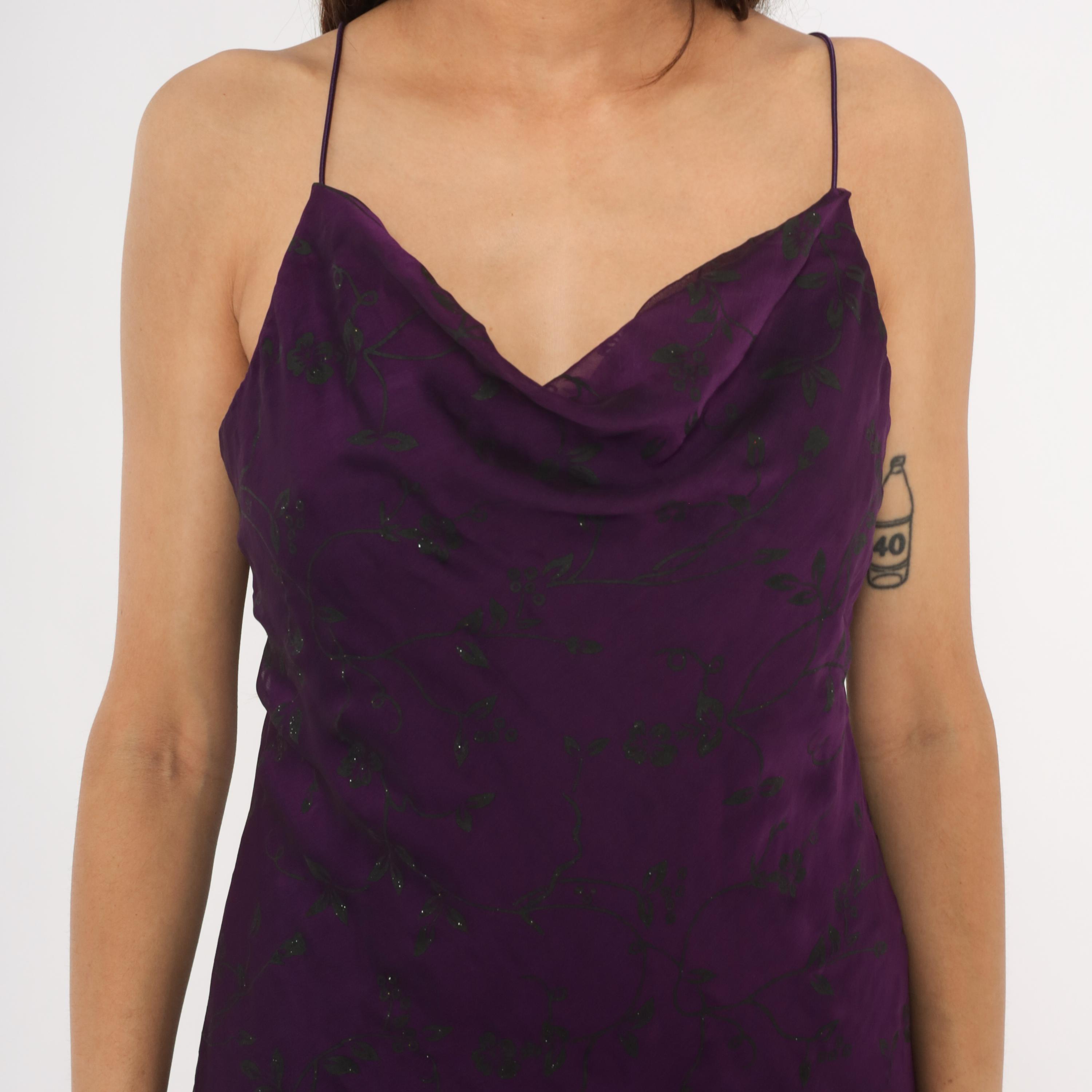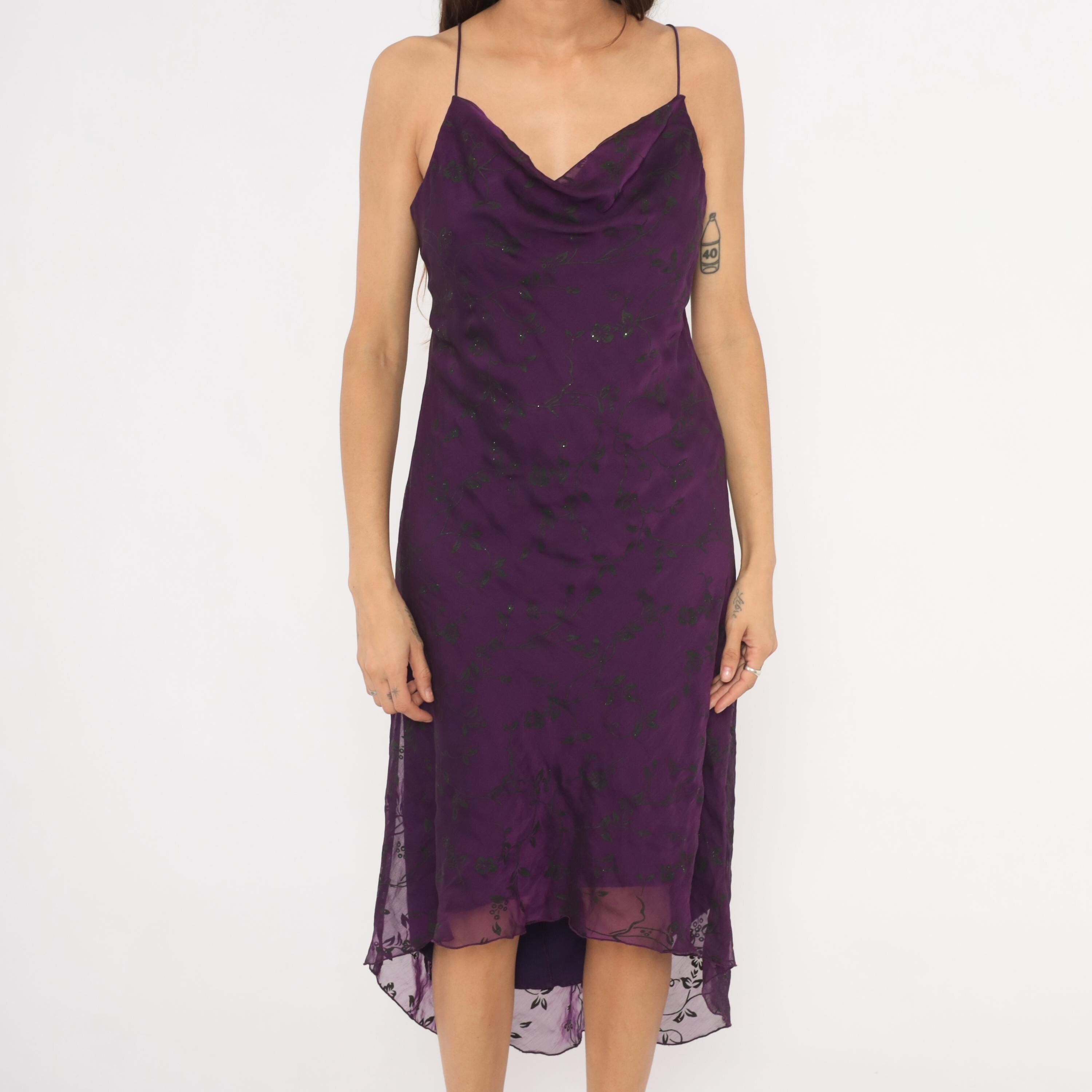 90s deep plum cowl neck slip dress with dark floral print and scattered glitter accents across the chiffon overlay. Thin spaghetti straps, fitted bodice through the waist, and a high-low hemline with sheer floral trim at the bottom edge. The outer layer is semi-sheer chiffon over a solid purple lining, and the back mirrors the cowl drape of the front neckline.