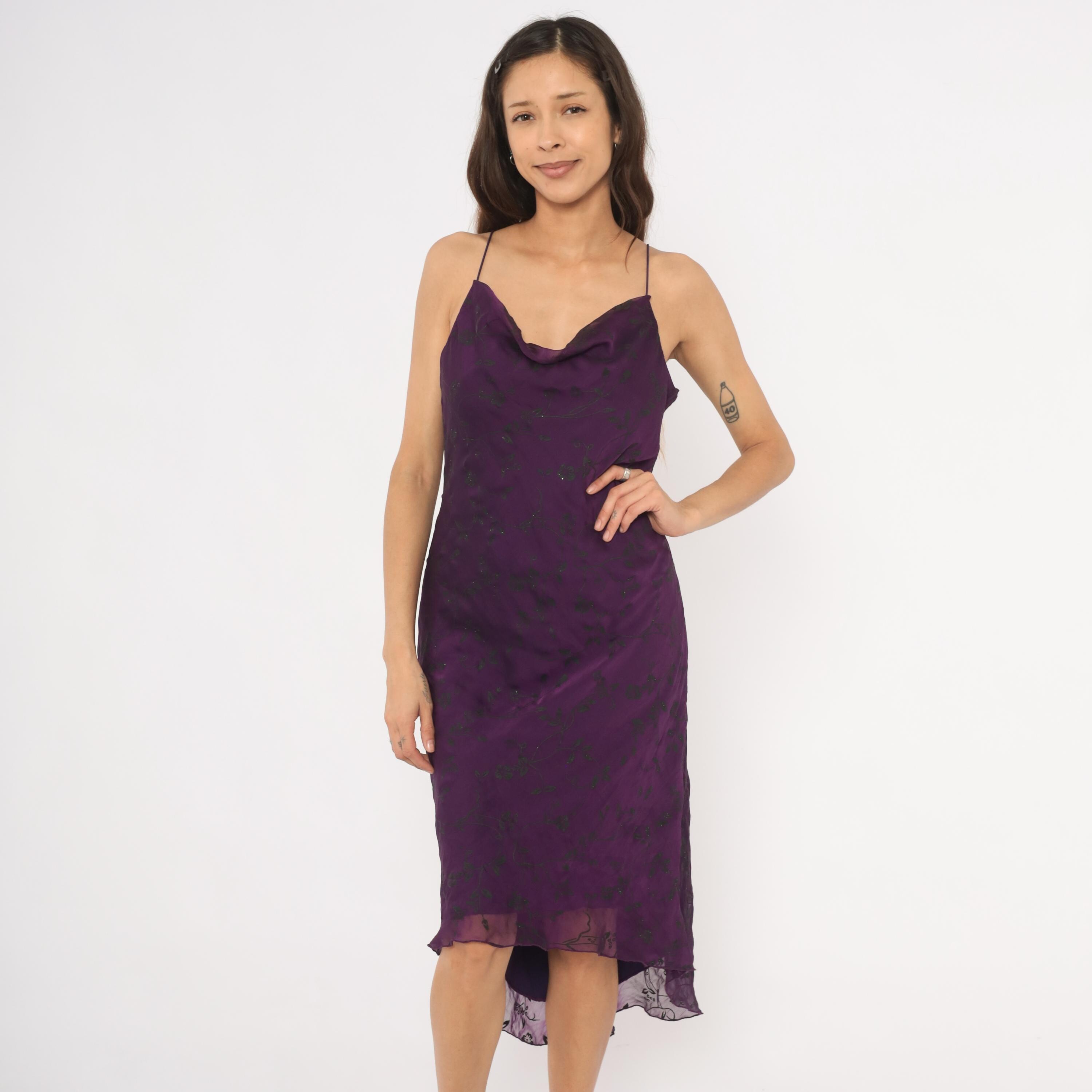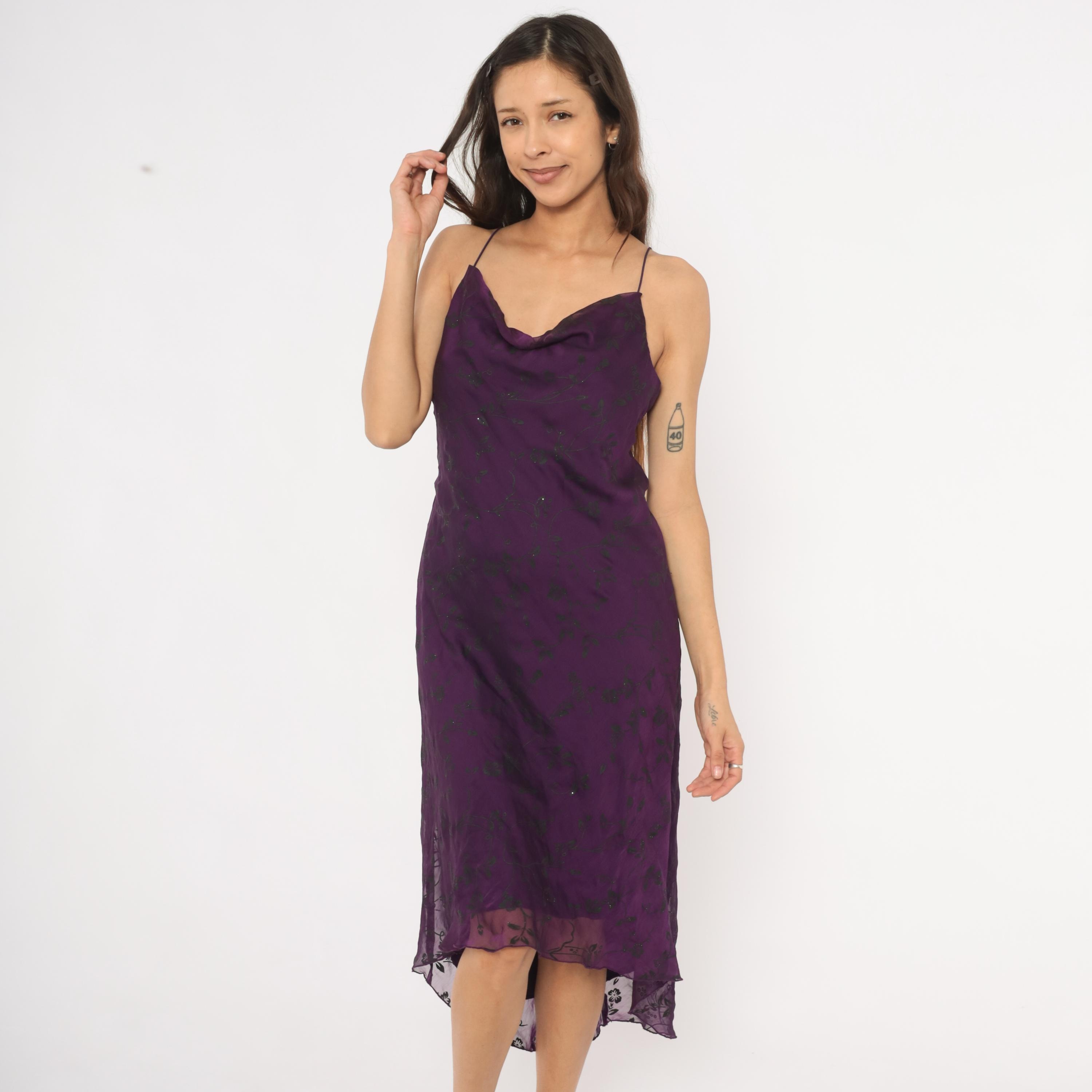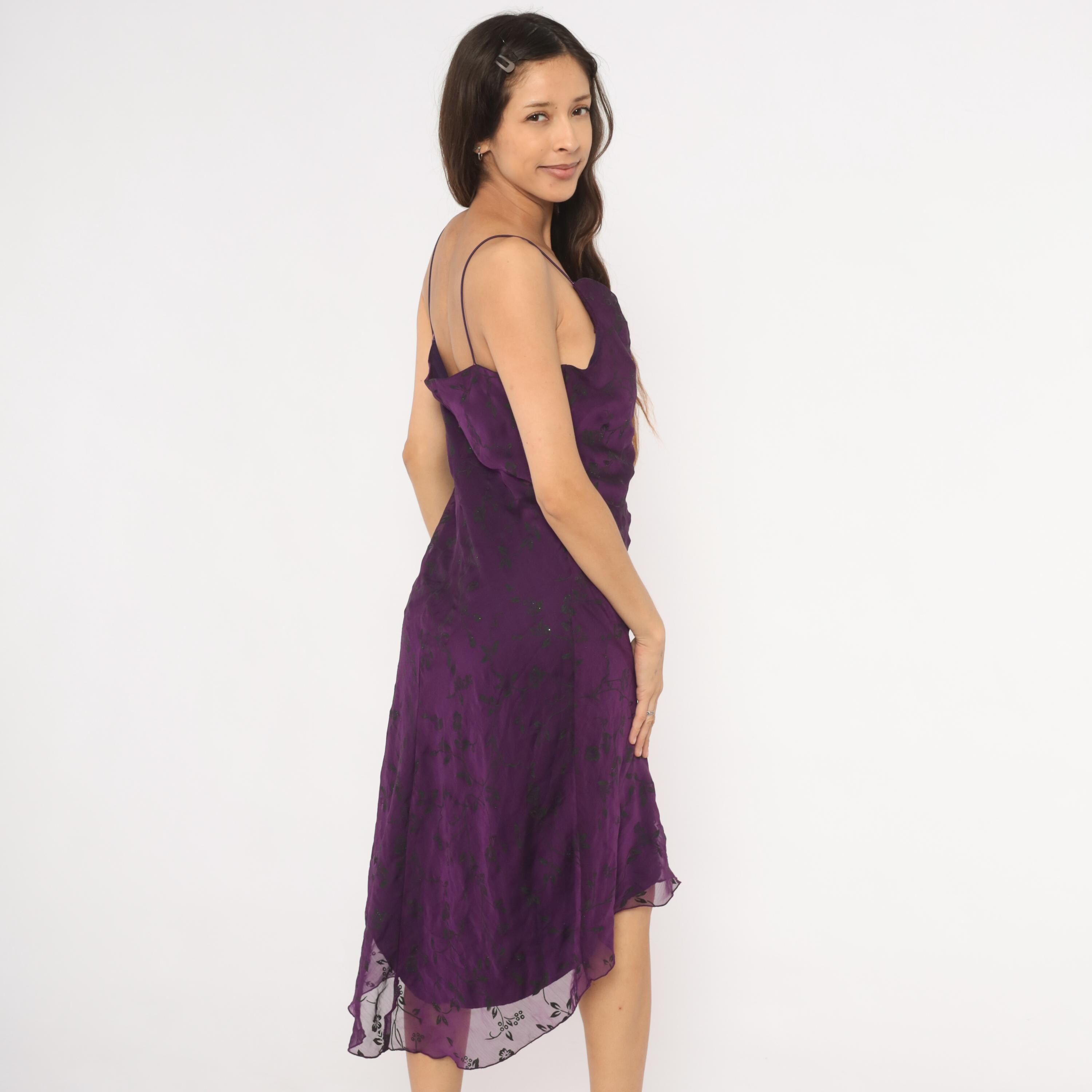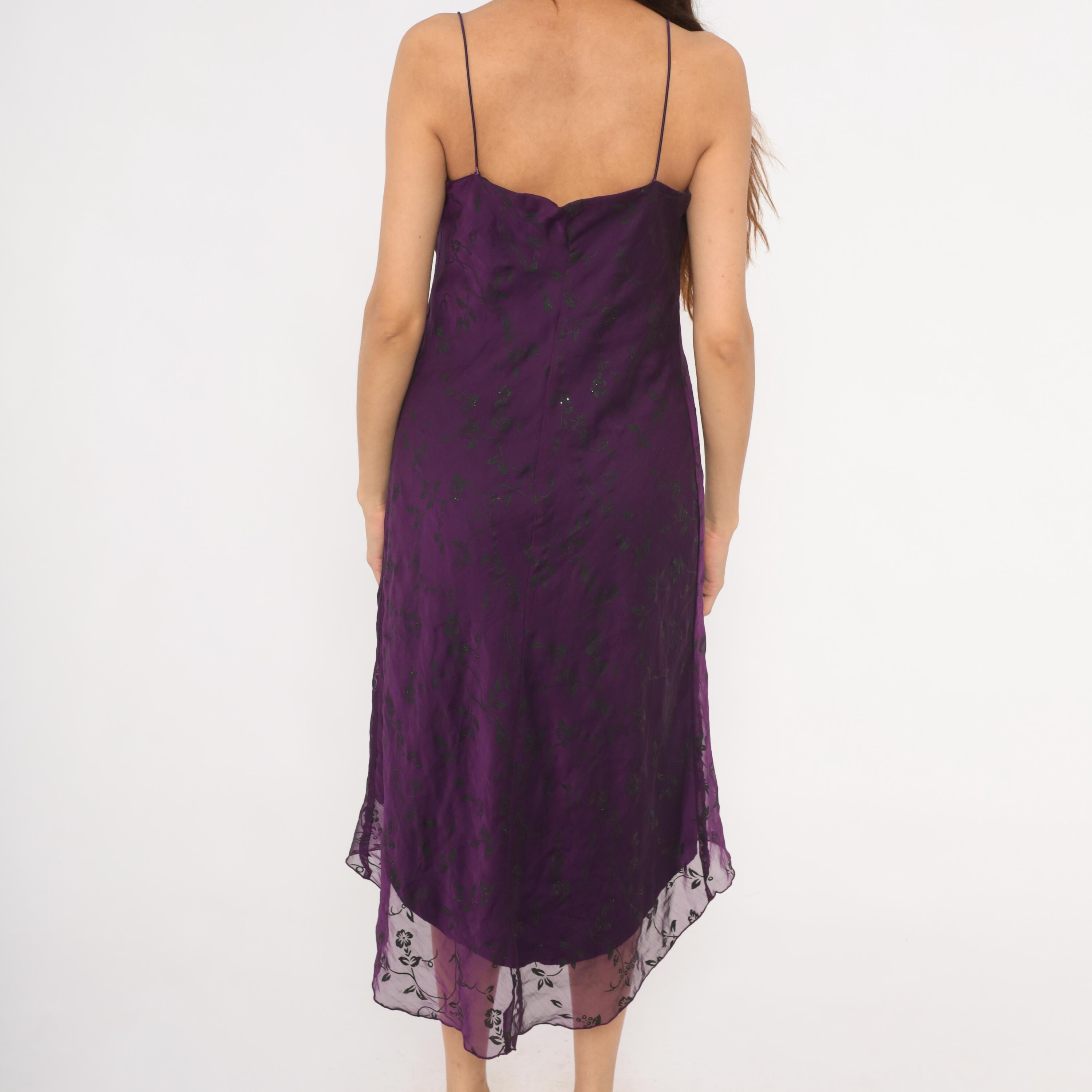 90s deep plum cowl neck slip dress with dark floral print and scattered glitter accents across the chiffon overlay. Thin spaghetti straps, fitted bodice through the waist, and a high-low hemline with sheer floral trim at the bottom edge. The outer layer is semi-sheer chiffon over a solid purple lining, and the back mirrors the cowl drape of the front neckline.