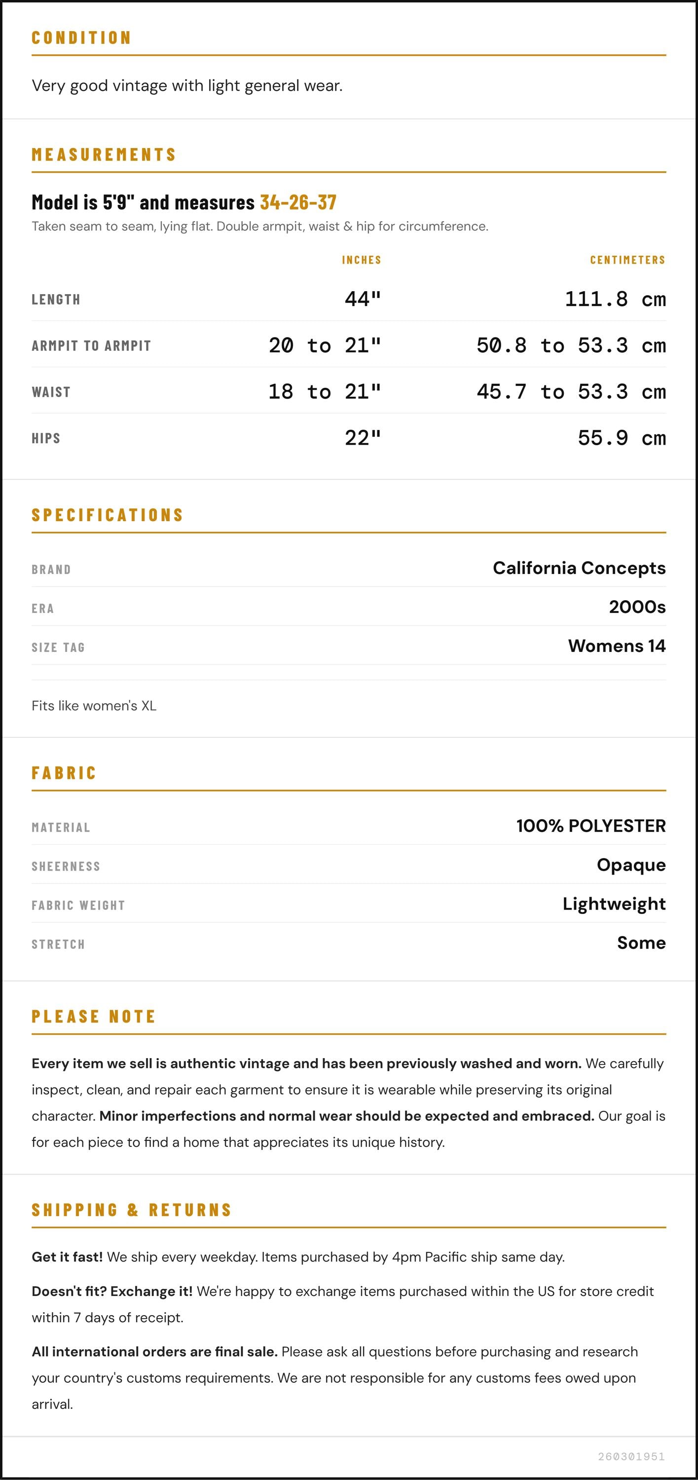 Taken from seam to seam while the garment is lying flat. Double the armpit, waist, and hip measurements.