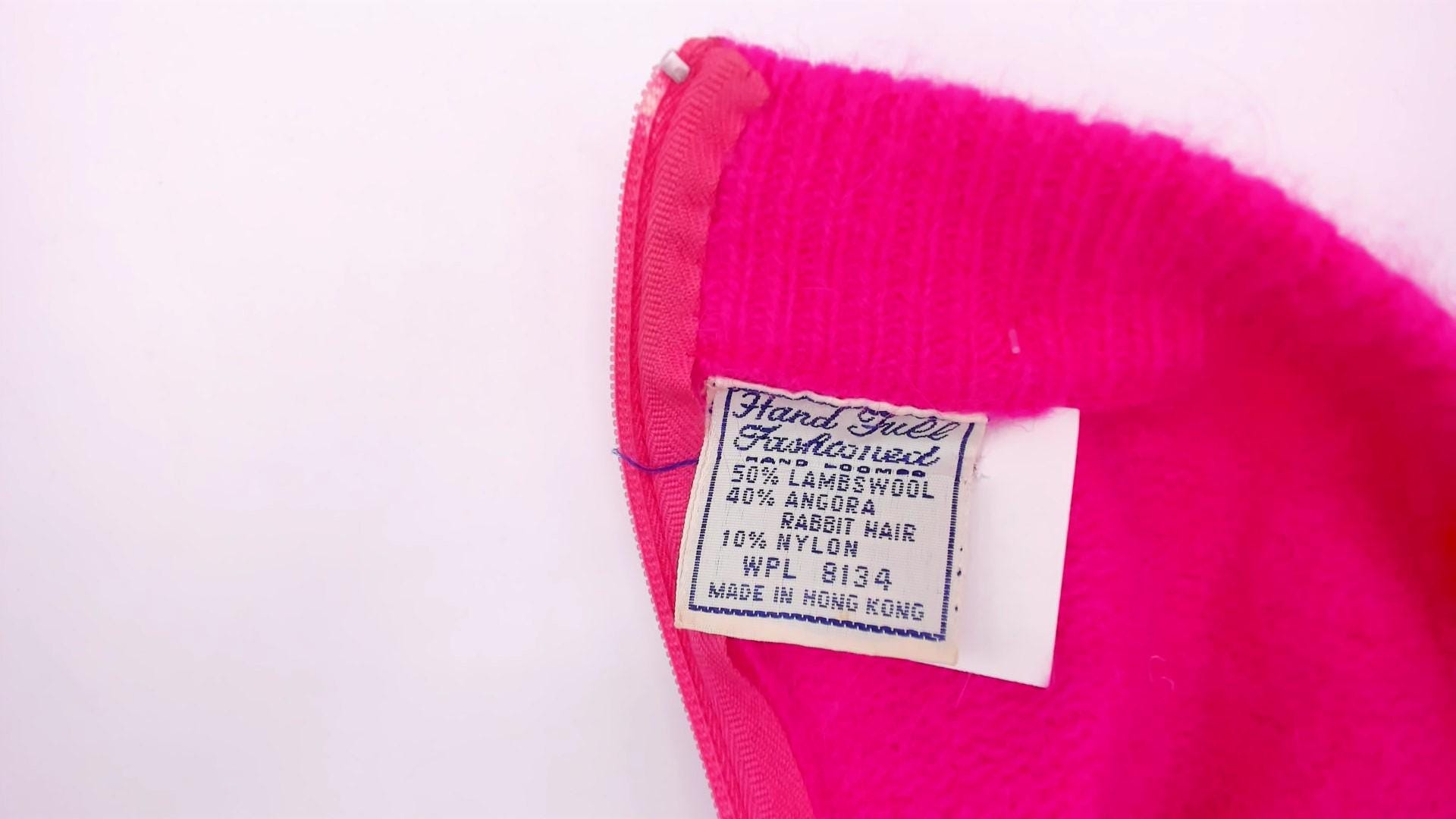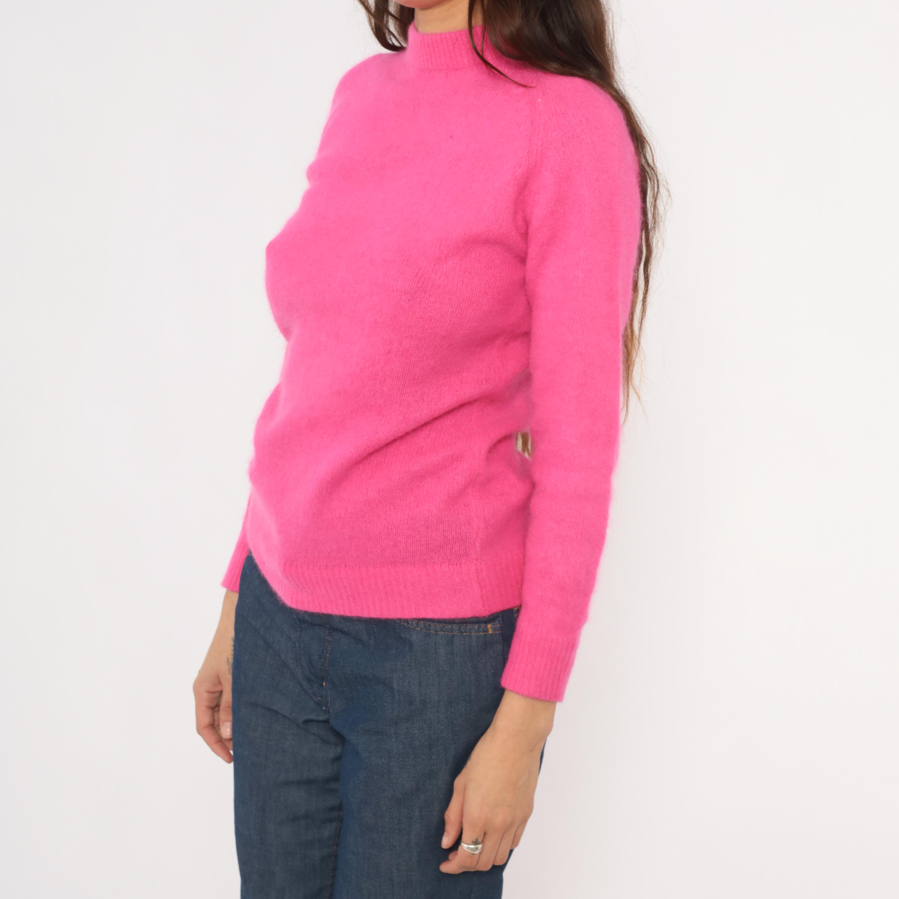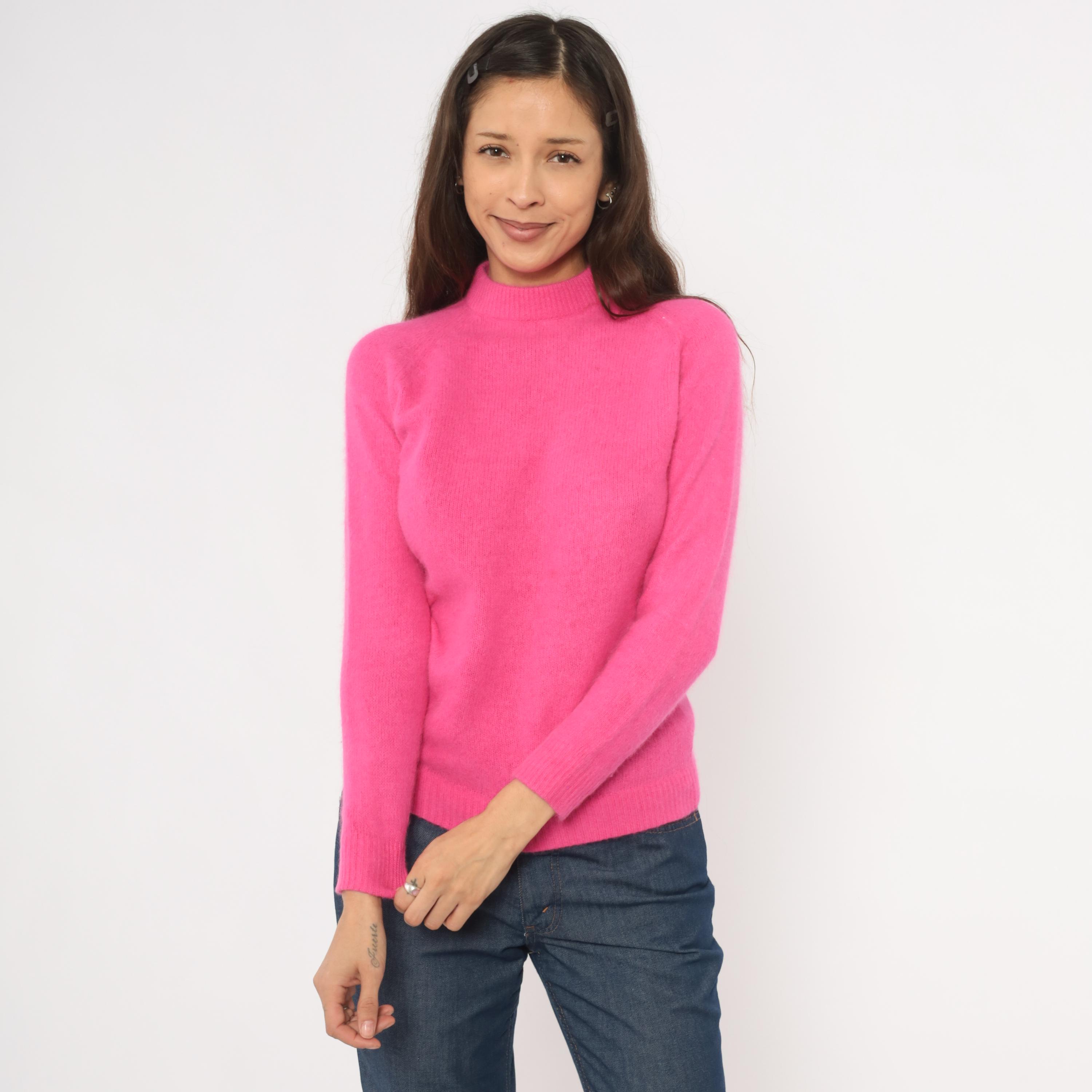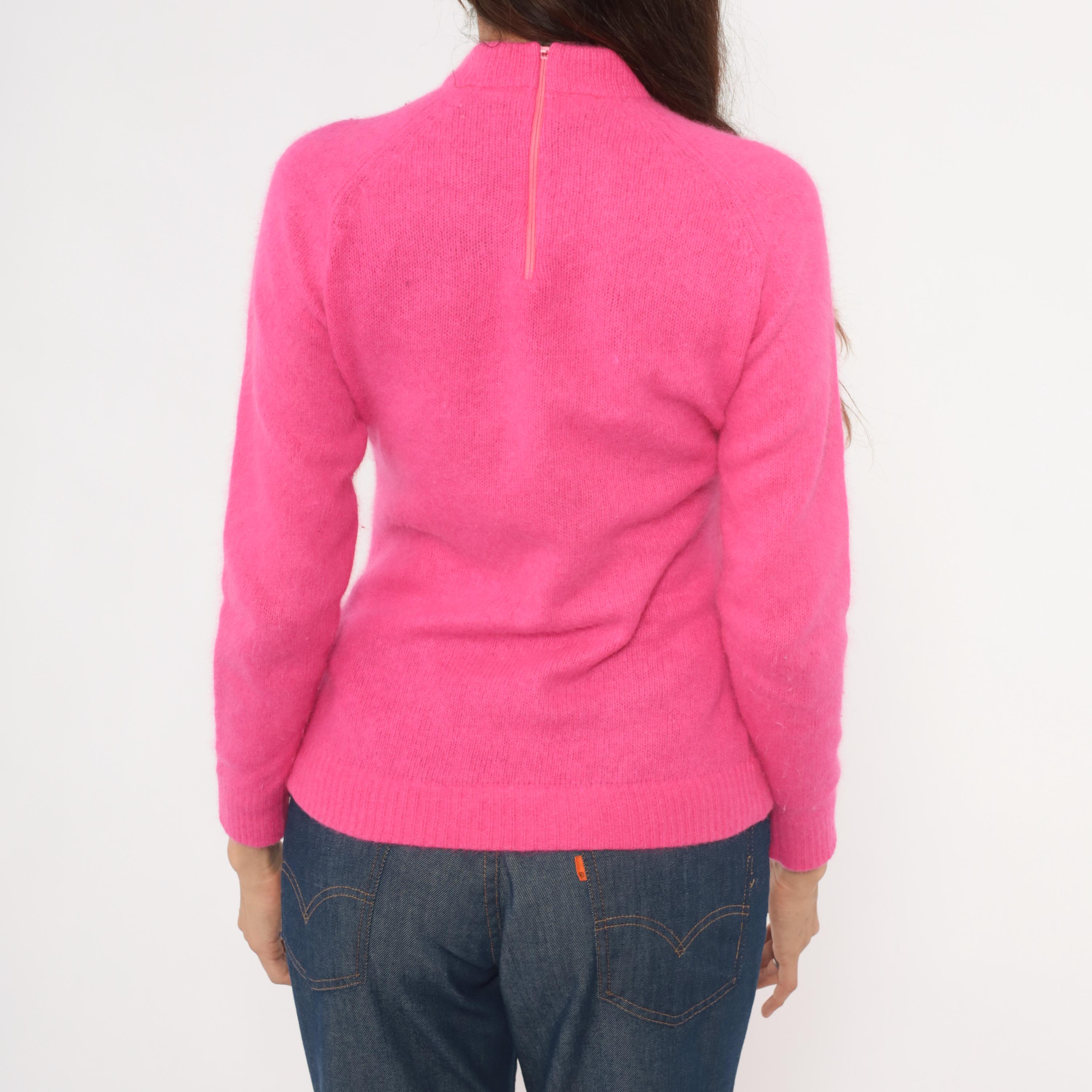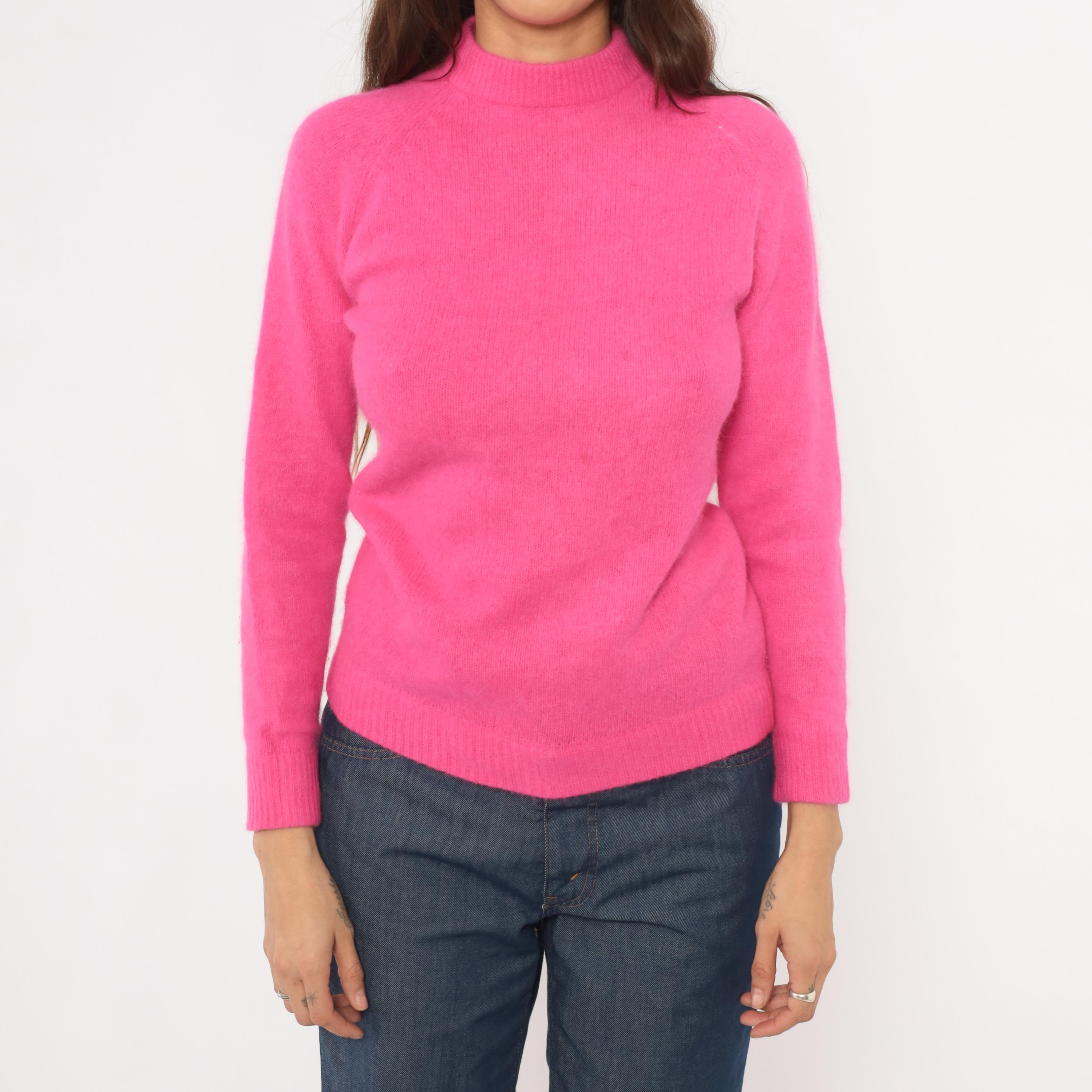 Hot pink mock neck sweater with a fitted silhouette, long raglan sleeves, and ribbed cuffs, collar, and hem. Back zipper closure at the neckline. Solid fuchsia knit construction throughout in a vibrant bubblegum-magenta hue.