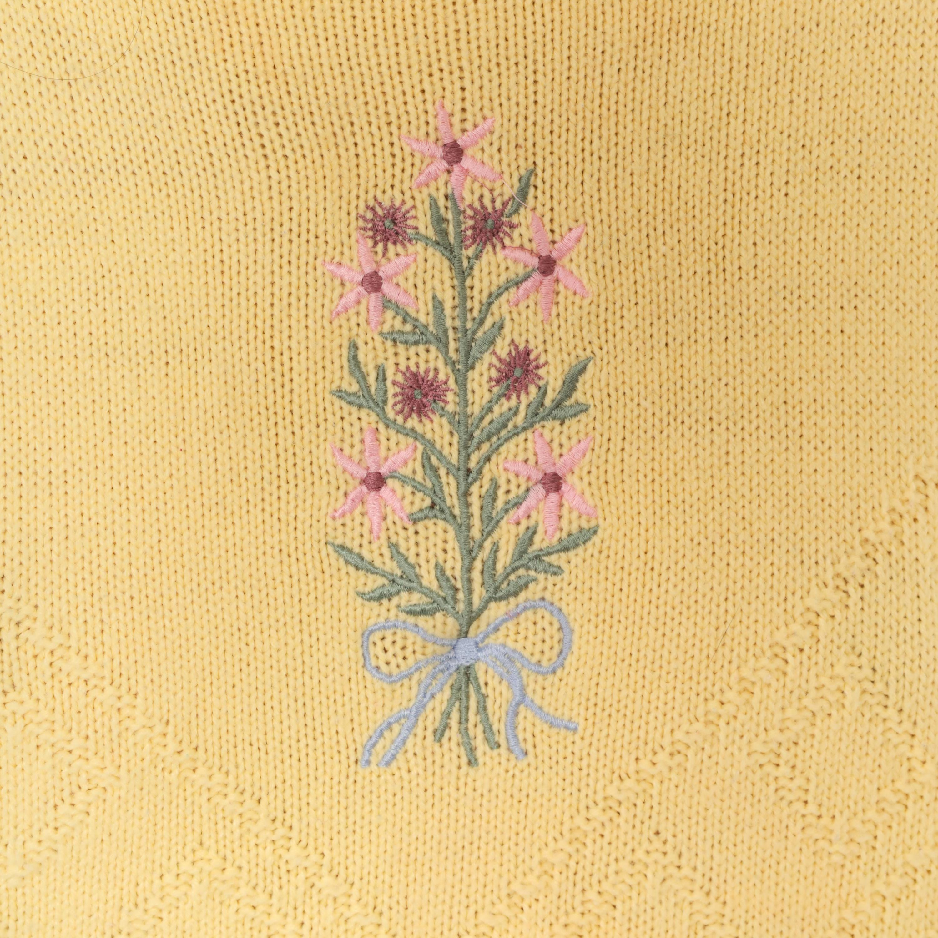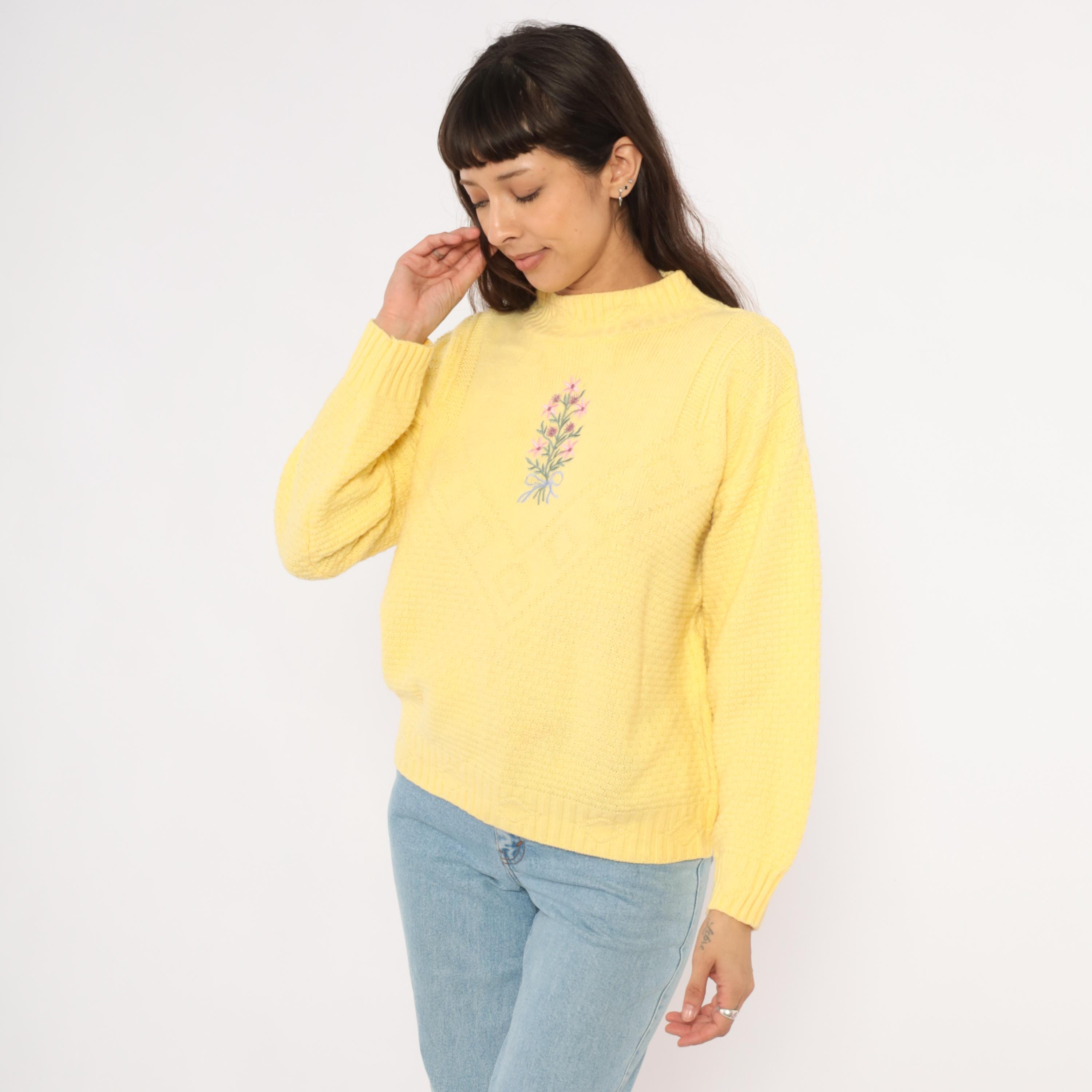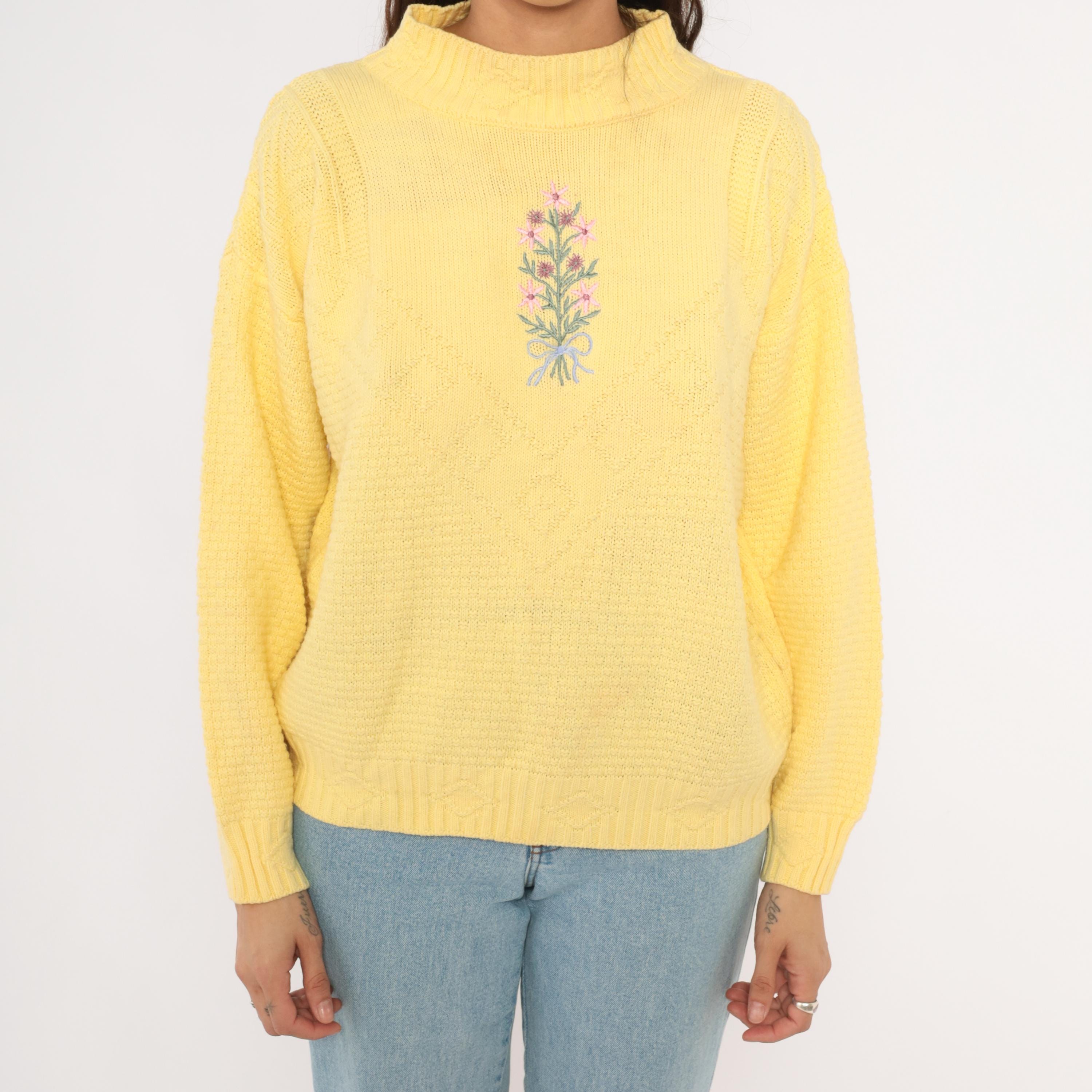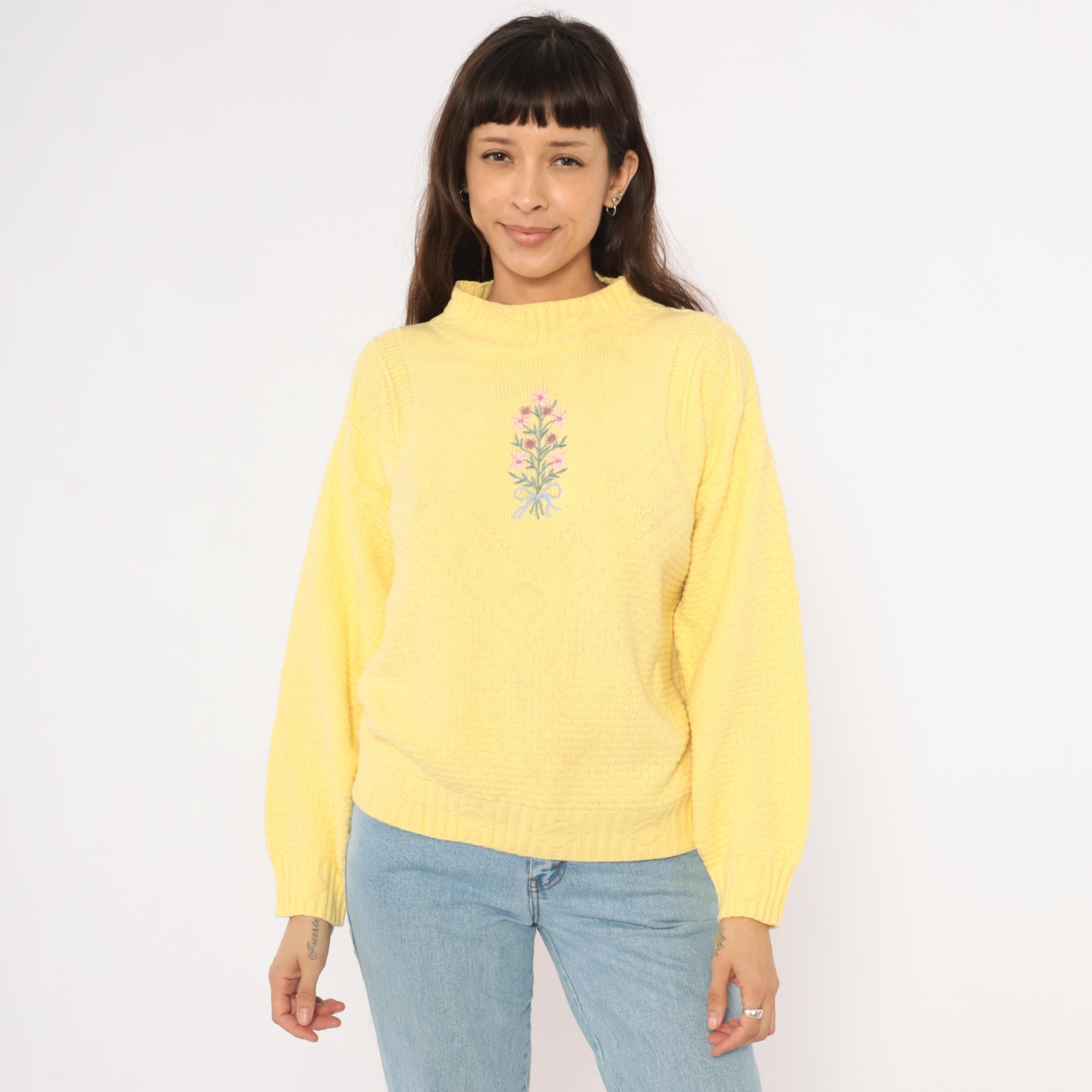 80s butter yellow knit pullover from Liz Thomas with an embroidered floral bouquet on the center chest, pink star-shaped flowers with sage green stems tied with a periwinkle ribbon bow. Mock neck collar with ribbed trim at the neckline, cuffs, and hem.