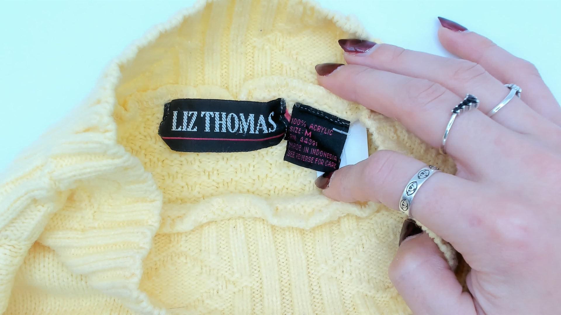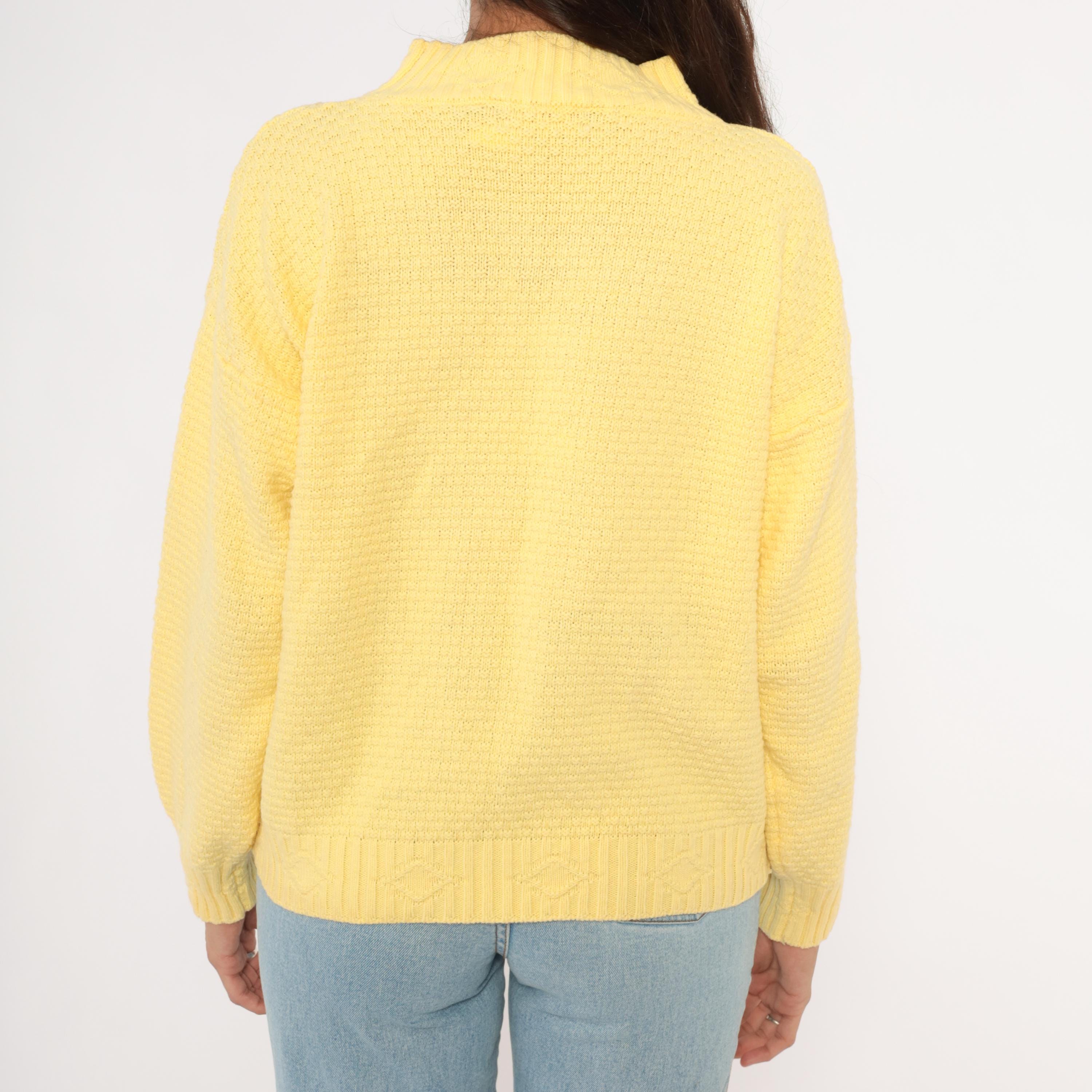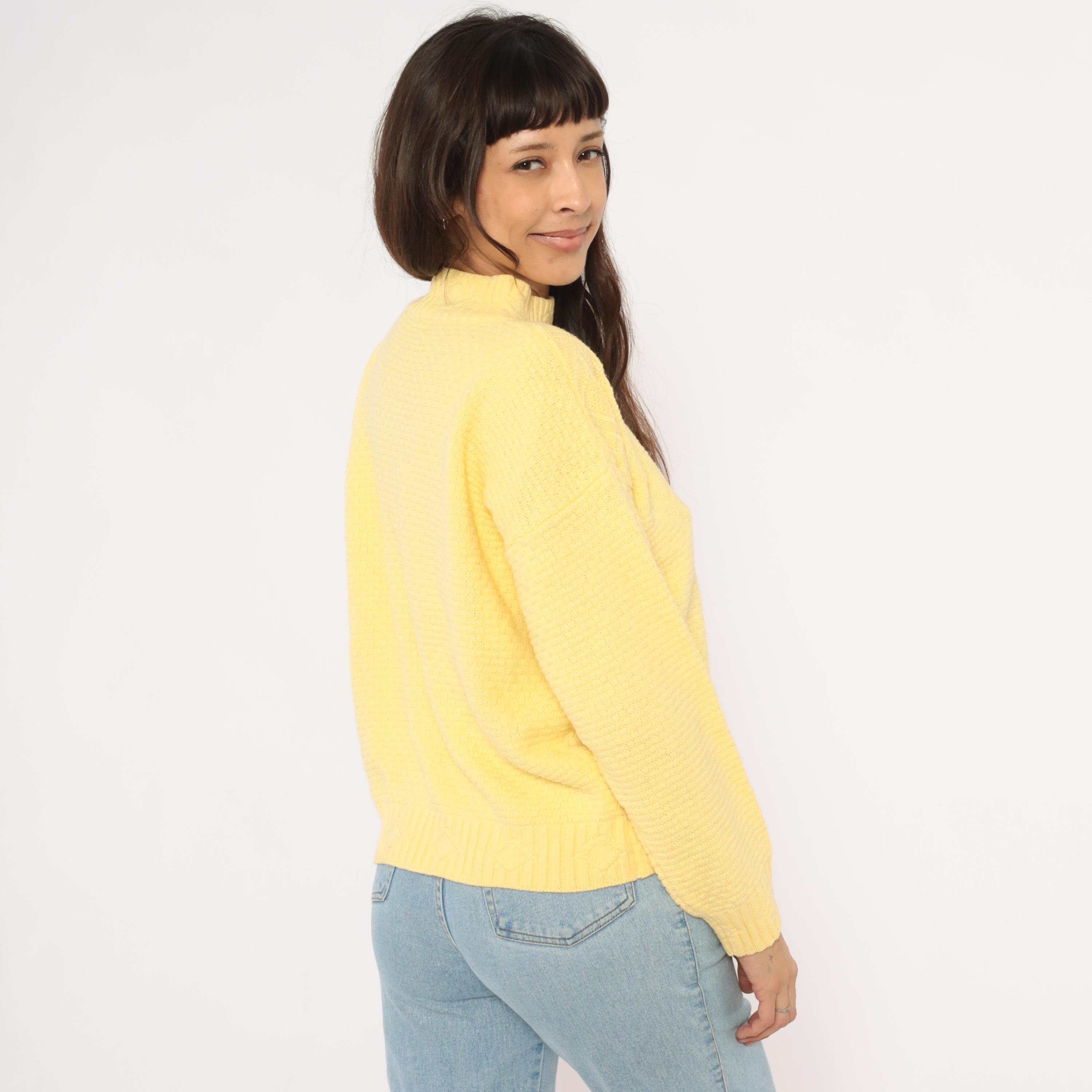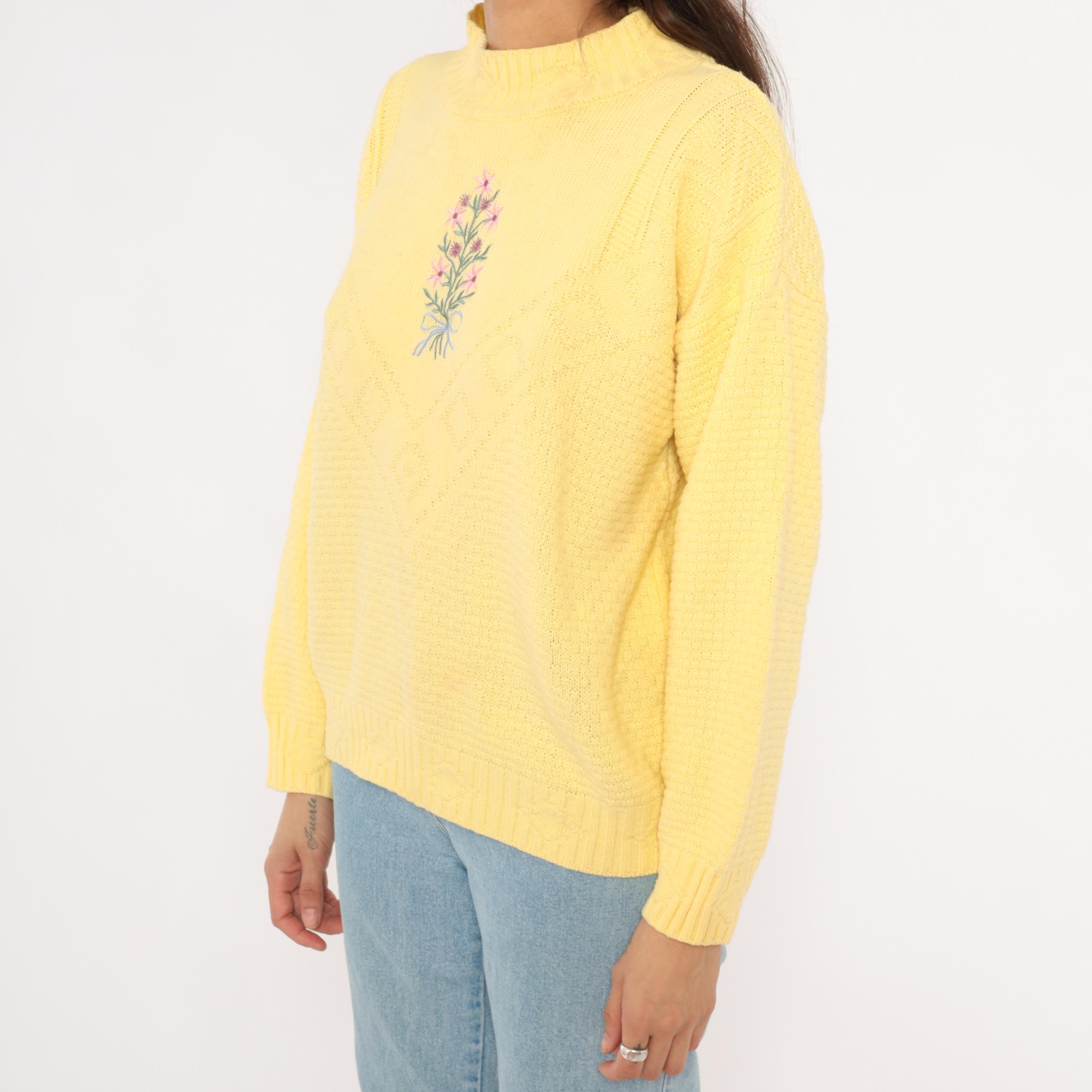 80s butter yellow knit pullover from Liz Thomas with an embroidered floral bouquet on the center chest, pink star-shaped flowers with sage green stems tied with a periwinkle ribbon bow. Mock neck collar with ribbed trim at the neckline, cuffs, and hem.